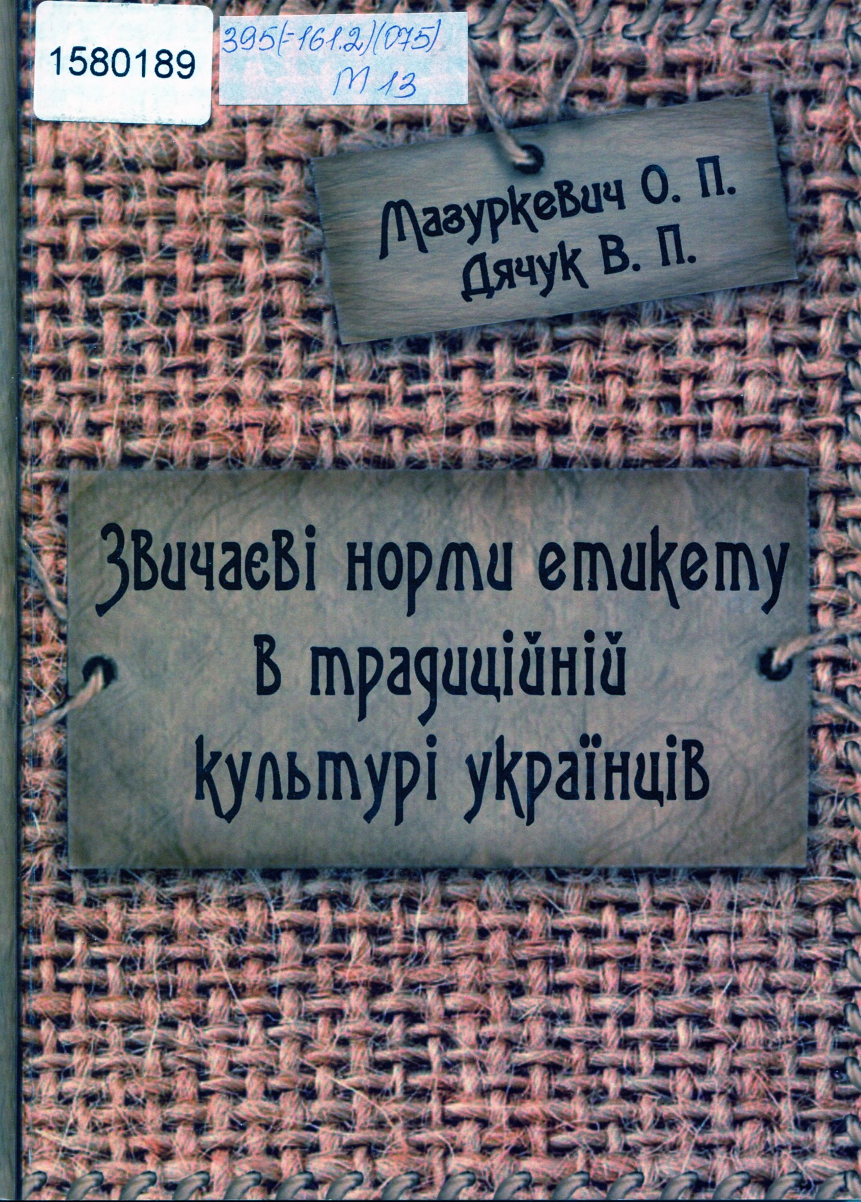 1580189 395(=161.2)(075) М 13 Мазуркевич О.П. Звичаєві норми етикету в традиційній культурі українців : навчальний посібник / О.П. Мазуркевич, В.П. Дячук. – Київ : Ліра-К, 2022. – 218 с.