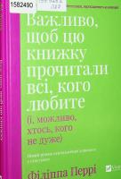 1582490кп чз Перрі, Філіппа Важливо, щоб цю книжку прочитали всі, кого любите (і, можливо, хтось, кого не дуже) = The book you want everyone you love to read. -Харків: Vivat, 2024. - 192 с. У когось виросли діти — і що тепер? Інший почав сваритися із братами й сестрами вже в дорослому віці. Хтось бореться із власним гнівом або страждає від токсичної поведінки близьких. Когось мучить горе втрати, а хтось почувається занадто старим для сучасної епохи. Відносини з членами родини, партнерами, друзями, колегами і, найважливіше, любов до себе визначають якість життя і вашу здатність долати життєві труднощі. Історії з практики доктора Перрі — це ситуації, знайомі кожному. Хтось засидівся у декретній відпустці й замкнувся у собі. Хтось перевантажений на роботі й почувається некомпетентним. Інший втратив зв’язок із найкращою подругою. Партнер з уникливим типом прив’язаності залишив когось у одностатевих стосунках. Хтось марно шукає любов в інтернеті. Криза середнього віку, сексуальне незадоволення, невдоволення своїм тілом... Філіппа Перрі ділиться алгоритмами формування здорових зв’язків, звичок, стратегіями розв’язання конфліктів, а також методами подолання стресу та тривоги. Ця книга допоможе вам і вашим близьким знайти гармонію. Почніть із себе. Посилання на книгу: http://www.old.libr.dp.ua/catalog/BOOKN/0CB8D830-67B9-4AB5-9C0F-C59CC496AE77