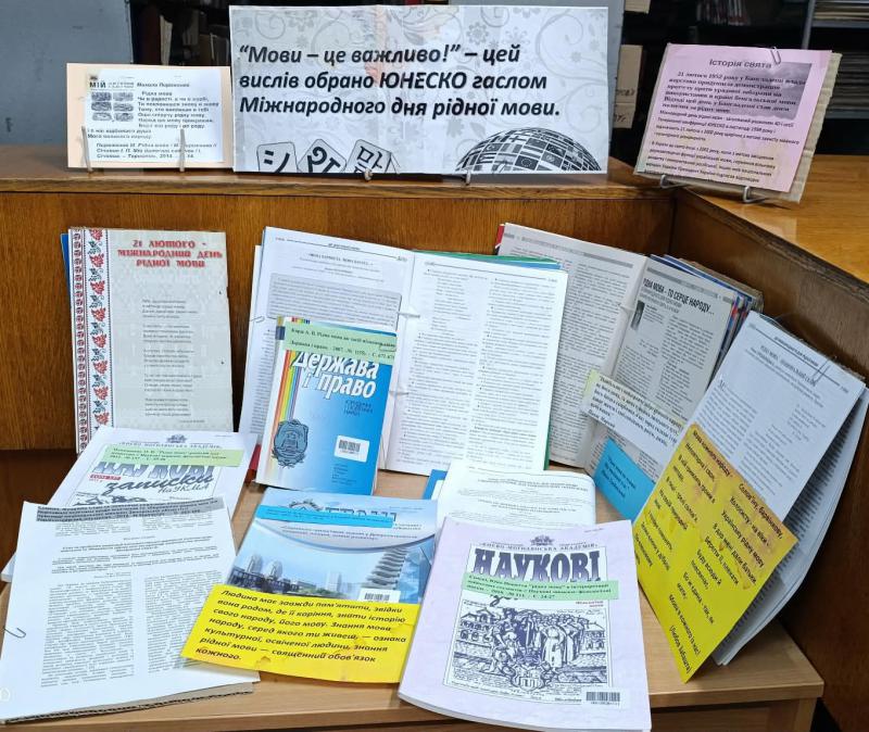 У відділі періодики до Міжнародного дня рідної мови організовано виставку-заклик "Плекайте та любіть рідну мову". На виставці представлено матеріали з історії виникнення свята, теоретичні статті стосовно поняття "рідна мова", про роль мови в суспільному житті й у житті людини, про важливість захисту мов, підтримки мовного та культурного різноманіття та багатомовності.