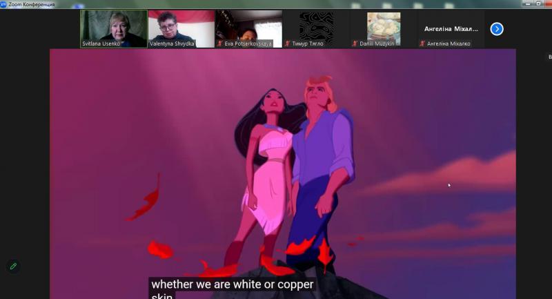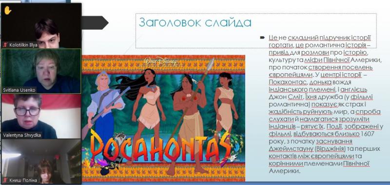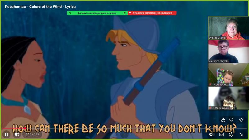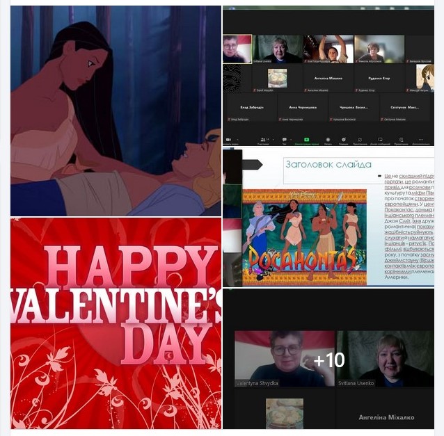 Для учнів Ліцею №22 ДМР було проведено 6 навчально-просвітницьких уроків керівником інформаційного центру «Вікно в Америку» у Дніпрі Світланою Усенко по темі «ІСТОРІЯ ТА МИСТЕЦТВО: Знайомство з ранньою історією США та міфічна історія кохання Покахонтас і Джона». За письмовою розповіддю англійського капітана Джона Сміта, одного із засновників британської колонії Джеймстаун (штат Вірджинія, США), в 1607 році юна індіанська принцеса Покахонтас врятувала його від смерті, коли він, вирушивши на пошуки провізії для колоністів, був захоплений індіанцями. Благаючи зберегти життя Сміту, дівчинка могла виконувати обряд алгонкінів, за допомогою якого вождь Поухатан демонстрував владу над життям та смертю, приймаючи Сміта та поселенців Джеймстауна під своє верховне панування. Покахонтас частенько навідувалася до англійців, які жили всього за 12 миль від її рідного племені. Згодом вона навчилася розуміти англійську мову та могла вести переговори, умови яких були прості: англійці зобов'язувалися не чіпати індіанців в обмін на провізію, проте часом англійці вимагали забагато. Дізнатися більше про історію створення США школярам допоміг мультиплікаційний фільм «Покахонтас». Високохудожня мультиплікація та музика закохують у красу природи штату Вірджинія. Головна героїня співає англійцю Джону пісню «Кольори вітру», головний сенс якої «Слухай серцем!» / “Listen with your heart.” Музична тема з мультфільму під назвою «Кольори вітру» /«Colors of the Wind» у виконанні Ванесси Вільямс отримала премії «Оскар» і «Греммі». Фільм показує як страх і жадібність руйнують мир, а спроба слухати й намагатися зрозуміти індіанців – рятує їх. Події, зображені у фільмі, відбуваються близько 1607 року, з початку заснування Джеймстауну (Вірджинія) та перших контактів між європейцями та корінними племенами Північної Америки. Навчально-просвітницька зустріч охопила близько 60 учнів у дистанційному режимі. Учні слухали англійську мову (аудіювання), читали англійською, перекладали на українську, завчили правильну фонетичну вимову нових слів, якими можна розповідати про історію дружби і кохання Покахонтас і Джона. Така зустріч у переддень Дня Святого Валентина додала романтичного настрою і оптимізму її учасникам. Зустрічі відбулися на прохання вчителя англійської мови Ліцею №22 ДМР Валентини Швидкої.