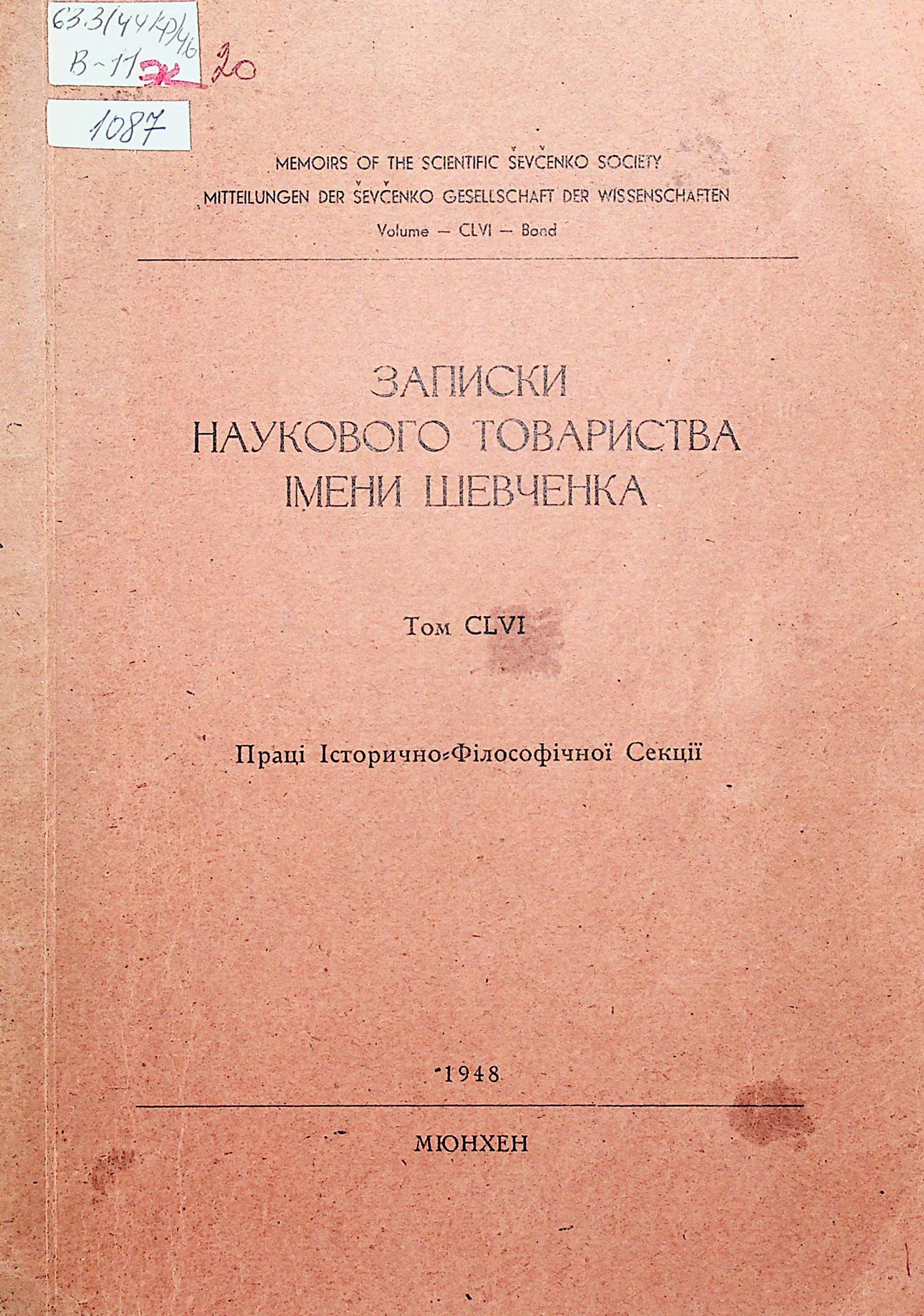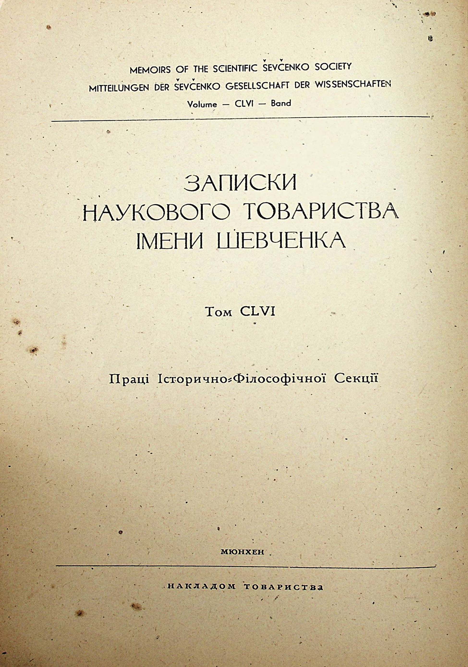 ЗАПИСКИ НАУКОВОГО ТОВАРИСТВА ІМЕНИ ШЕВЧЕНКА. Toм CLVI. Праці Історичної Філософічної Секції