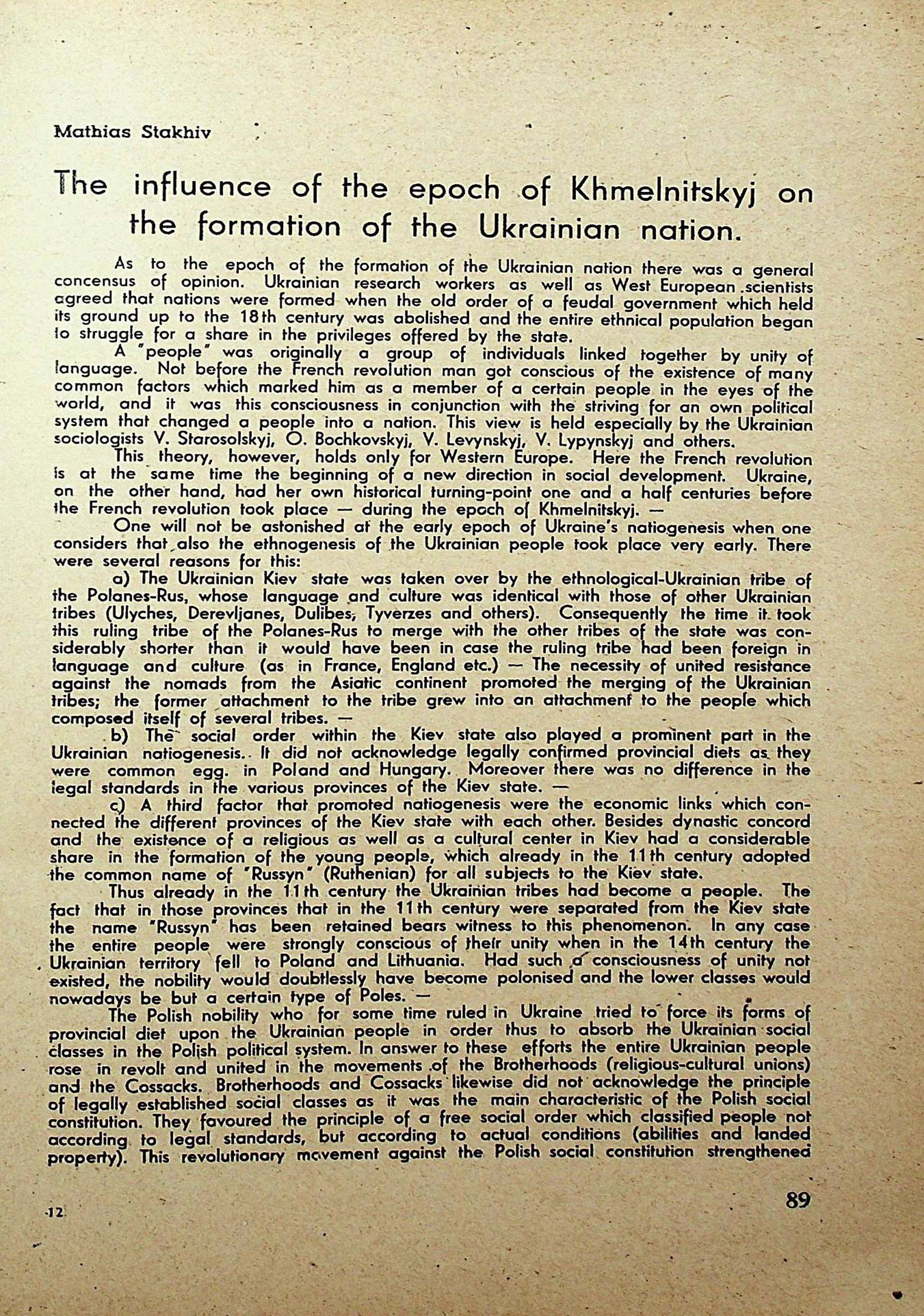 Mathias Stakhiv. The influence of the epoch of Khmelnitskyj onthe formation of the Ukrainian nation