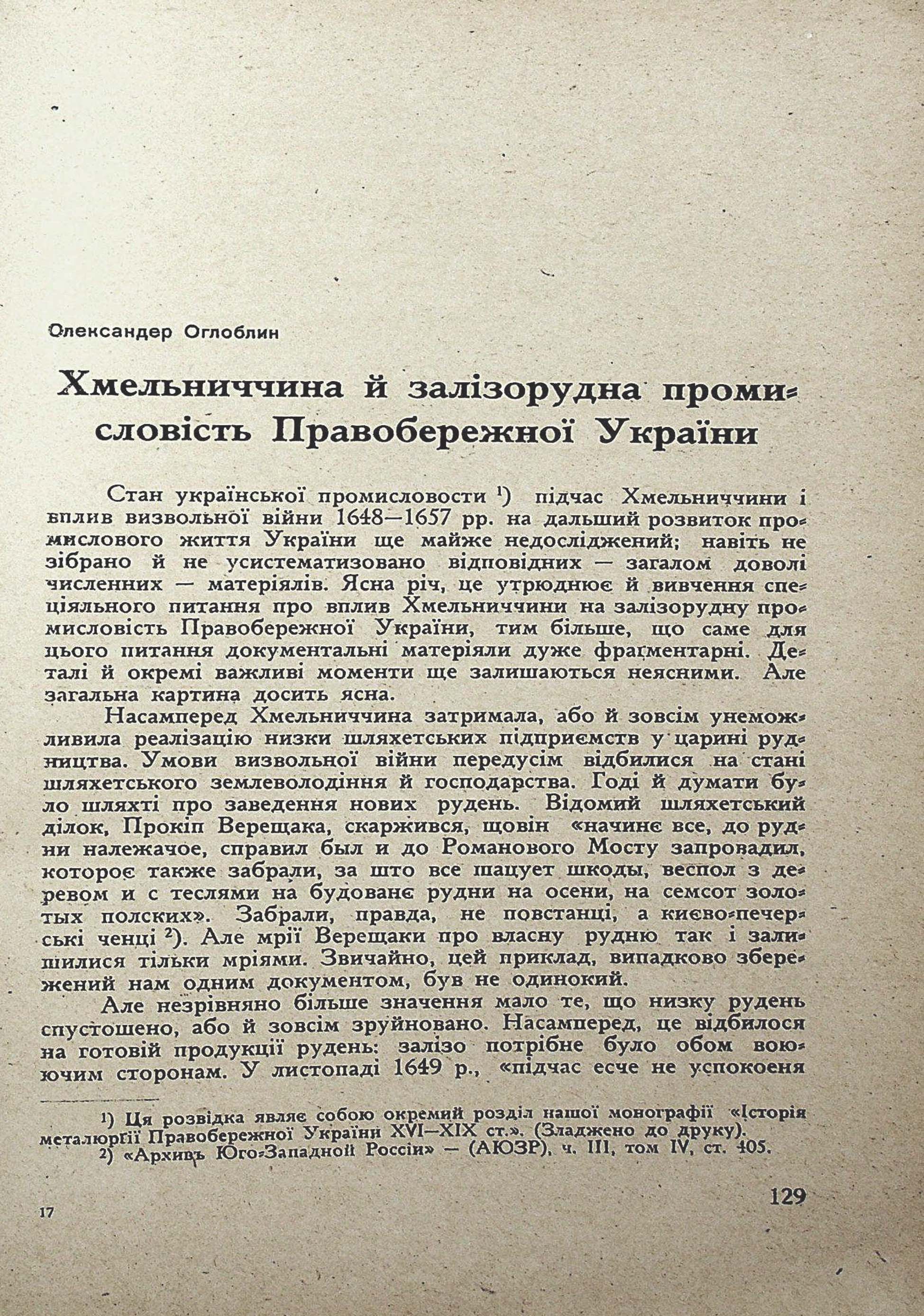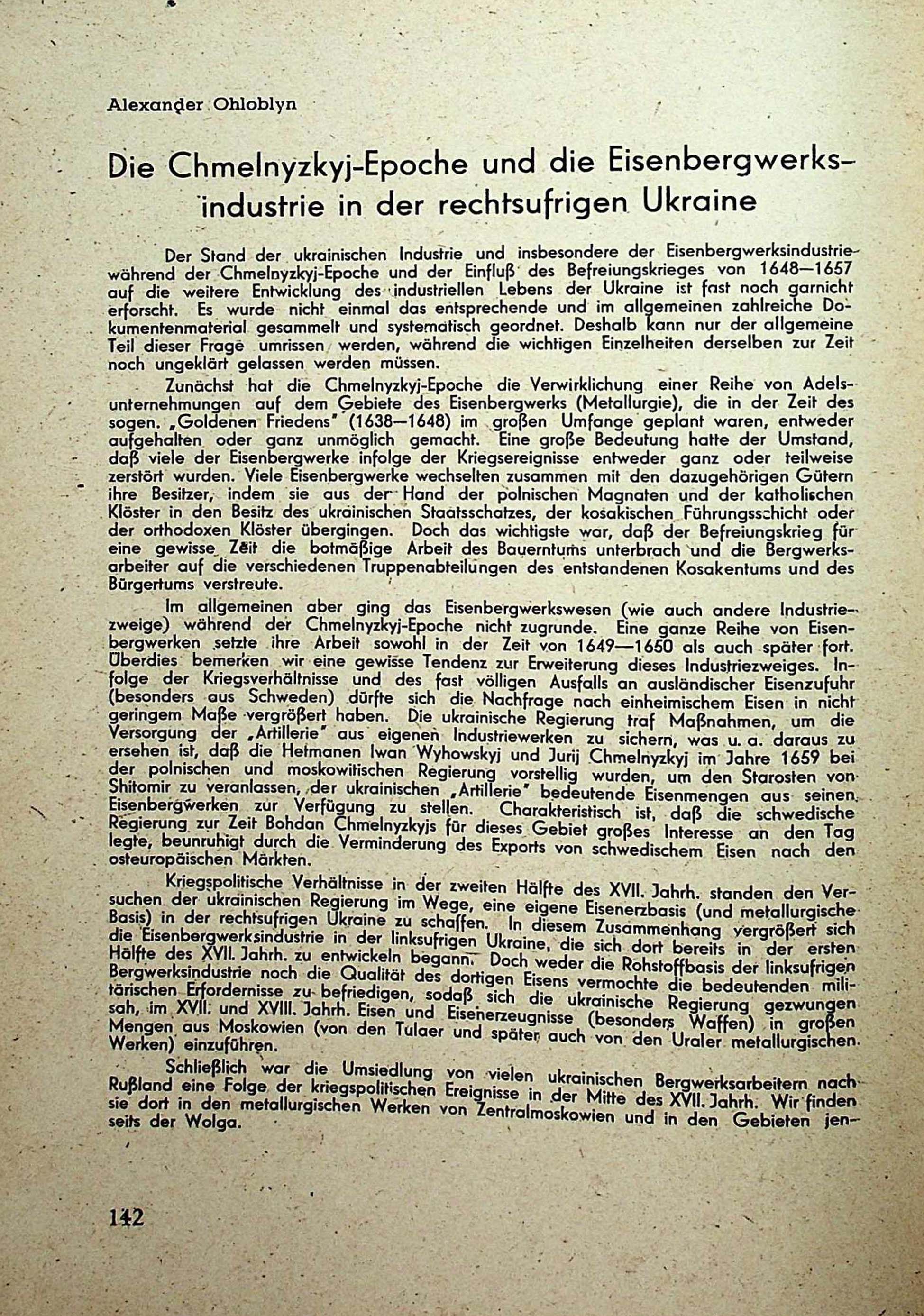Alexander Ohloblyn. Die Chmelnyzkyj-Epoche und die Eisenbergwerksindustriein der rechtsufrigen Ukraine