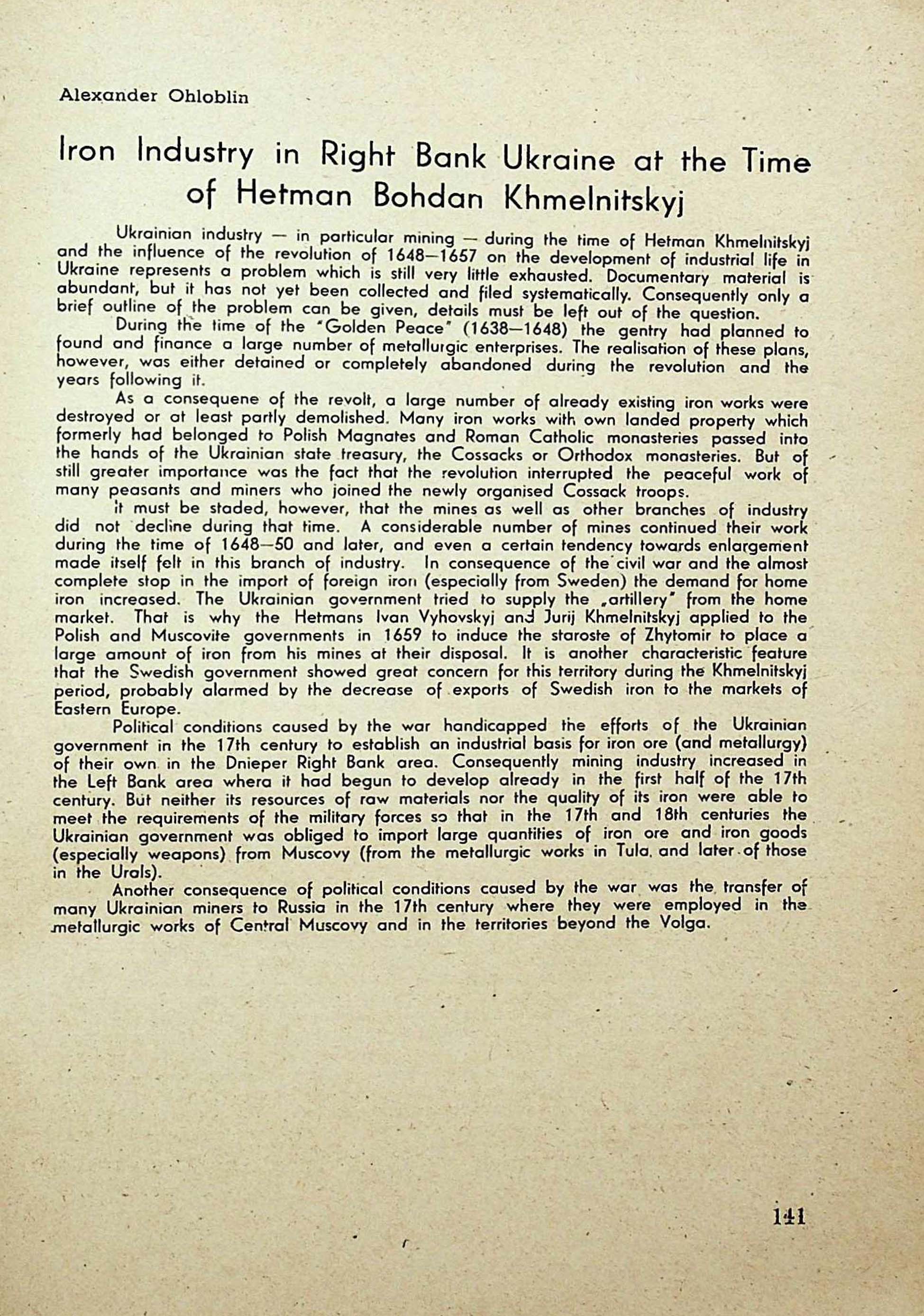 Alexander Ohlobin. Iron Industry in Right Bank Ukraine at the Timeof Hetman Bohdan Khmelnitskyj