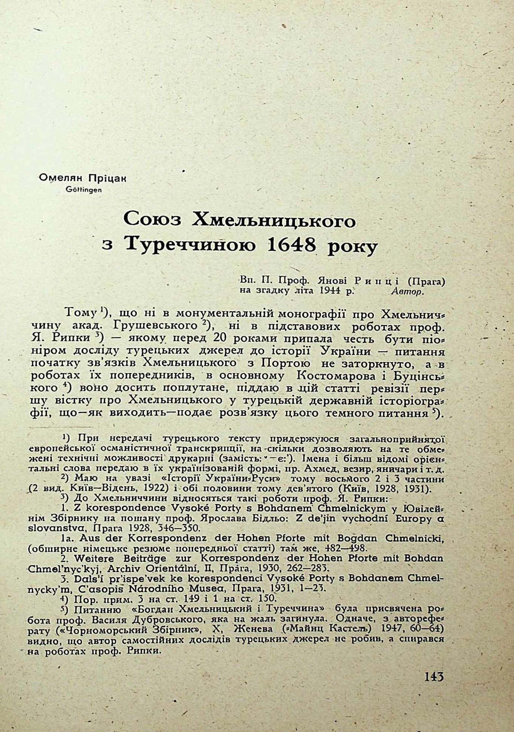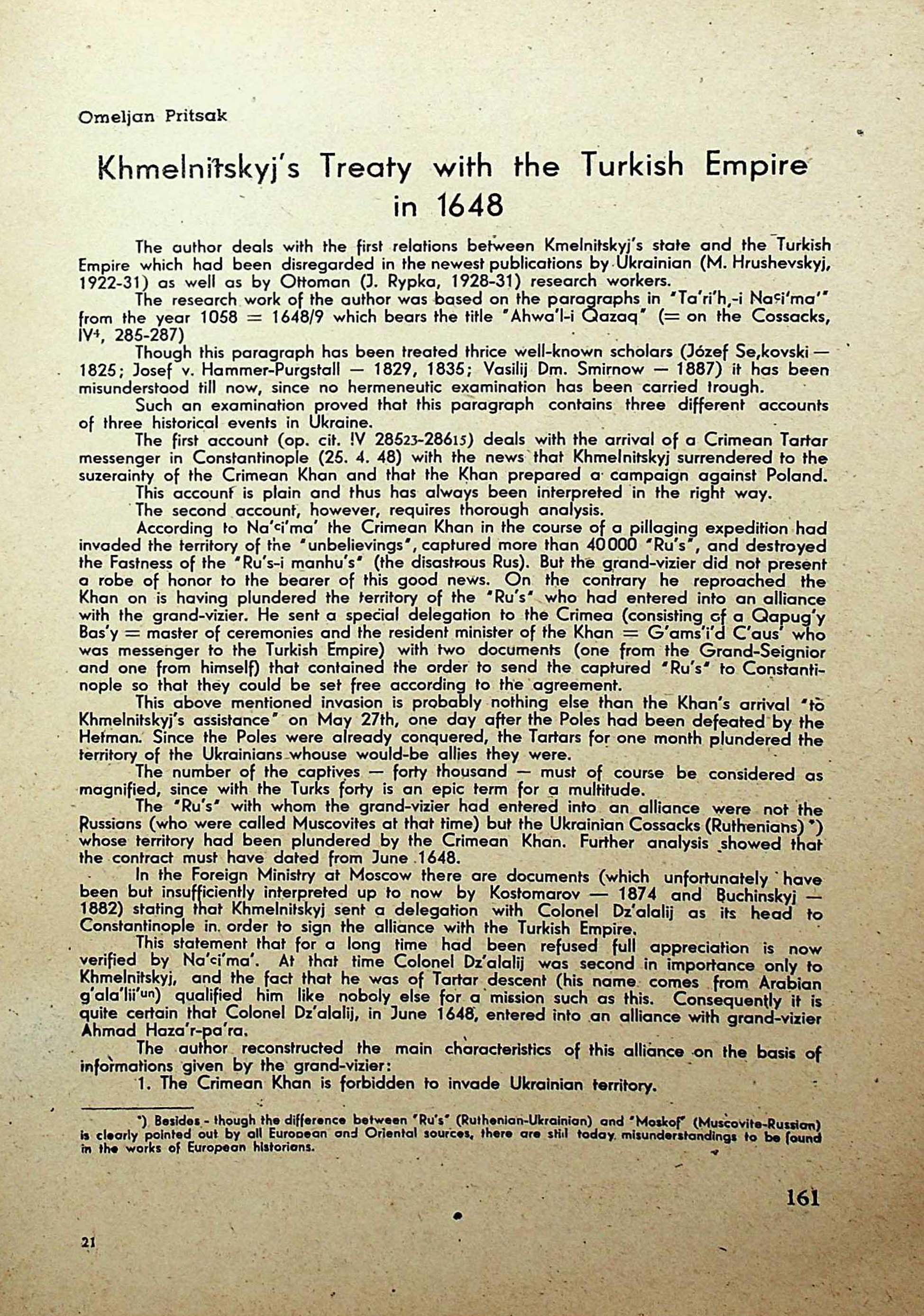 Omelian Pritsak. Khmelnitskyjs Treaty with the Turkish Empirein 1648