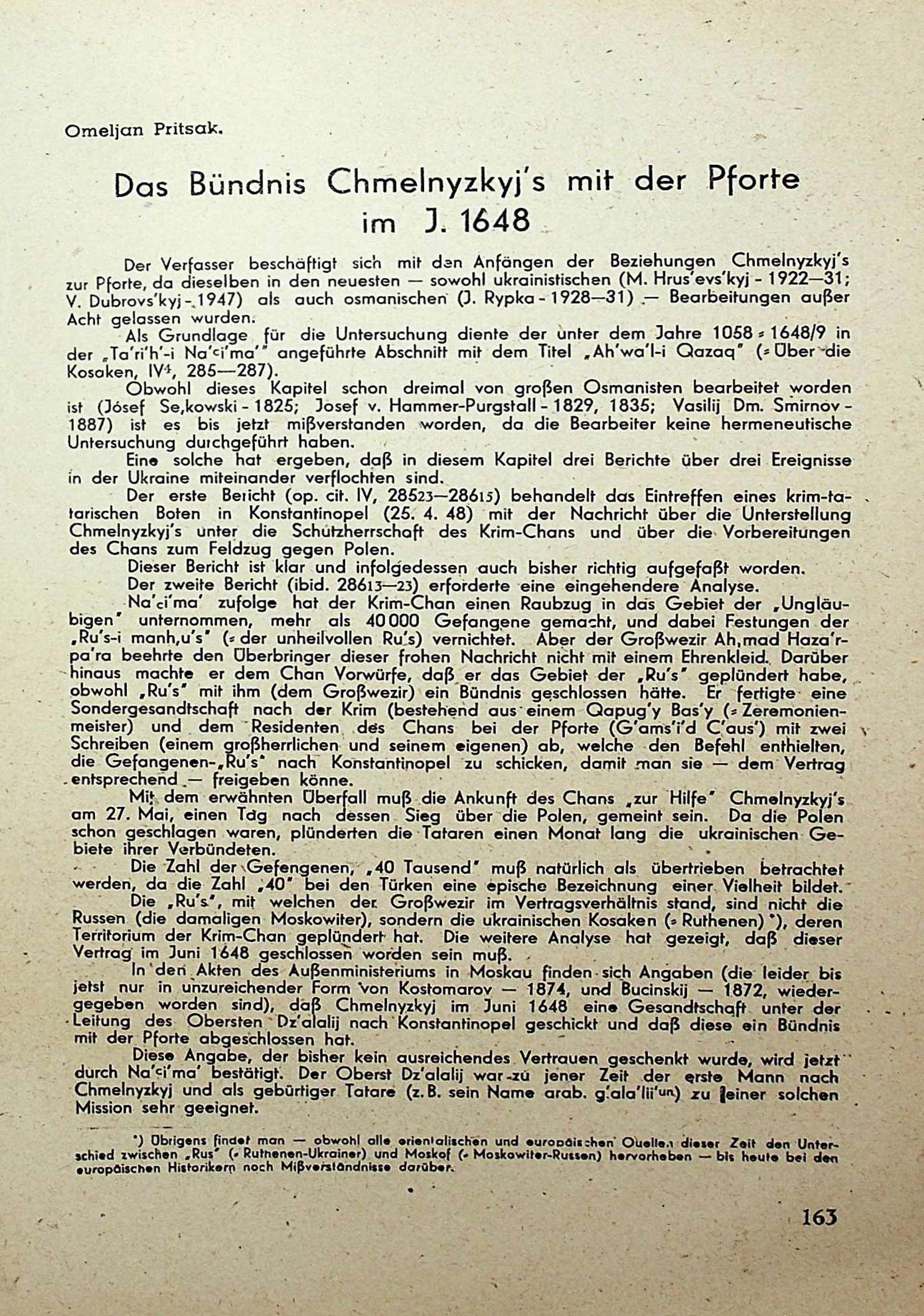 Omeljan Pritsak. Das Bündnis Chmelnyzkyj′s mit der Pforteim J. 1648