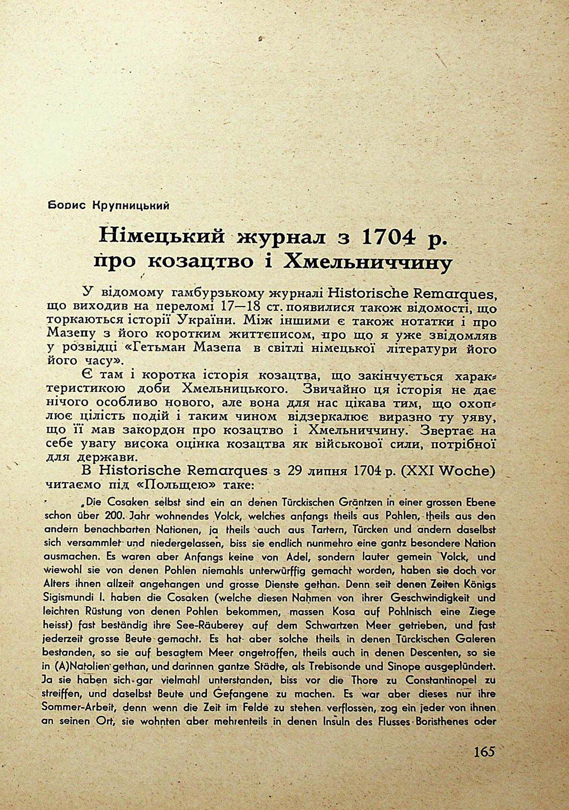 Борис Крупницький. Німецький журнал з 1704 р.про козацтво і Хмельниччину
