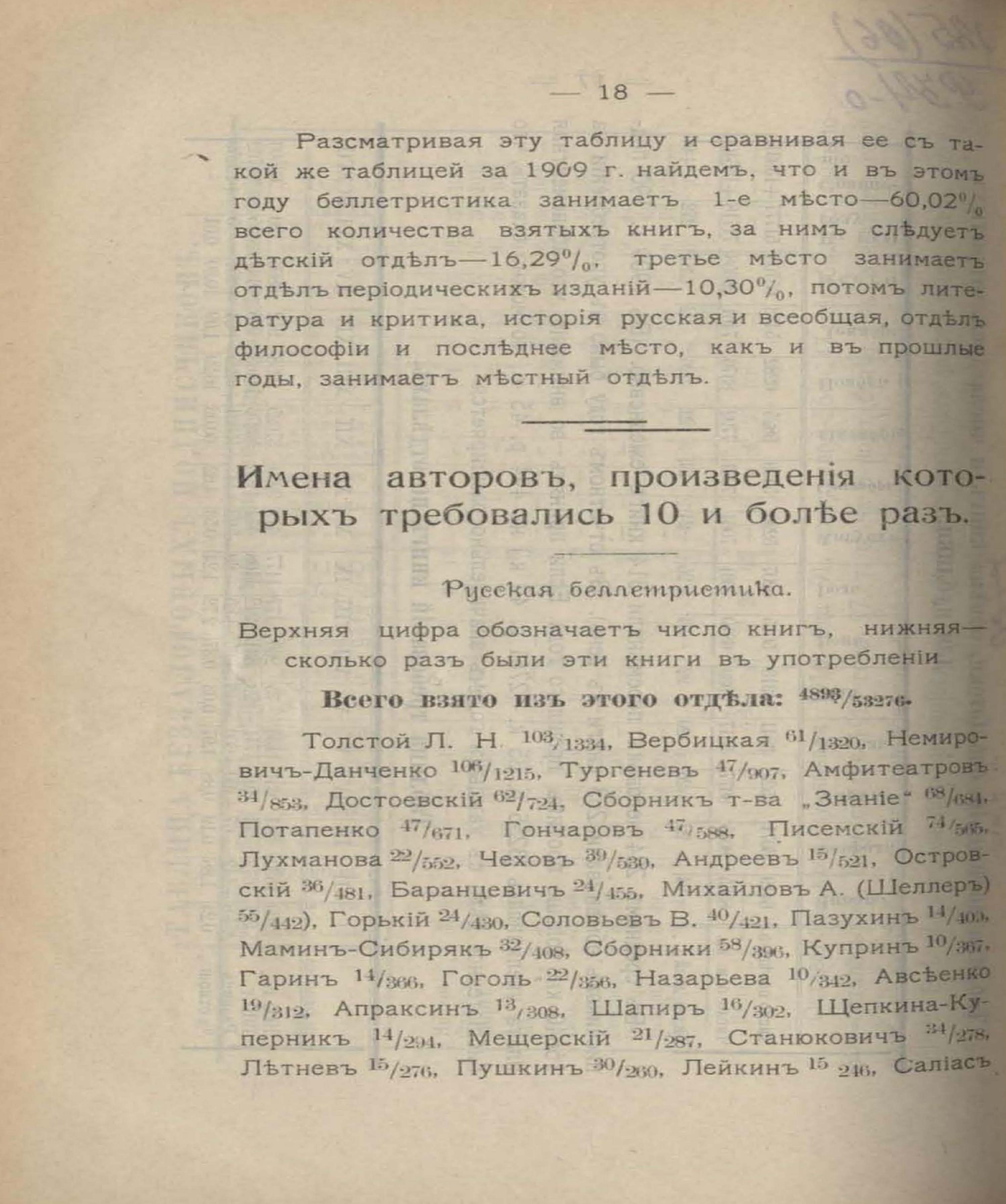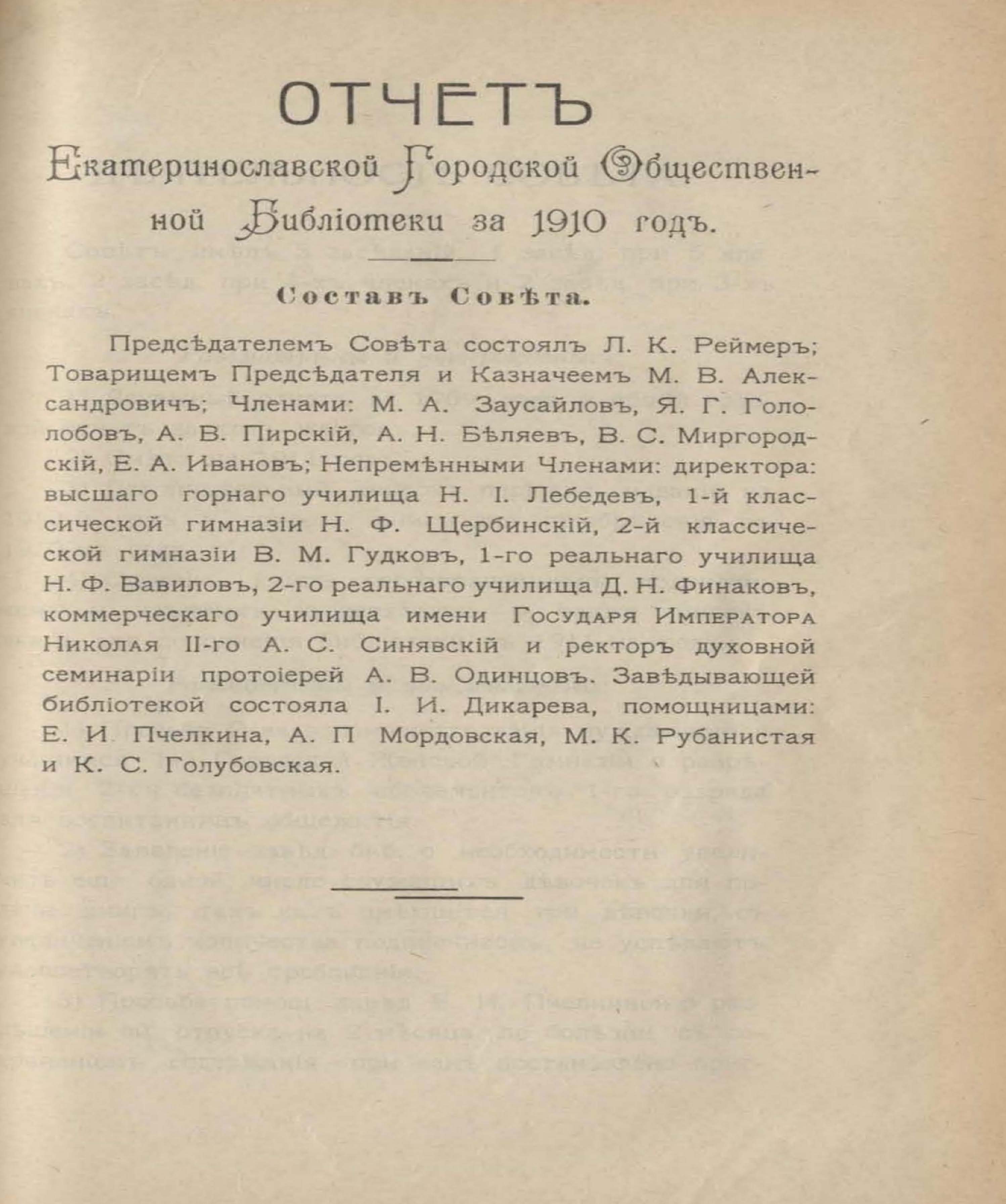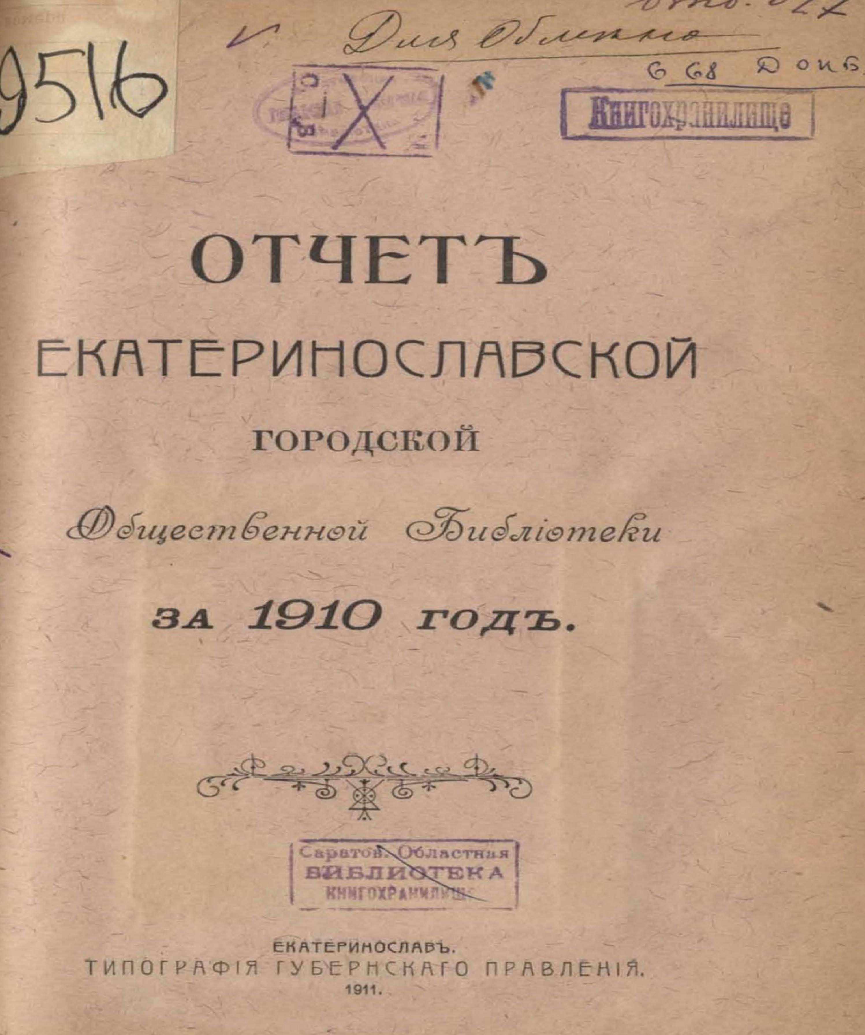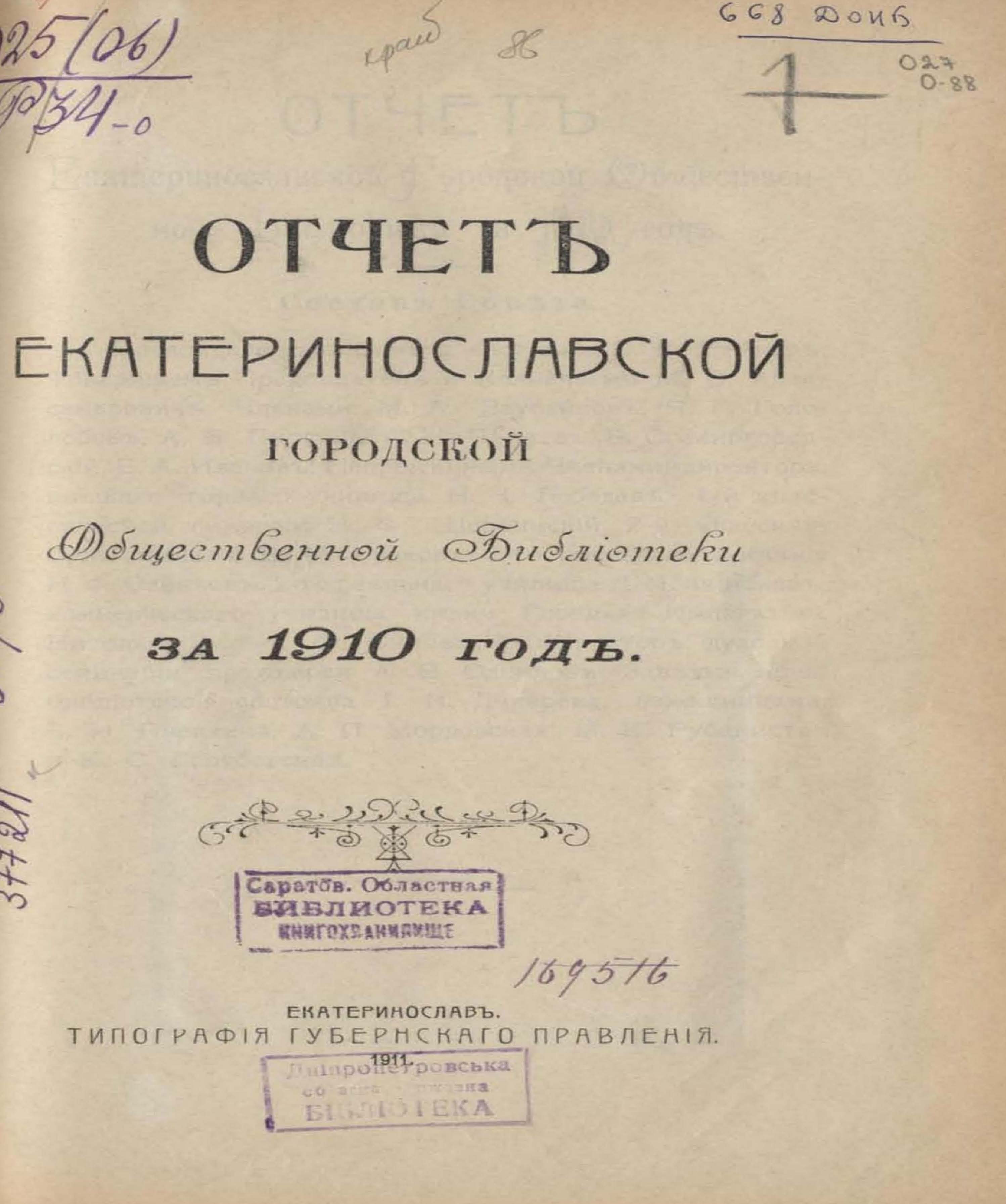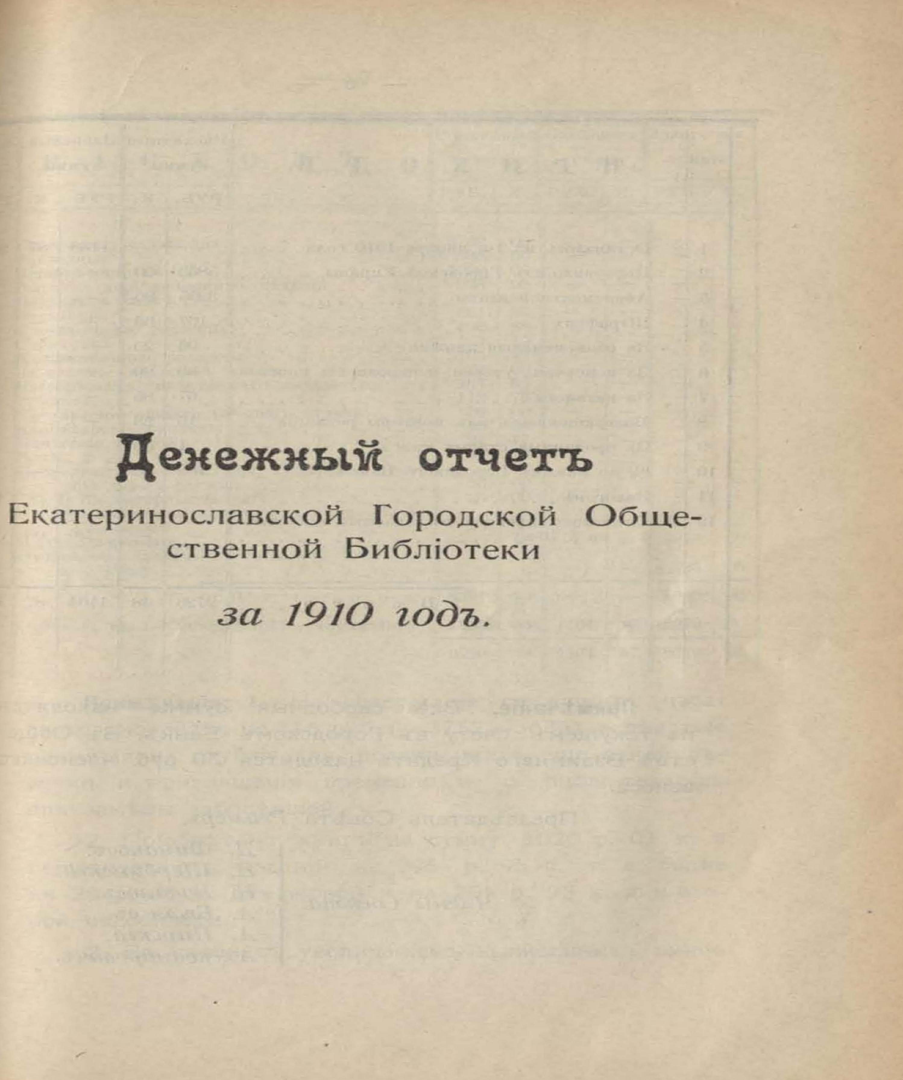 1. Отчетъ Екатеринославской Городской Общественной Библіотеки за 1910 годъ