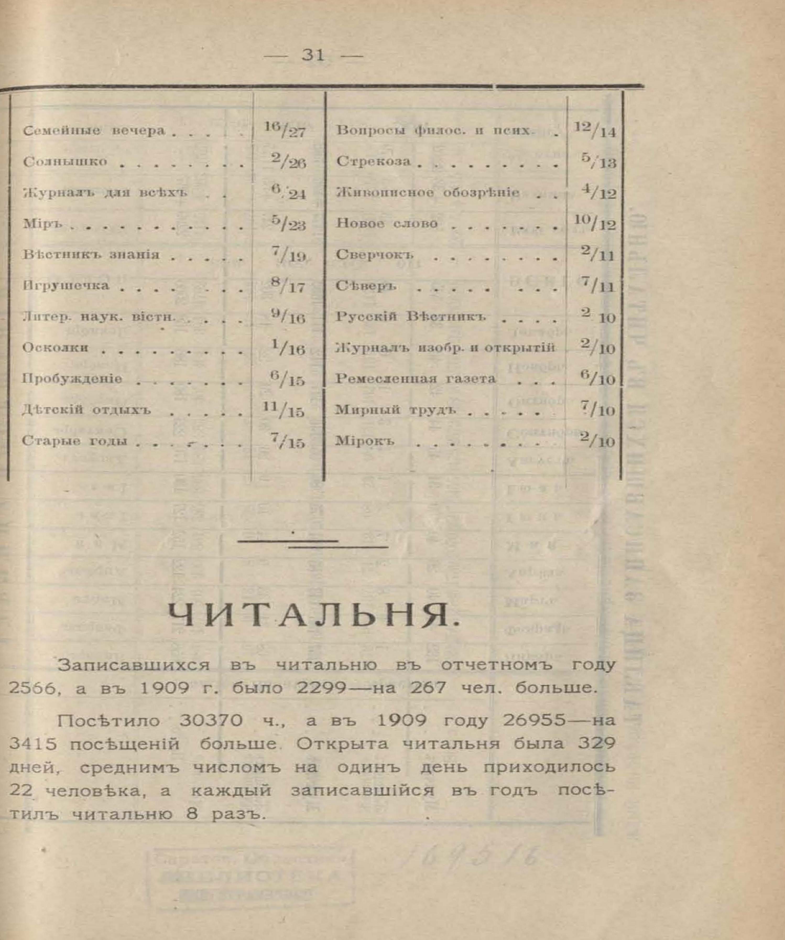 3. Отчетъ Екатеринославской Городской Общественной Библіотеки за 1910 годъ
