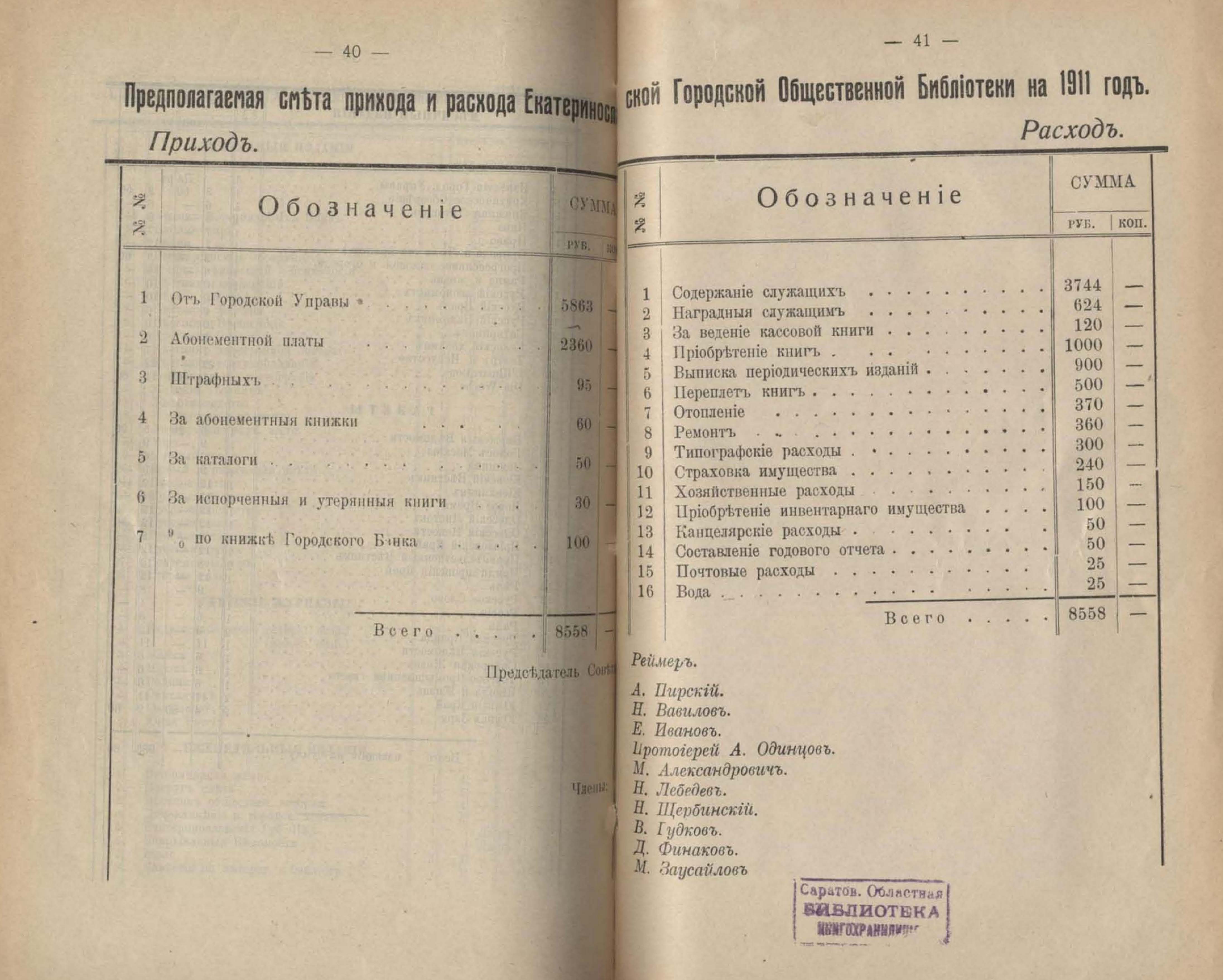Предполагаемая смъта прихода и расхода Екатеринославской Городской Общественной Библіотеки на 1911 годъ