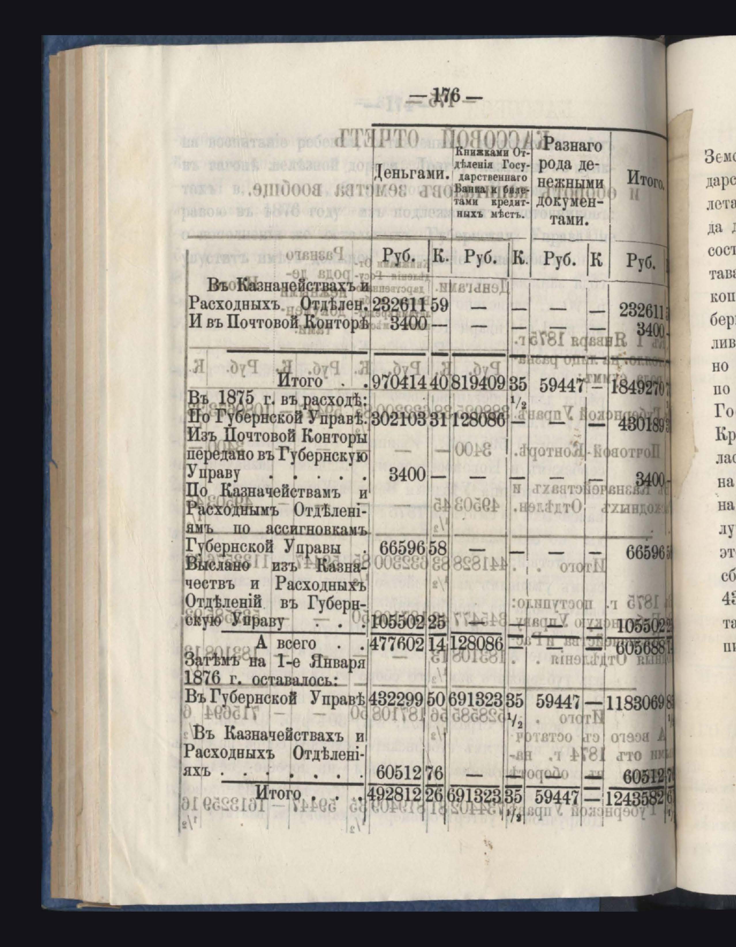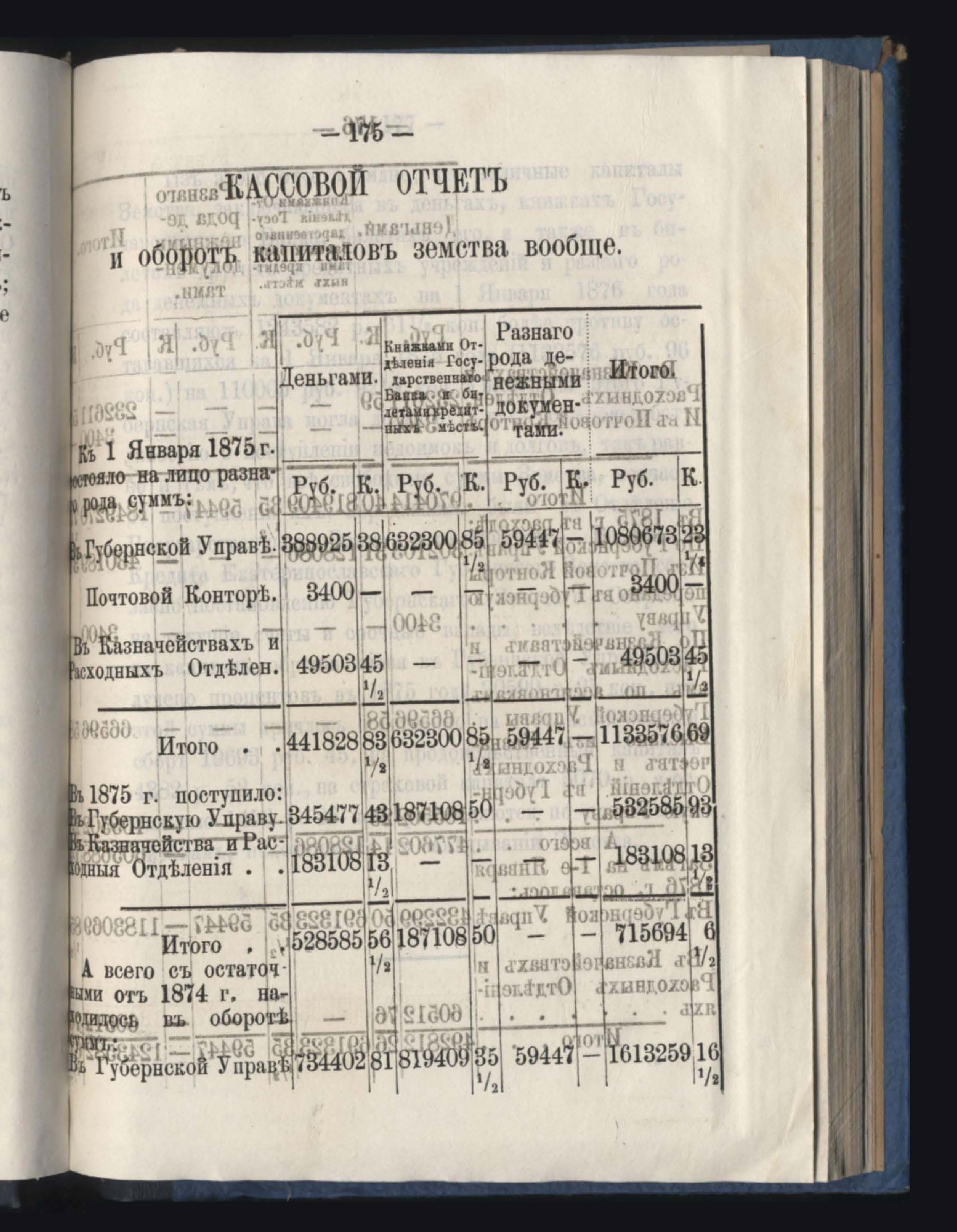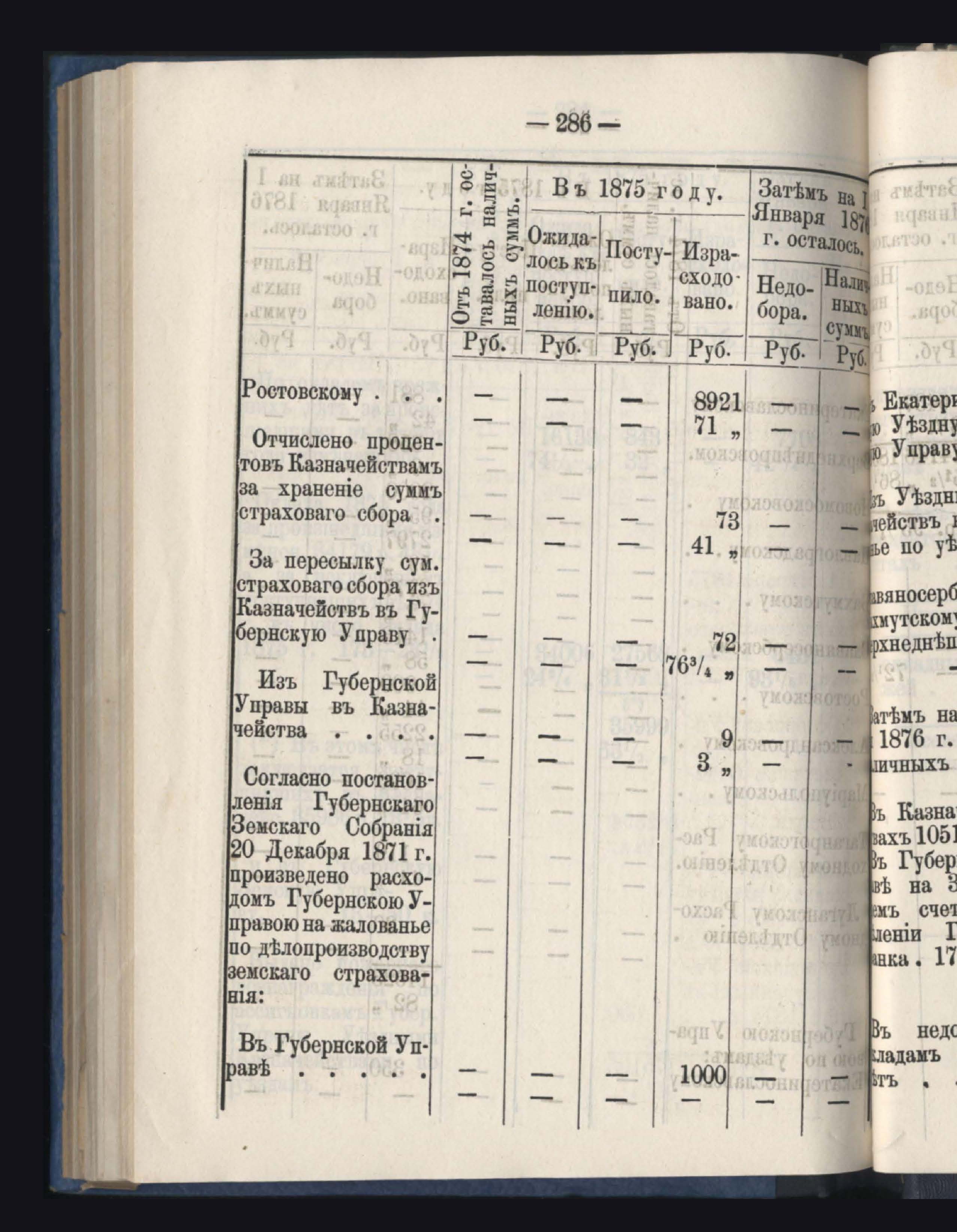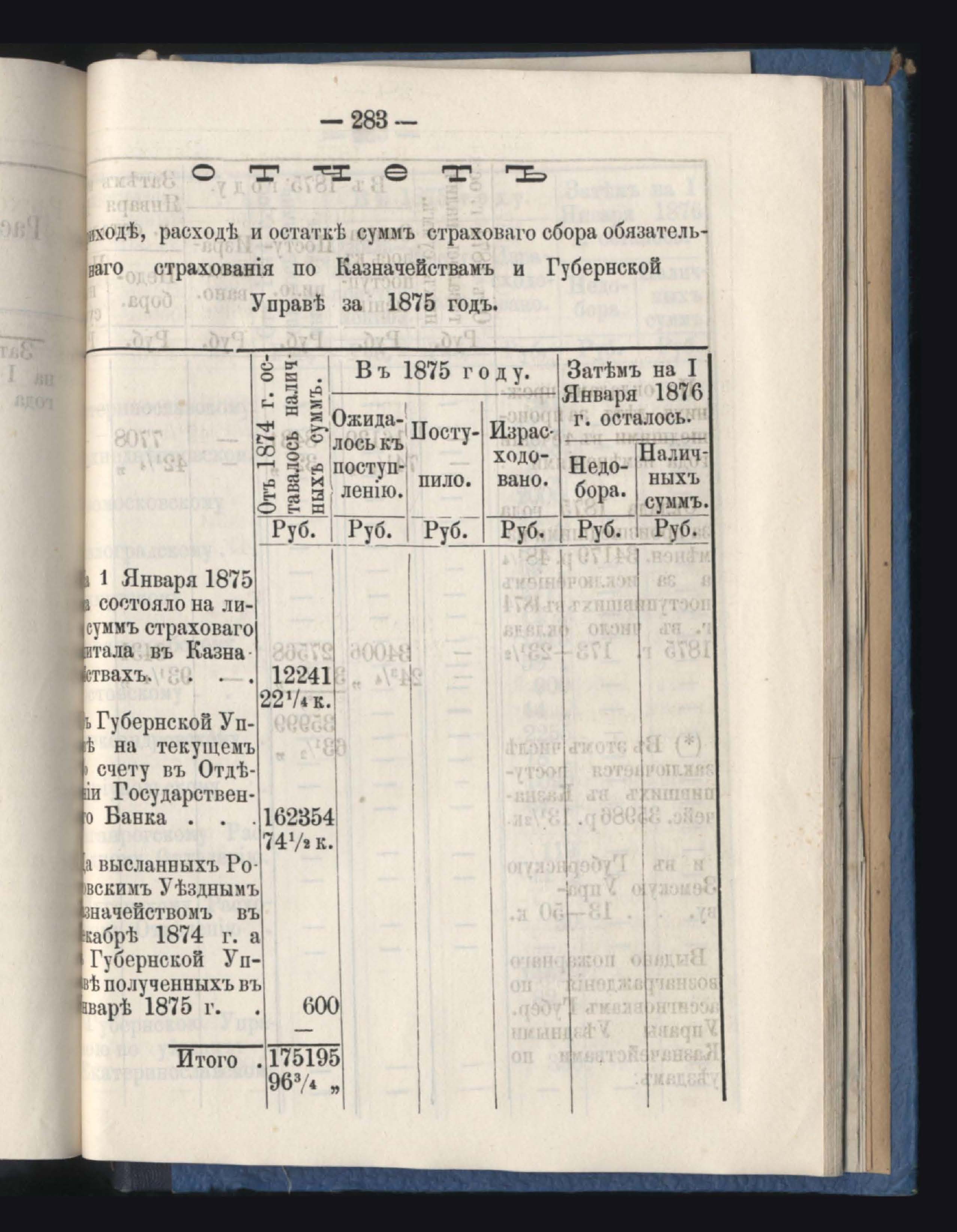 Отчетъ о приходъ, расходъ и остаткъ суммъ страховаго сбора обязательнаго страхованія по Казначействамъ и Губернской Управъ за 1875 годъ