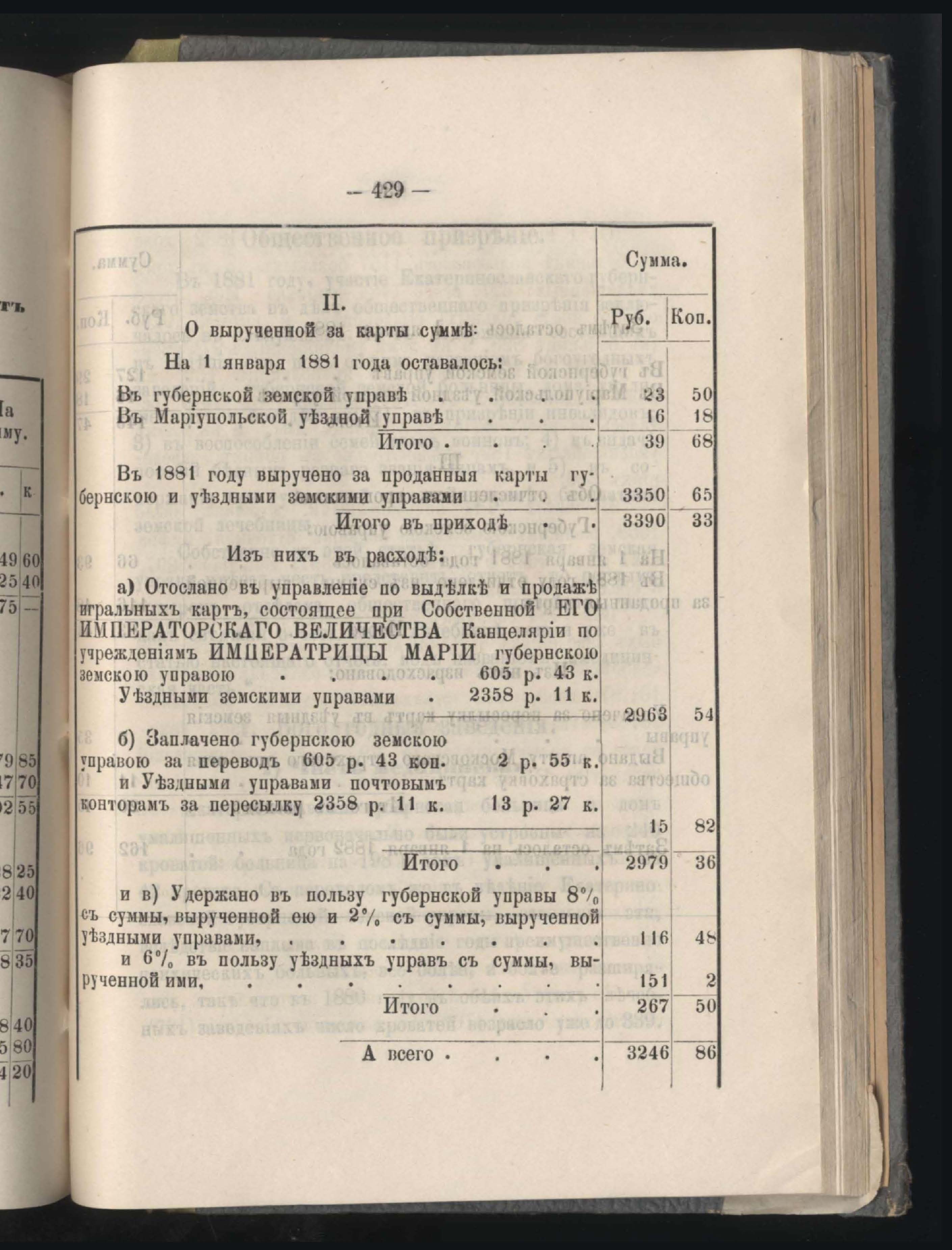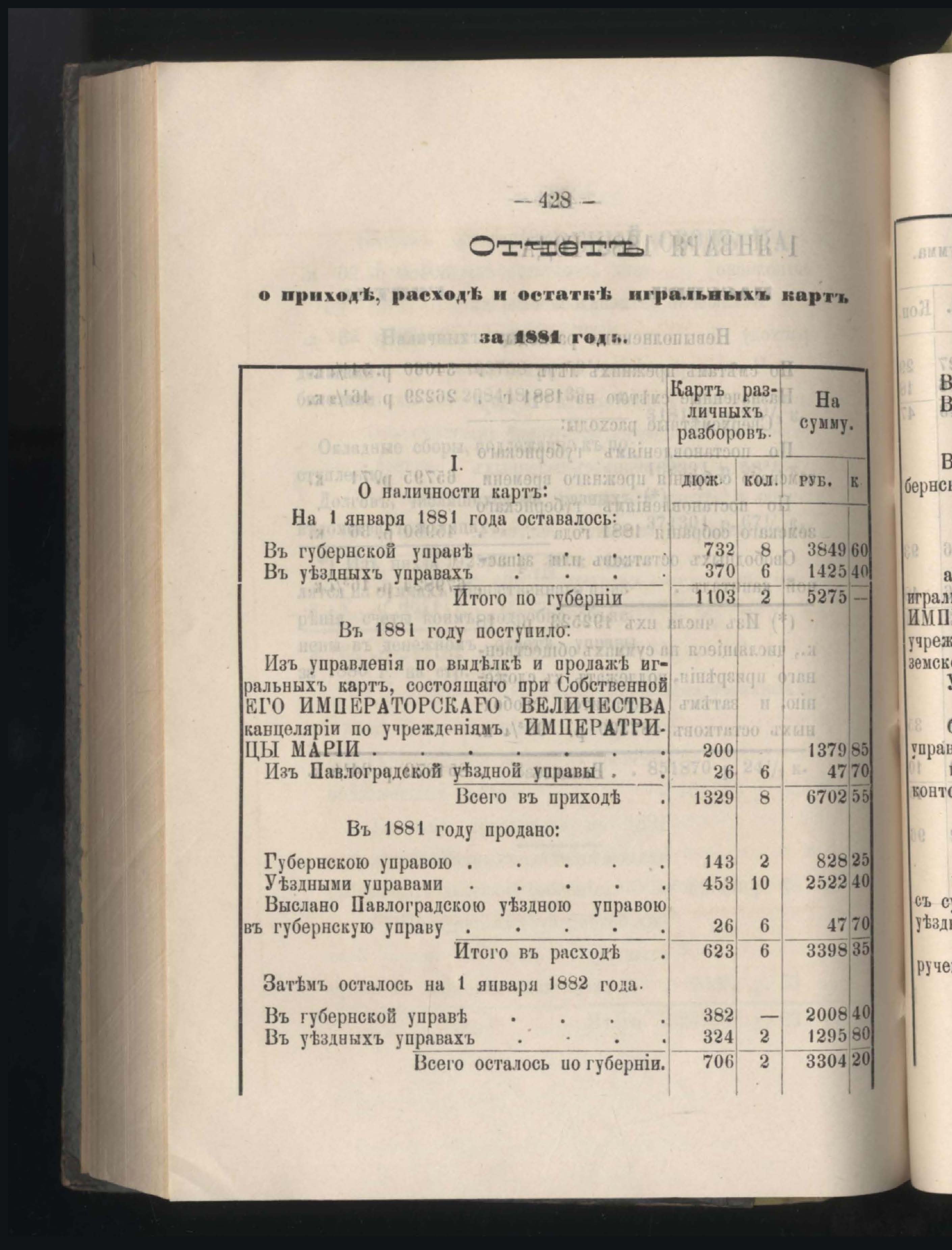 281. Отчетъ о приходъ, расходъ и остаткъ игральныхъ картъ за 1881 годъ