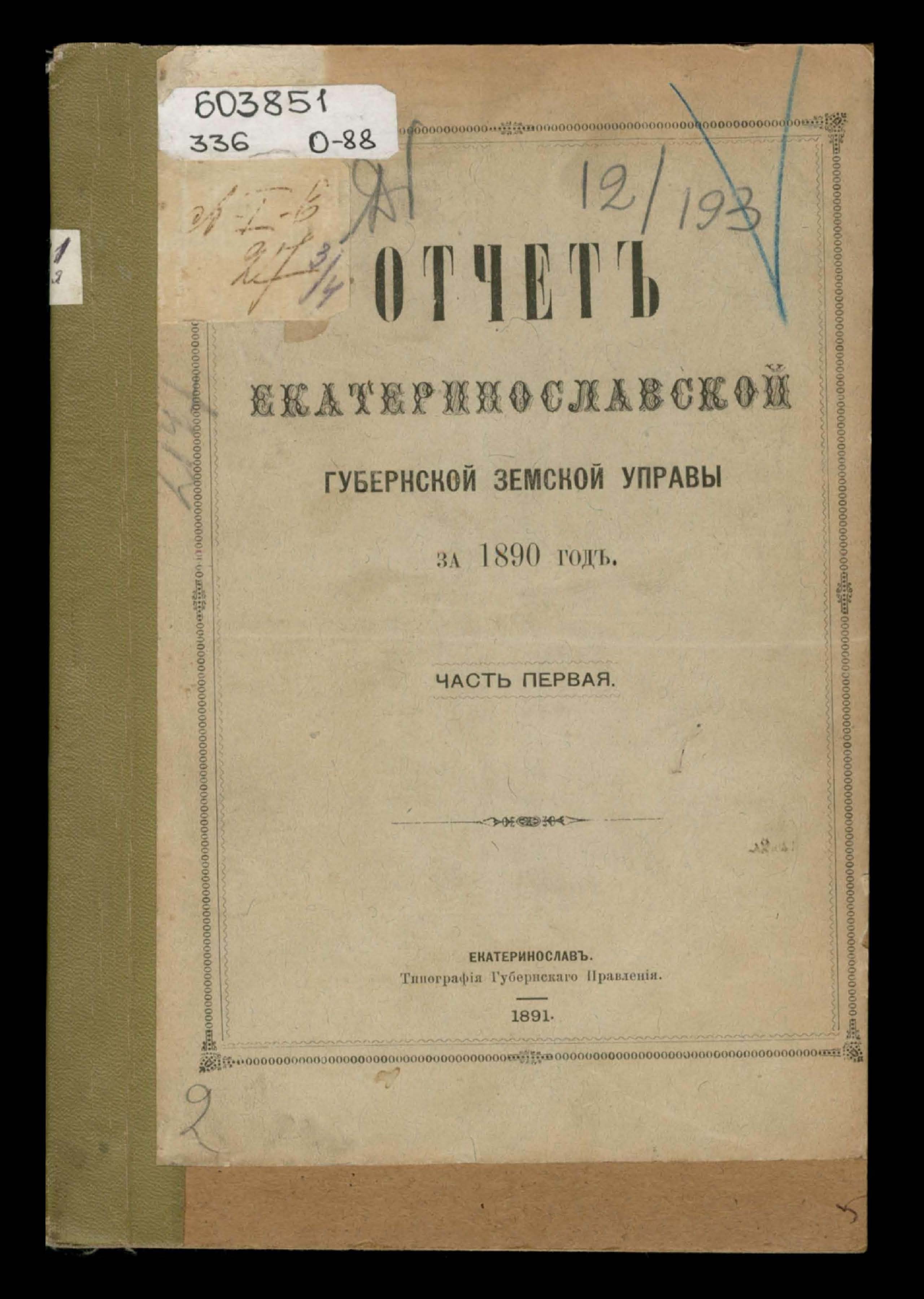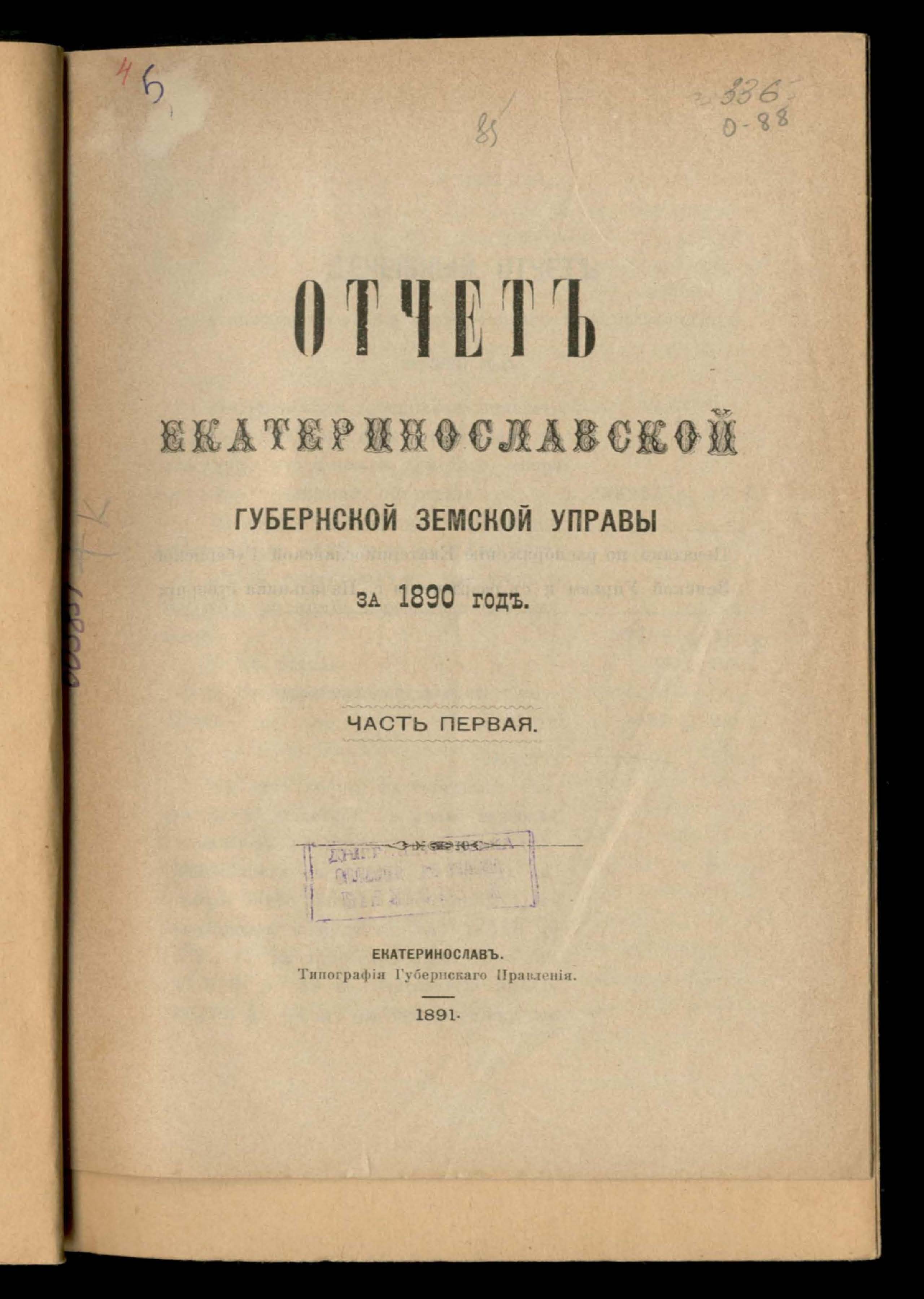5. Отчетъ Екатеринославской Губернской Земской Управы за 1890 годъ.Часть первая