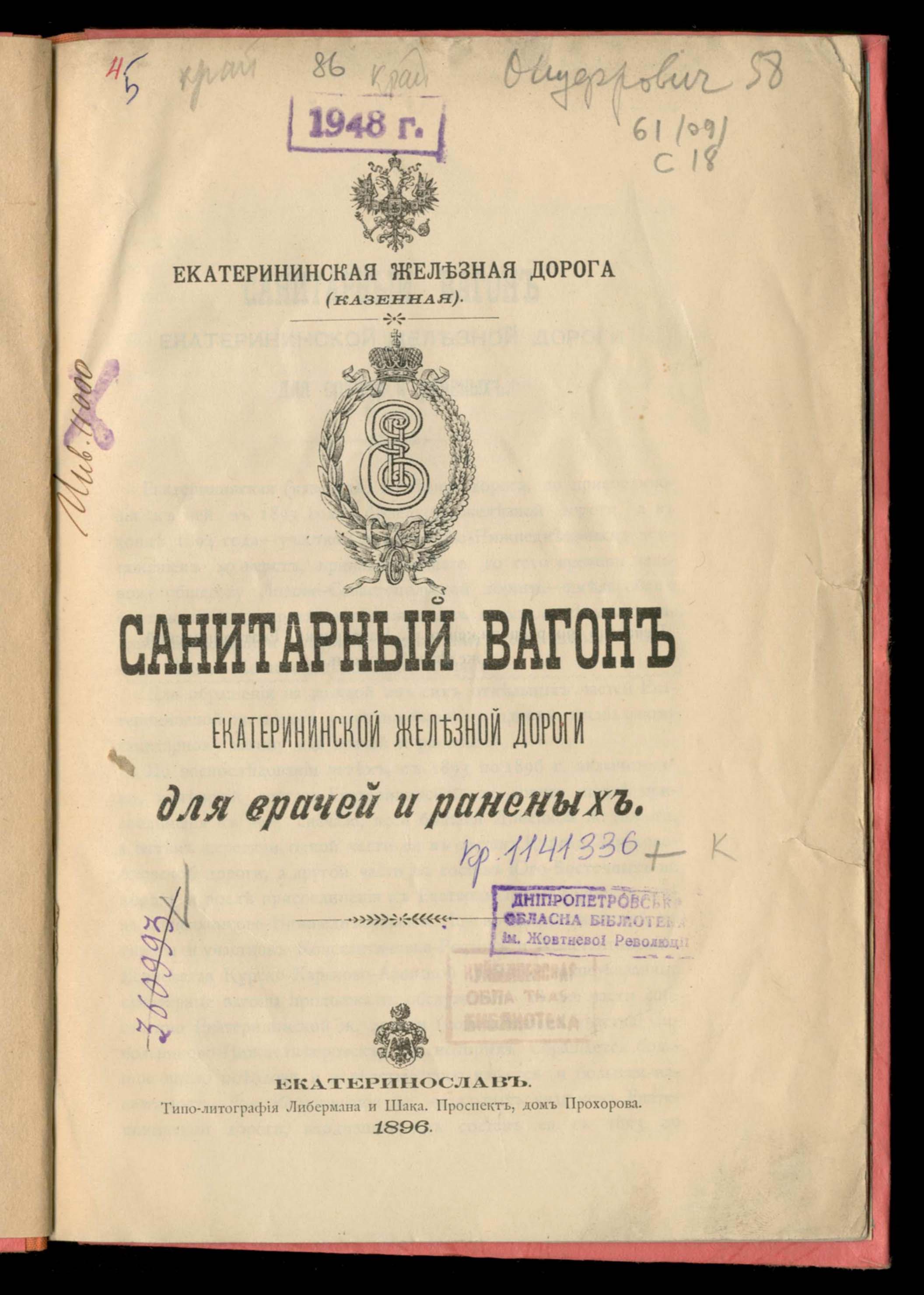 1. Санитарный вагонъ Екатерининской железной дороги для врачей и раненыхъ