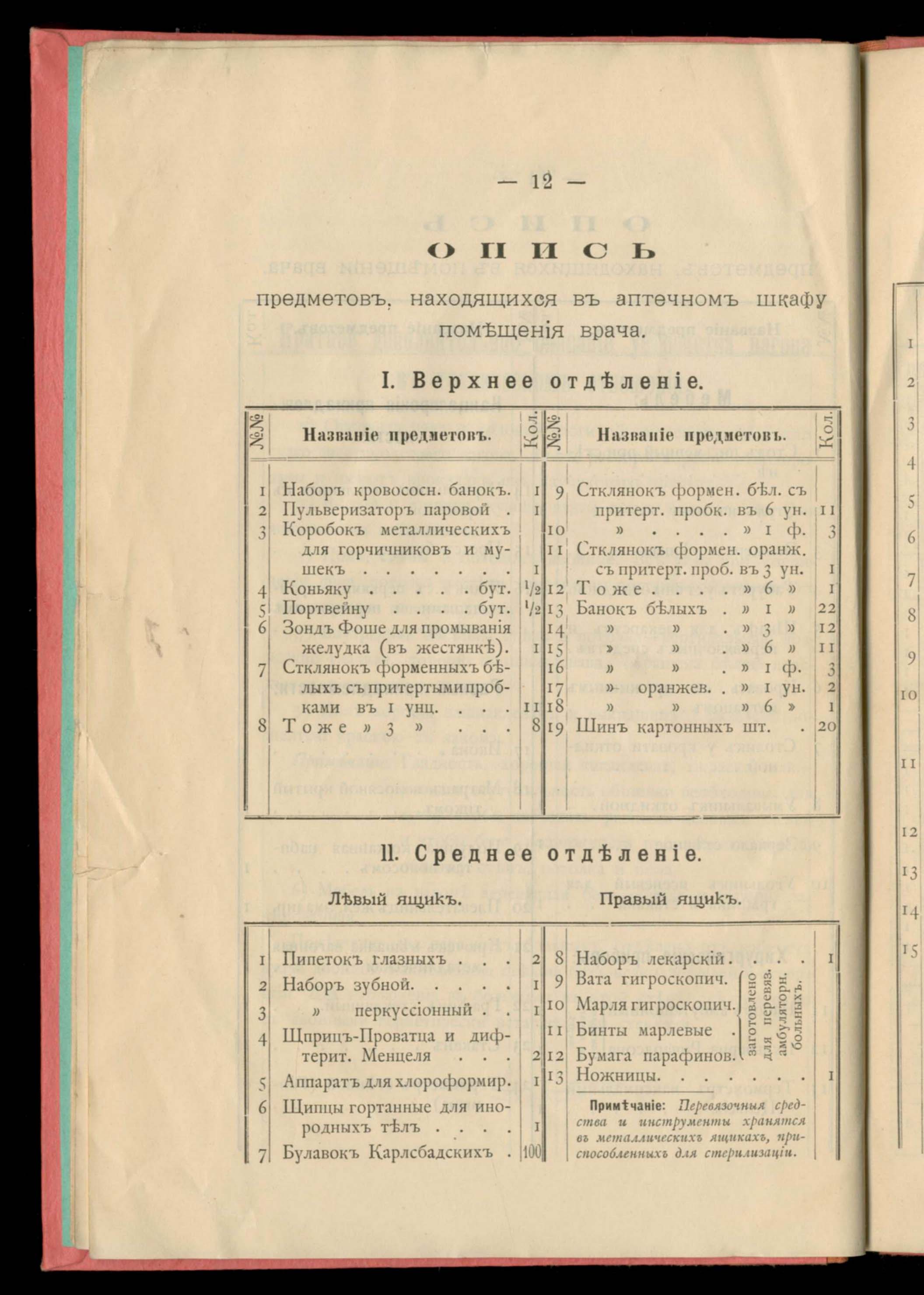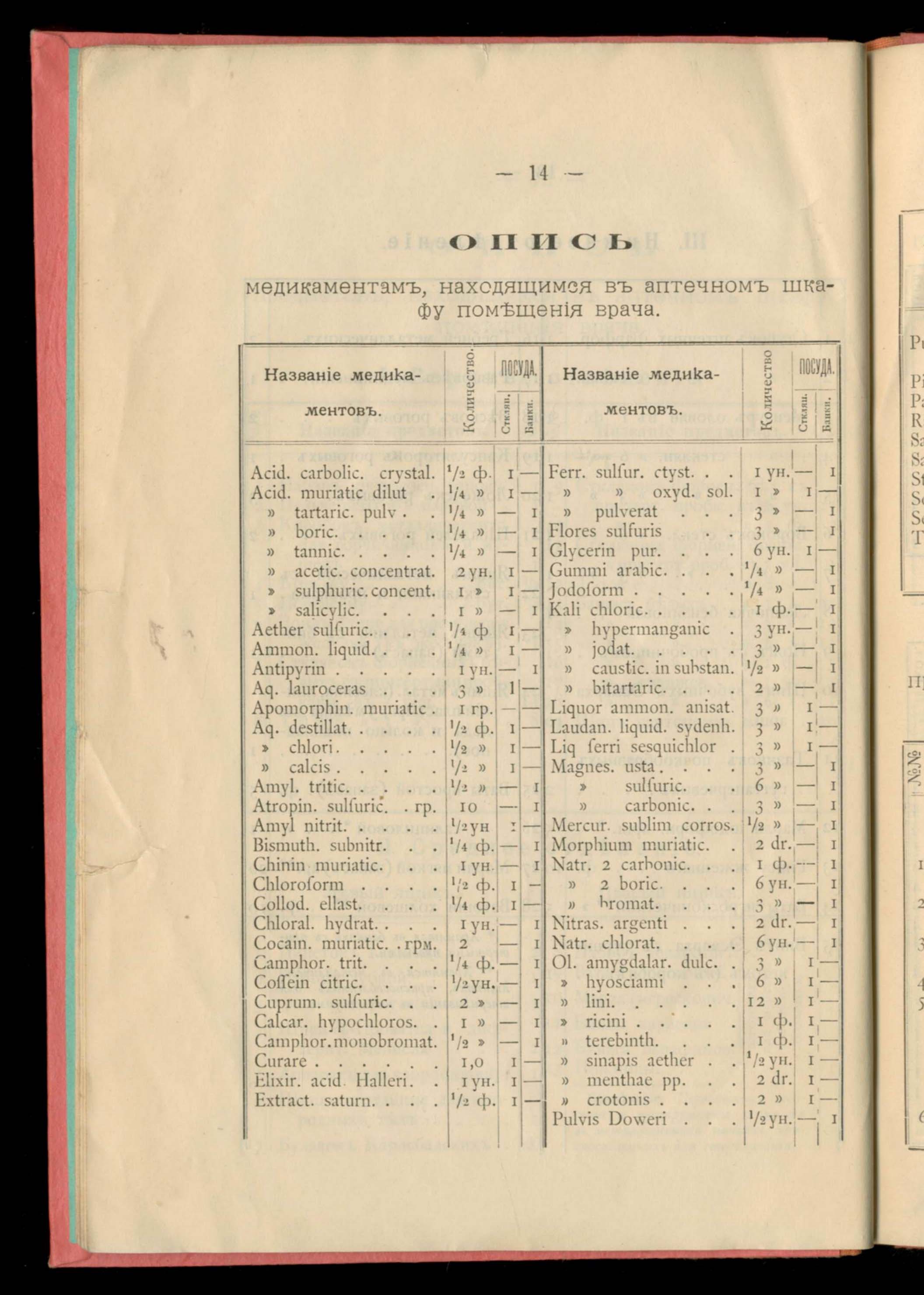 Опись предметовъ, находящихся въ аптечномъ шкафу помещенія врача