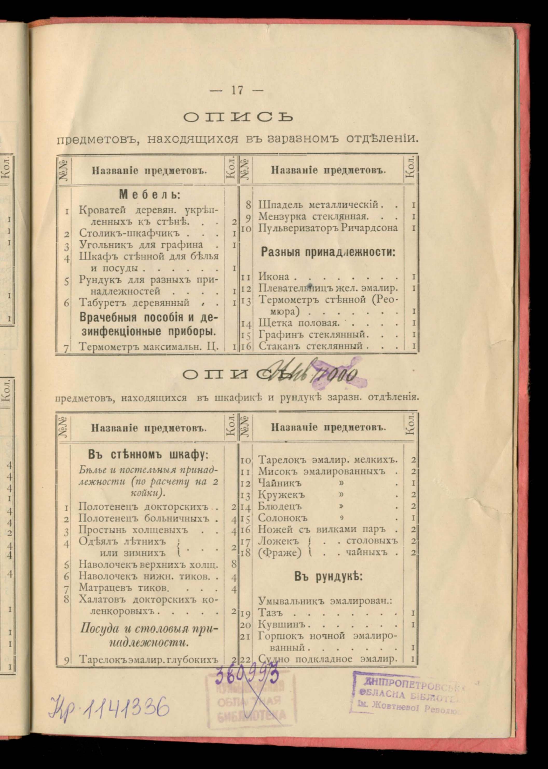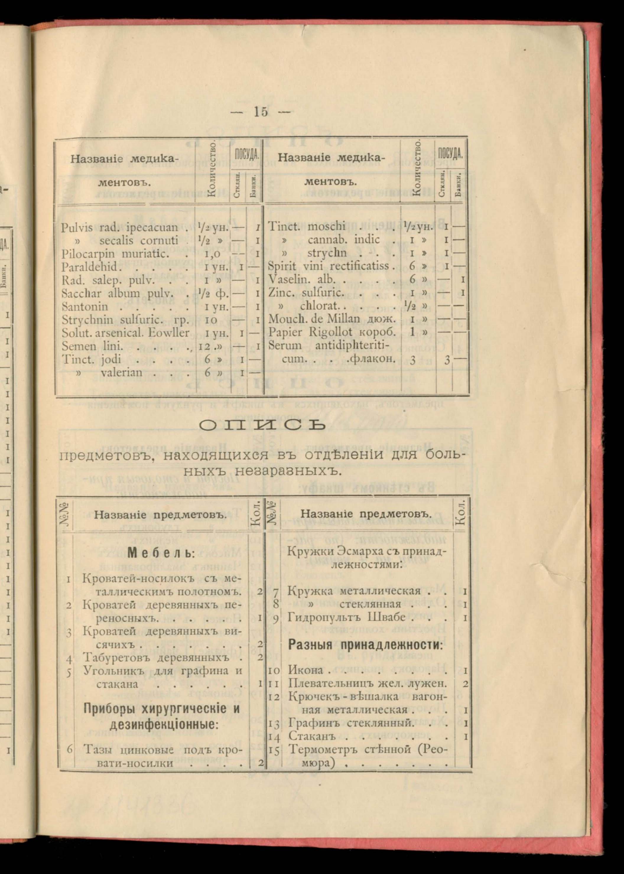 Опись предметовъ, находящихся въ заразномъ отделеніи. Опись предметовъ, находящихся въ шкафчике и рундуке заразн. отделенія