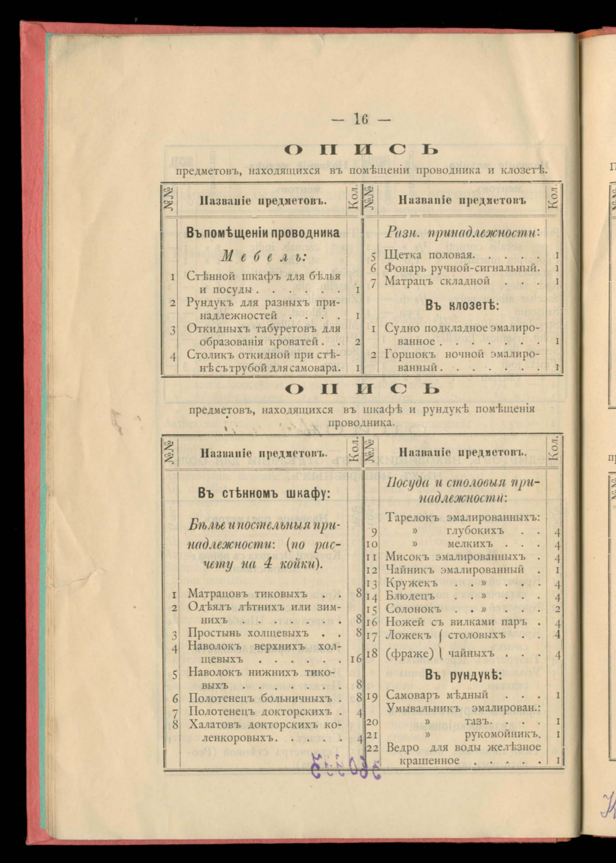 Опись предметовъ, находящихся въ помещеніи проводника и клозете. Опись предметовъ, находящихся въ шкафе и рундуке помещенія проводника