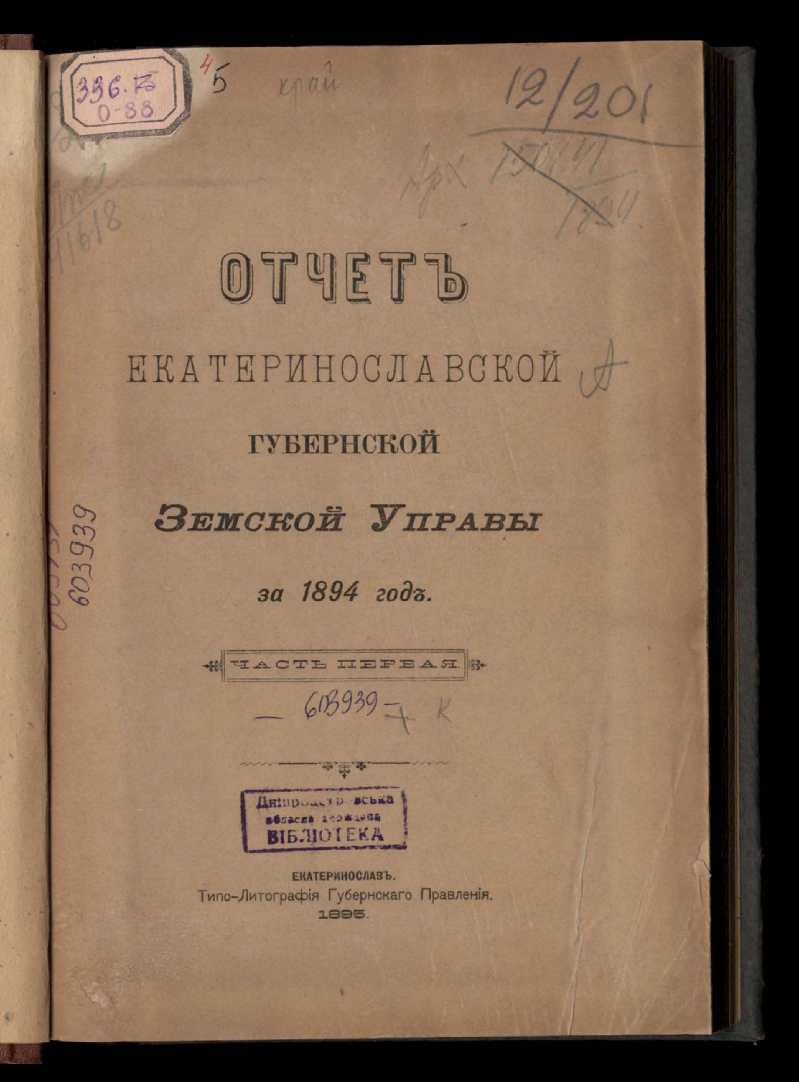 Отчетъ Екатеринославской Губернской Земской Управы за 1894 годъ. Часть первая
