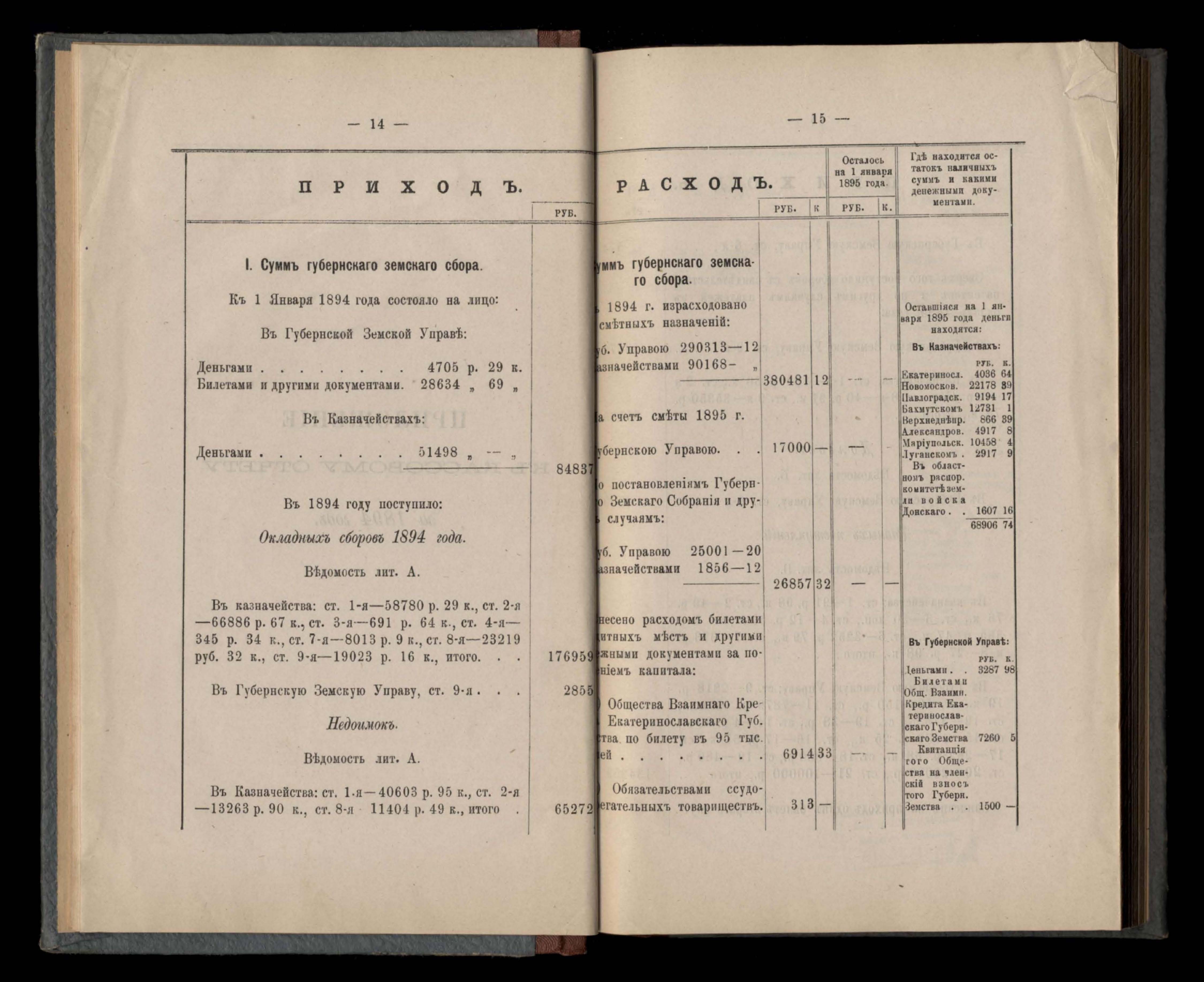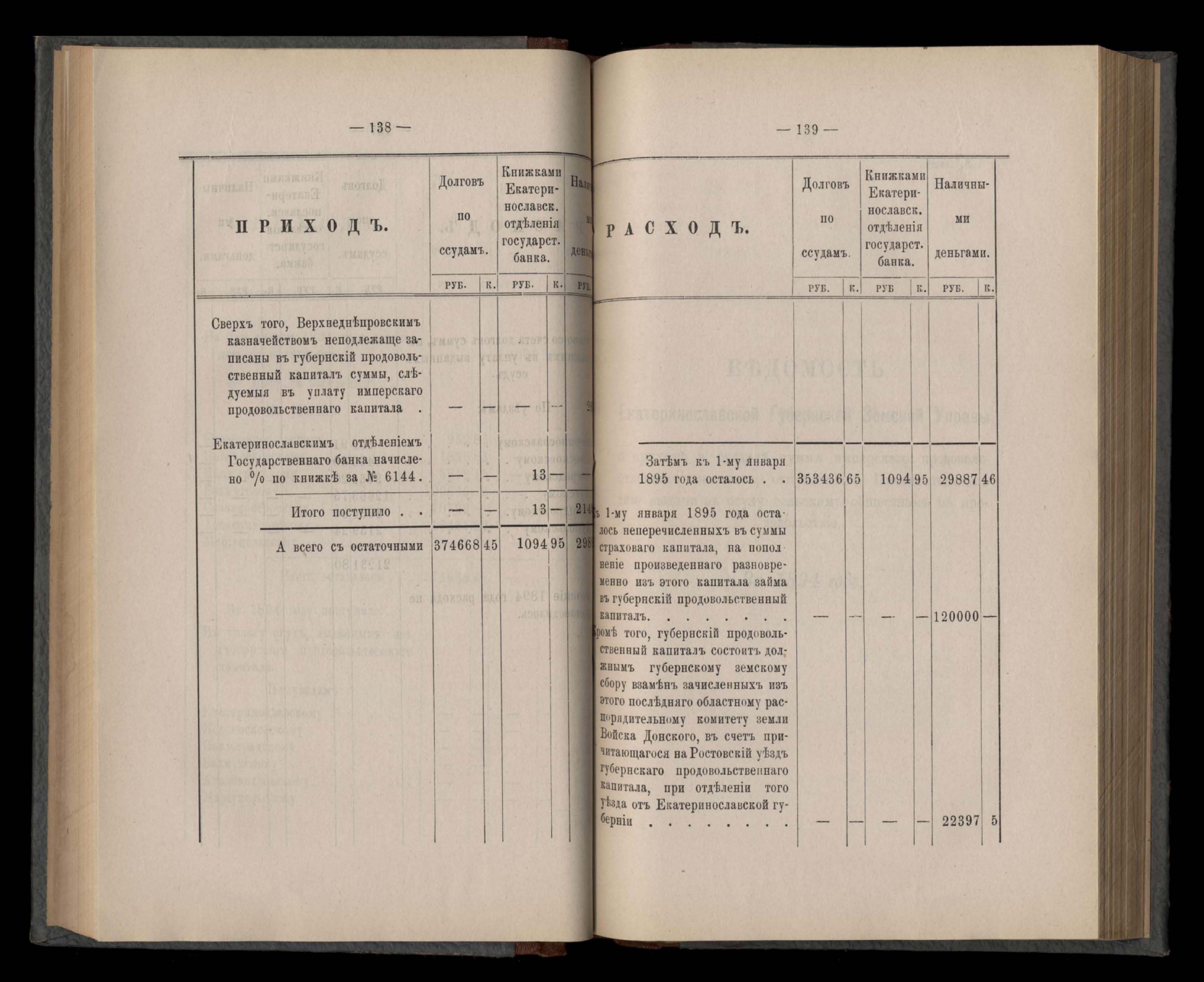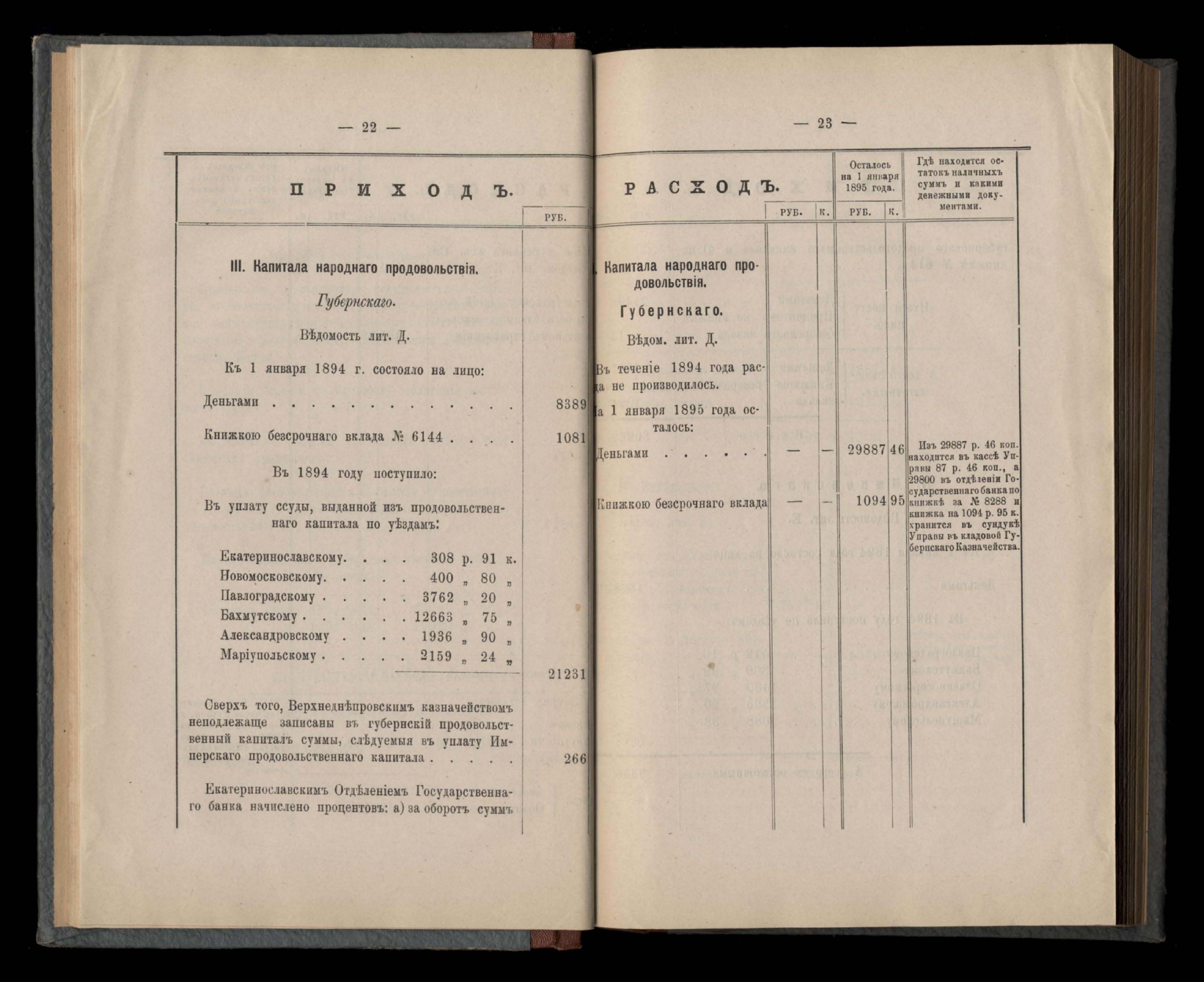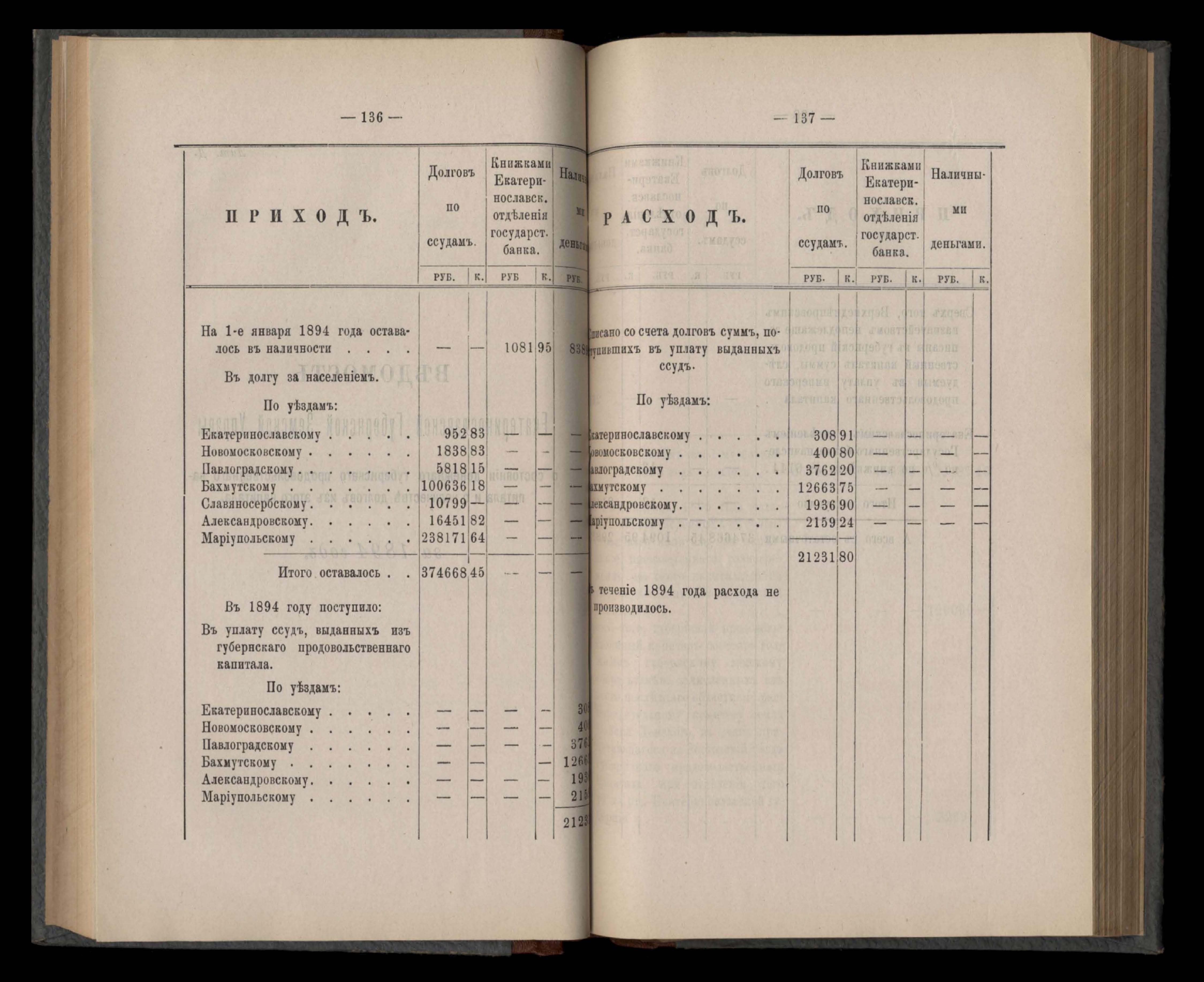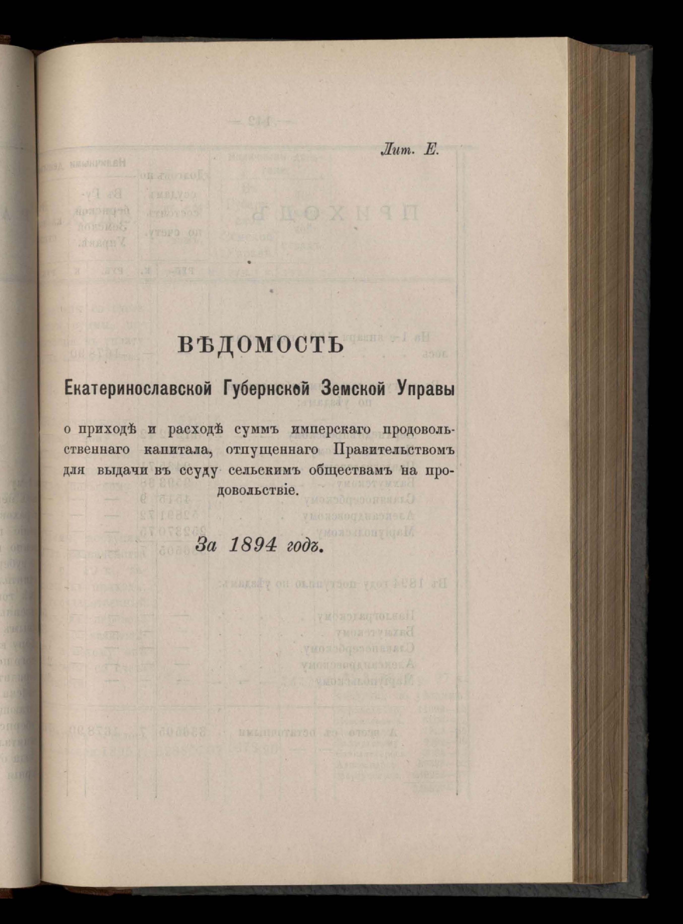 Въдомостъ Екатеринославской губернской земской управы о приходъ и расходъ суммъ имперскаго продовольственнаго капитала, отпущеннаго Правительствомъ для выдачи въ ссуду сельскимъ обществамъ на продовольствіе 1894 годъ