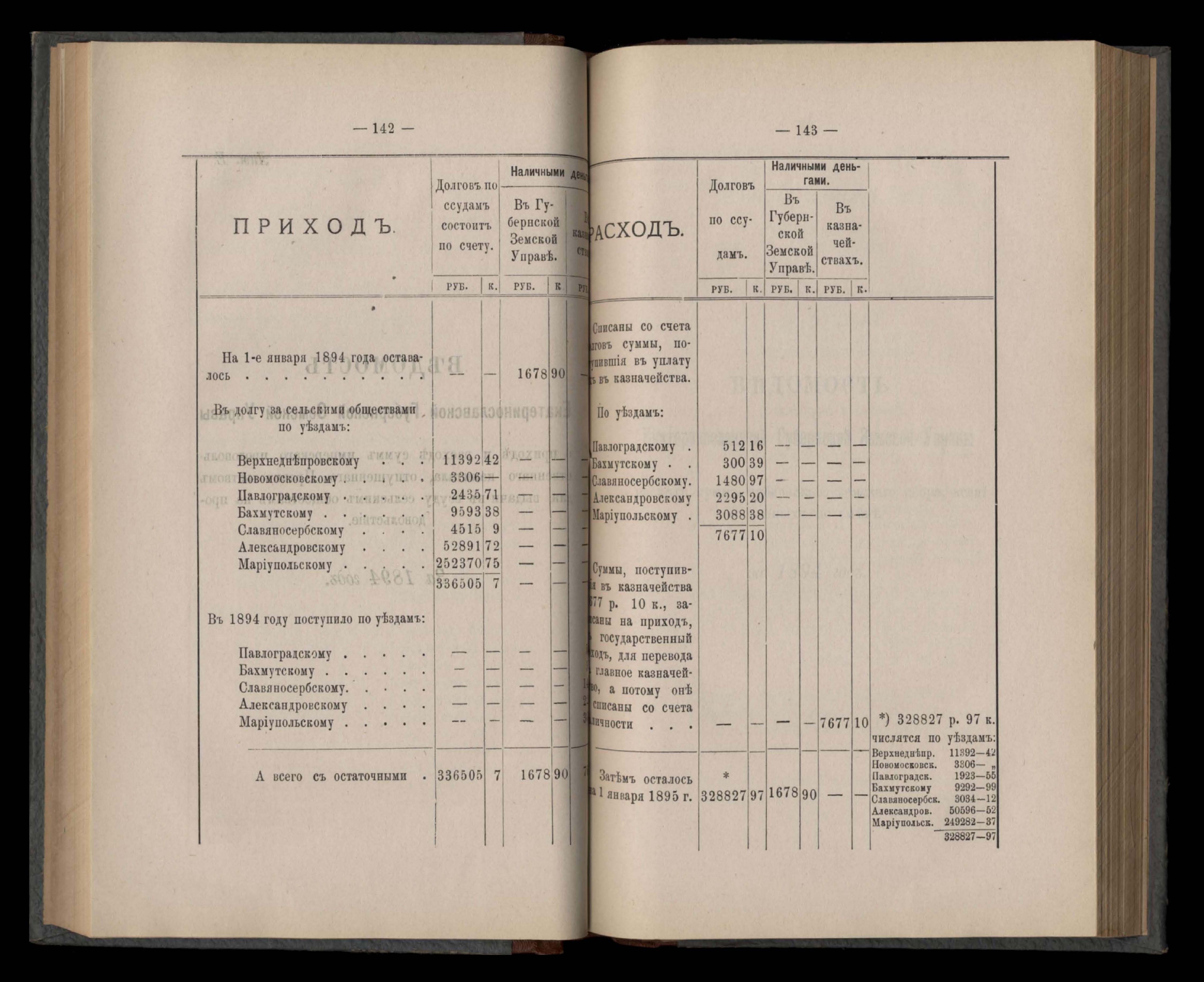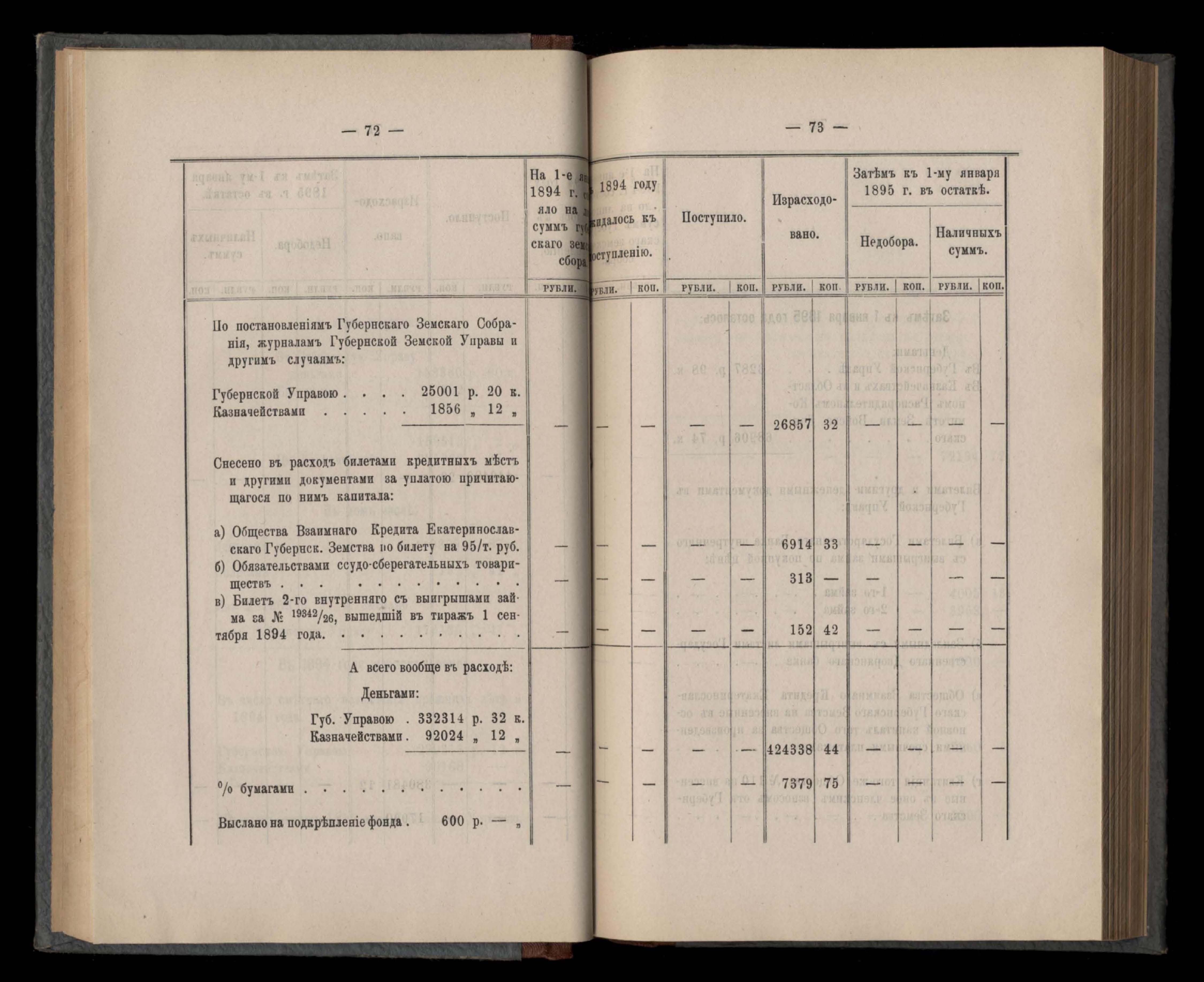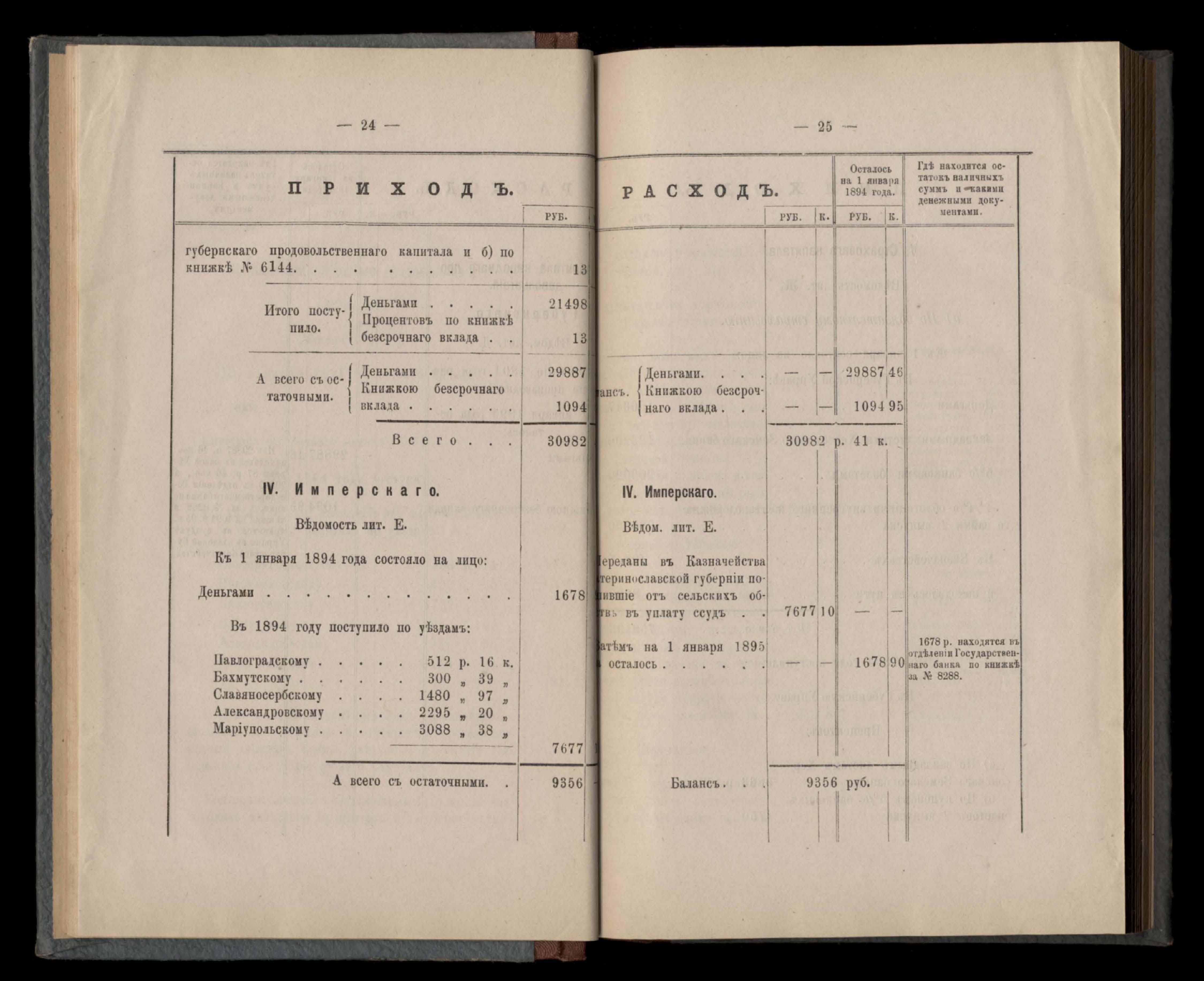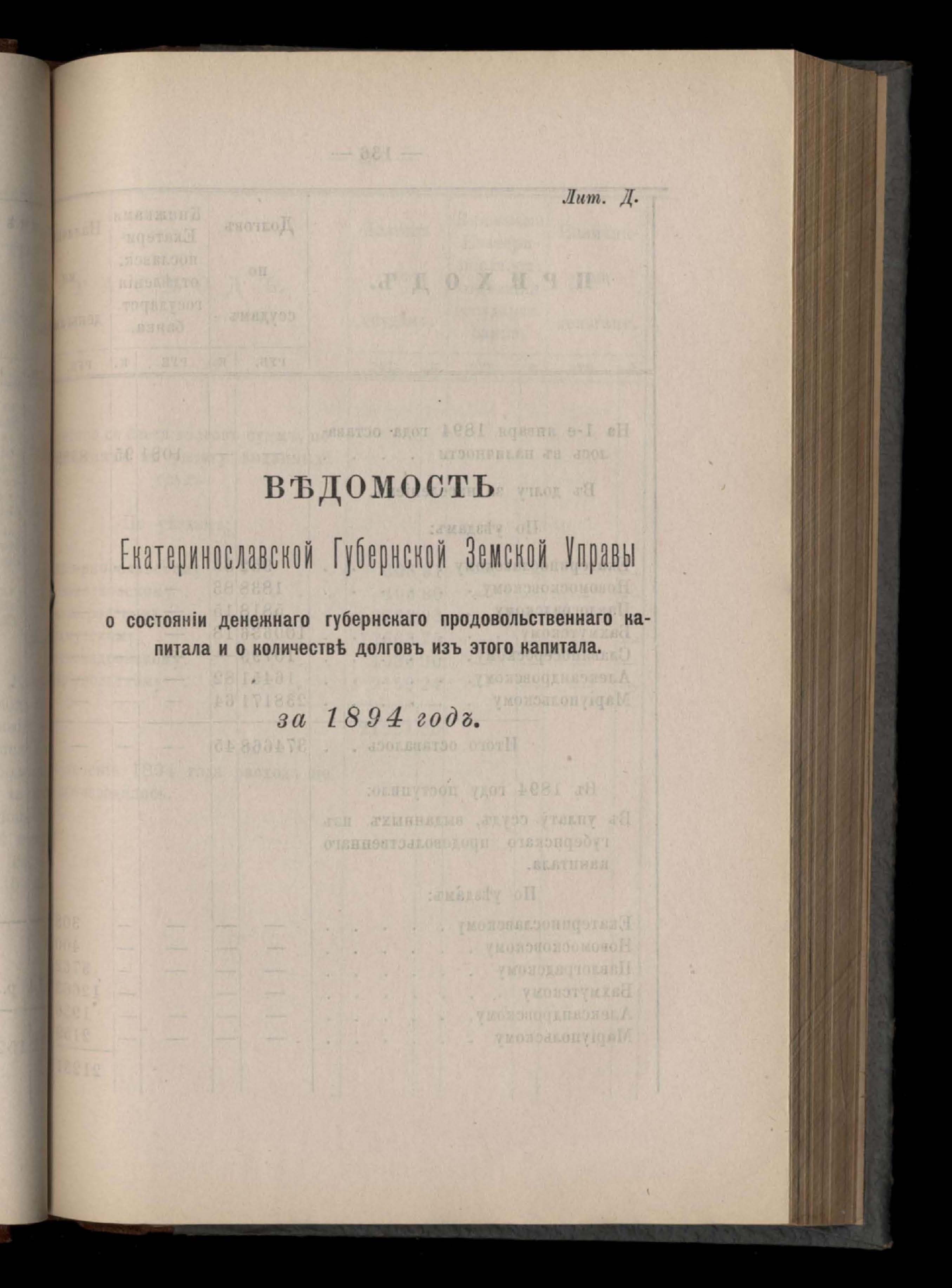 Въдомостъ Екатеринославской губернской земской управы о приходъ и расходъ суммъ имперскаго продовольственнаго капитала, отпущеннаго Правительствомъ для выдачи въ ссуду сельскимъ обществамъ на продовольствіе 1894 годъ