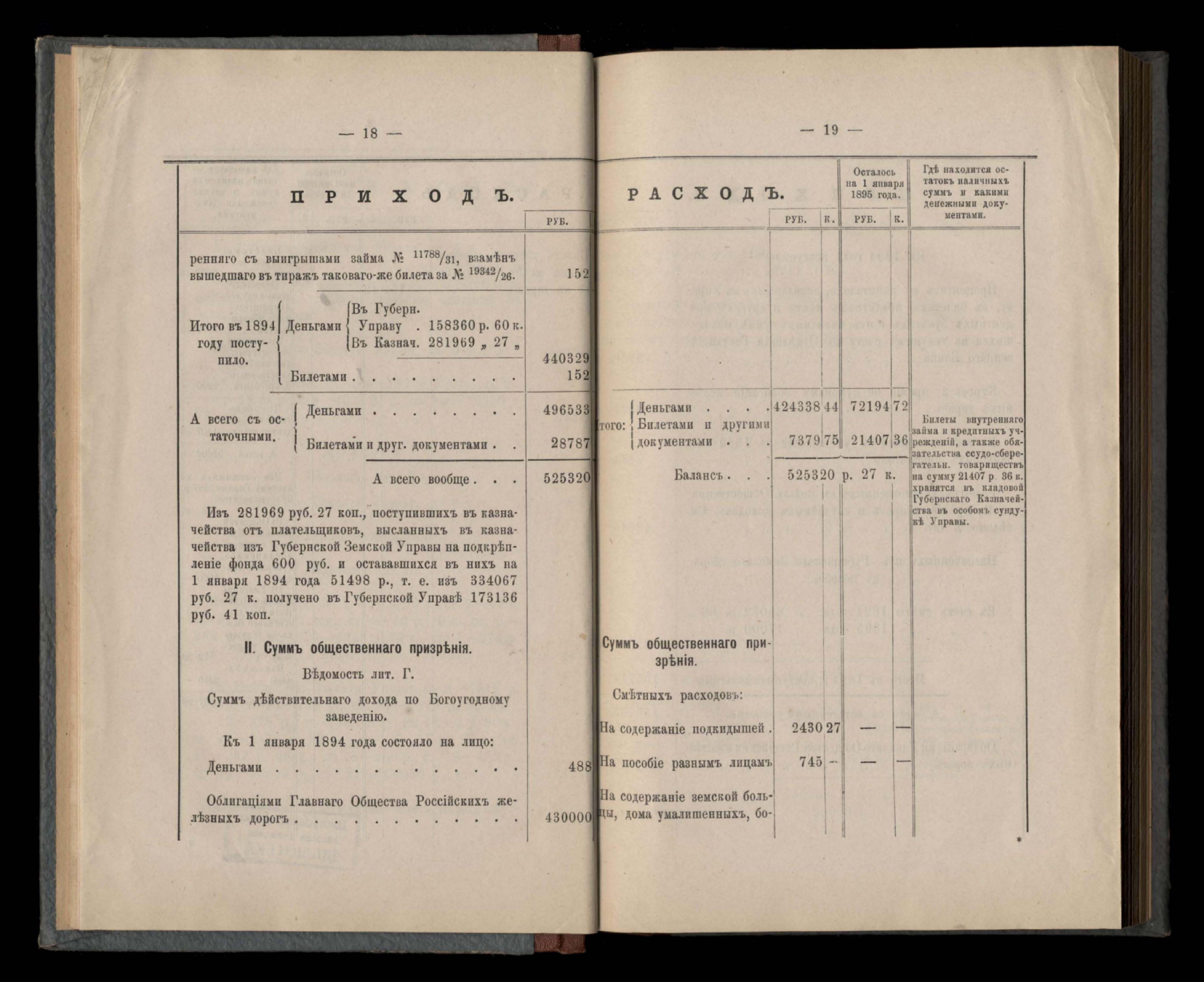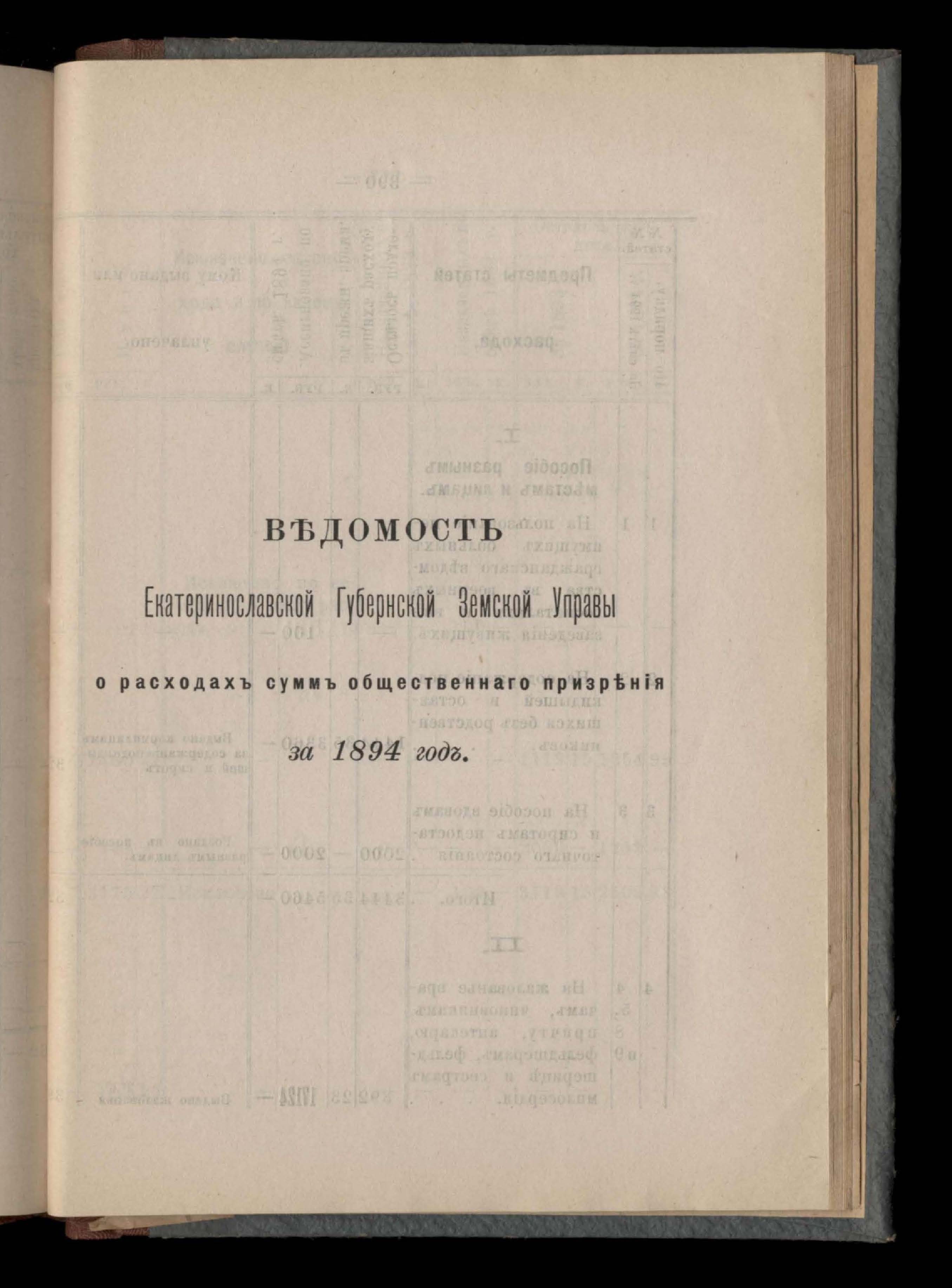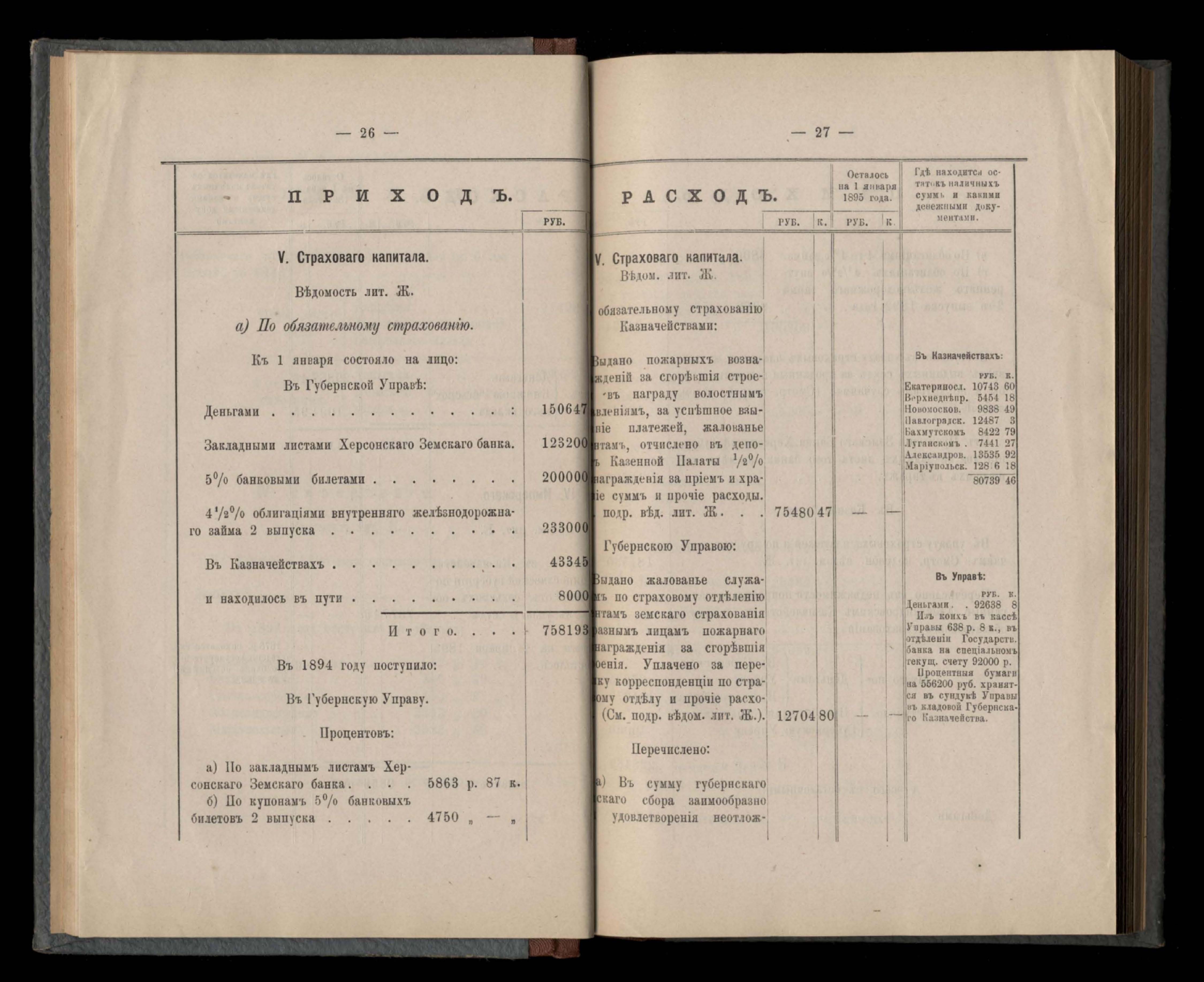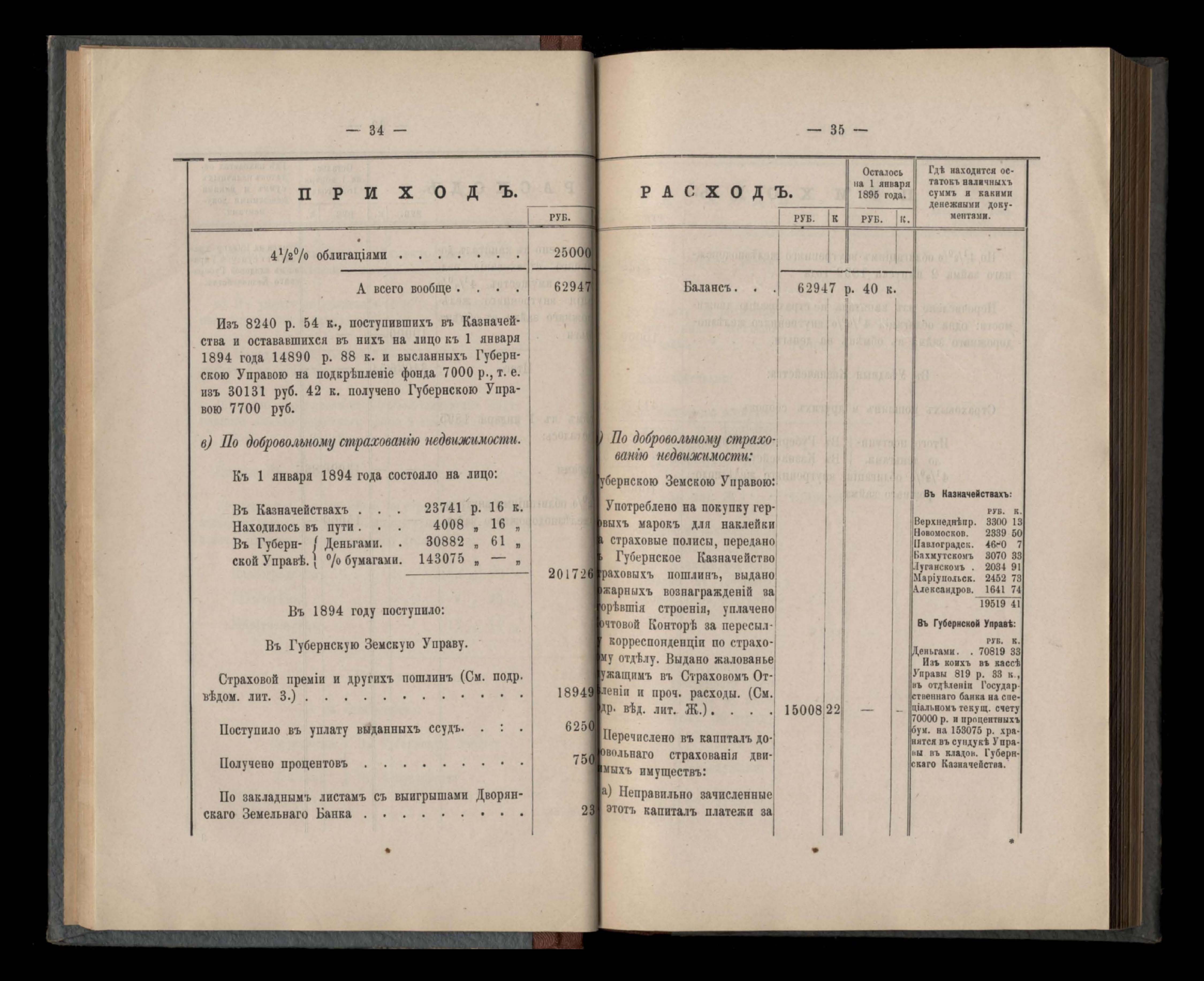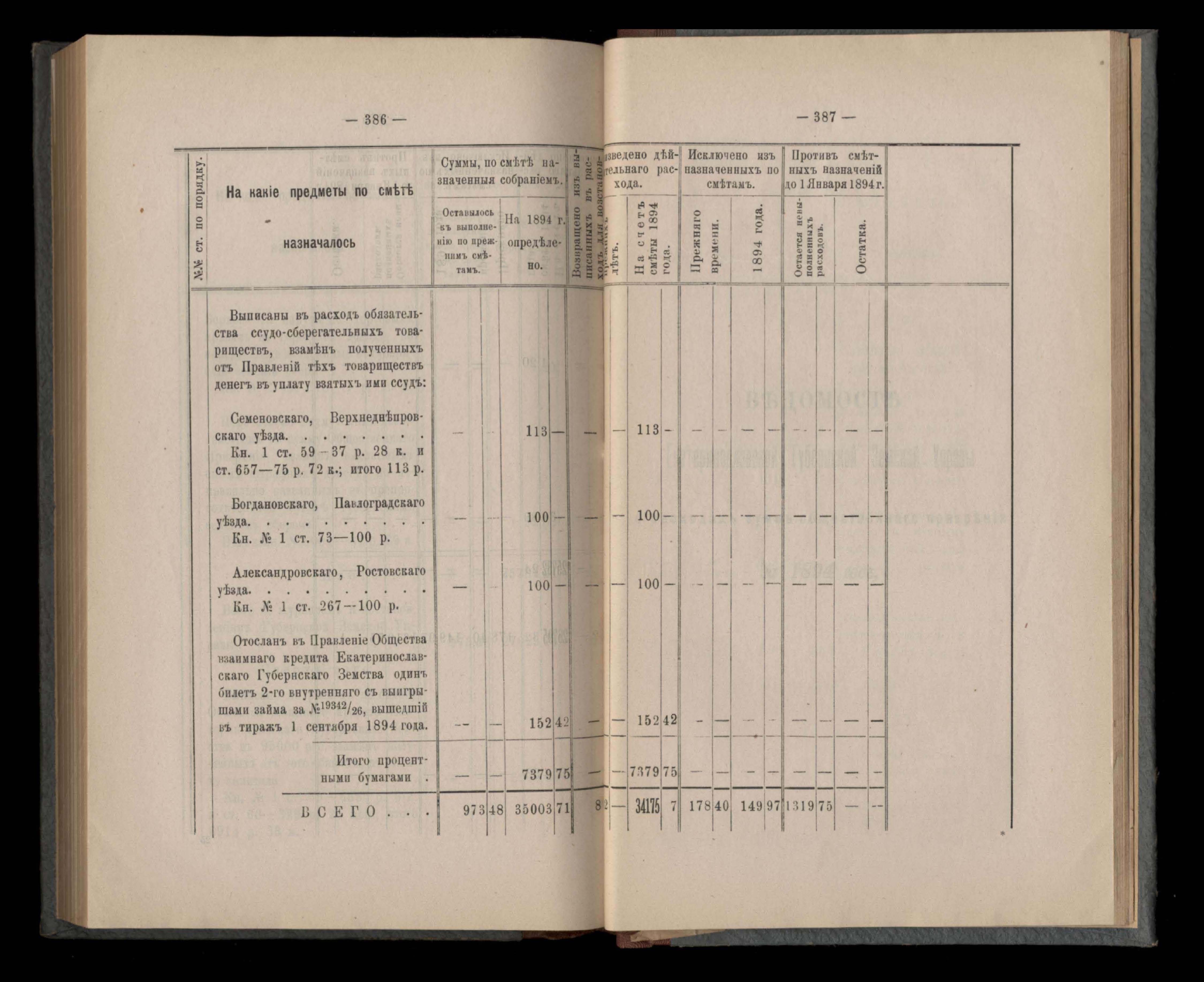Въдомостъ Екатеринославской губернской земской управы о приходъ и расходъ суммъ имперскаго продовольственнаго капитала, отпущеннаго Правительствомъ для выдачи въ ссуду сельскимъ обществамъ на продовольствіе 1894 годъ