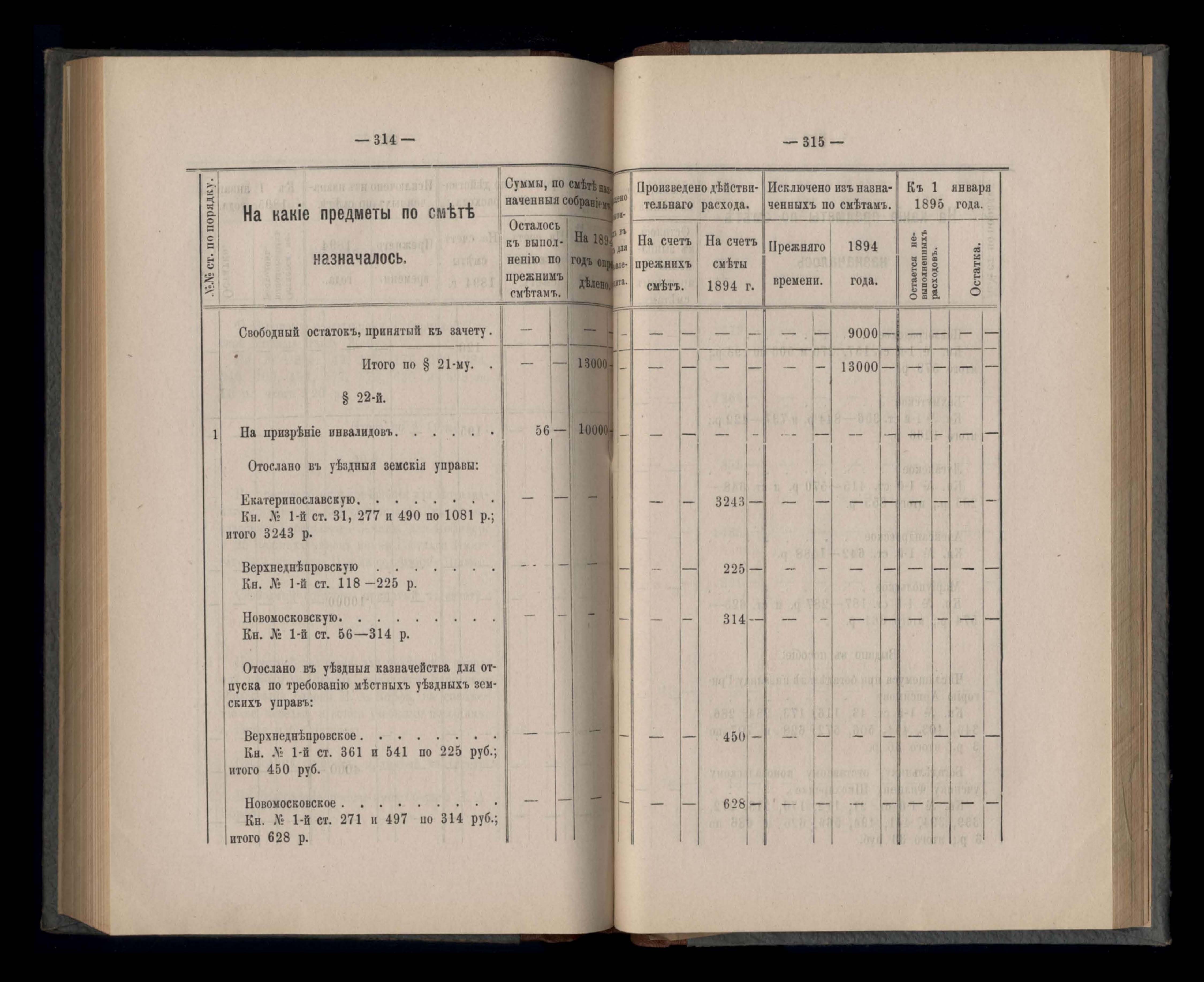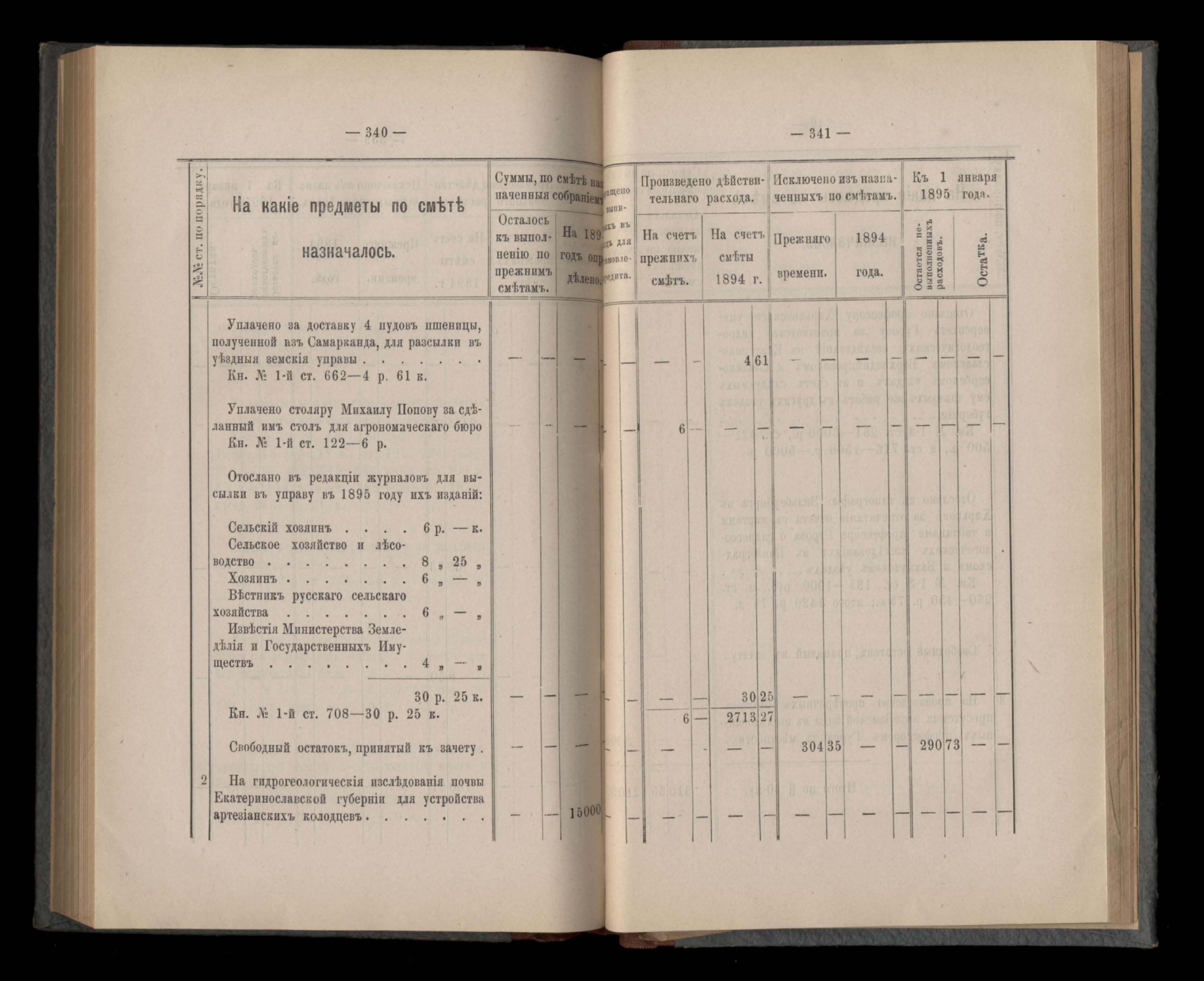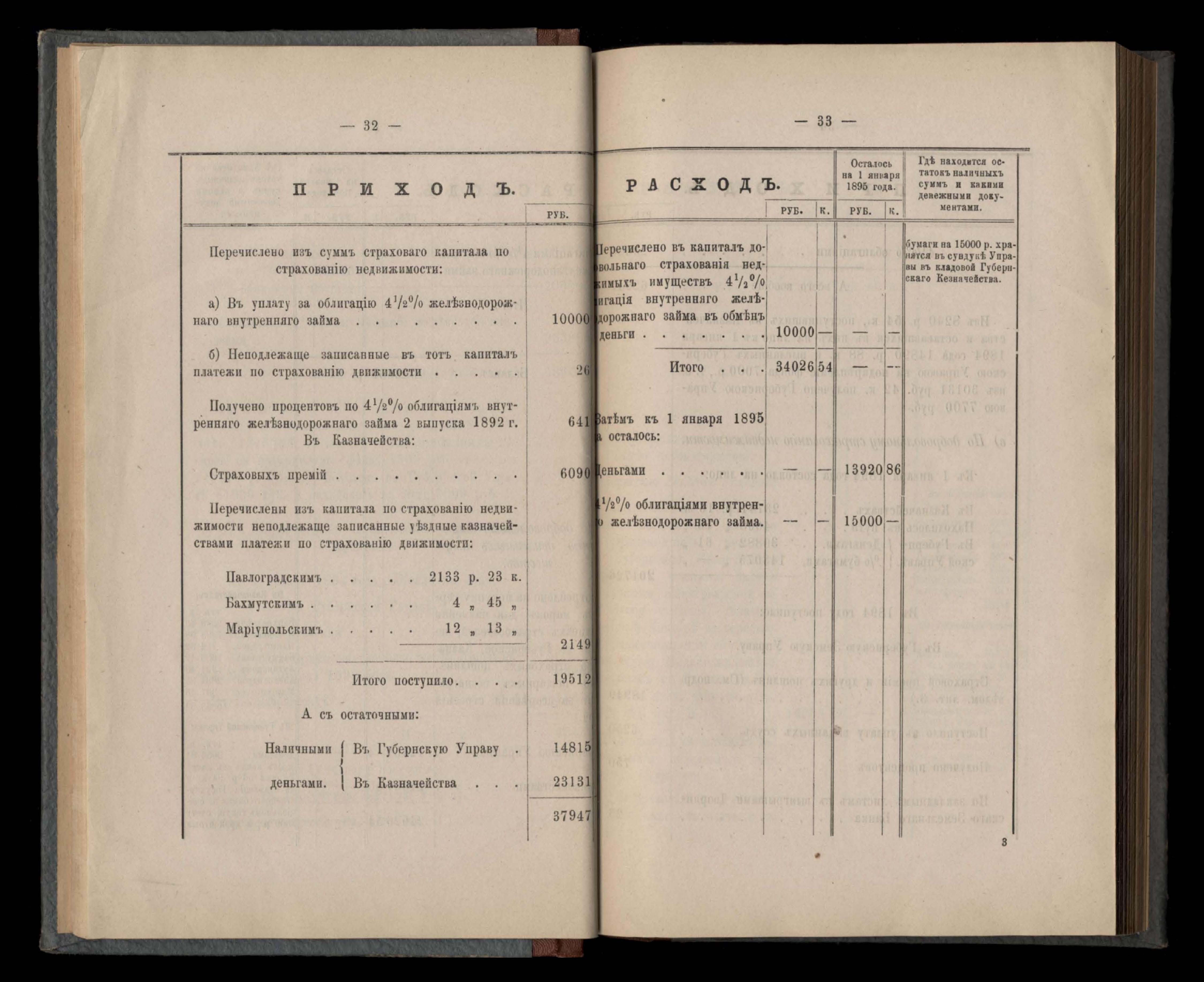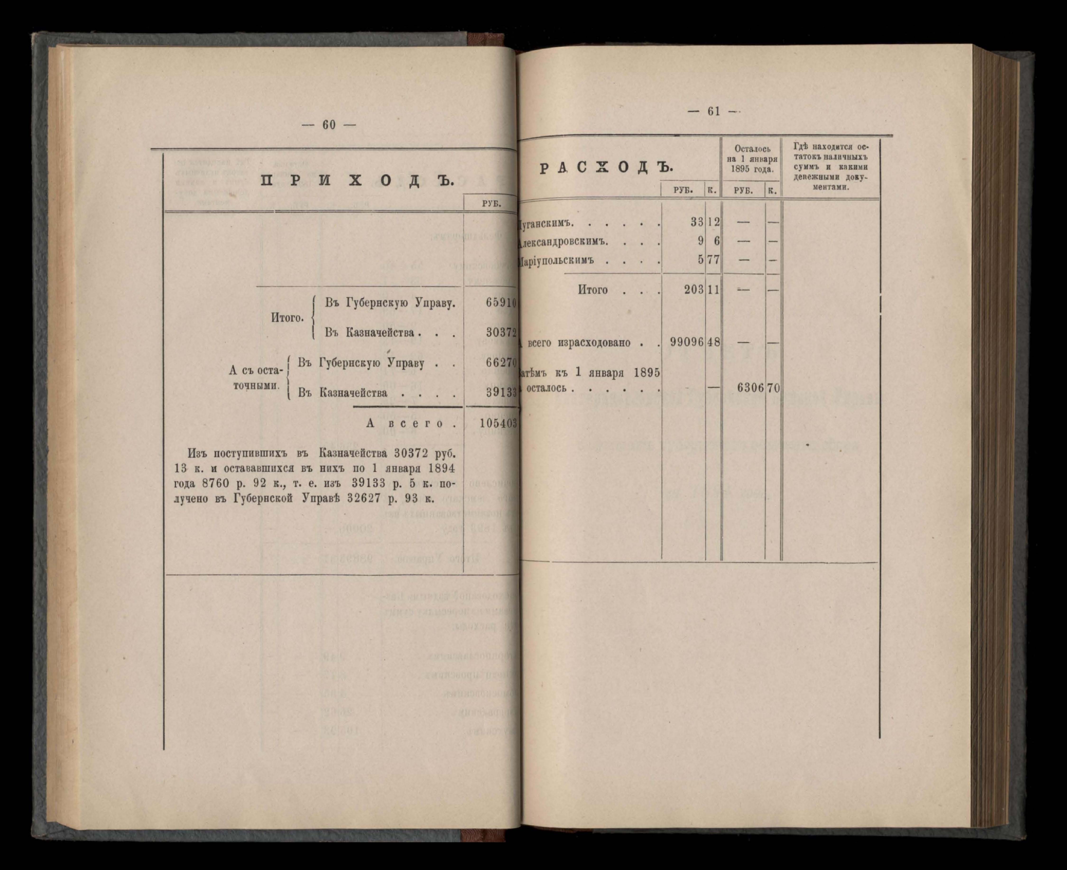 Въдомостъ Екатеринославской губернской земской управы о приходъ и расходъ суммъ имперскаго продовольственнаго капитала, отпущеннаго Правительствомъ для выдачи въ ссуду сельскимъ обществамъ на продовольствіе 1894 годъ