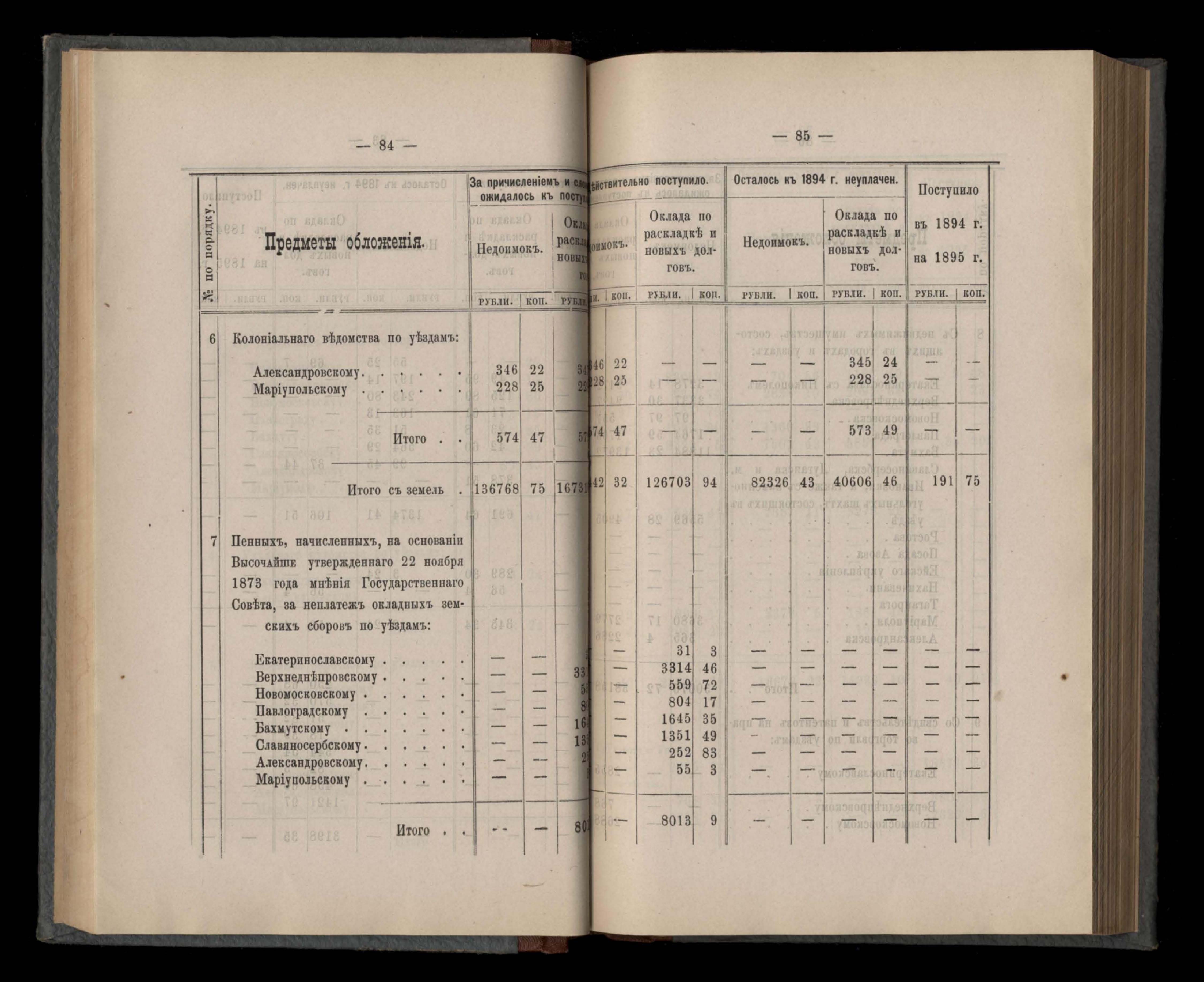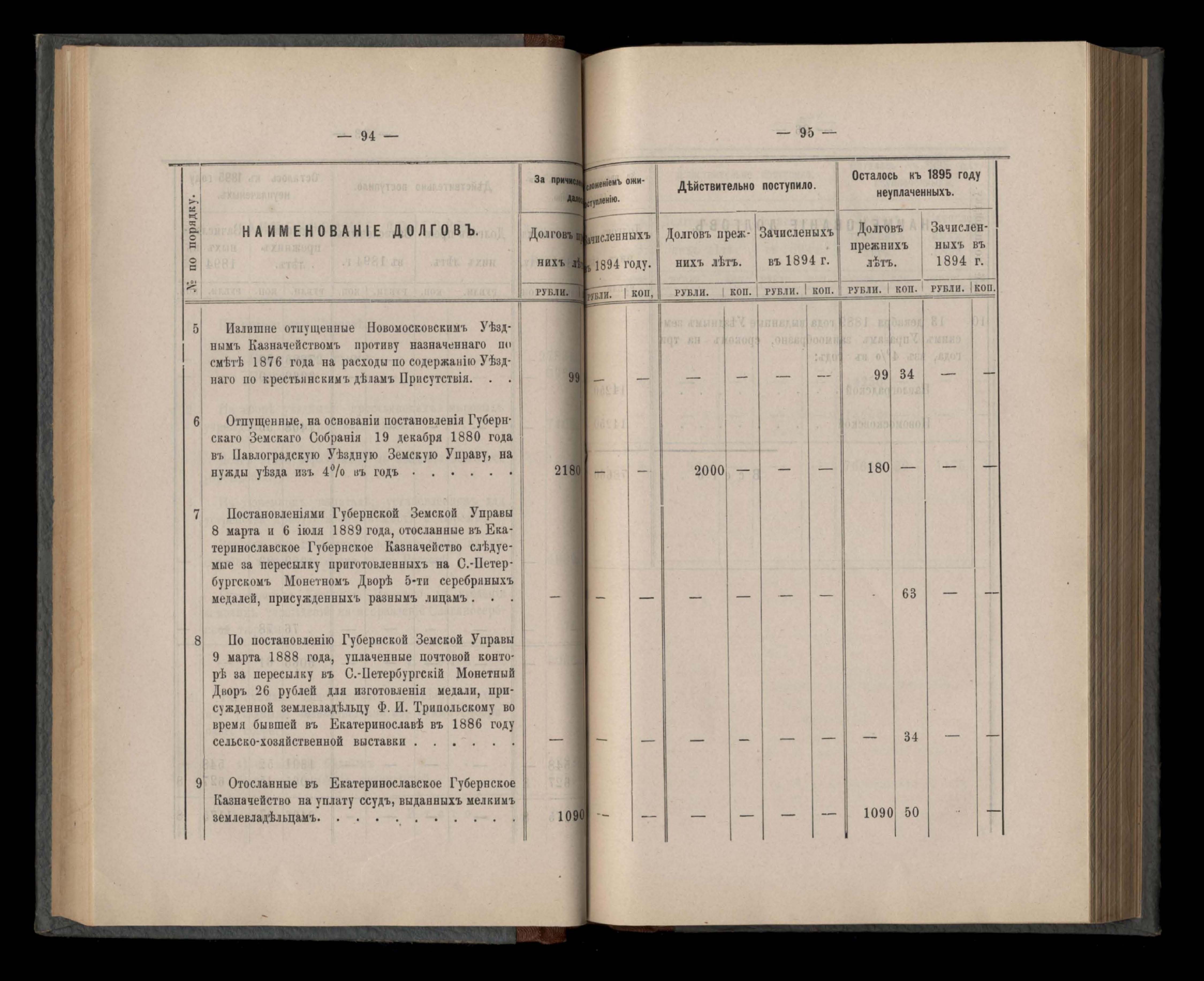 Въдомостъ Екатеринославской губернской земской управы о долгахъ губернскому земскому сбору за 1894 годъ