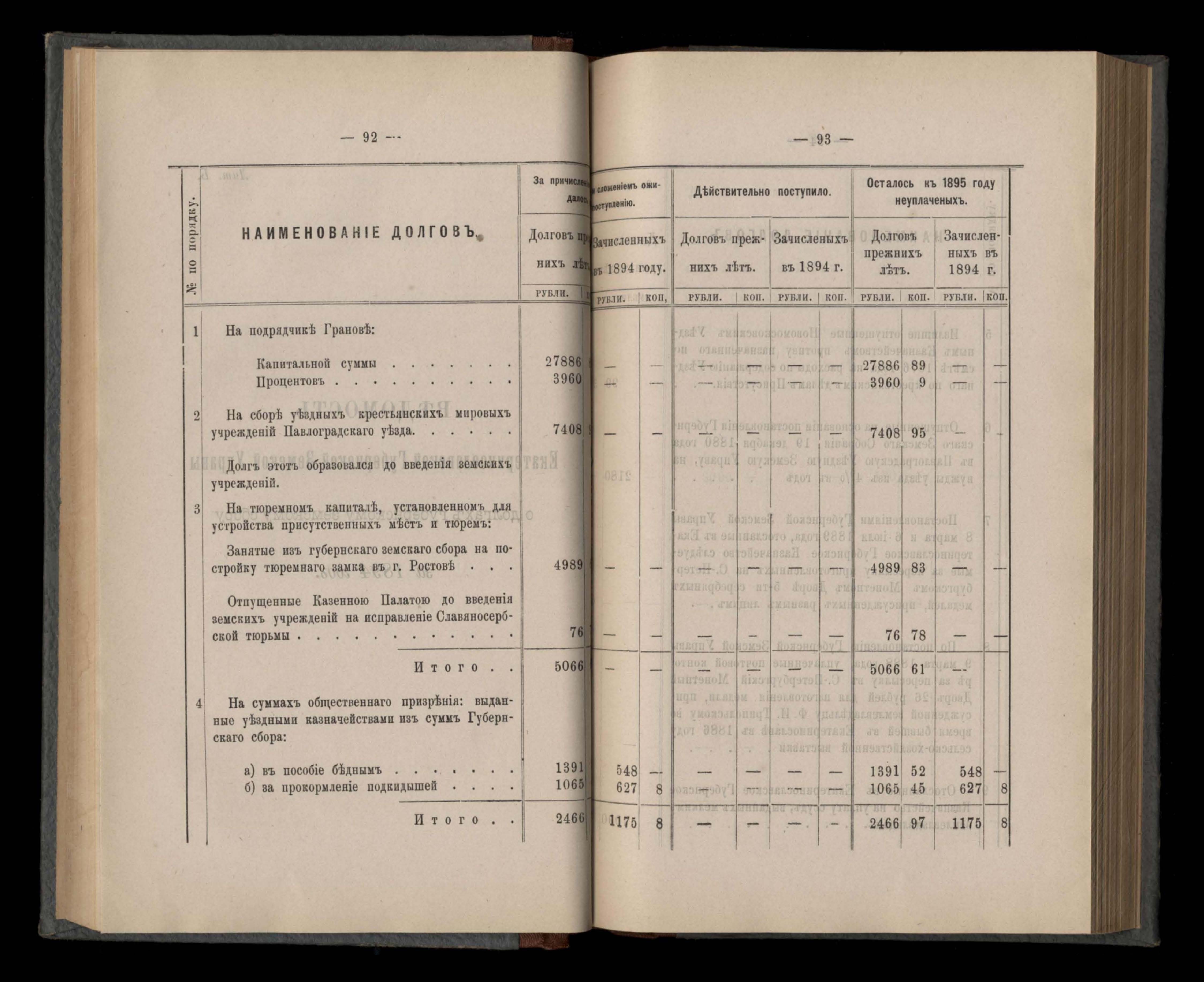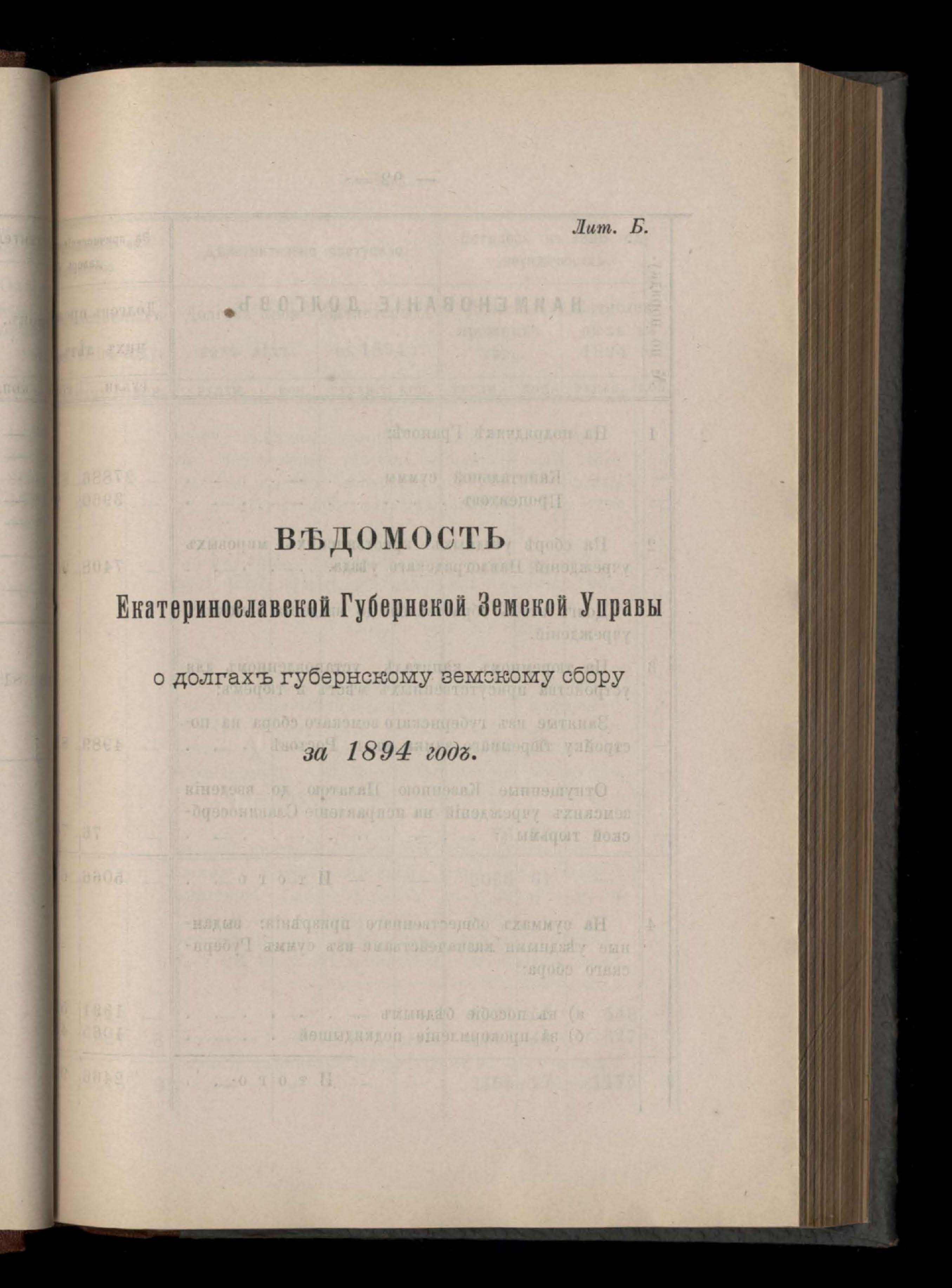 Въдомостъ Екатеринославской губернской земской управы о состояніи денежнаго губернскаго продовольственнаго капитала и о количествъ долговъ изъ того капитала за 1894 годъ
