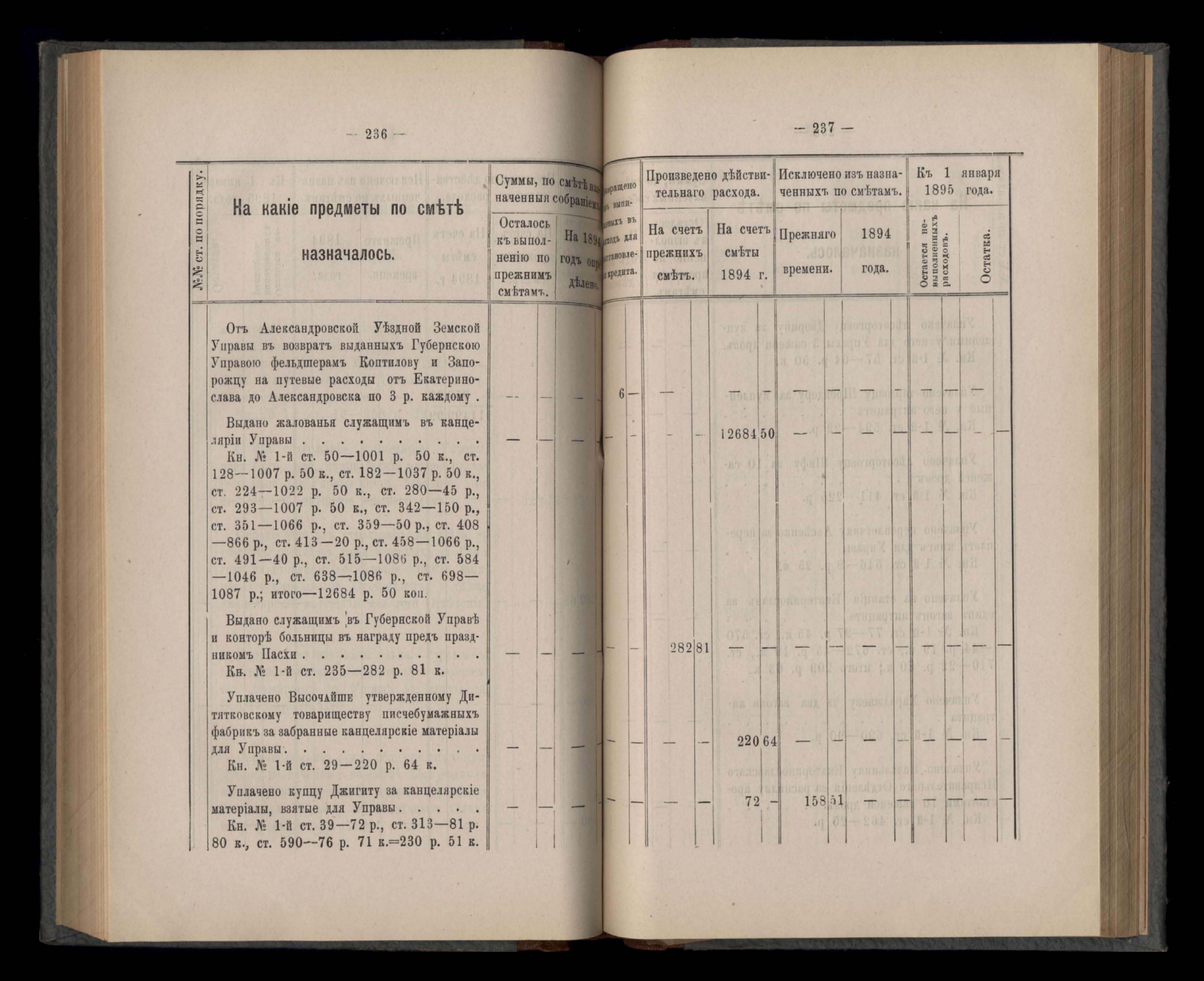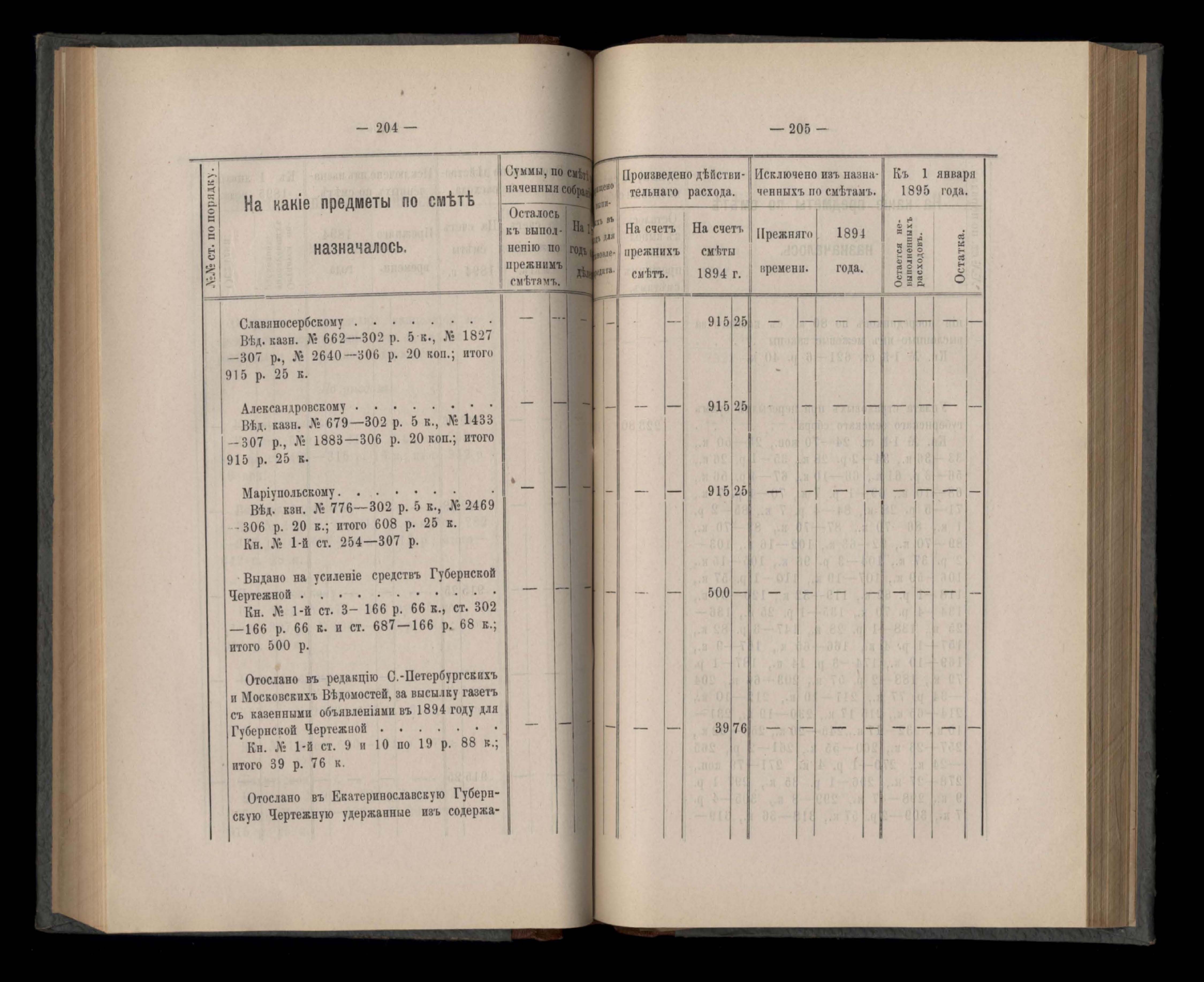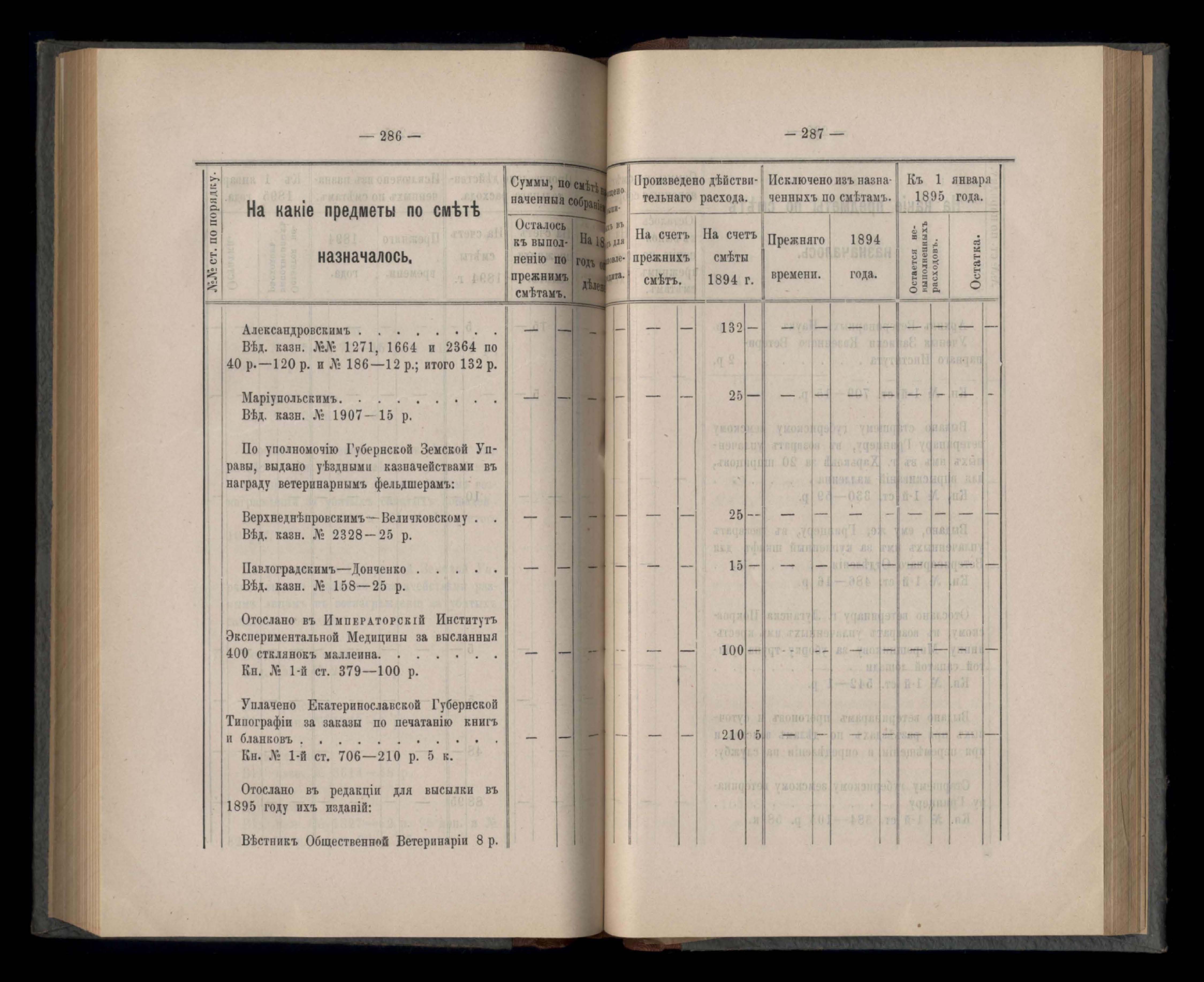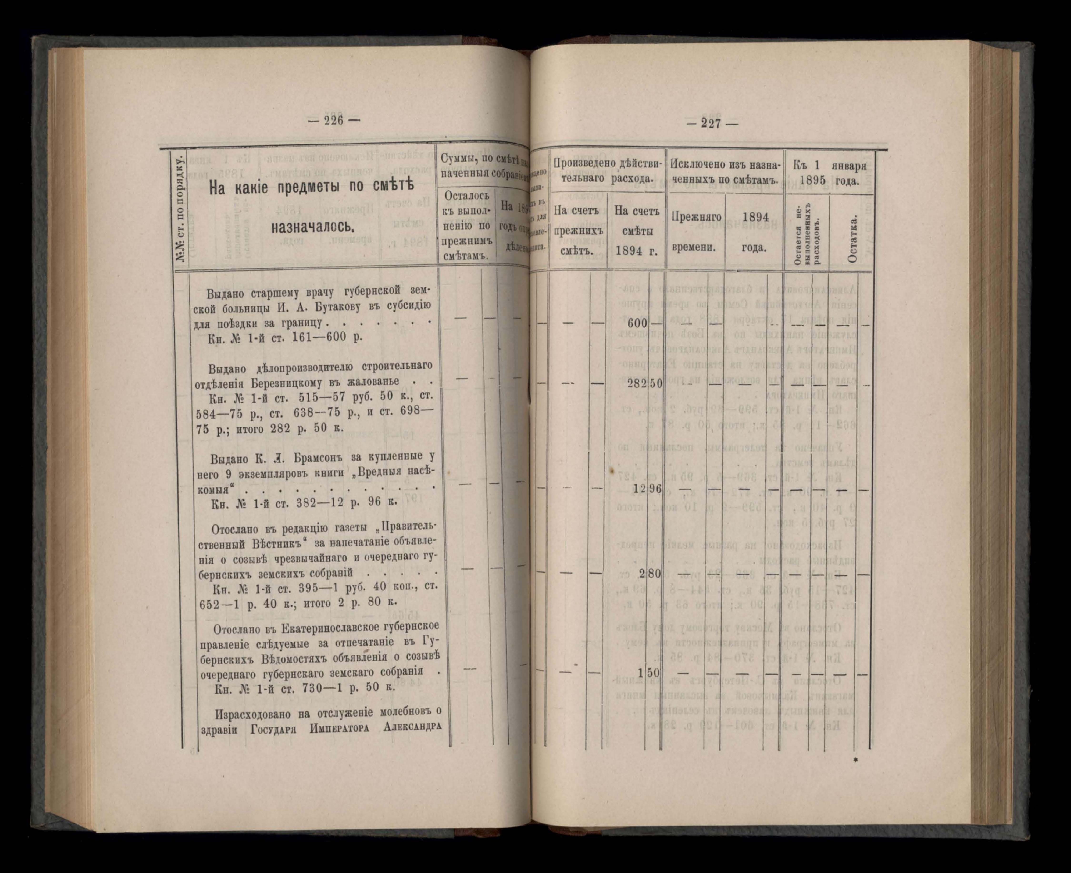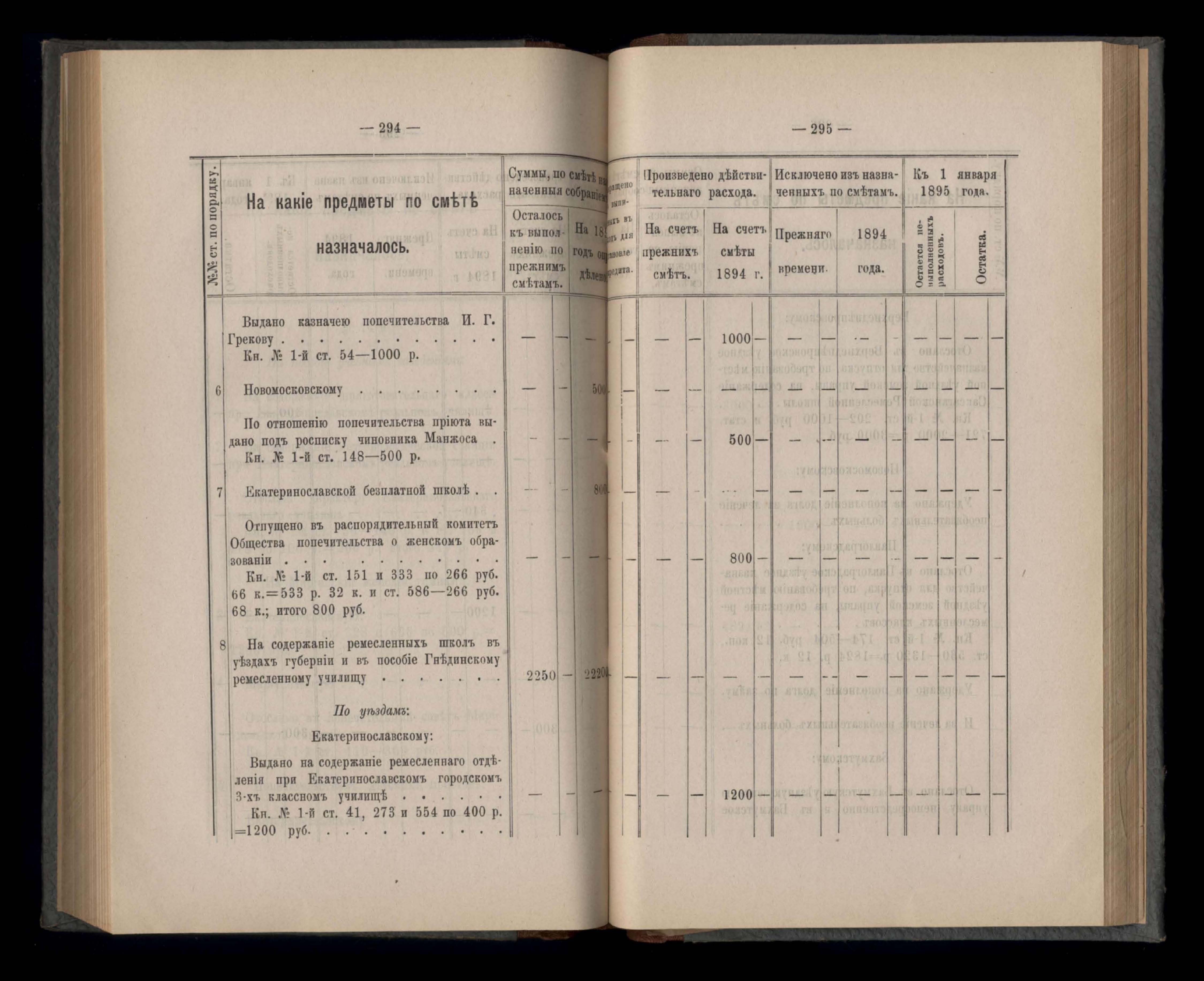 Въдомостъ Екатеринославской губернской земской управы о расходъ суммъ губернскаго земскаго сбора, ассигнованныхъ по смътъ за 1894 годъ