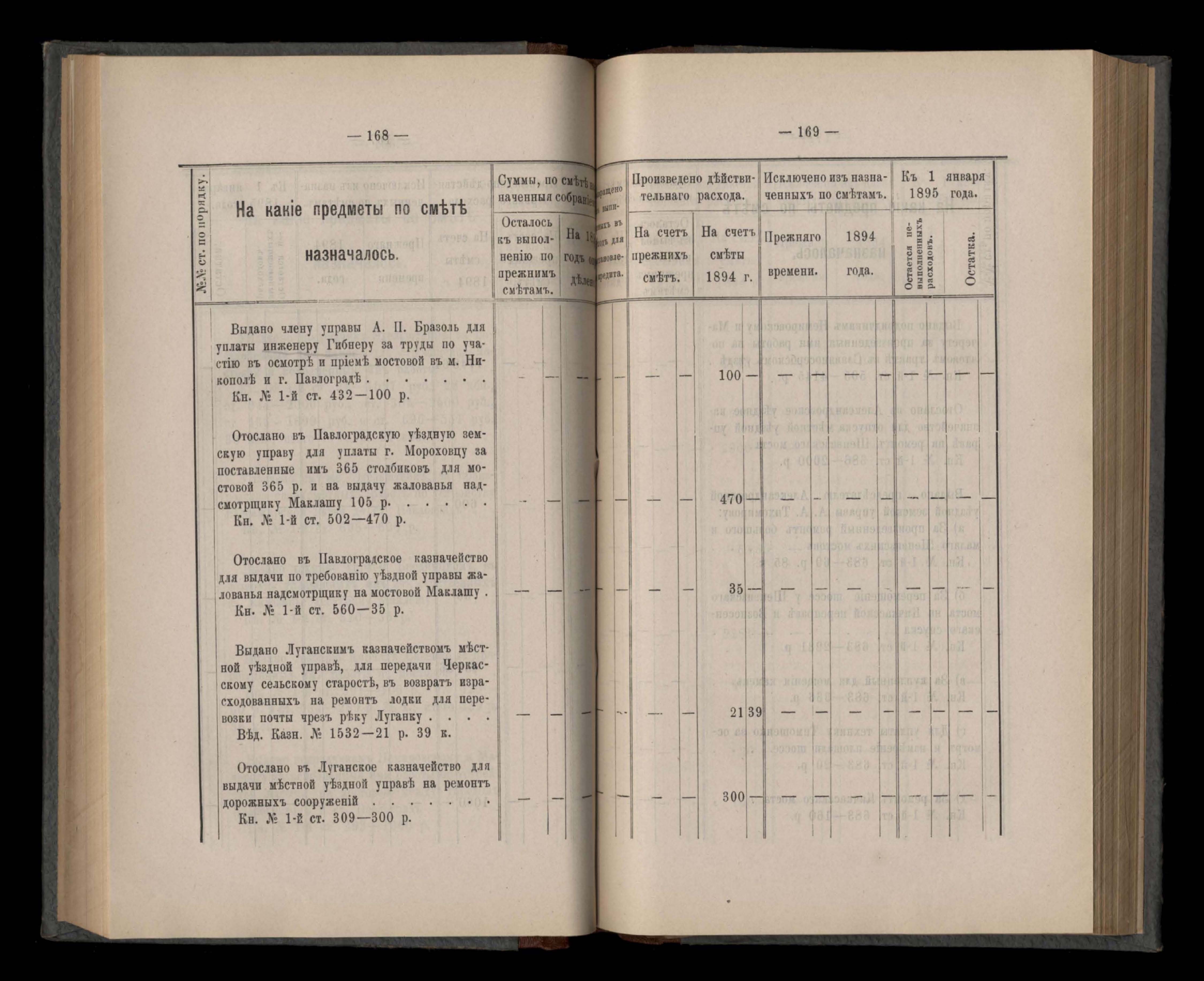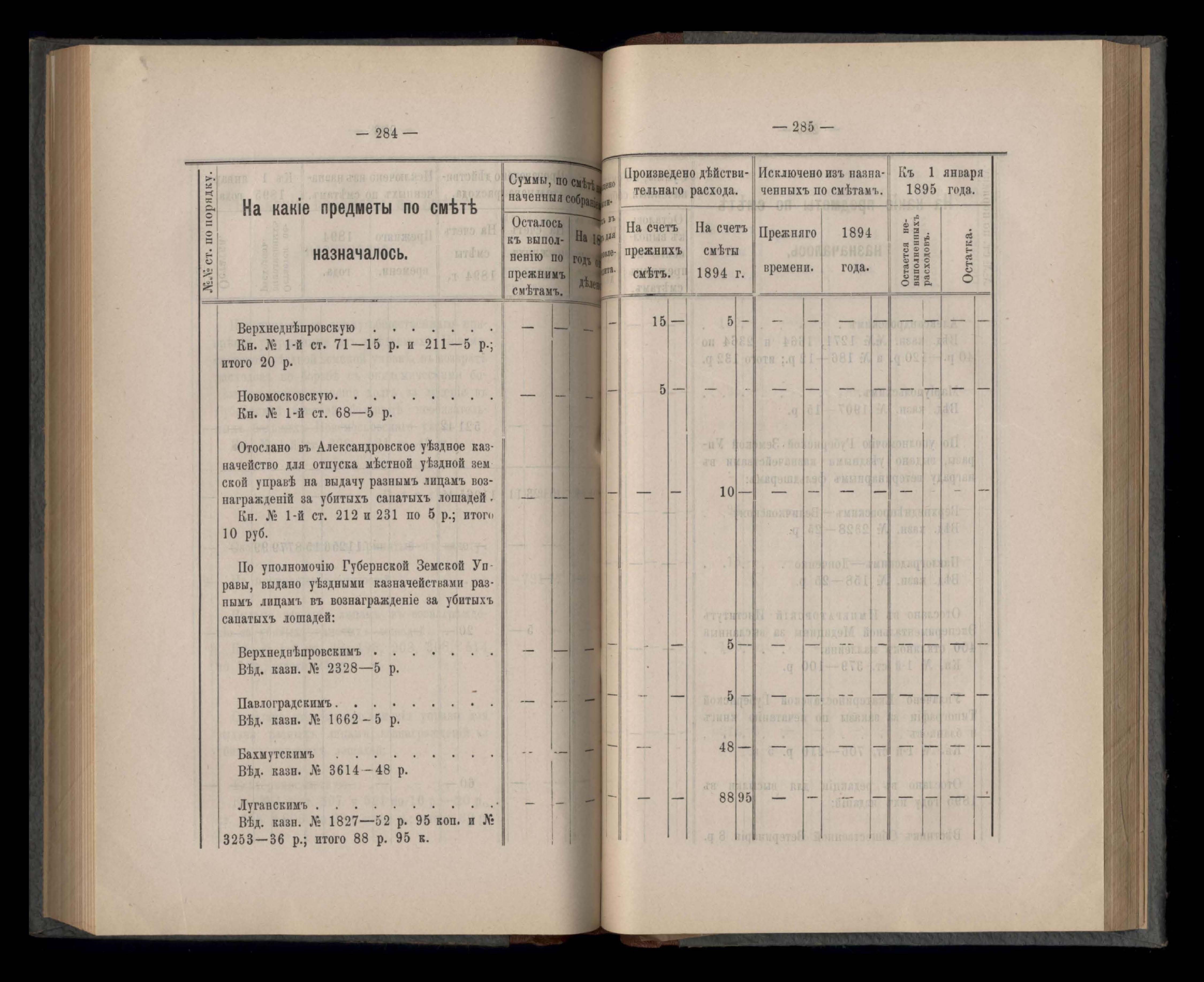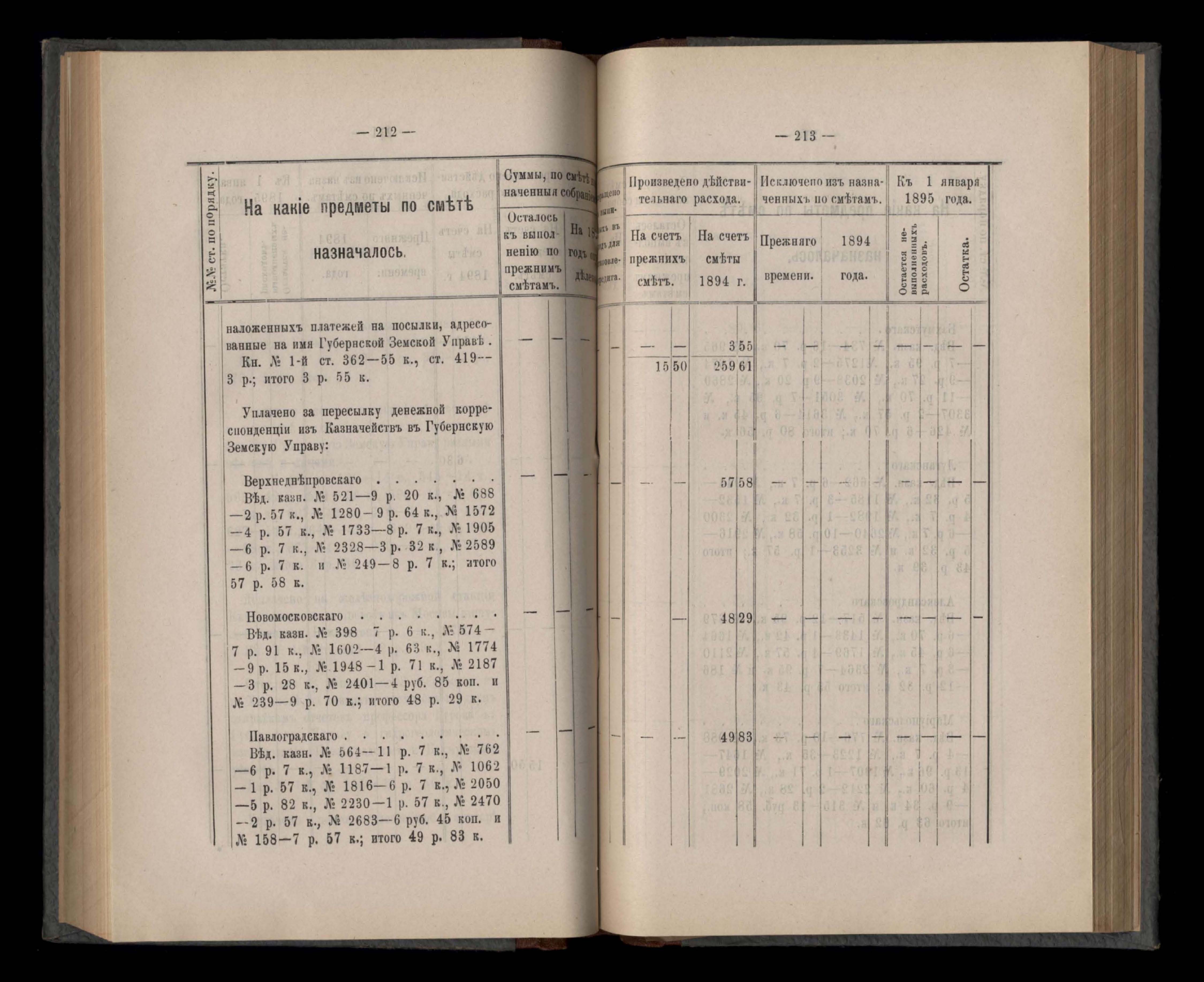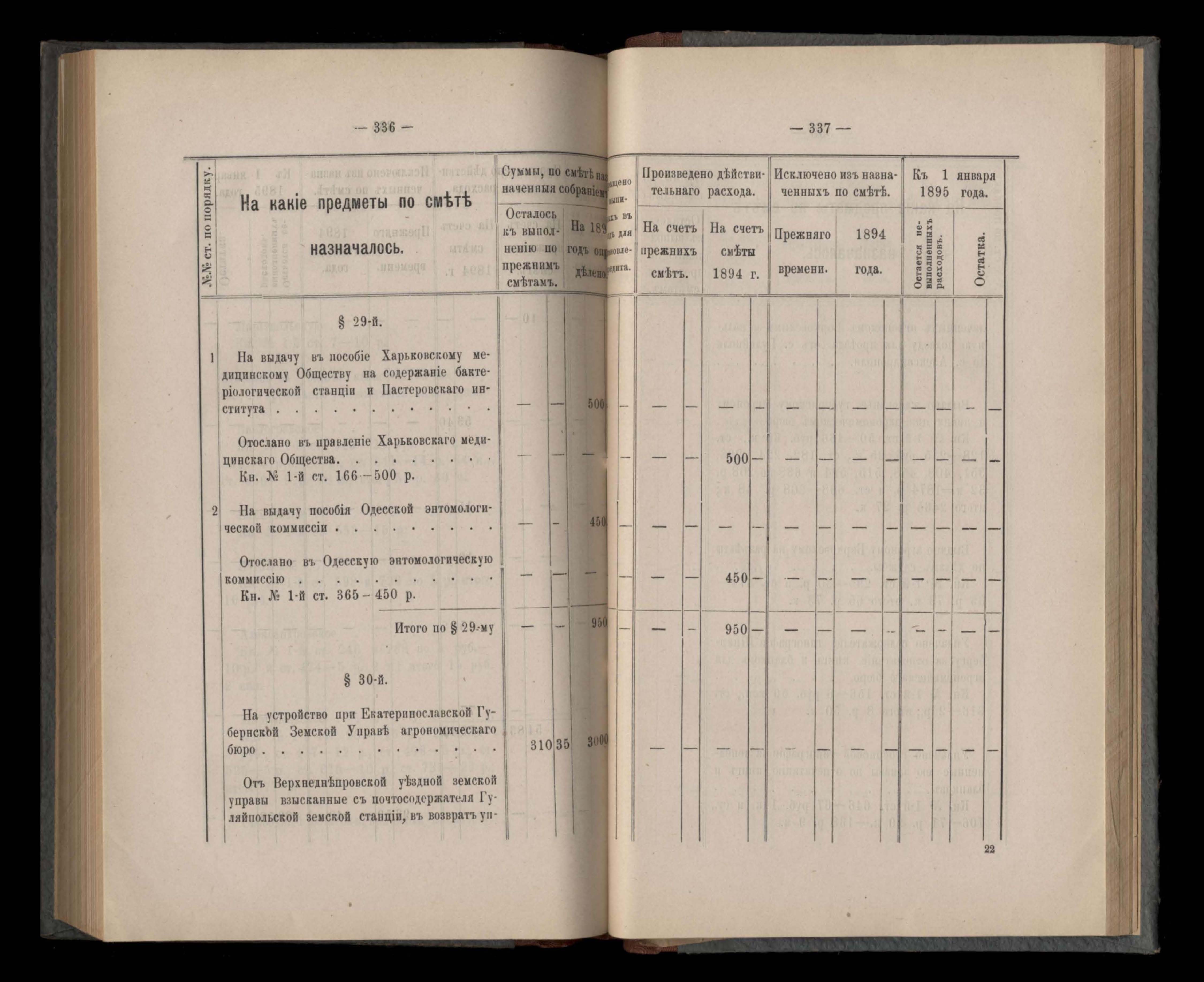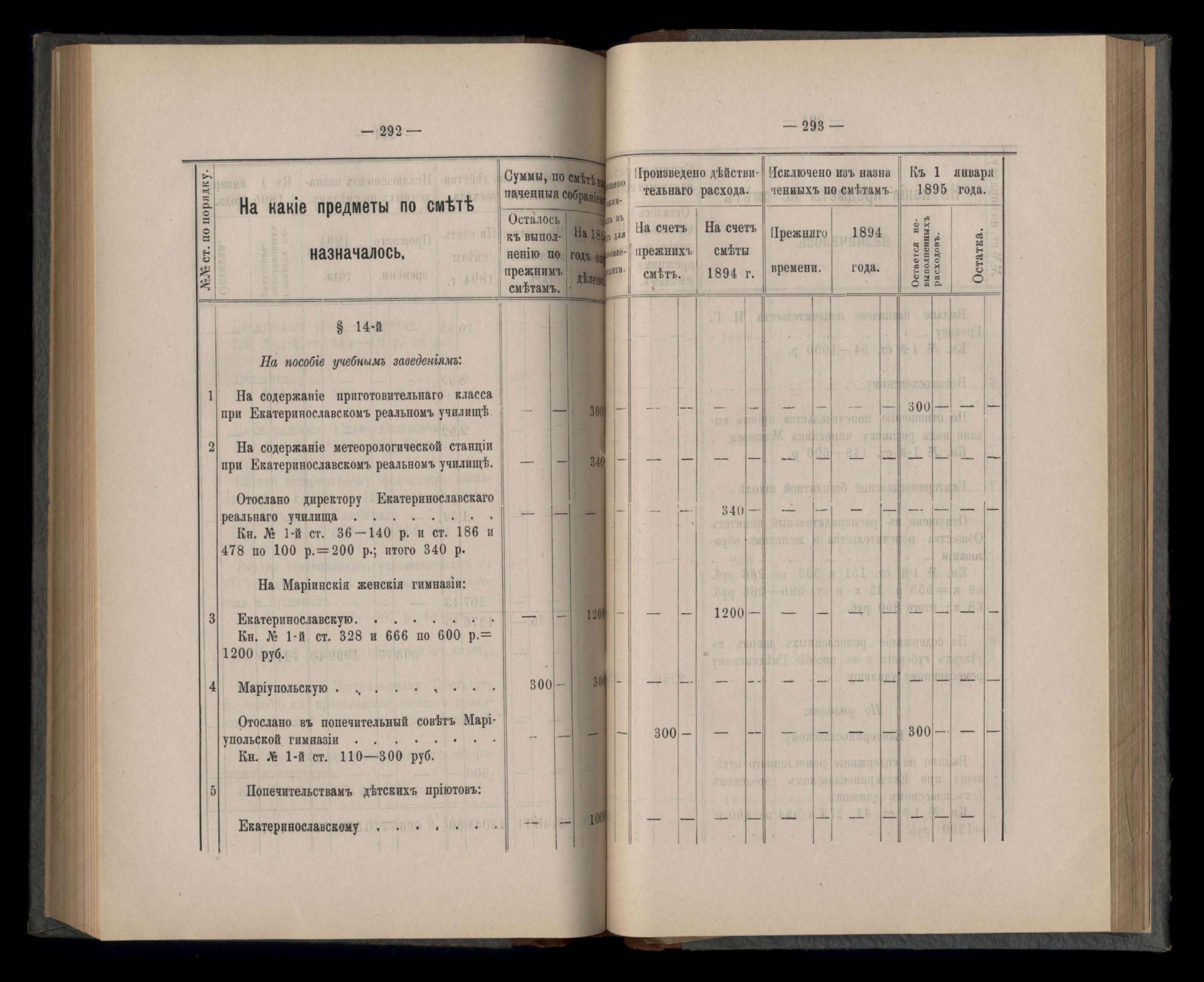 Въдомостъ Екатеринославской губернской земской управы о расходъ суммъ губернскаго земскаго сбора, ассигнованныхъ по смътъ за 1894 годъ