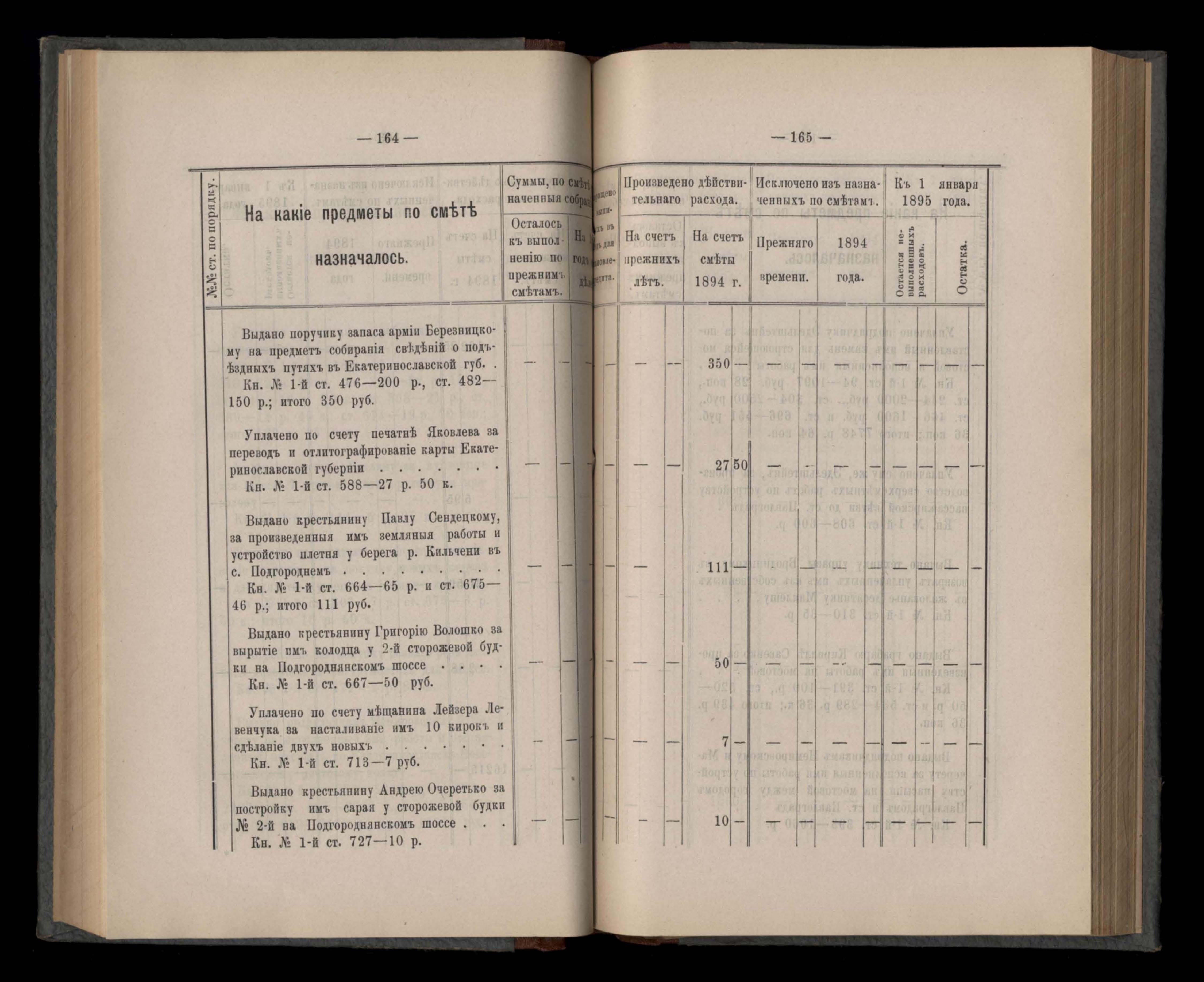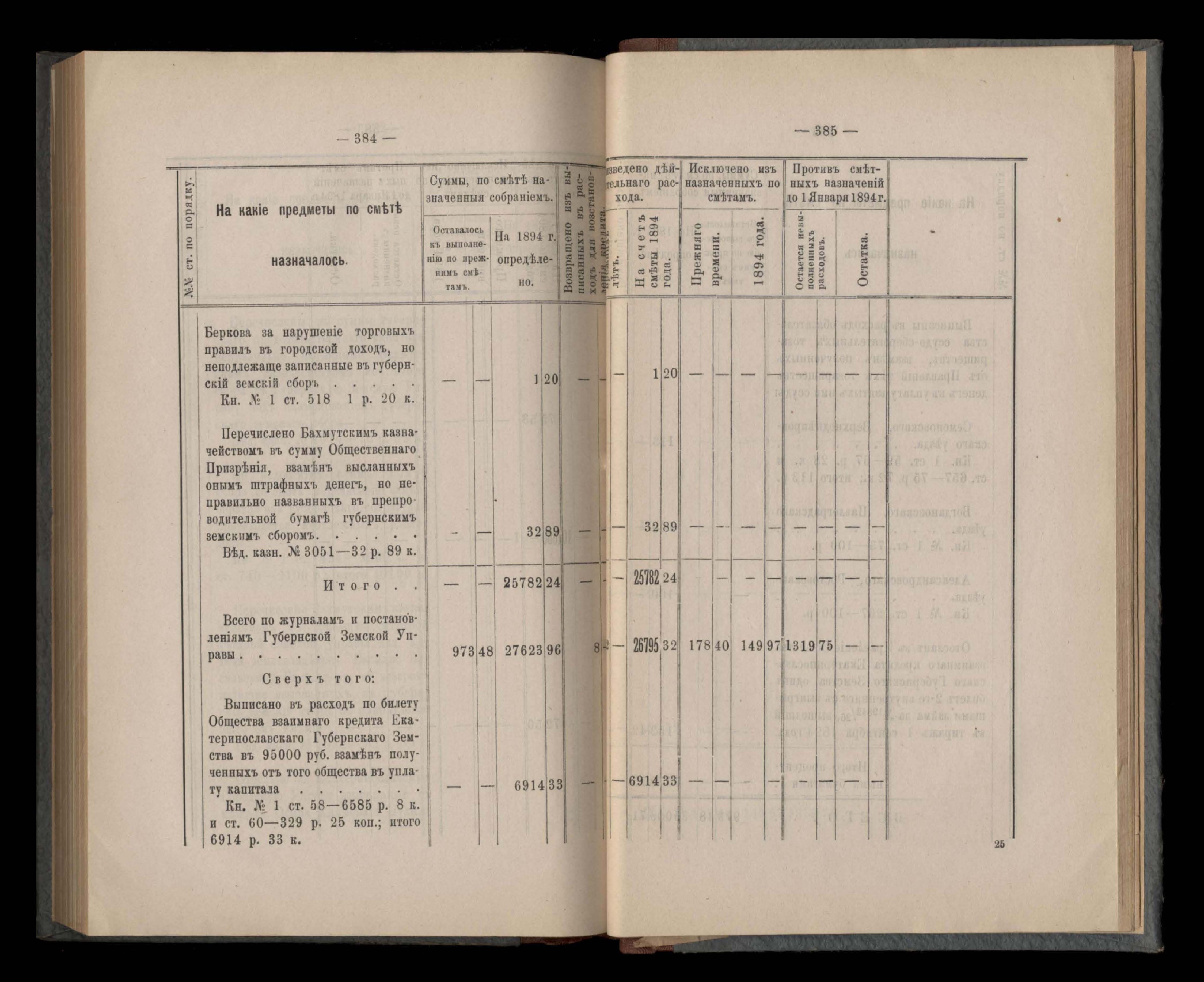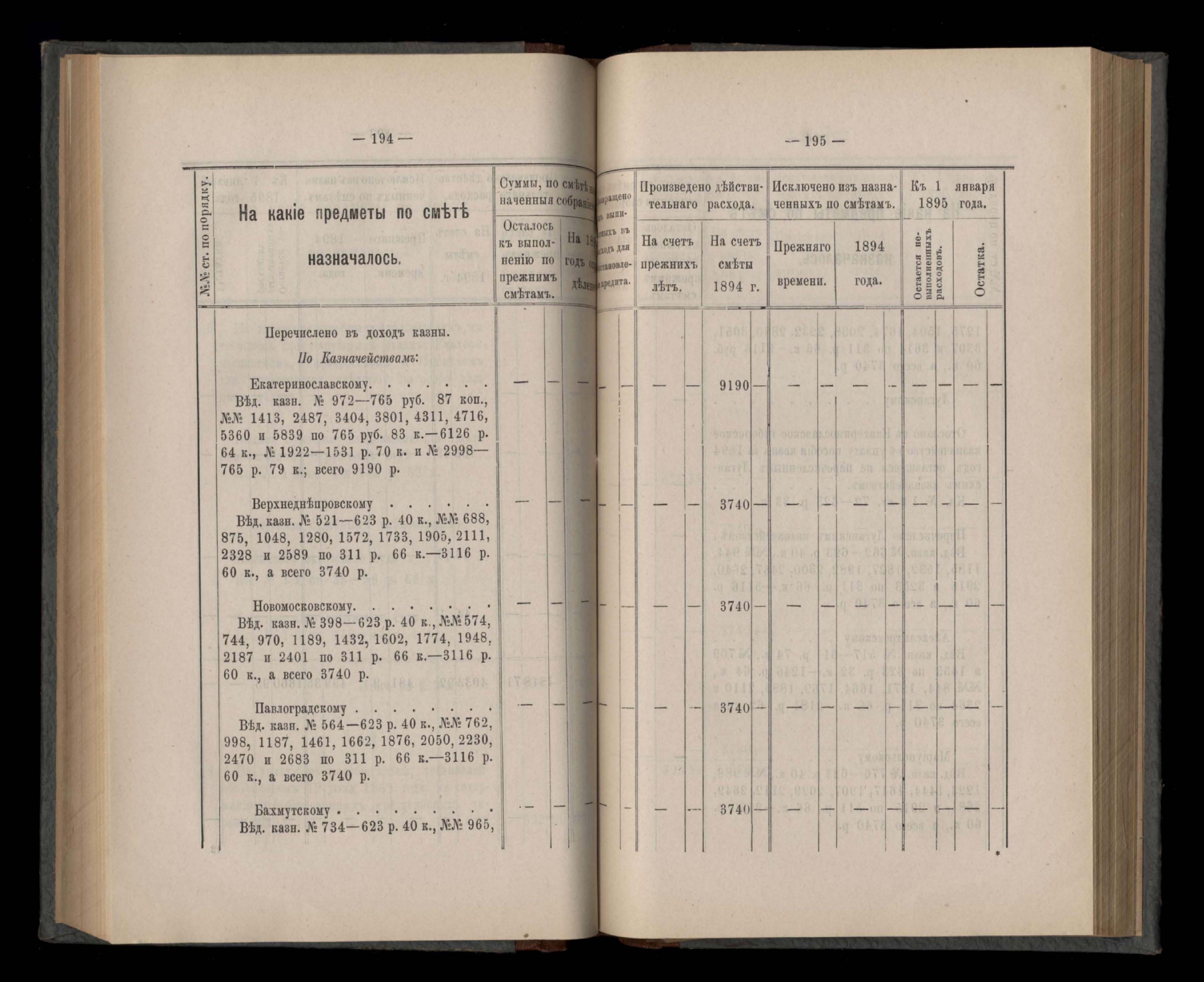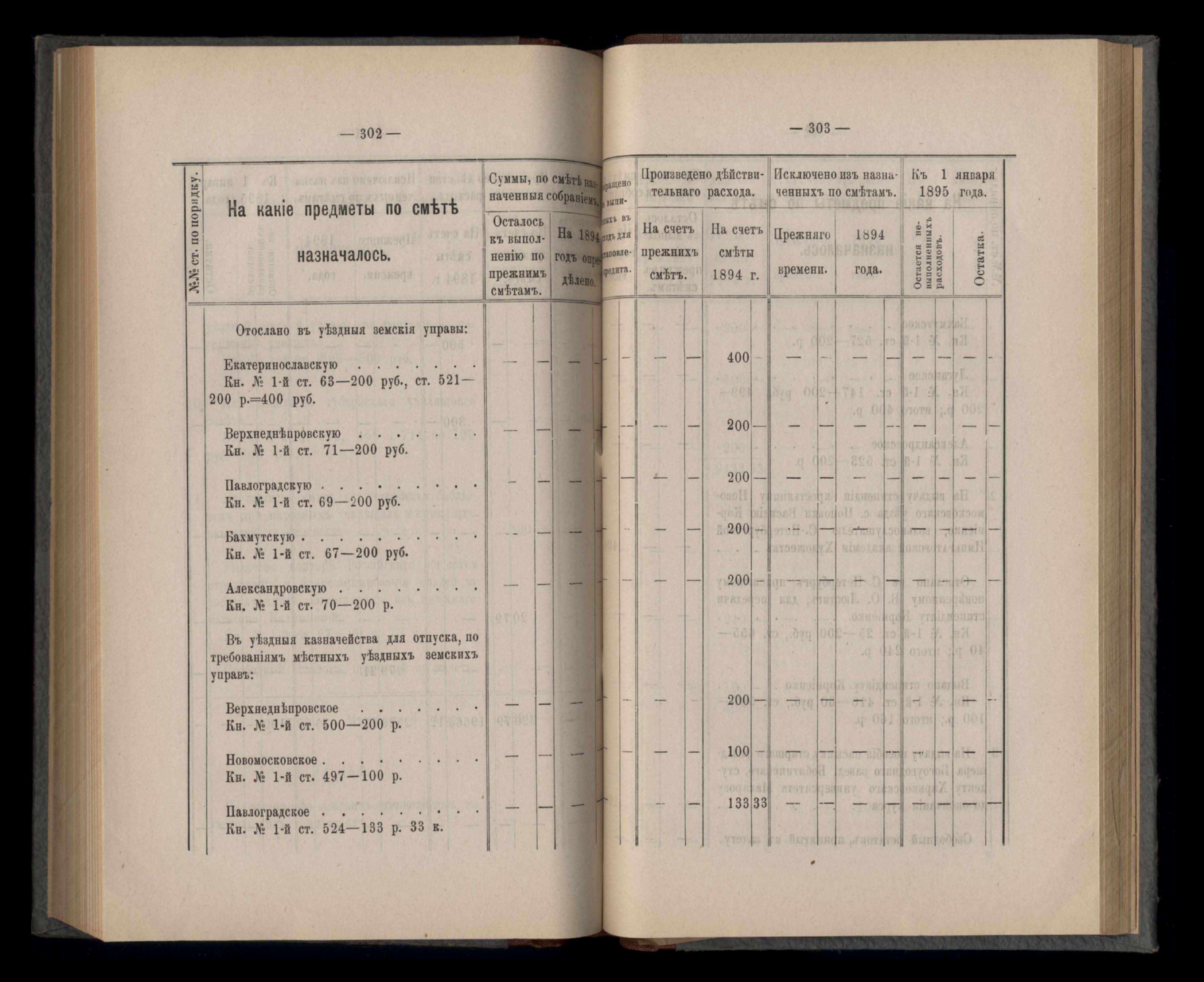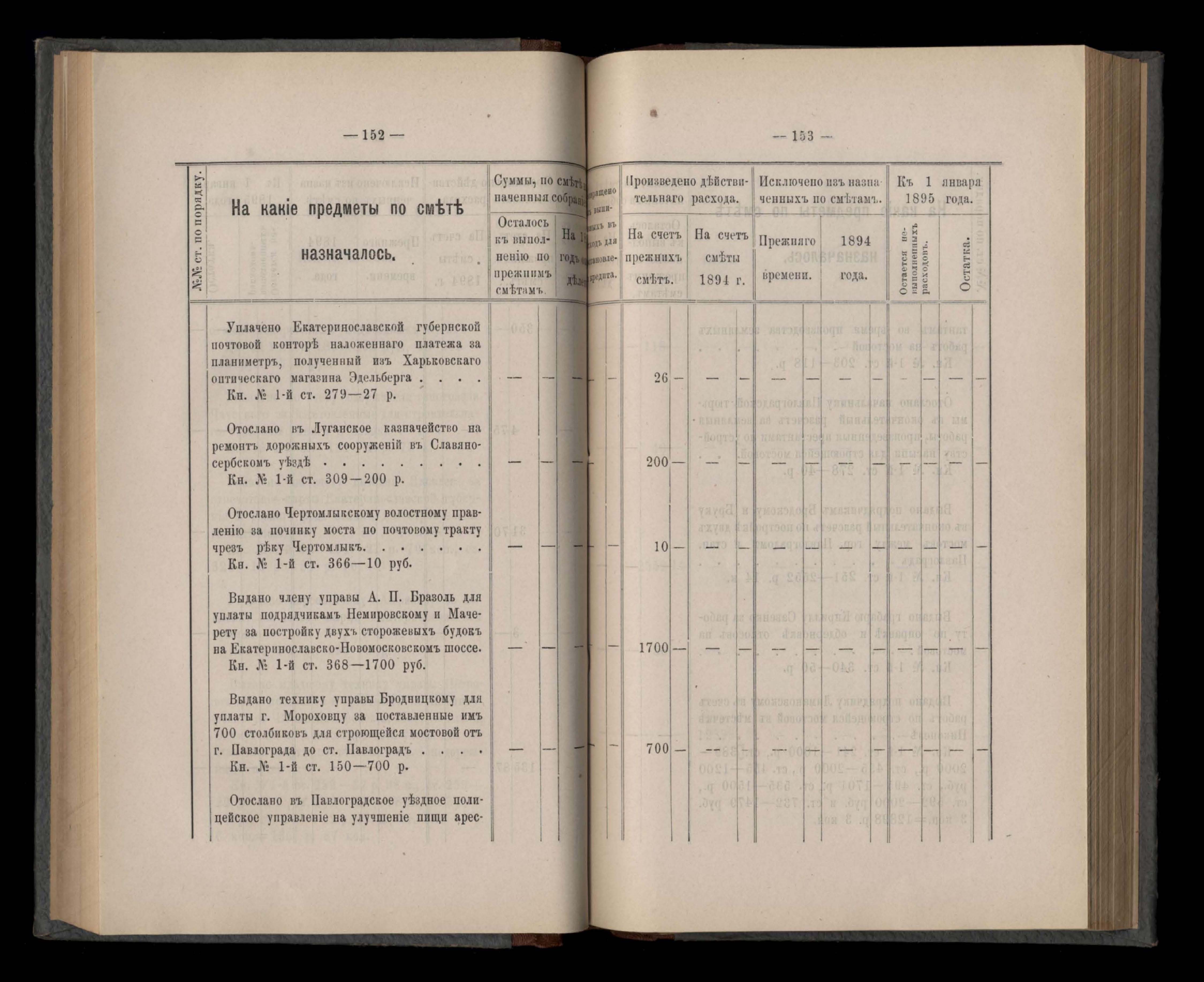 Въдомостъ Екатеринославской губернской земской управы о расходъ суммъ губернскаго земскаго сбора, ассигнованныхъ по смътъ за 1894 годъ