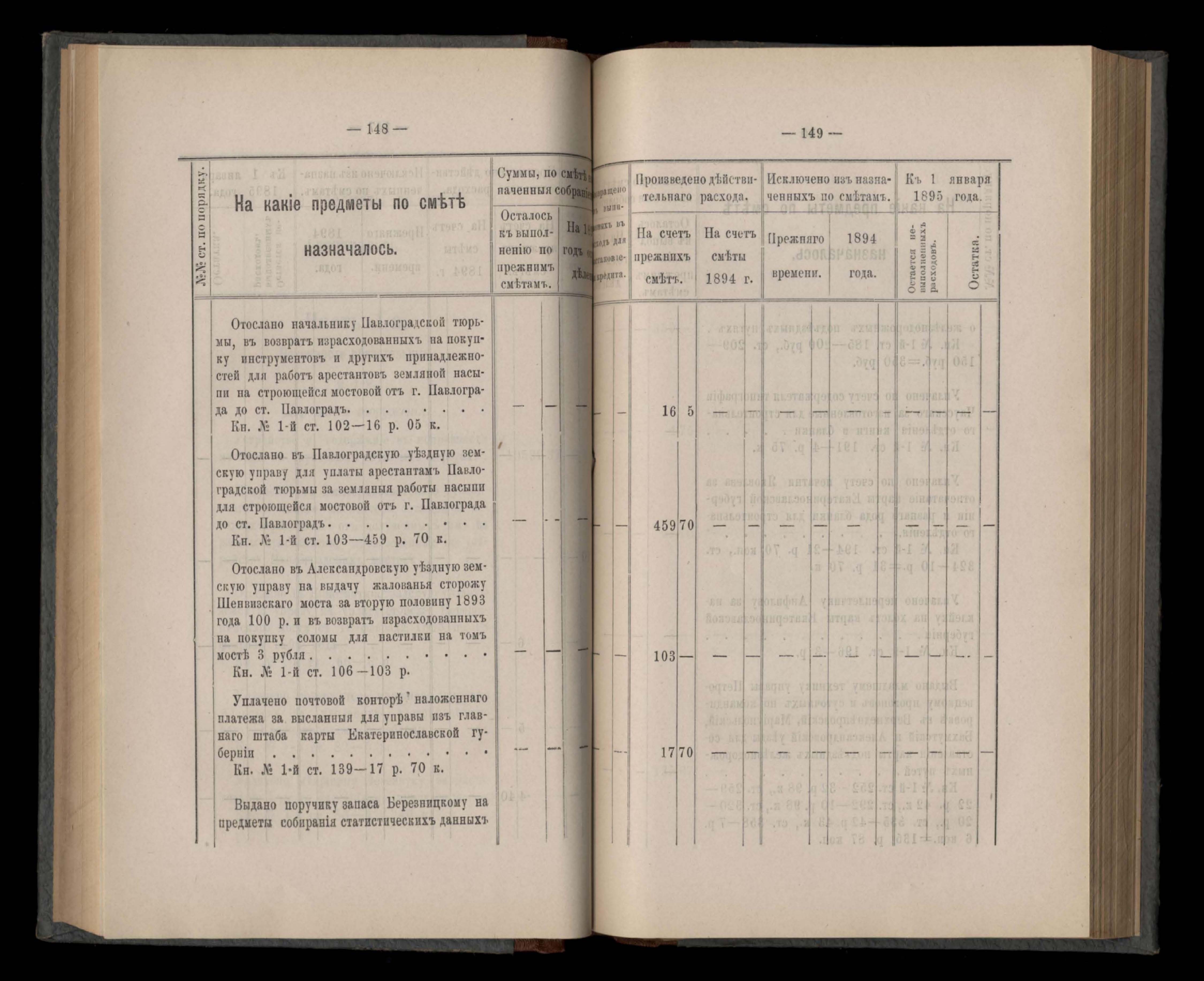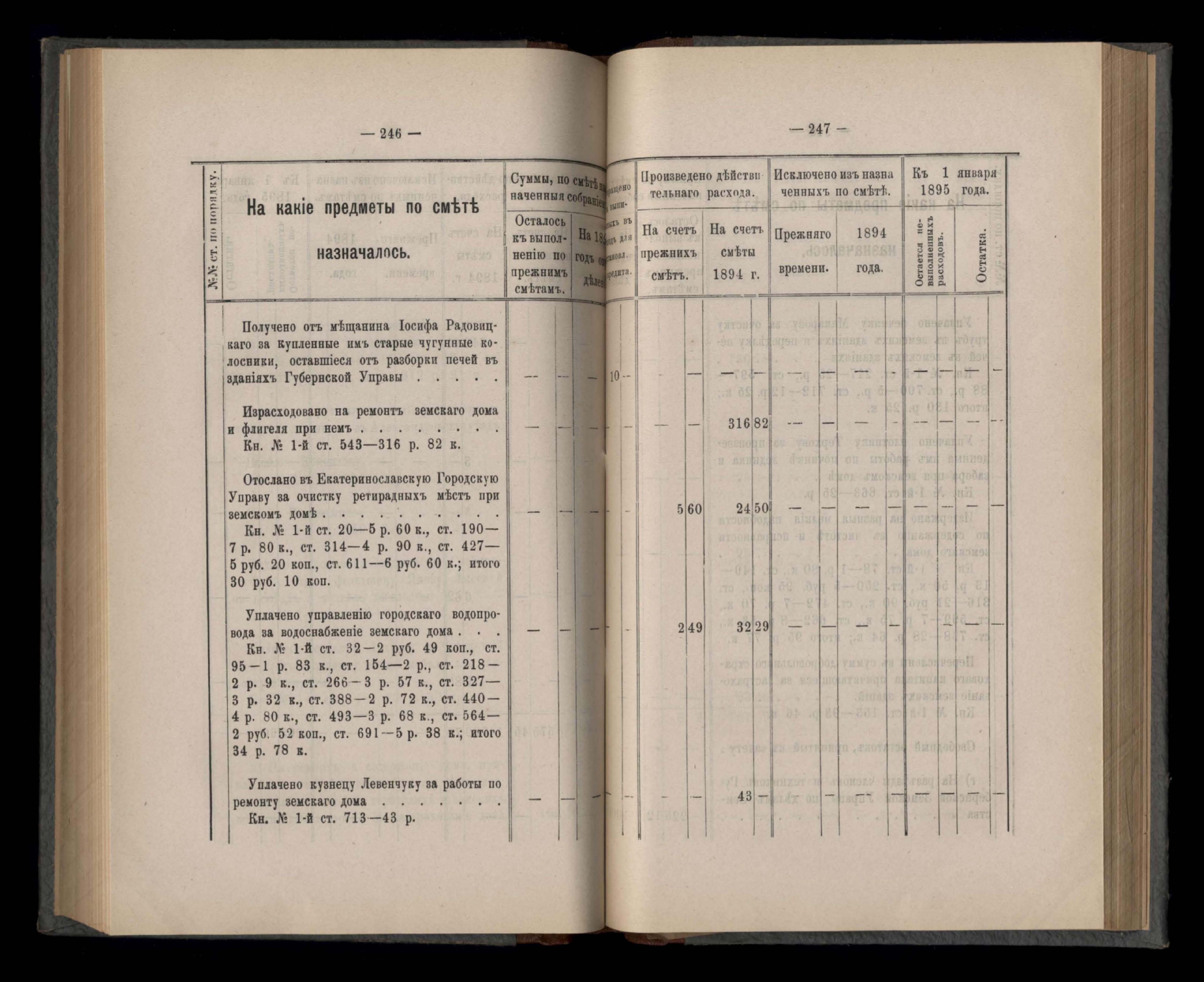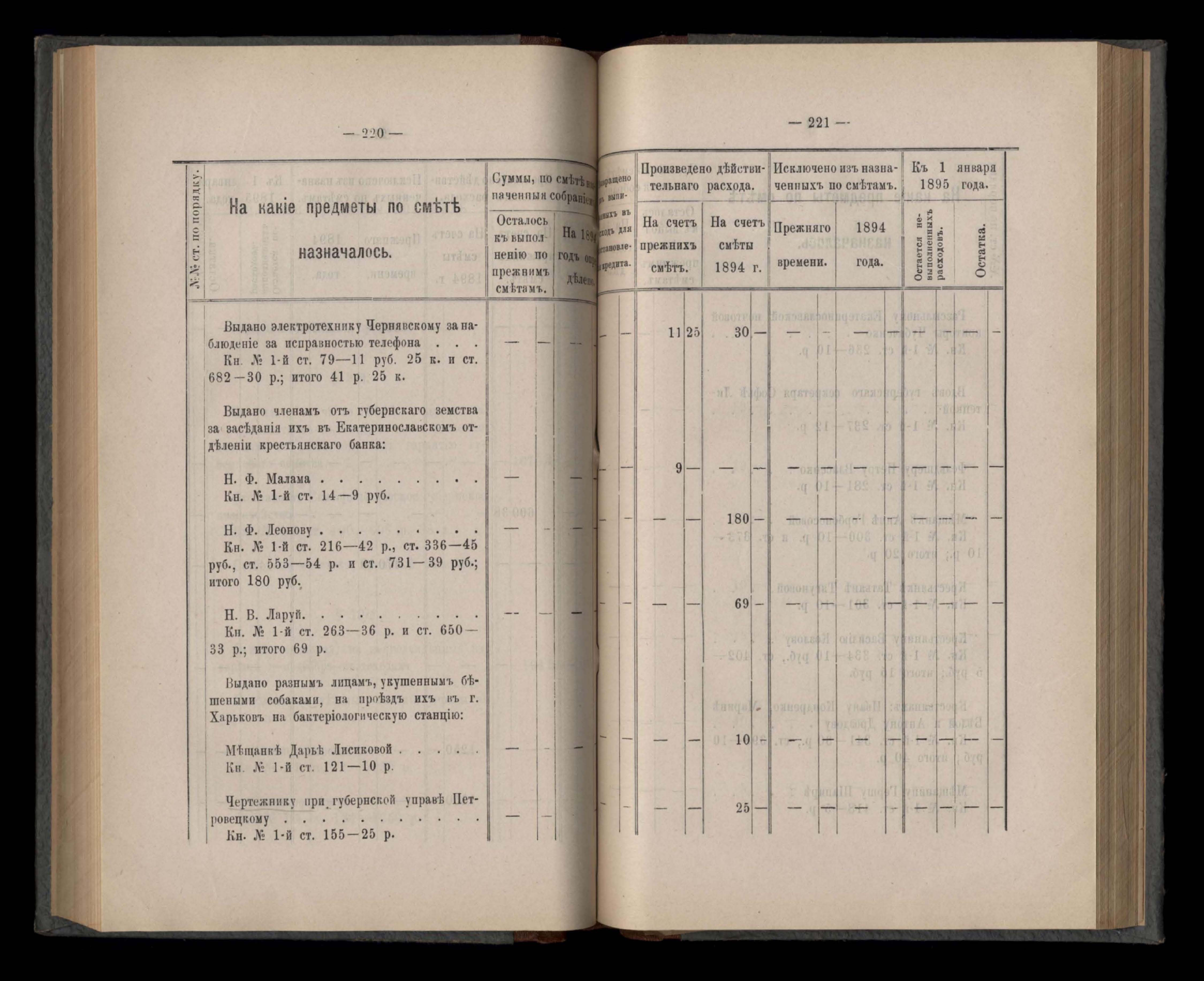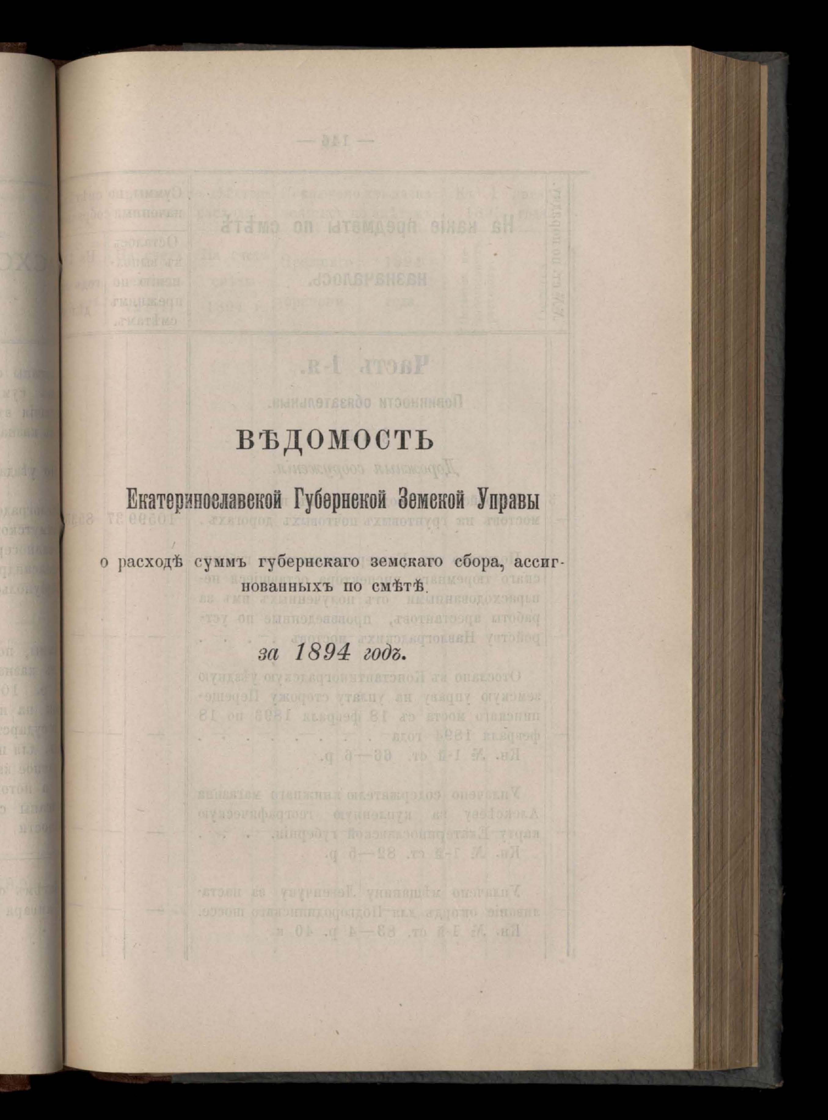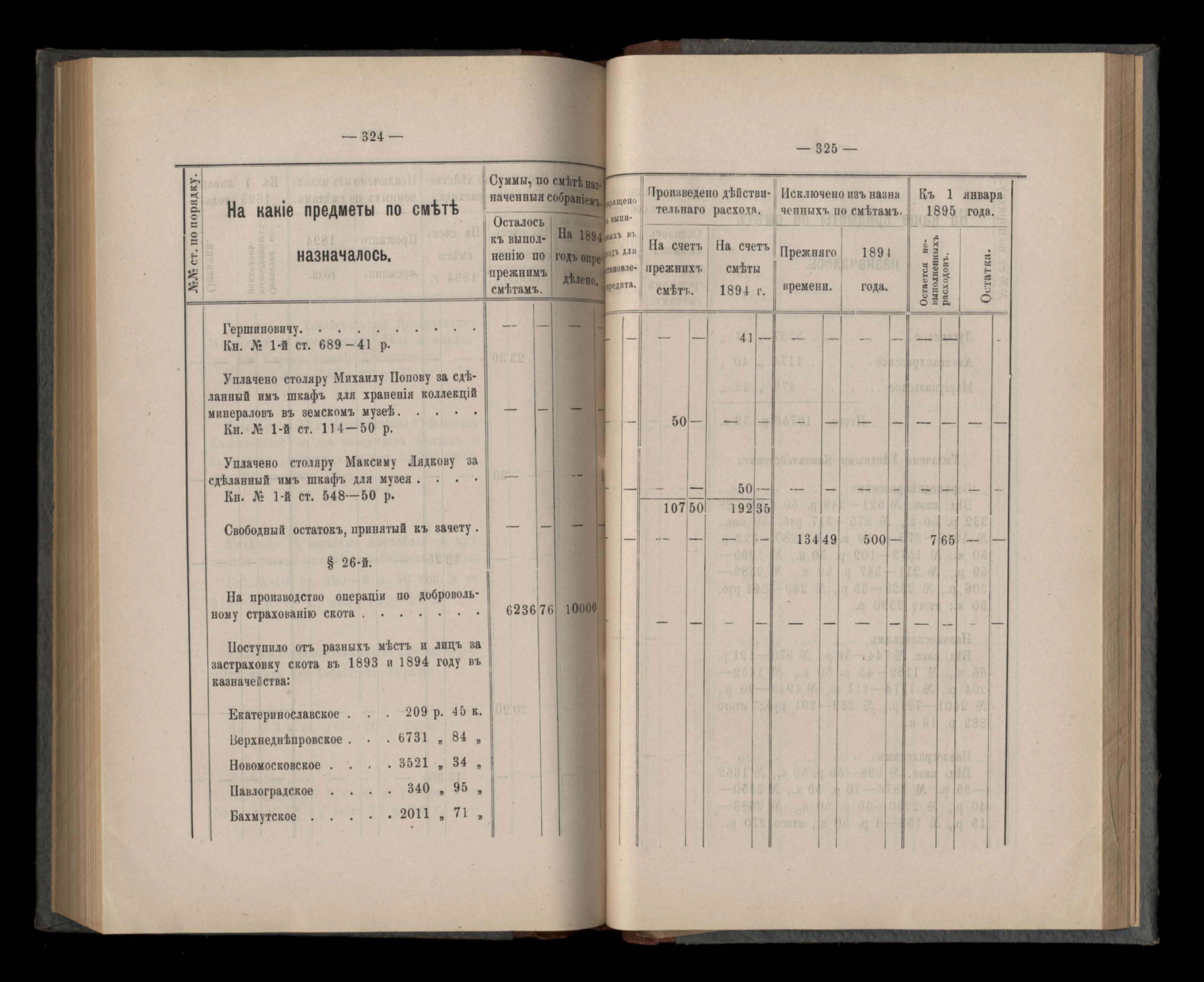 Въдомостъ Екатеринославской губернской земской управы о расходъ суммъ губернскаго земскаго сбора, ассигнованныхъ по смътъ за 1894 годъ