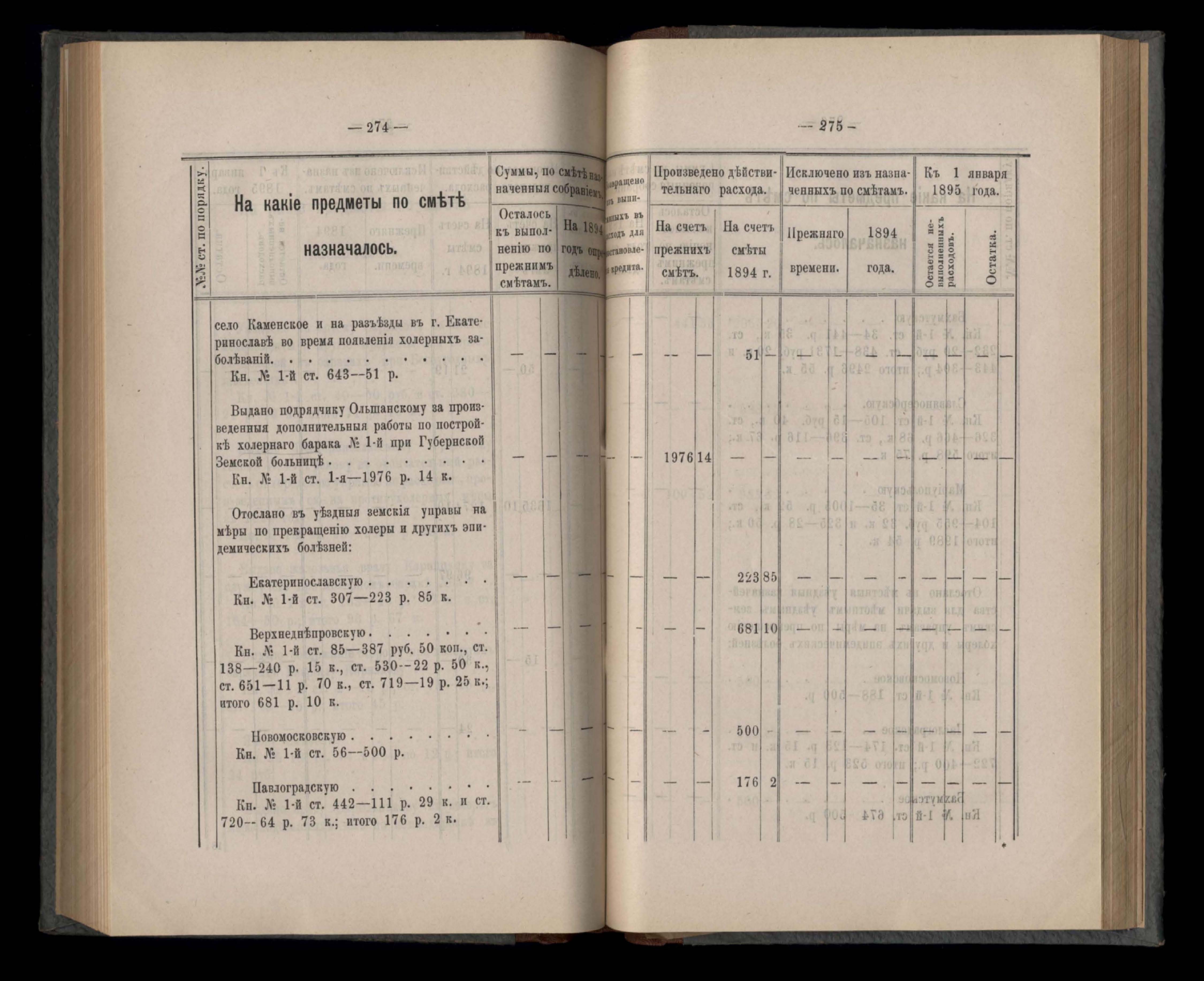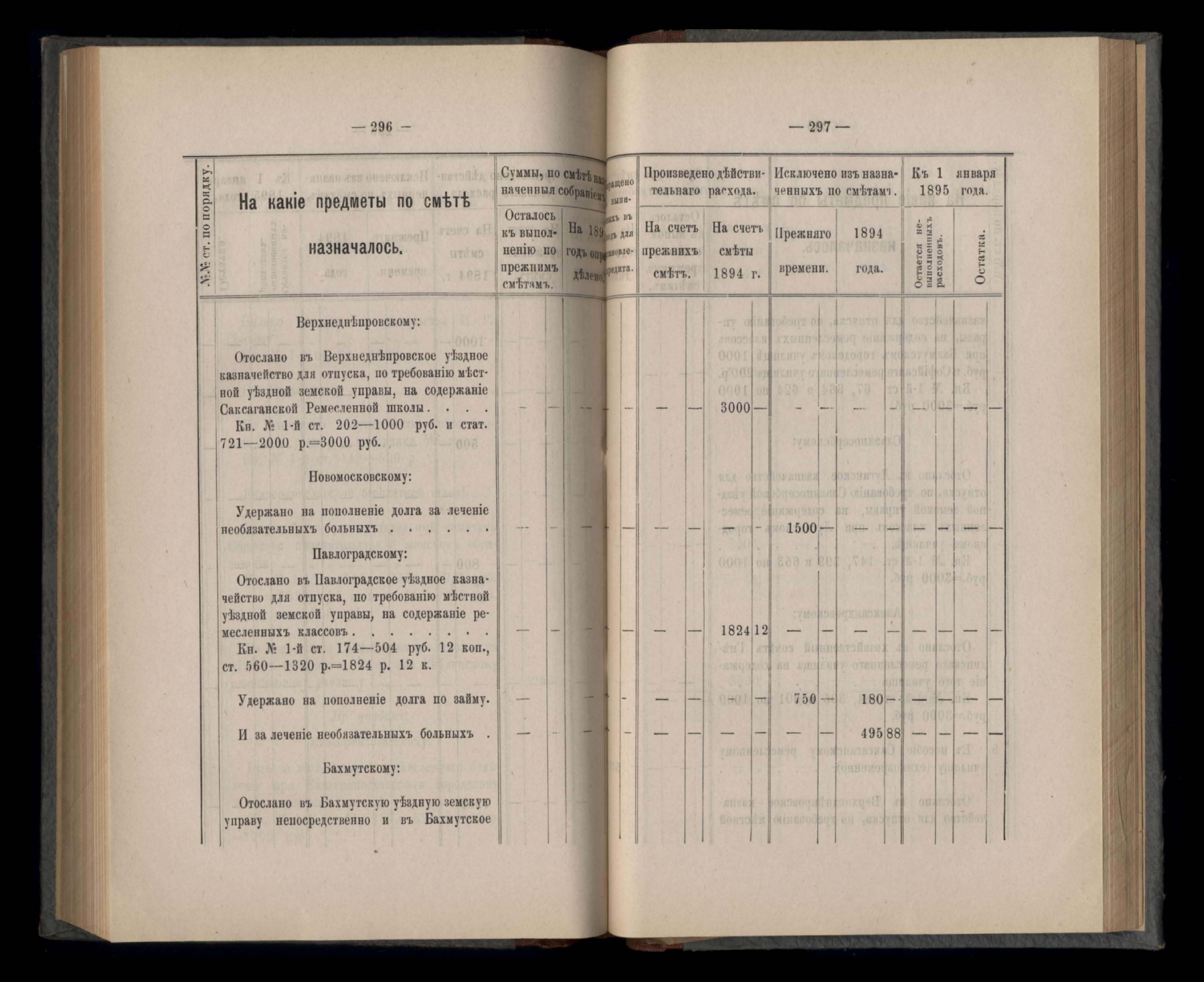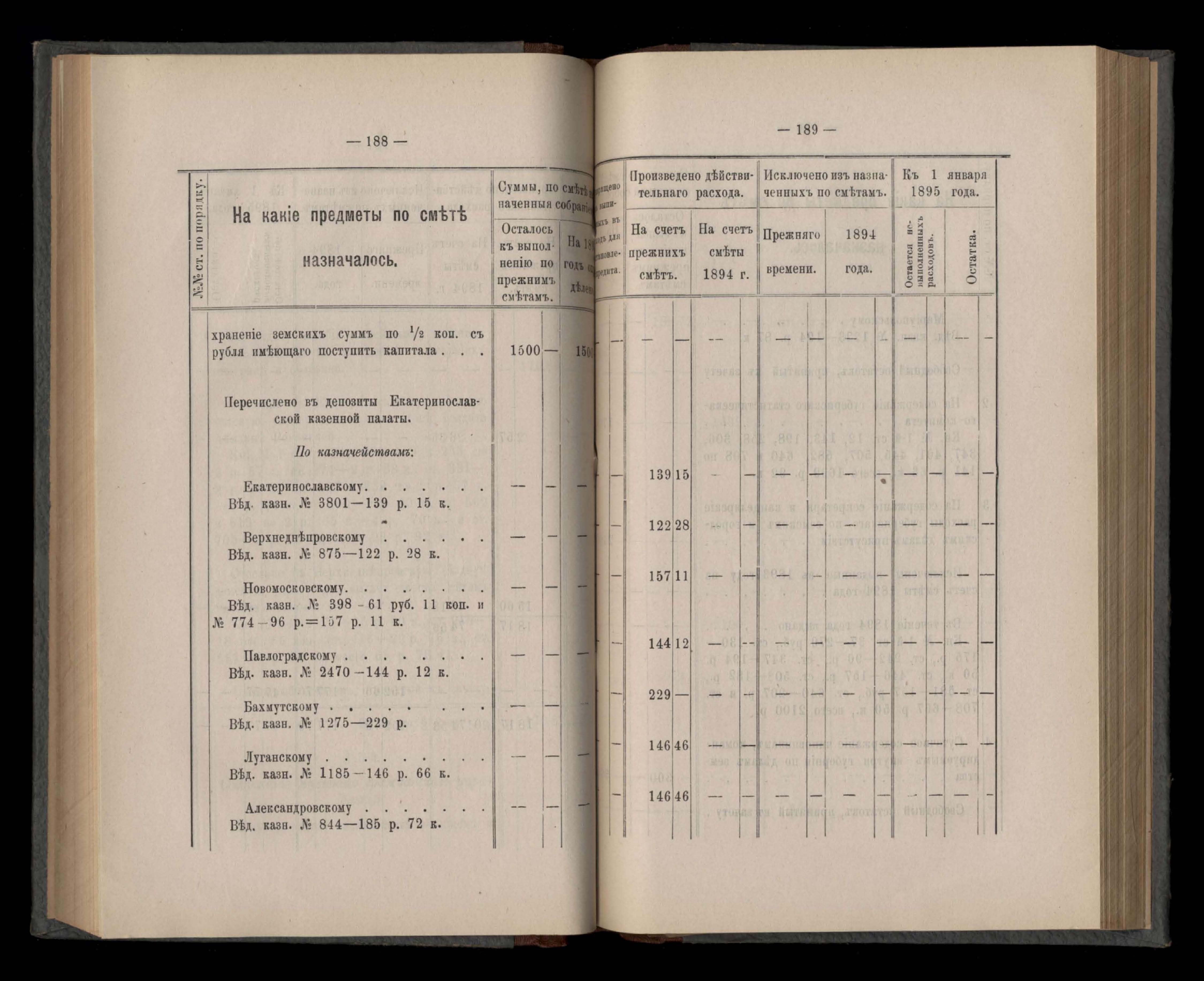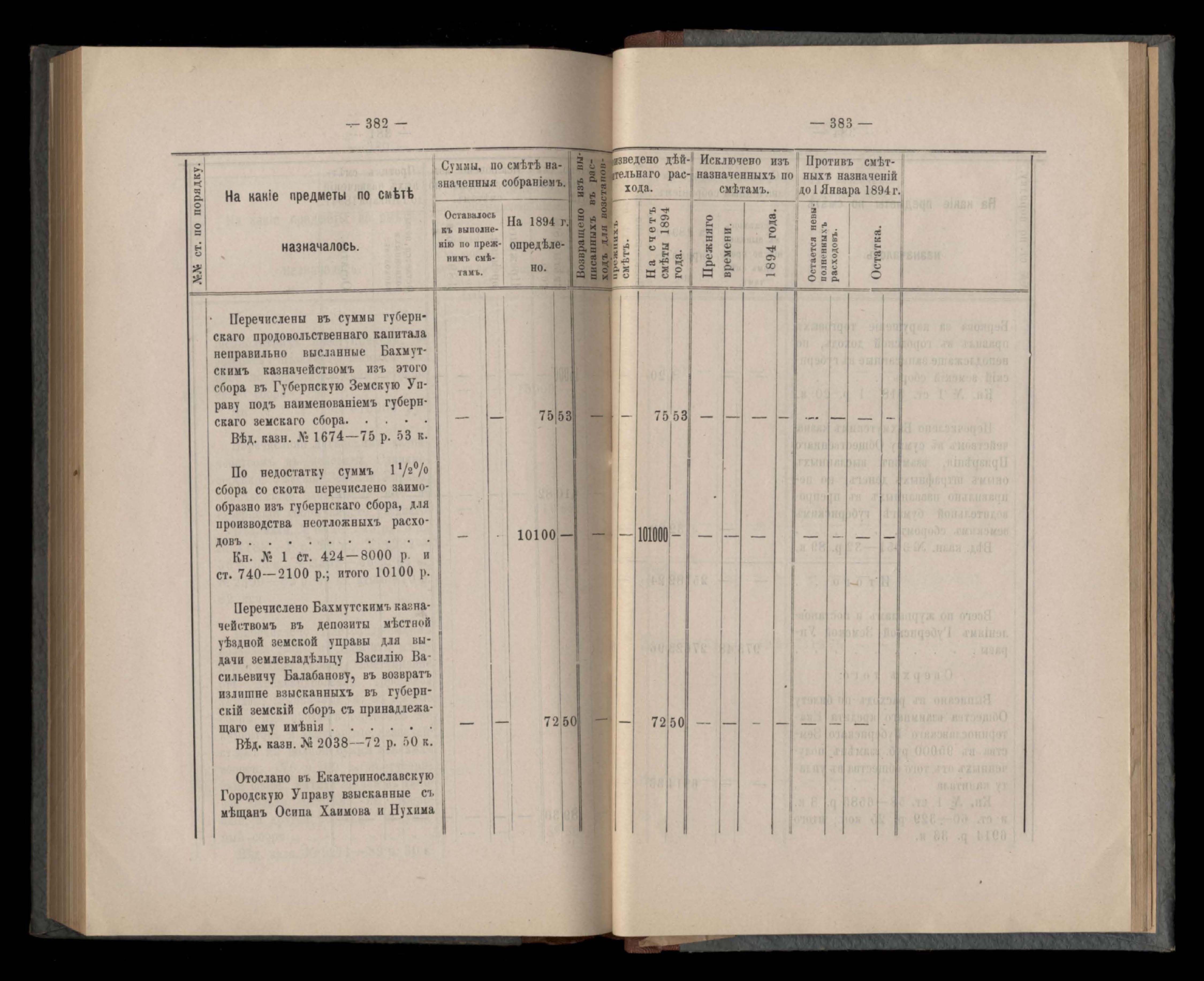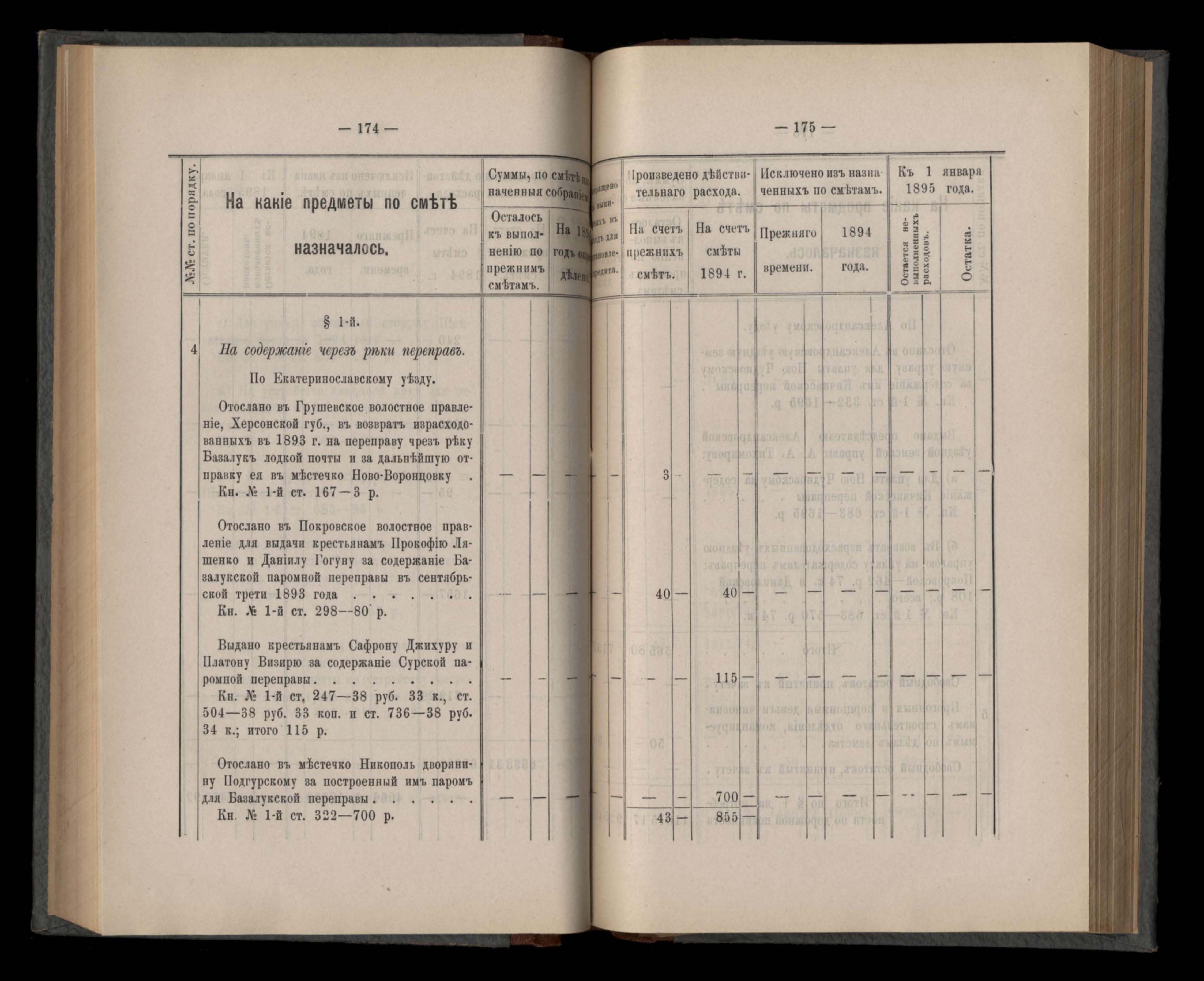 Въдомостъ Екатеринославской губернской земской управы о расходъ суммъ губернскаго земскаго сбора, ассигнованныхъ по смътъ за 1894 годъ
