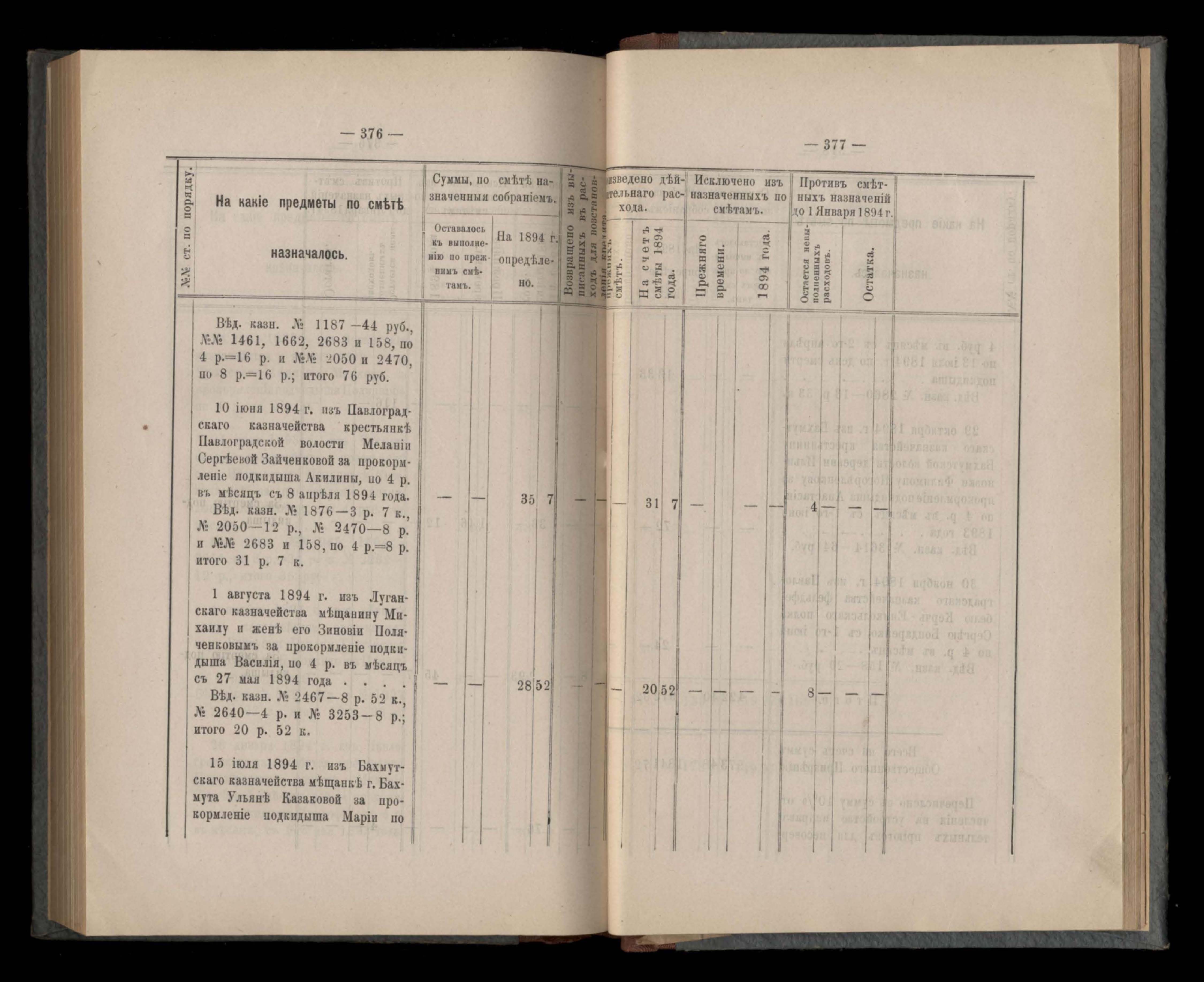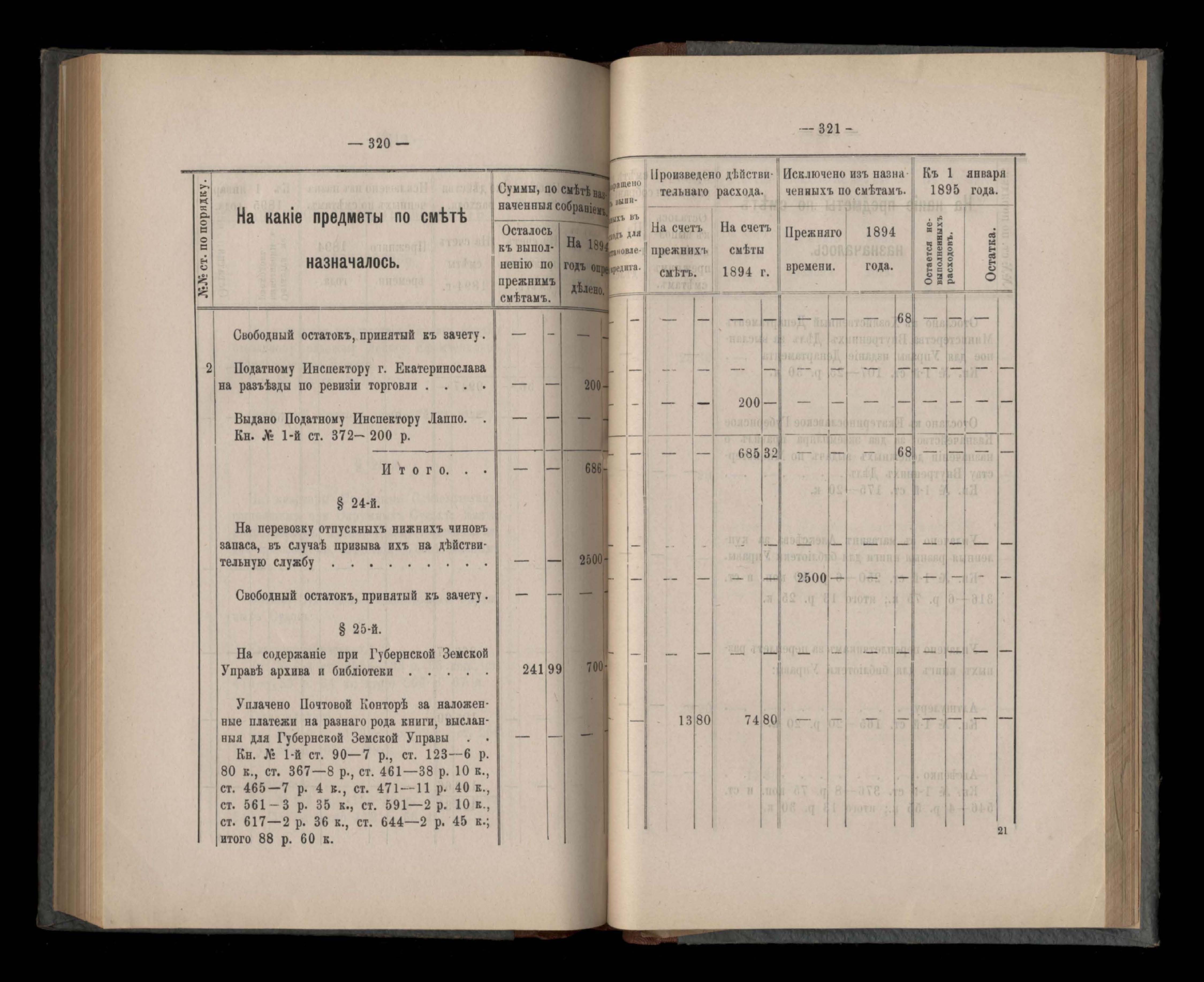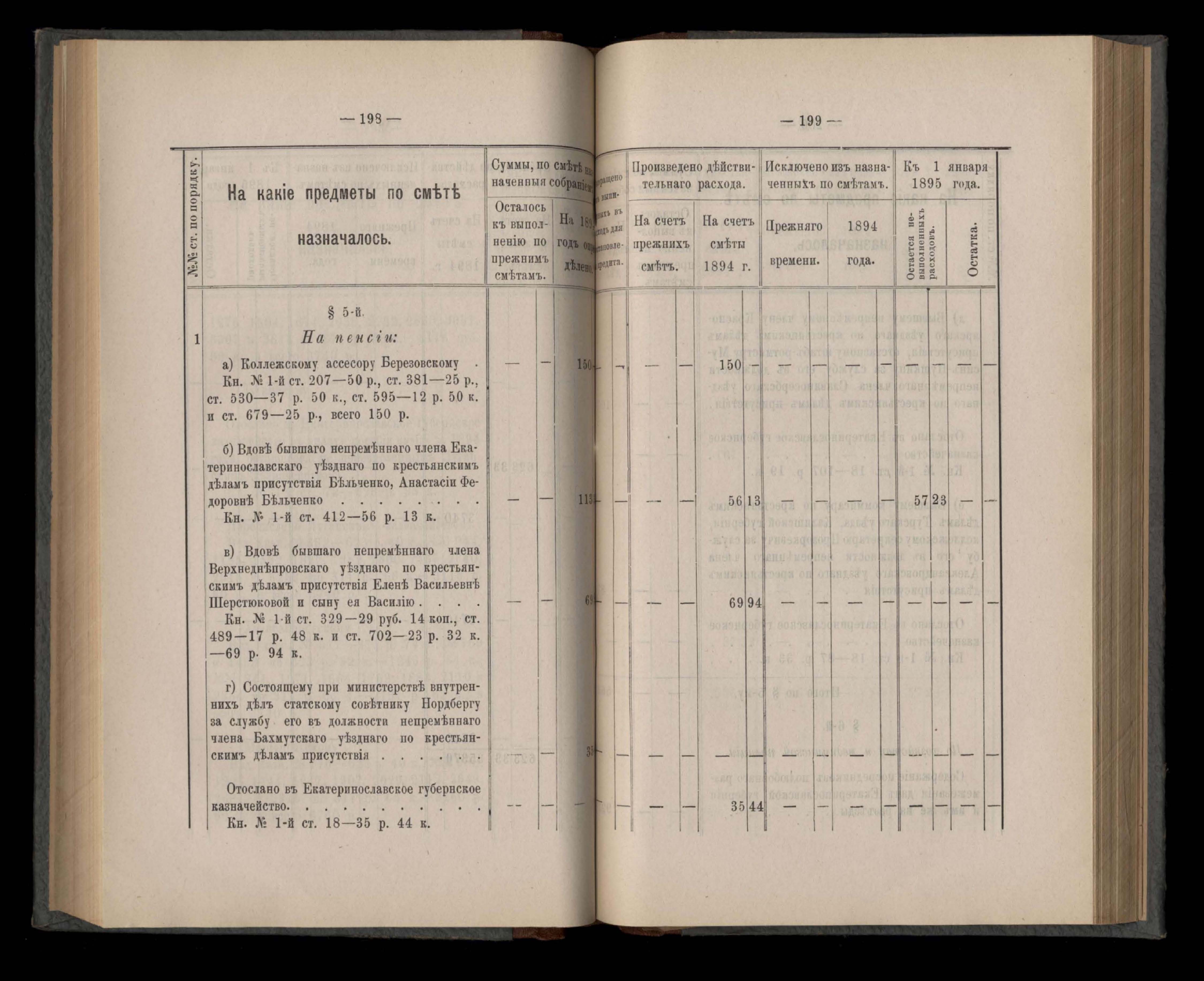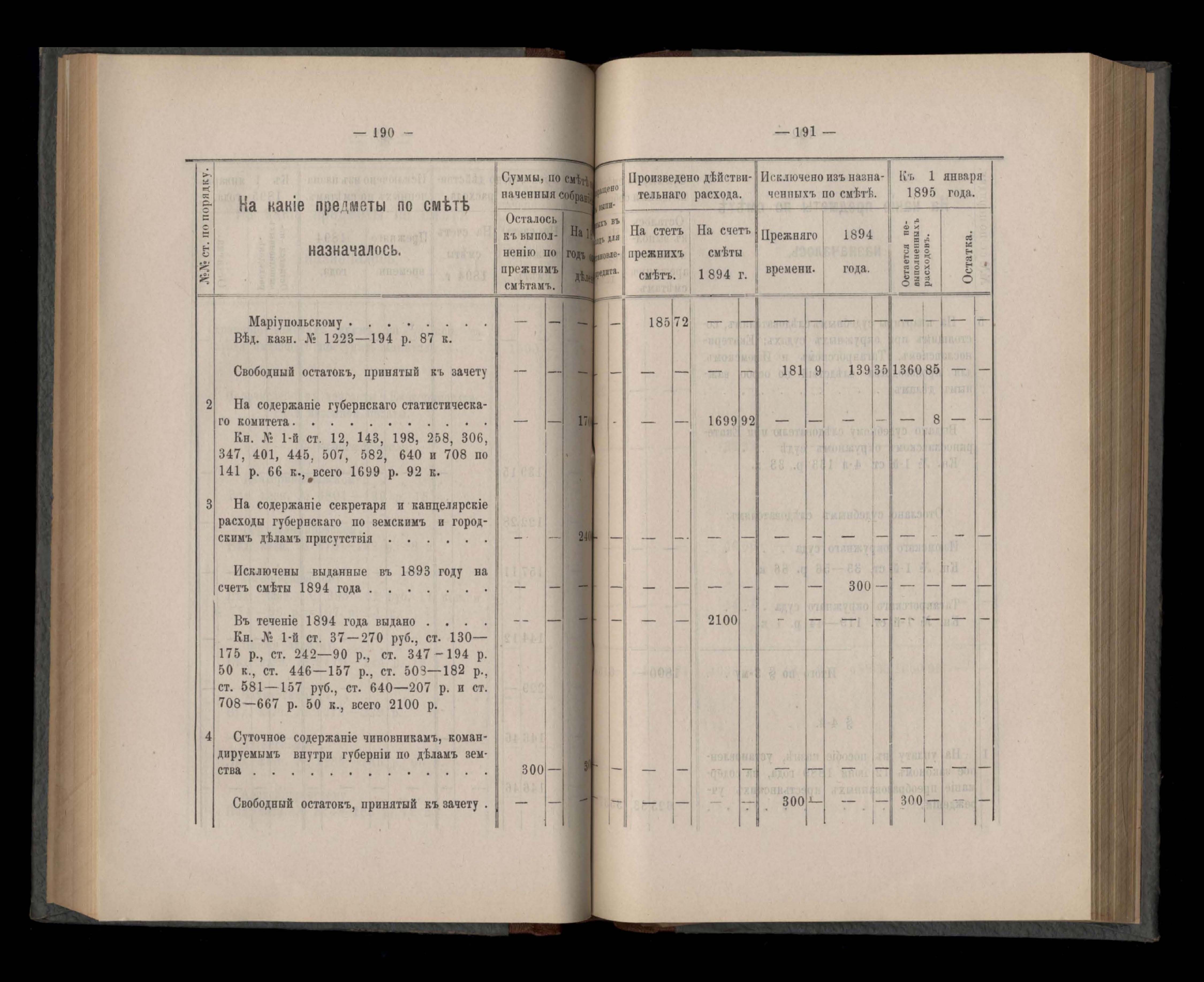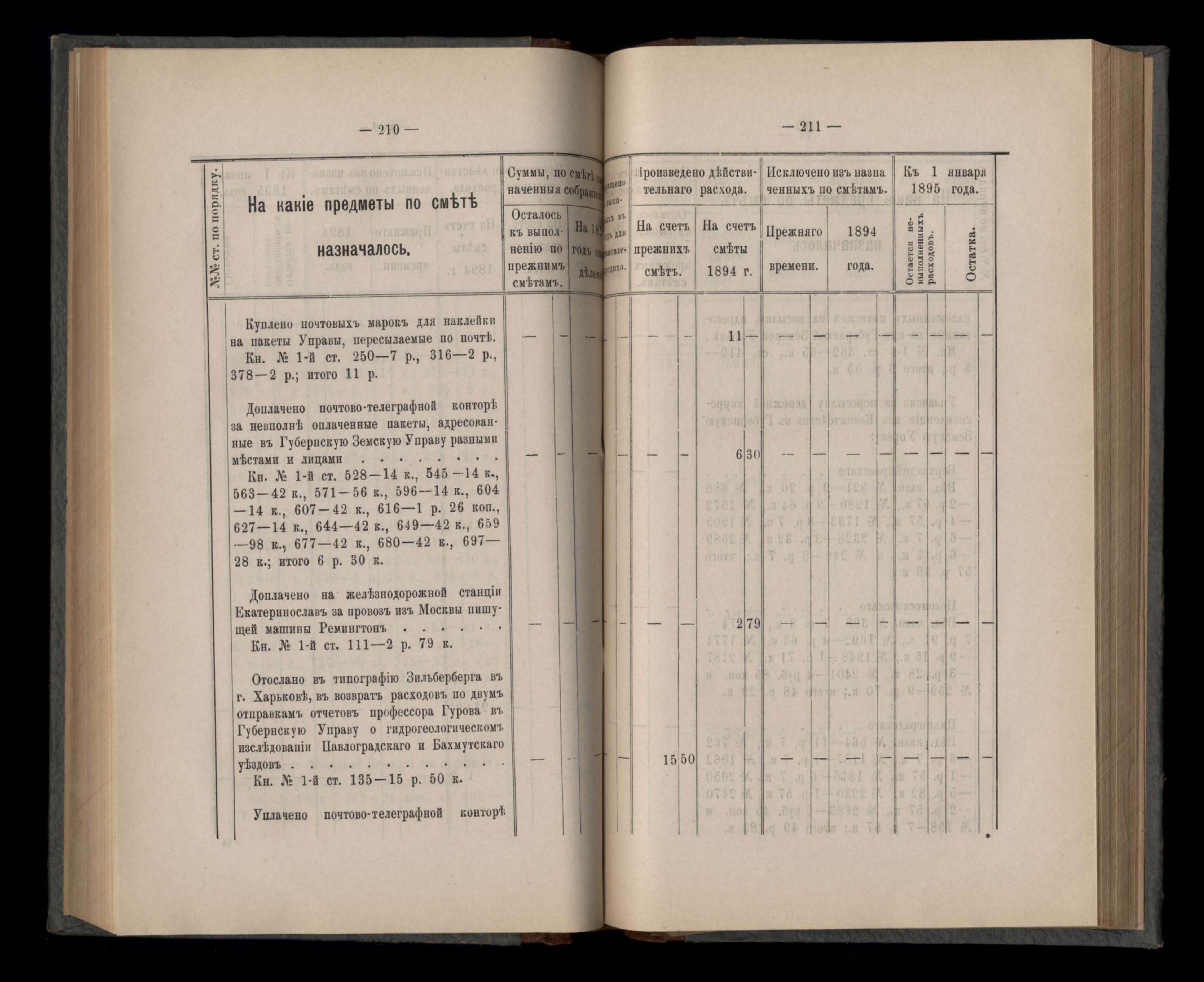 Въдомостъ Екатеринославской губернской земской управы о расходъ суммъ губернскаго земскаго сбора, ассигнованныхъ по смътъ за 1894 годъ