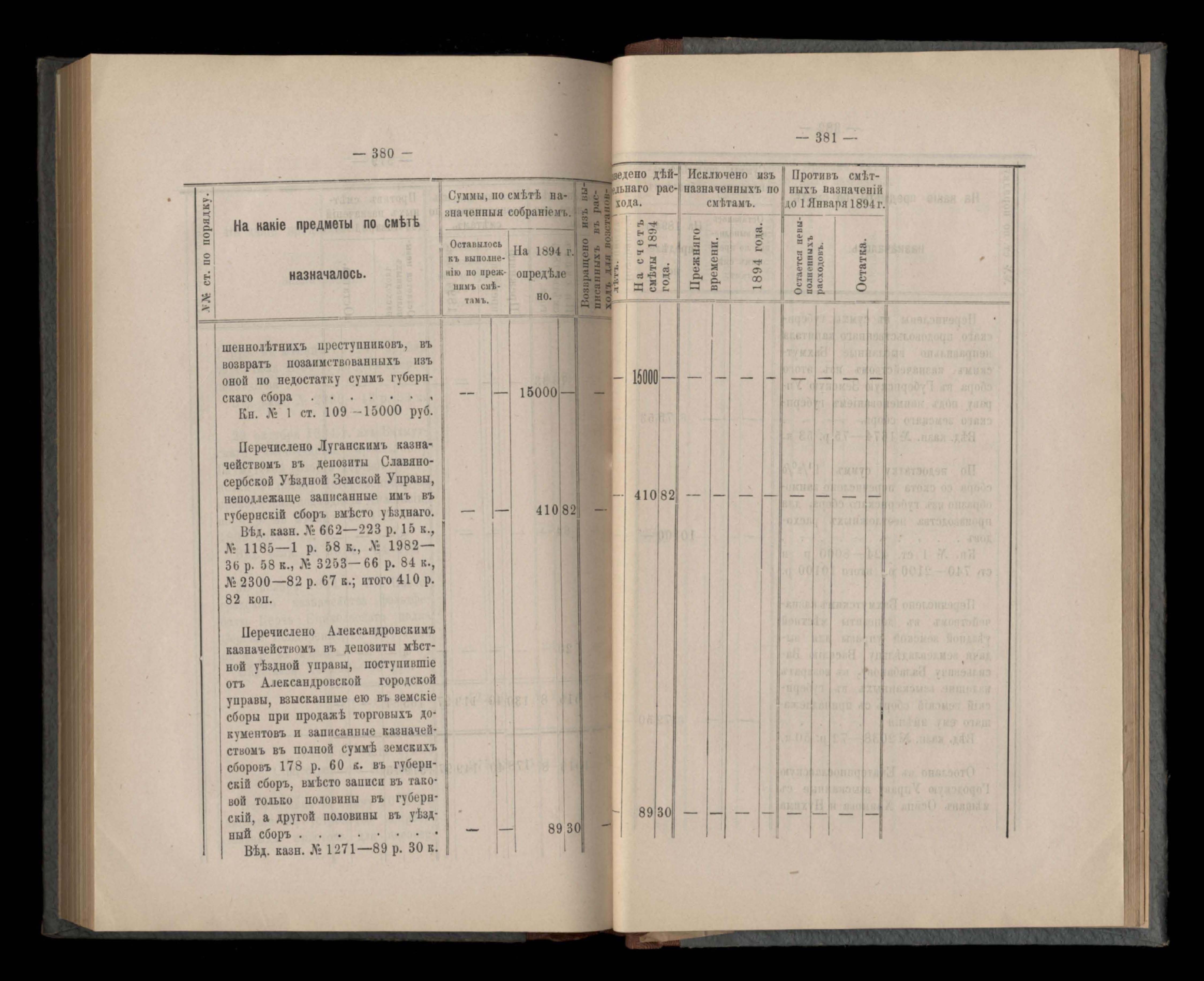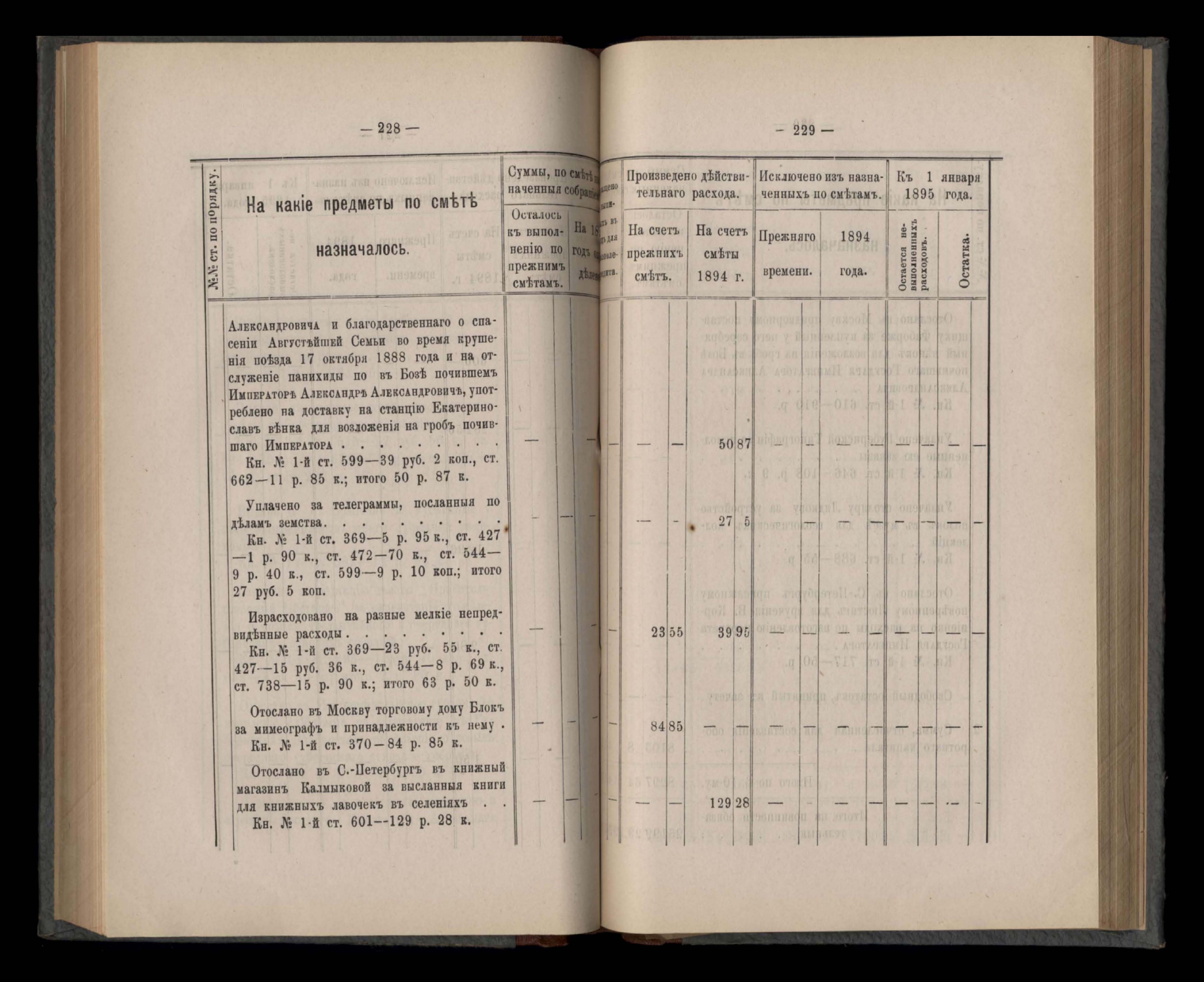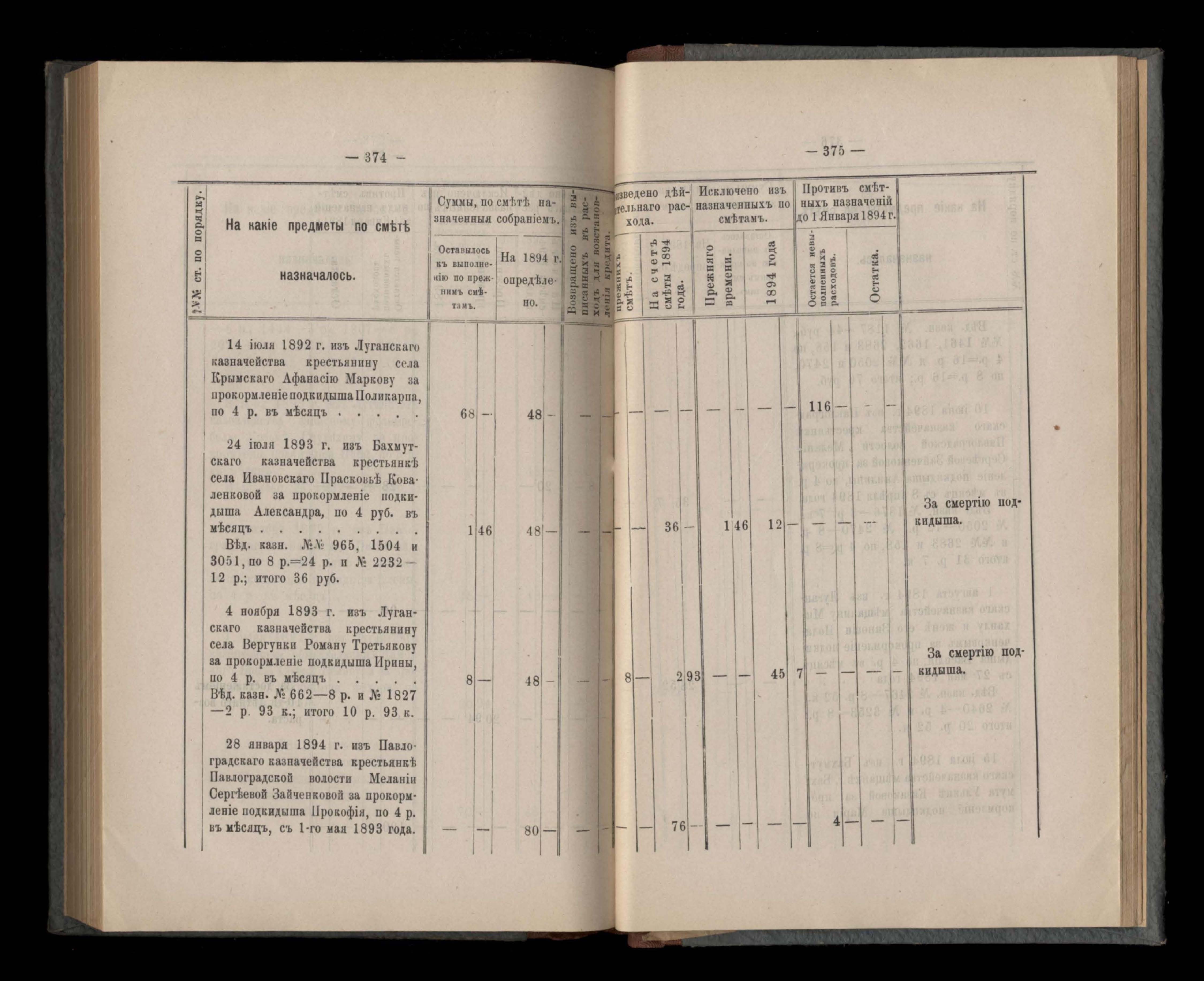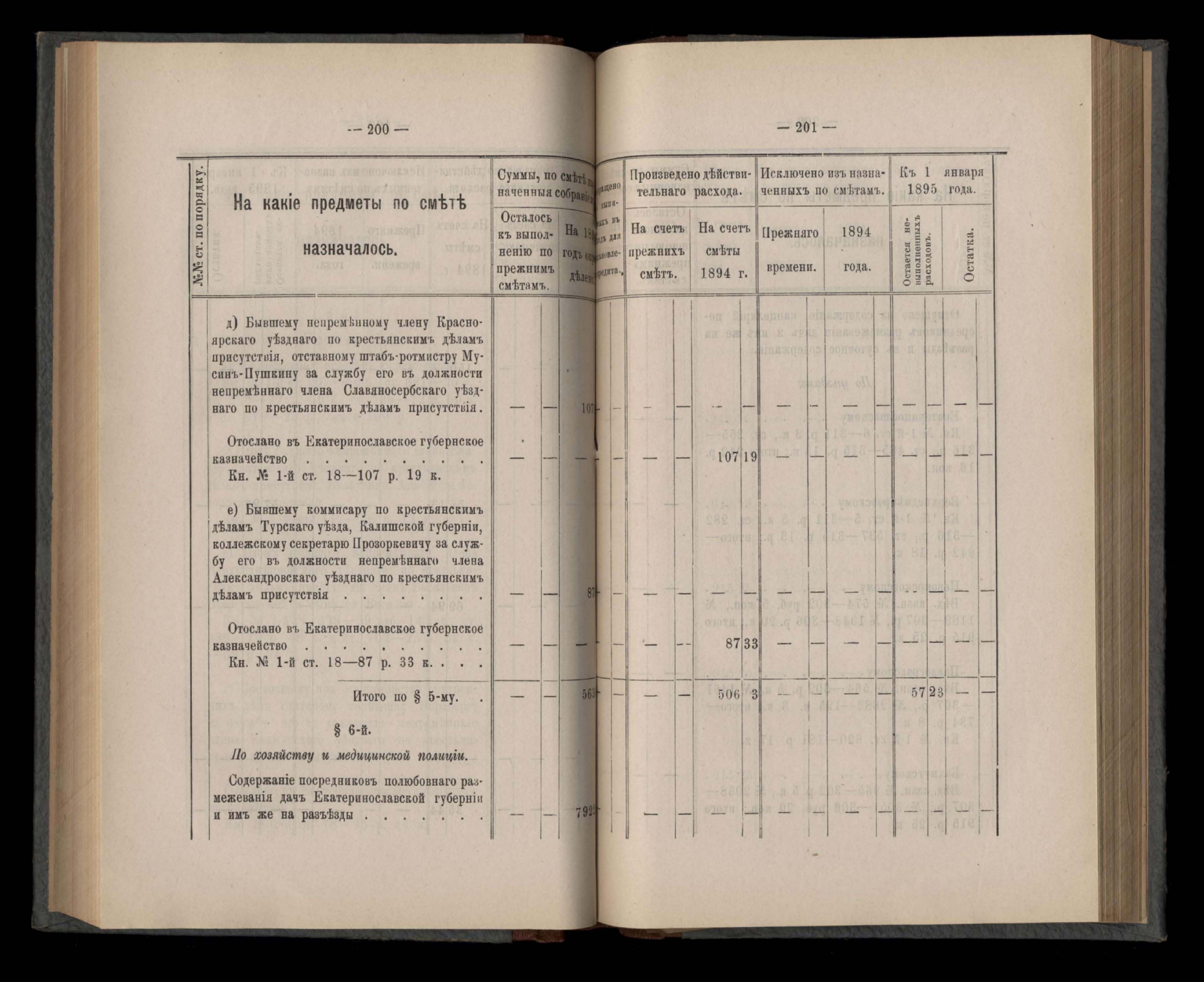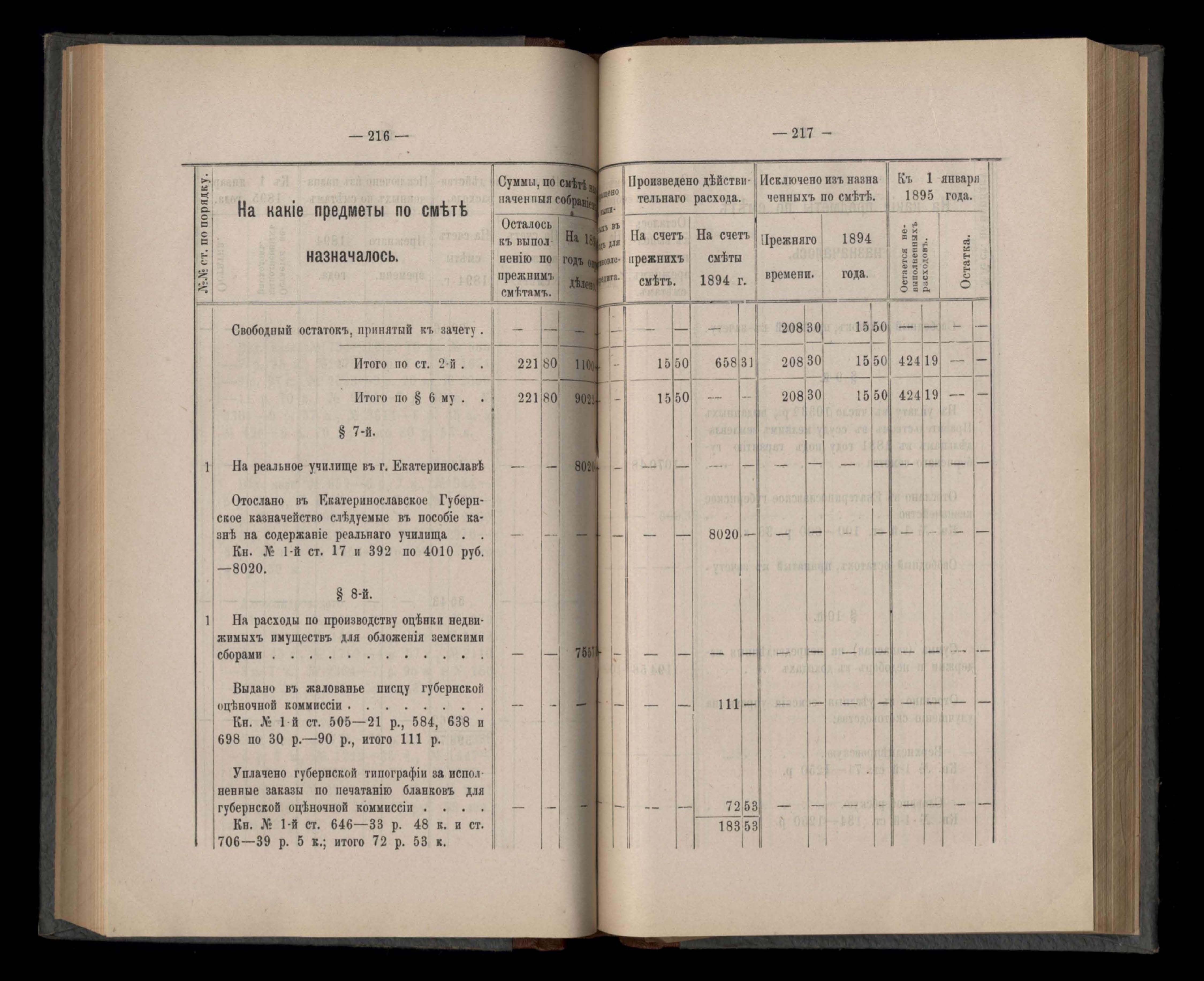 Въдомостъ Екатеринославской губернской земской управы о расходъ суммъ губернскаго земскаго сбора, ассигнованныхъ по смътъ за 1894 годъ