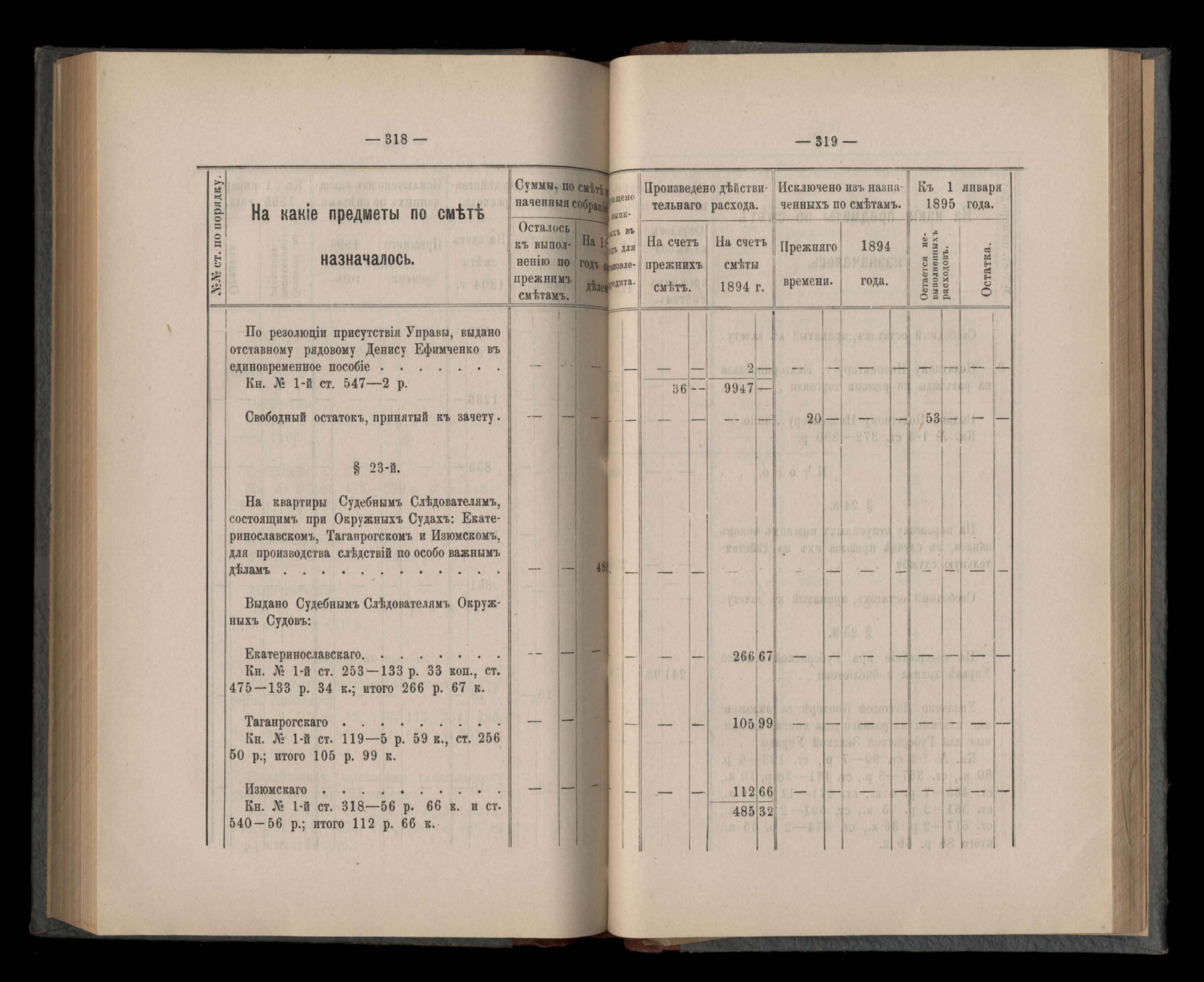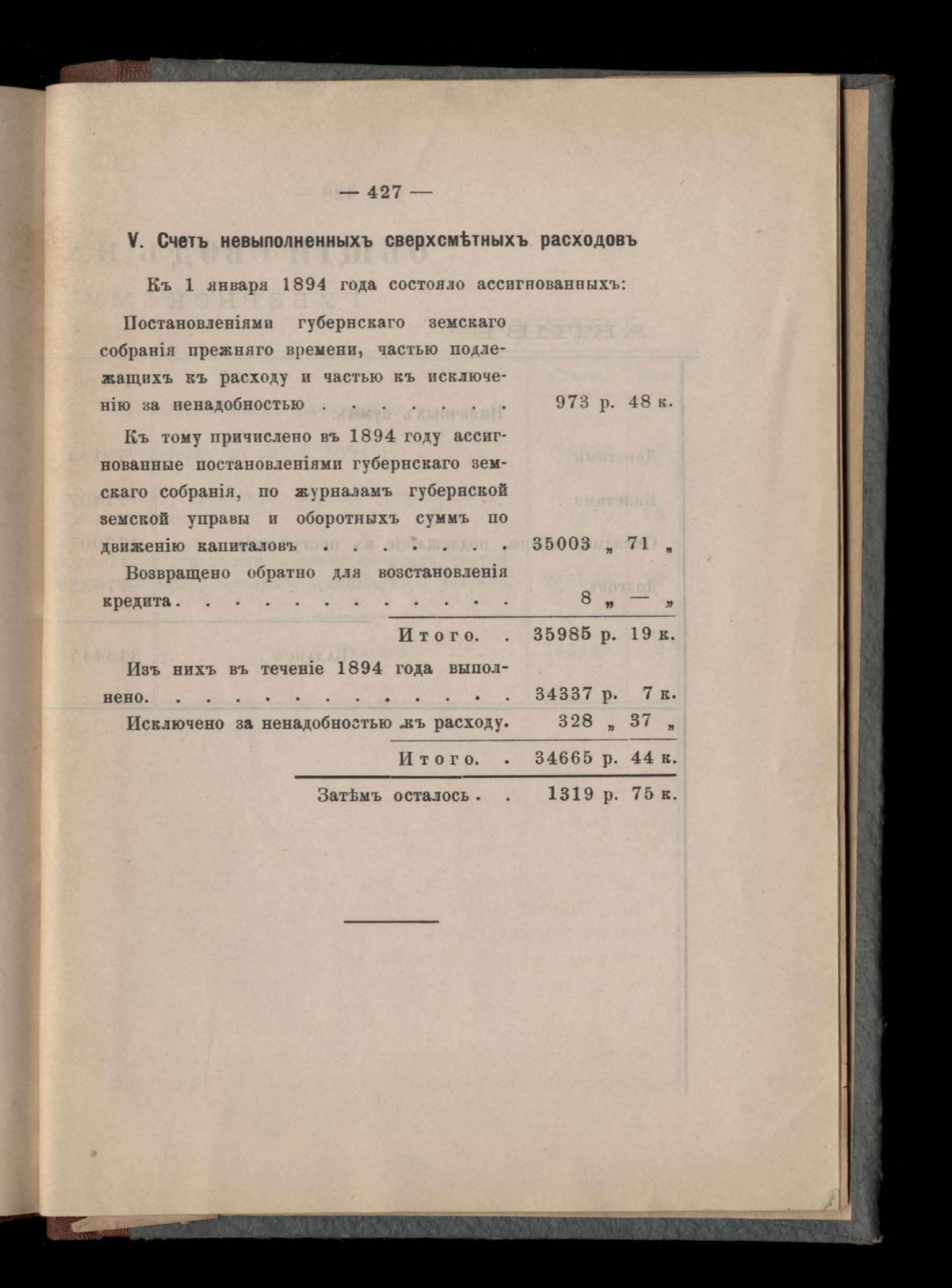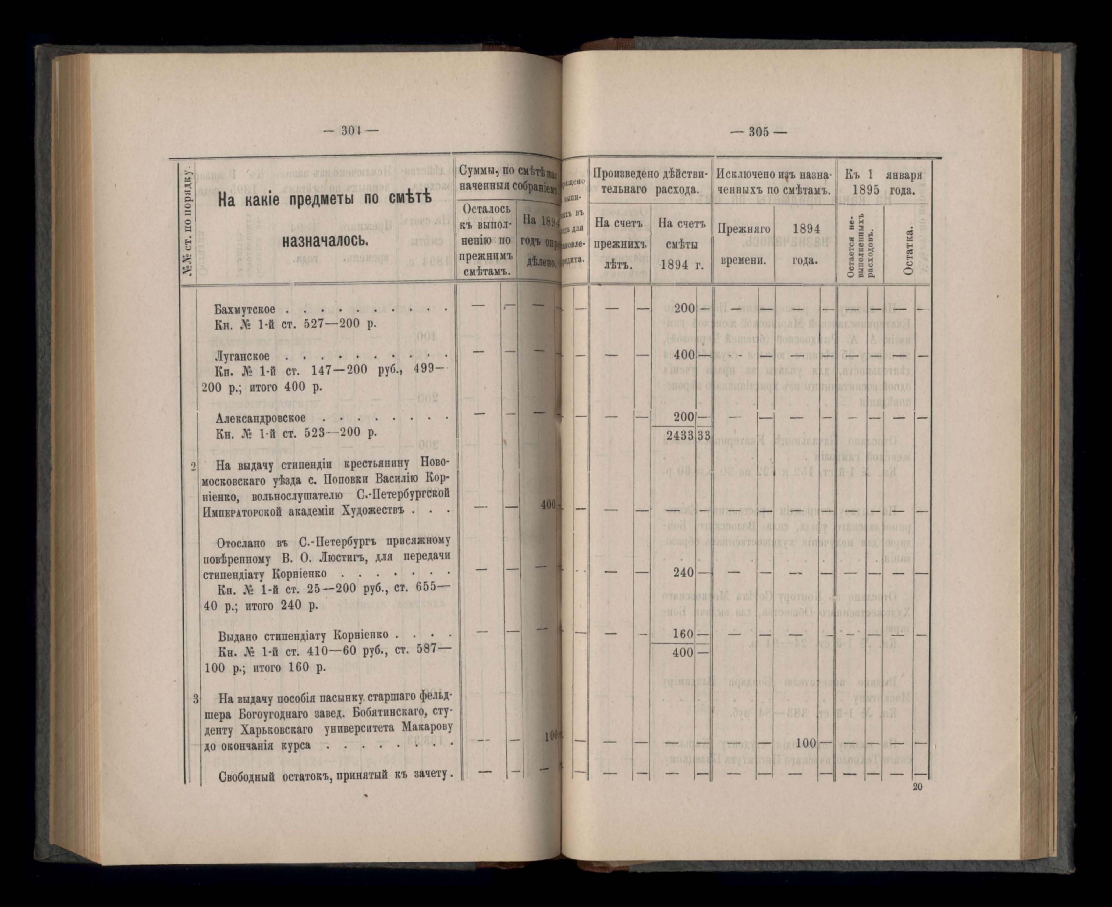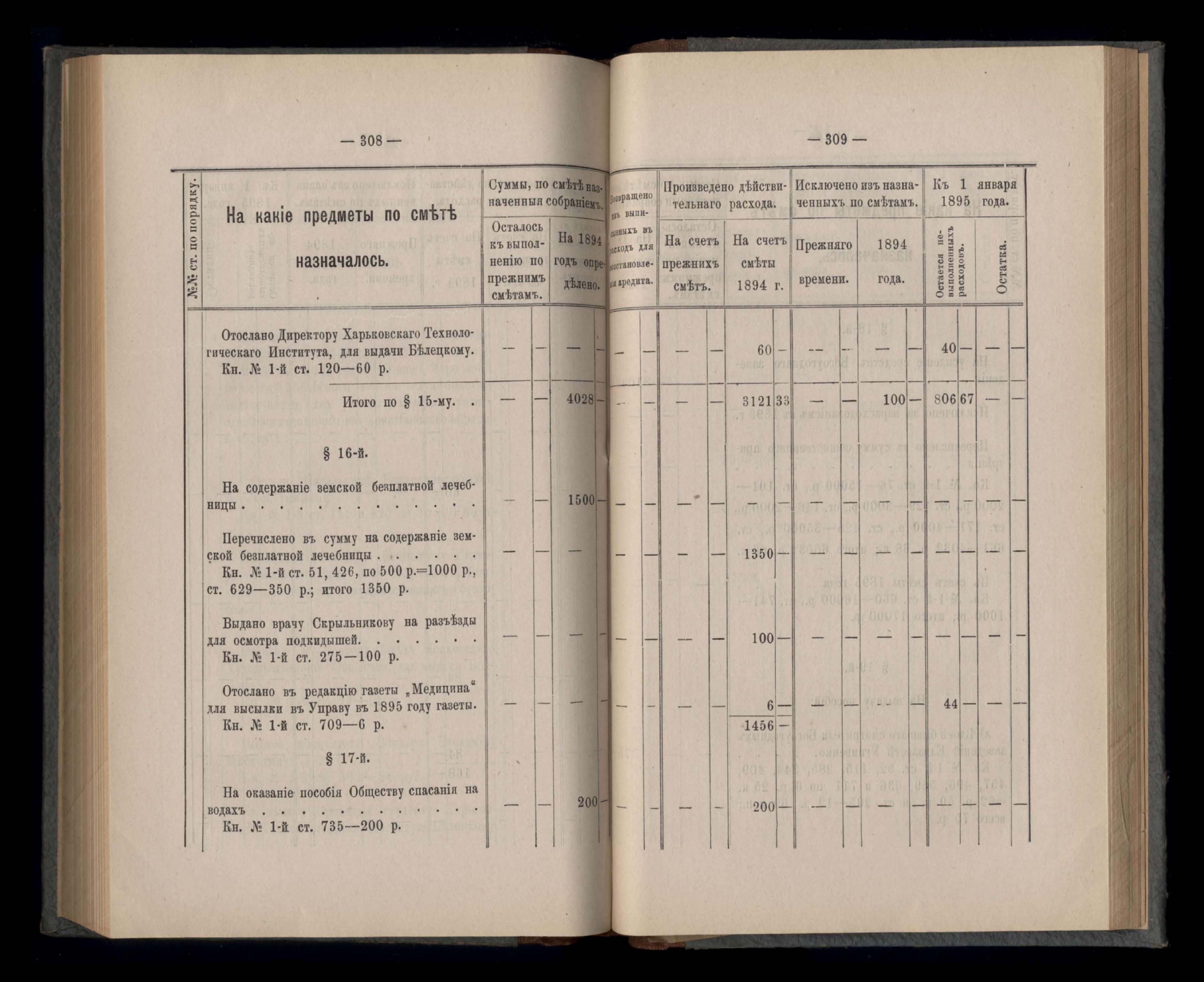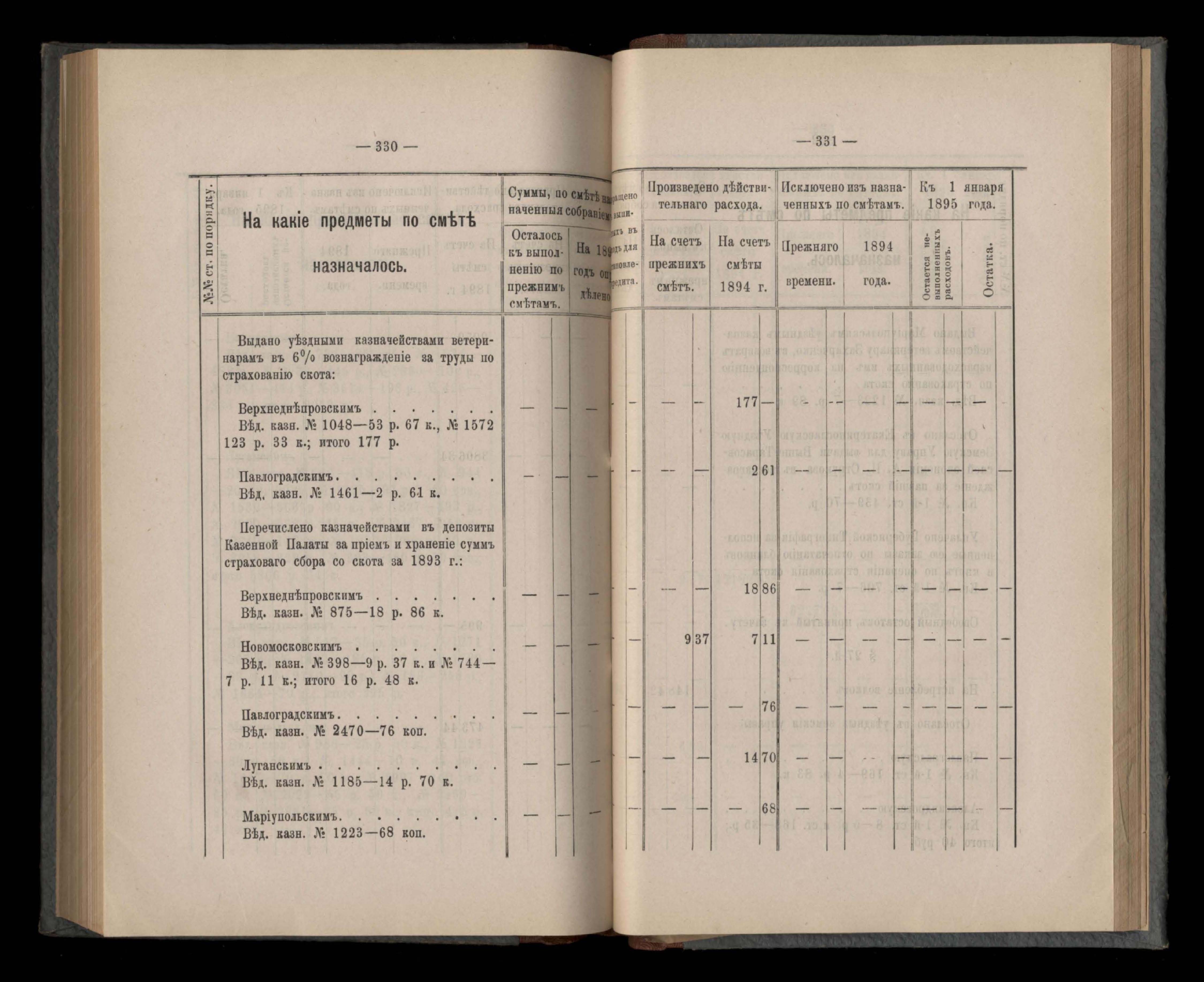 Въдомостъ Екатеринославской губернской земской управы о расходъ суммъ губернскаго земскаго сбора, ассигнованныхъ по смътъ за 1894 годъ