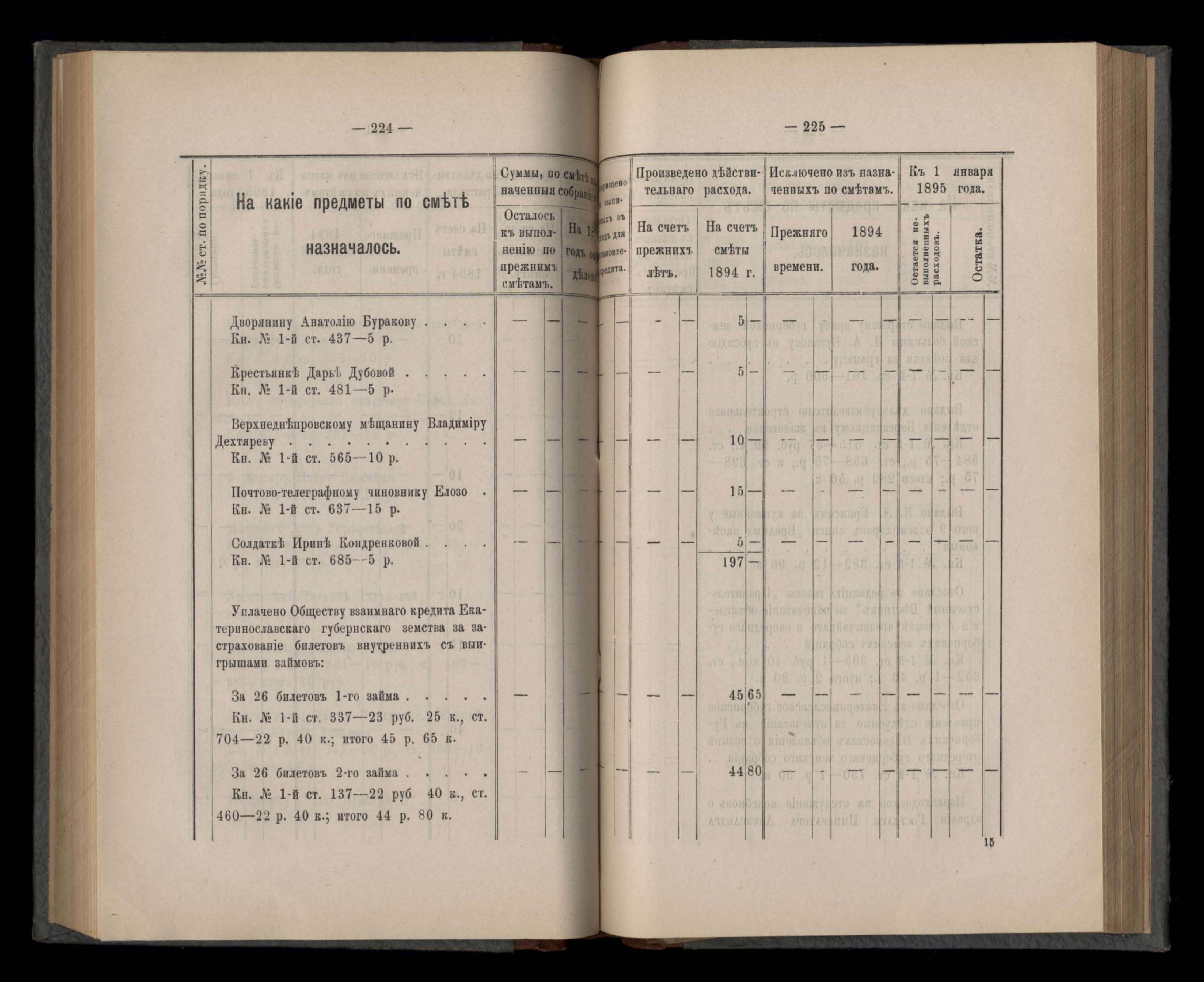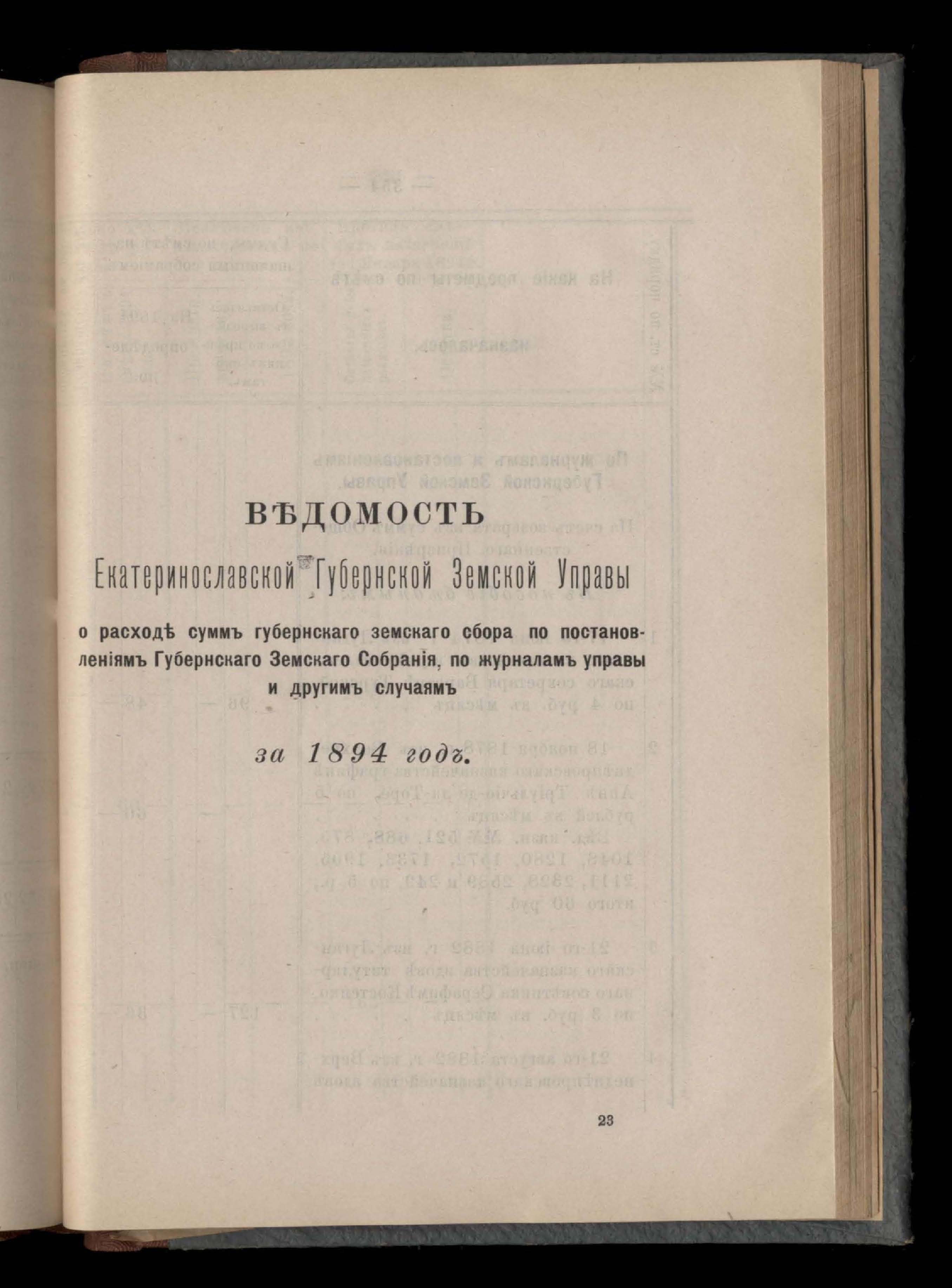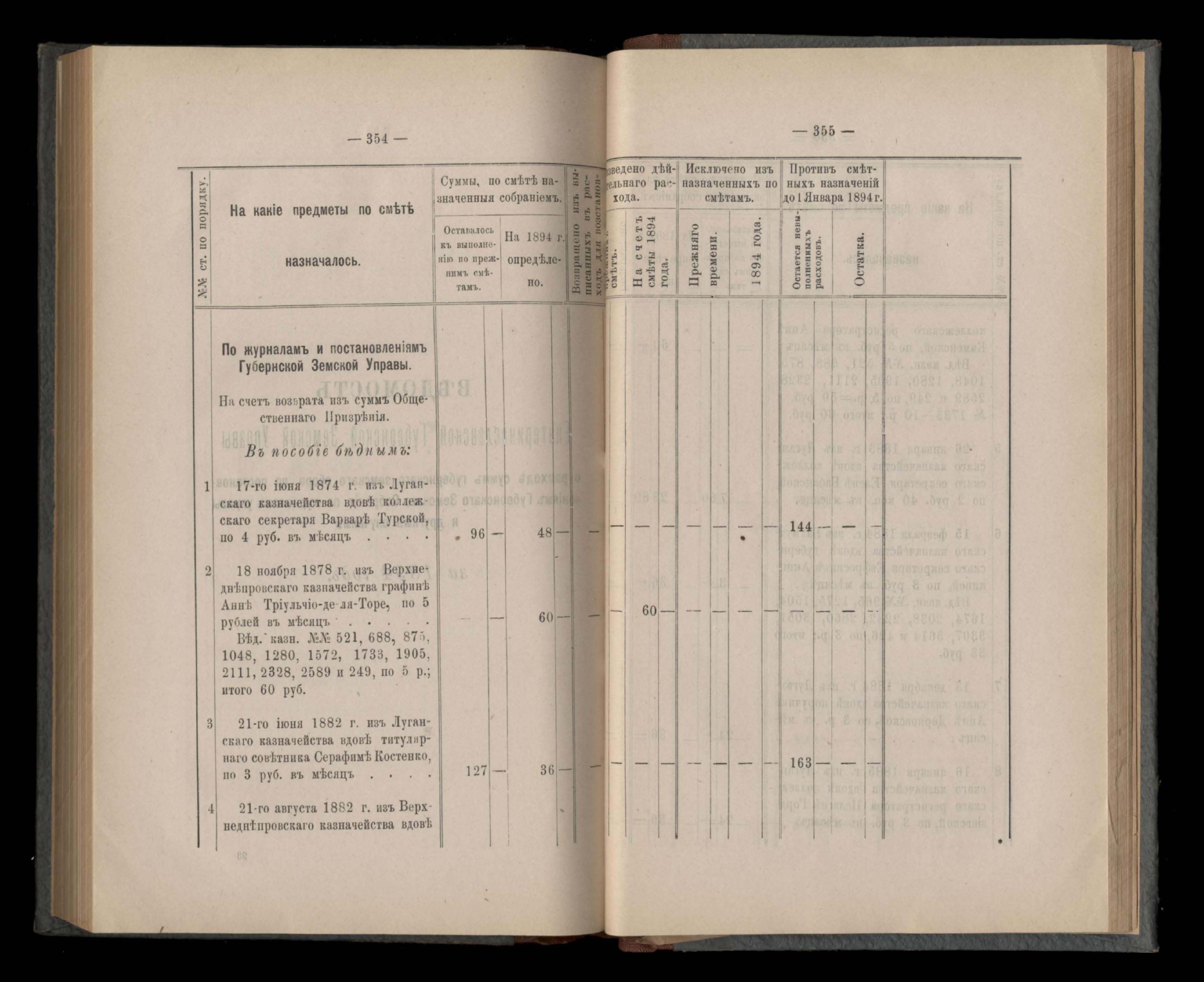 Въдомостъ Екатеринославской губернской земской управы о расходъ суммъ Губернскаго Земскаго Собранія по журналамъ управы и другимъ случаямъ за 1894 годъ