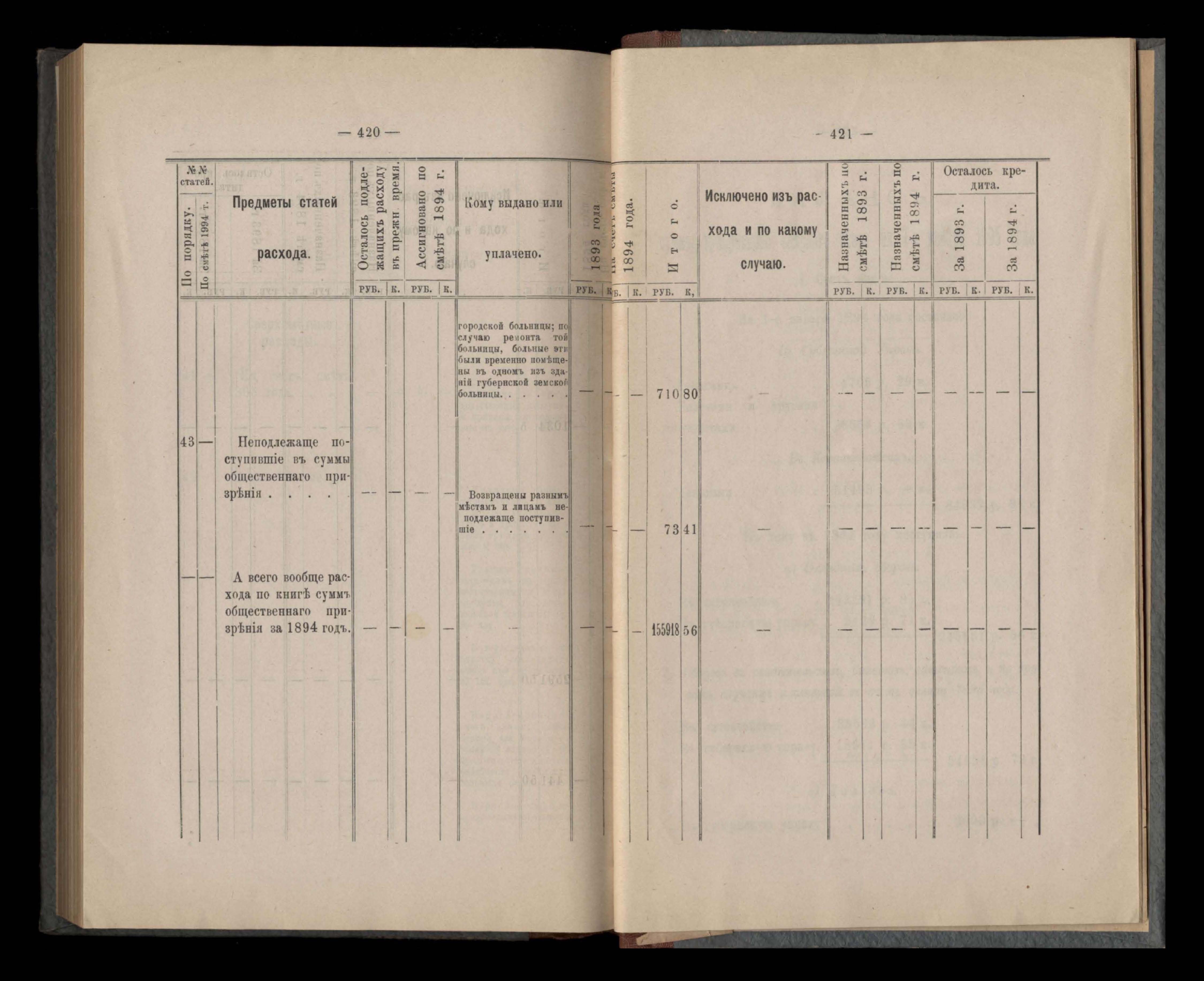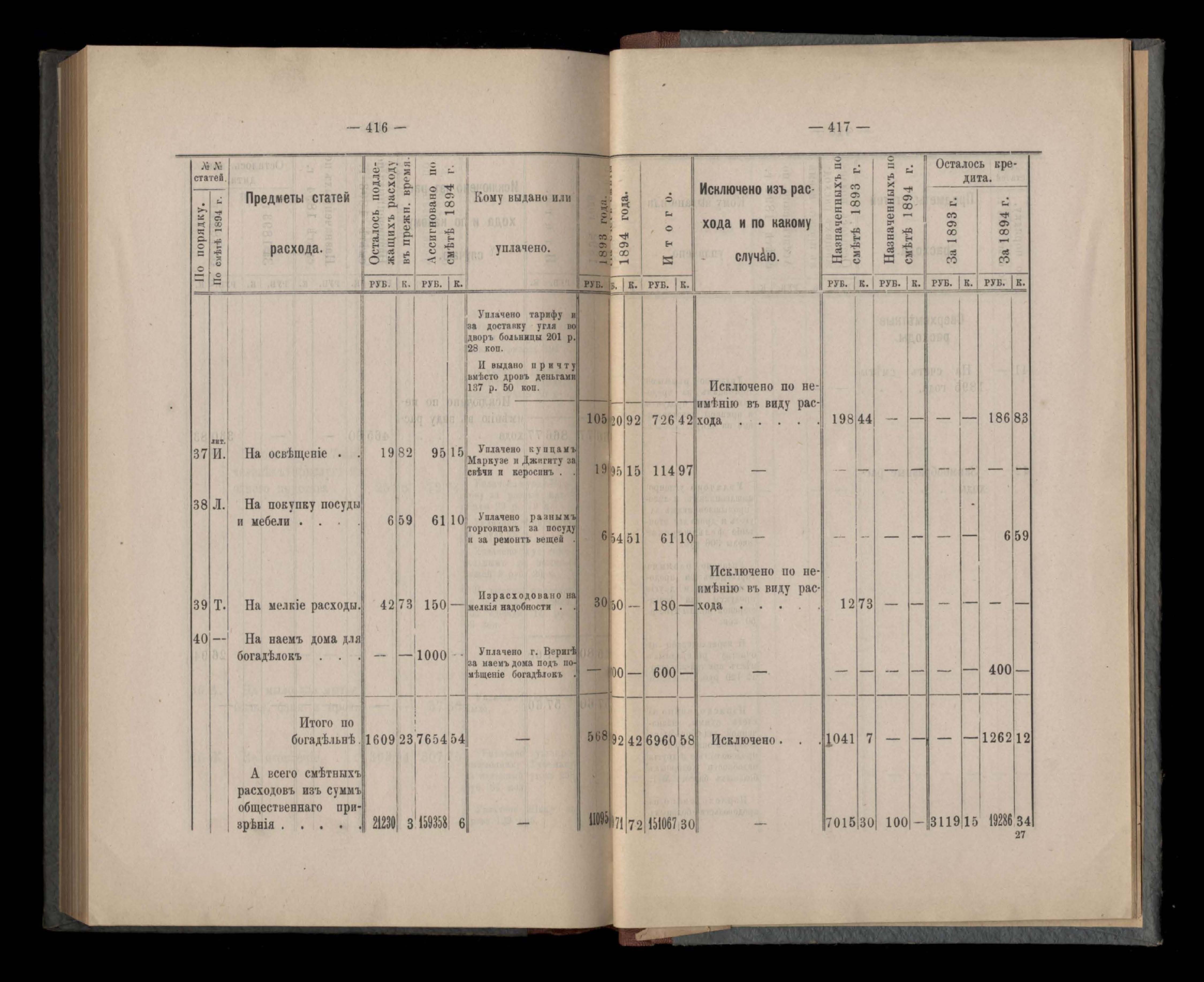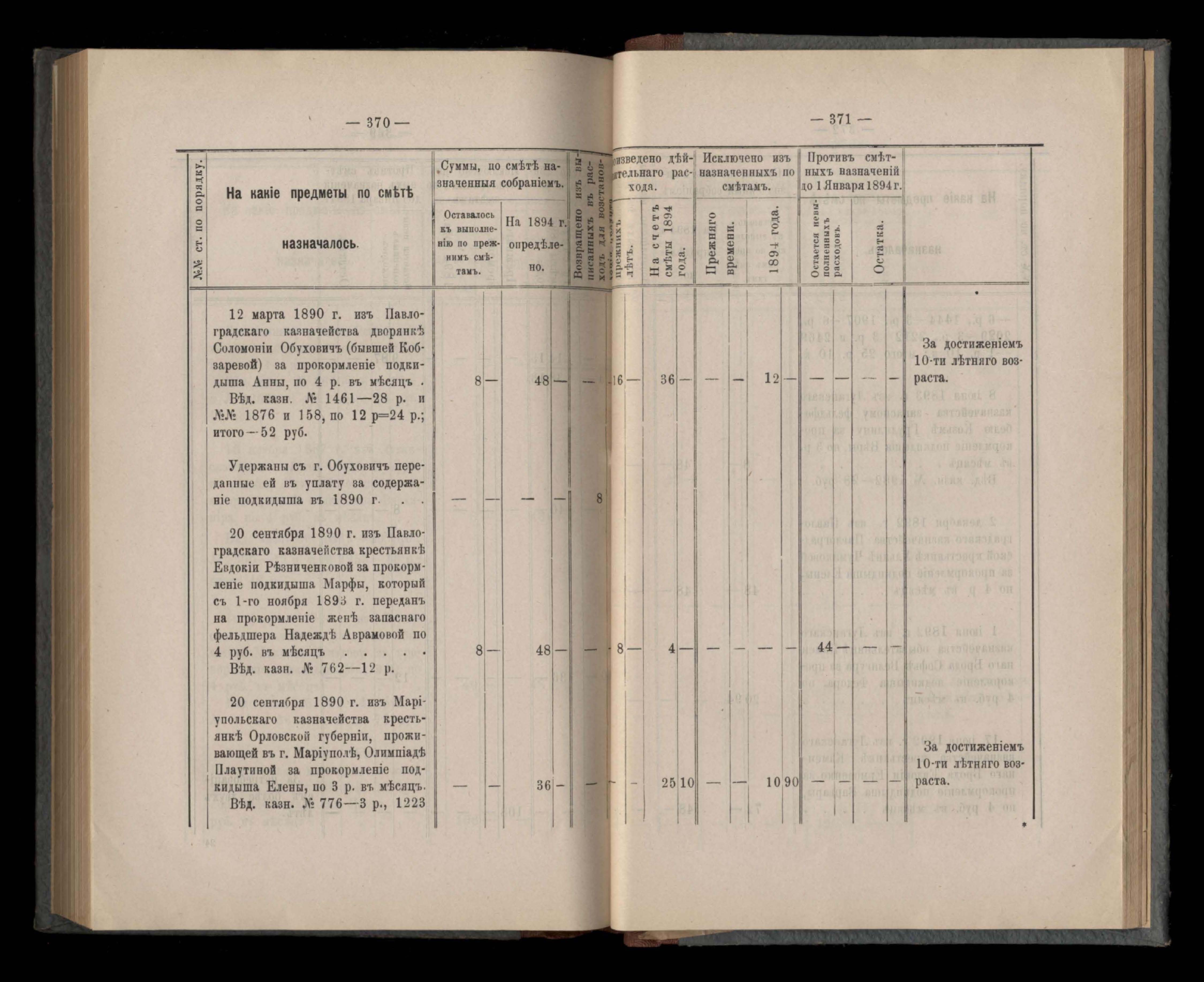 Въдомостъ Екатеринославской губернской земской управы о расходъ суммъ общественнаго призрънія за 1894 годъ