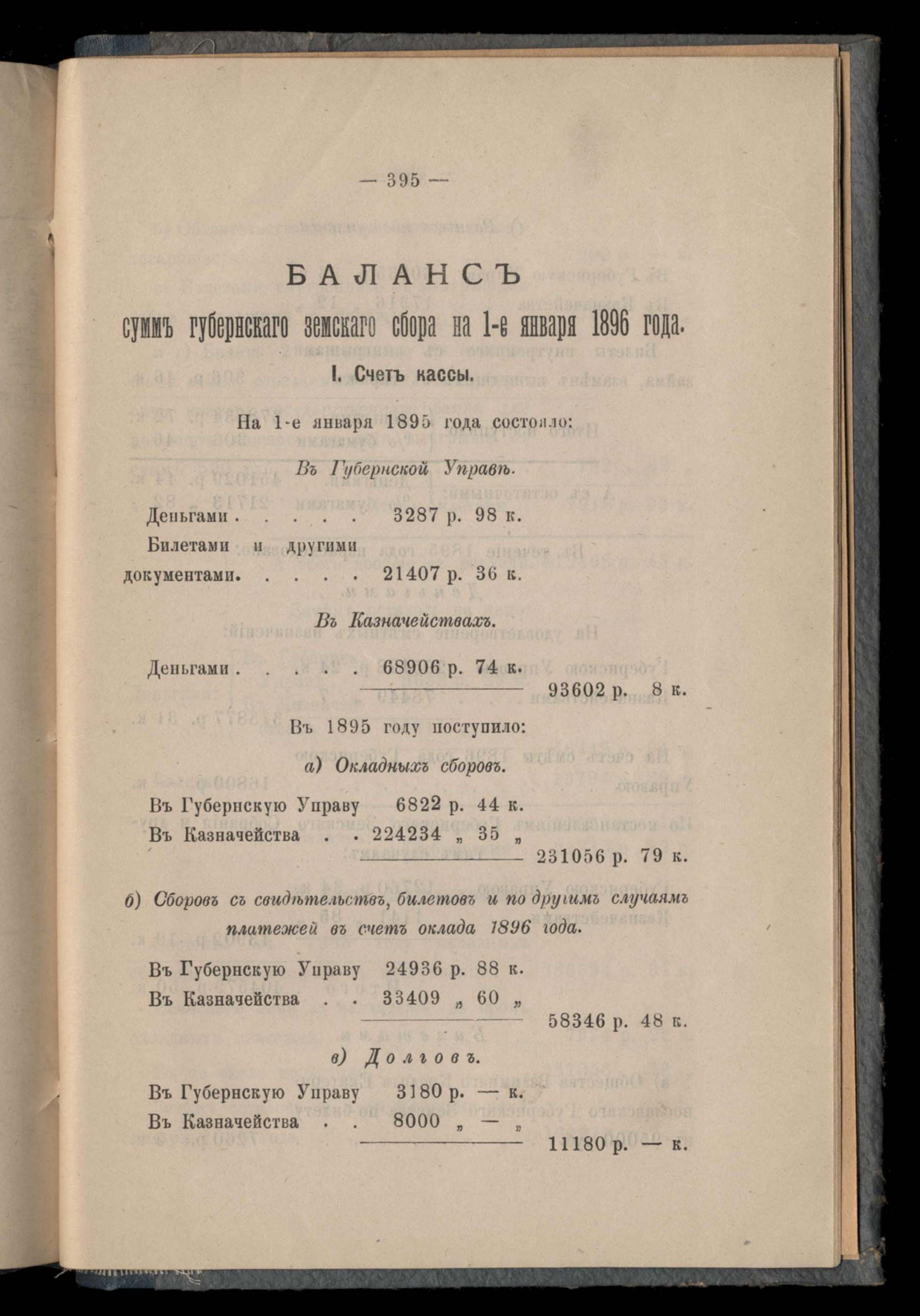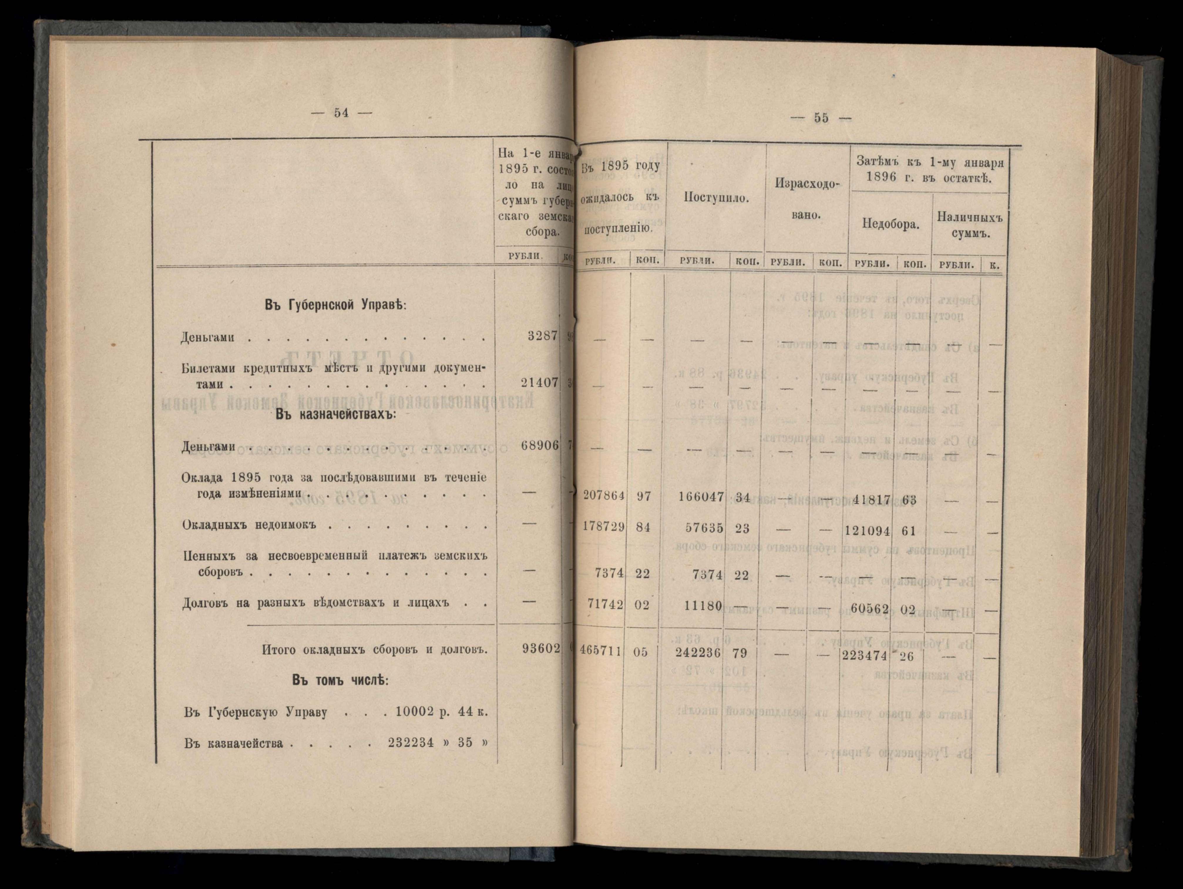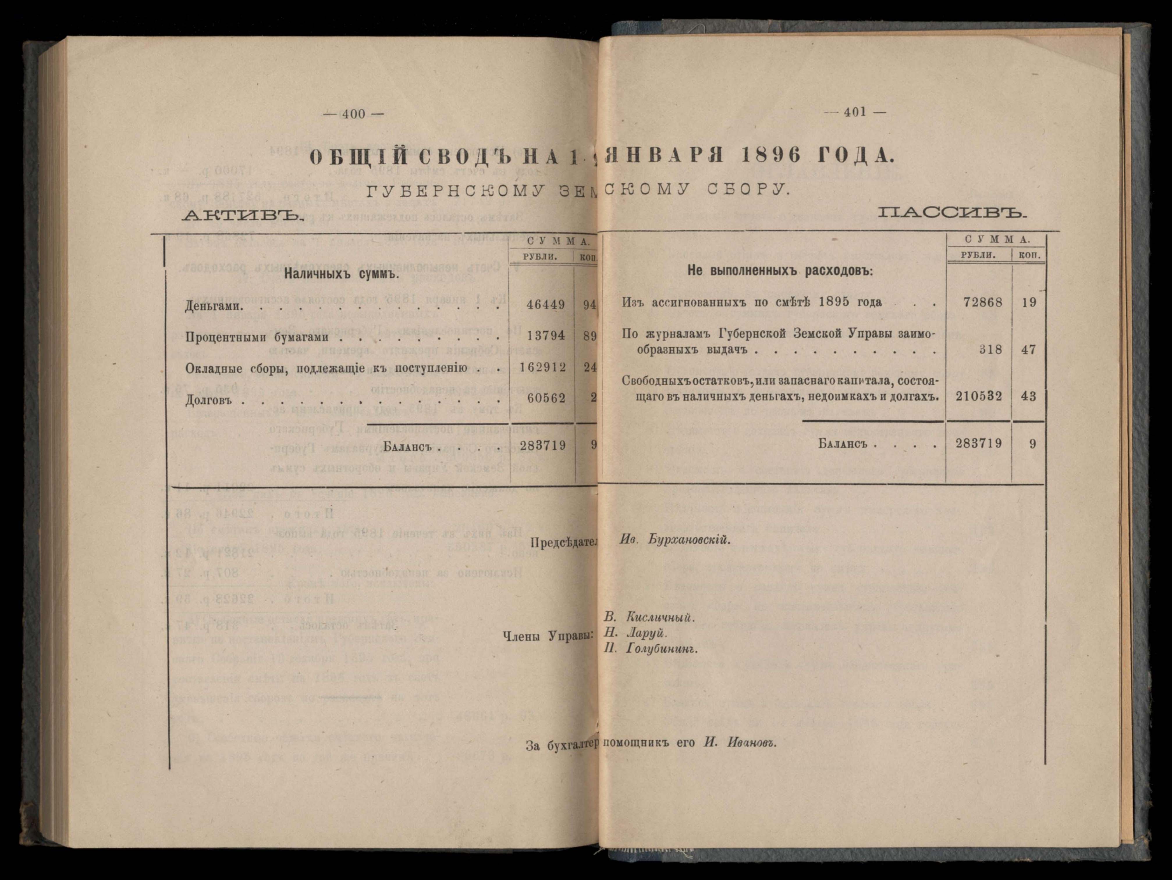 Балансъ суммъ губернскаго земскаго сбора на 1-е января 1896 года