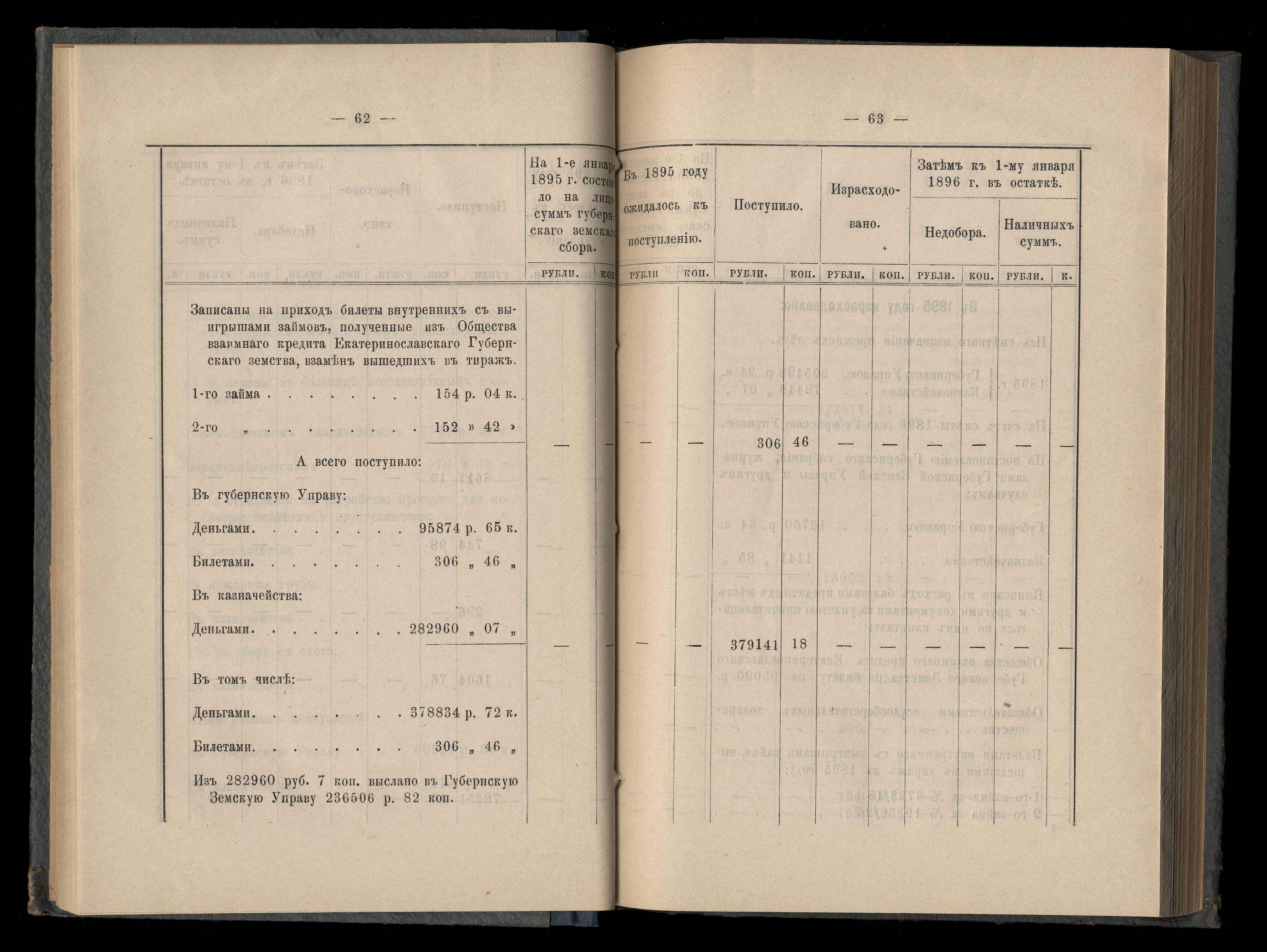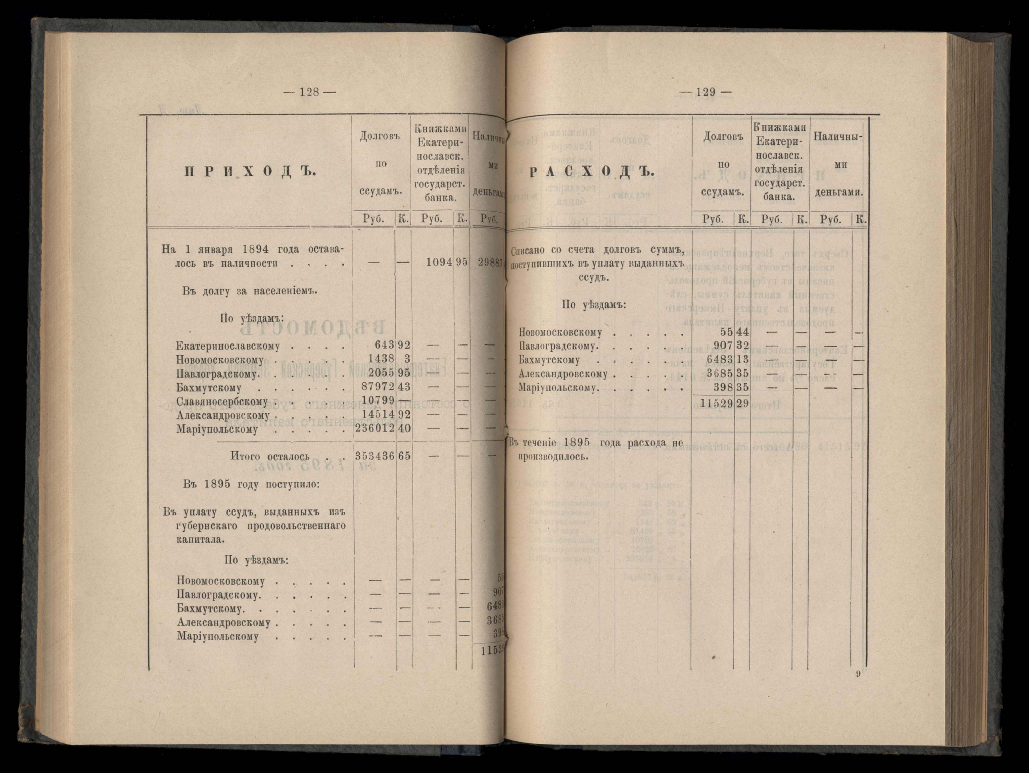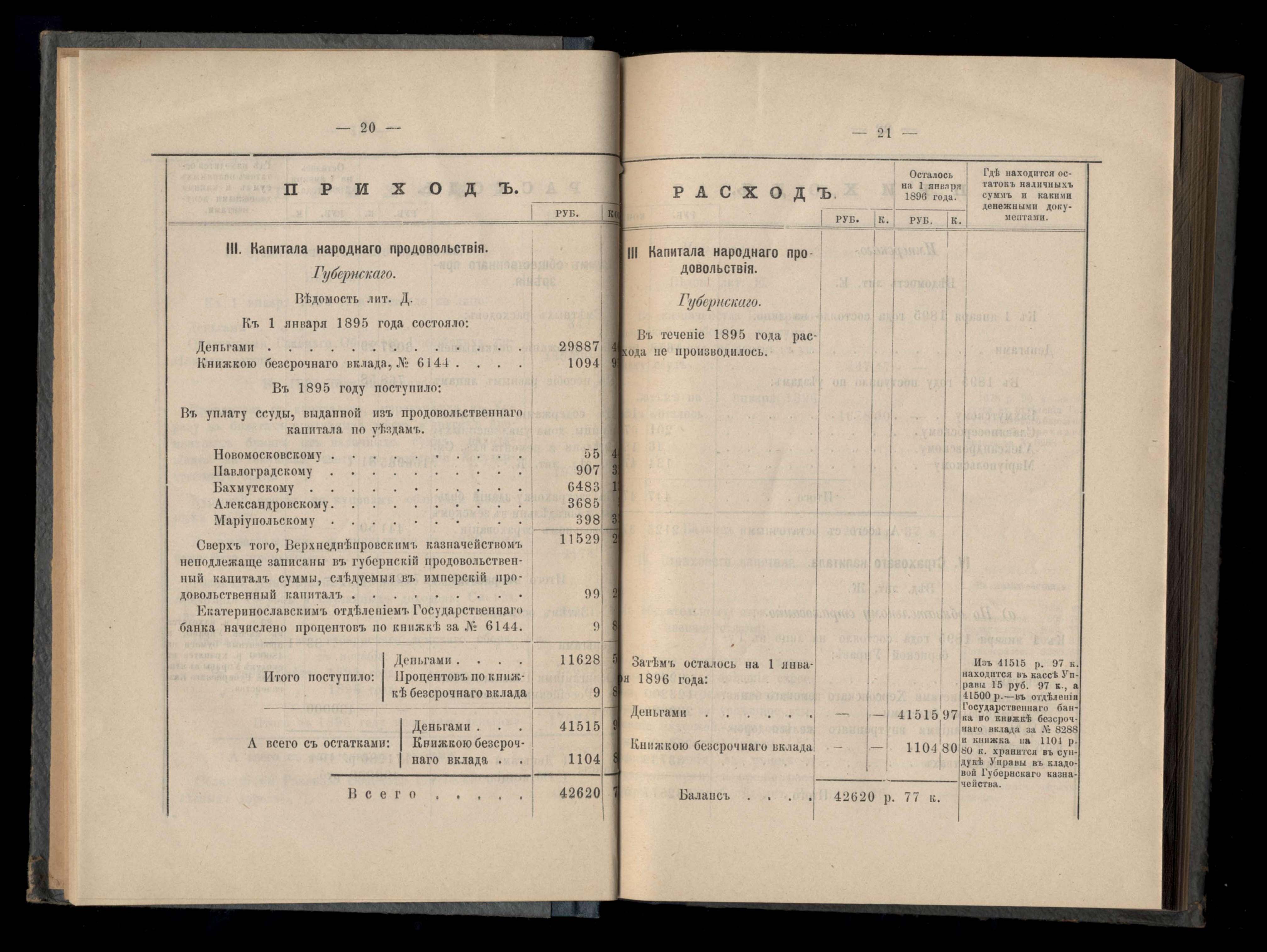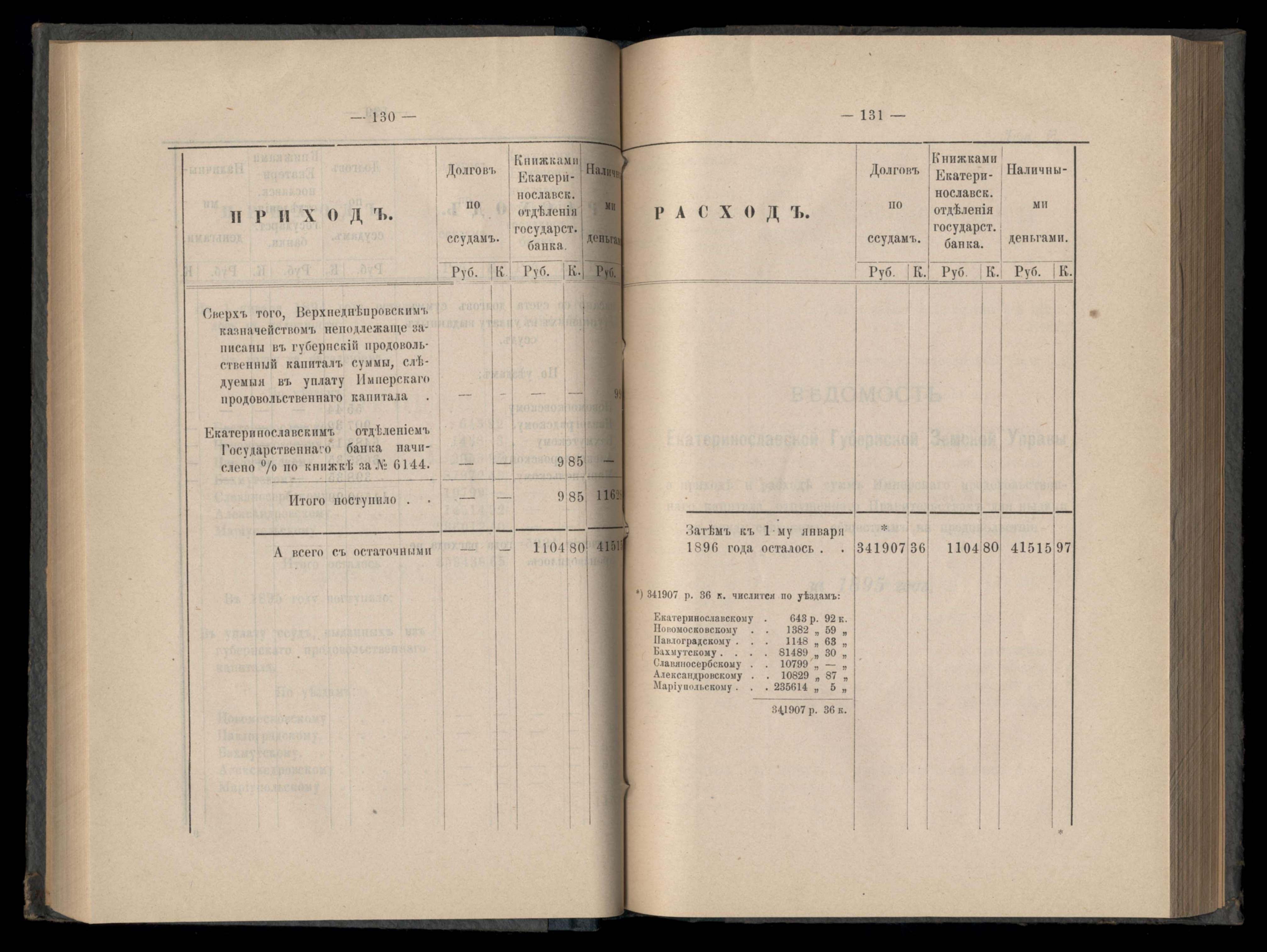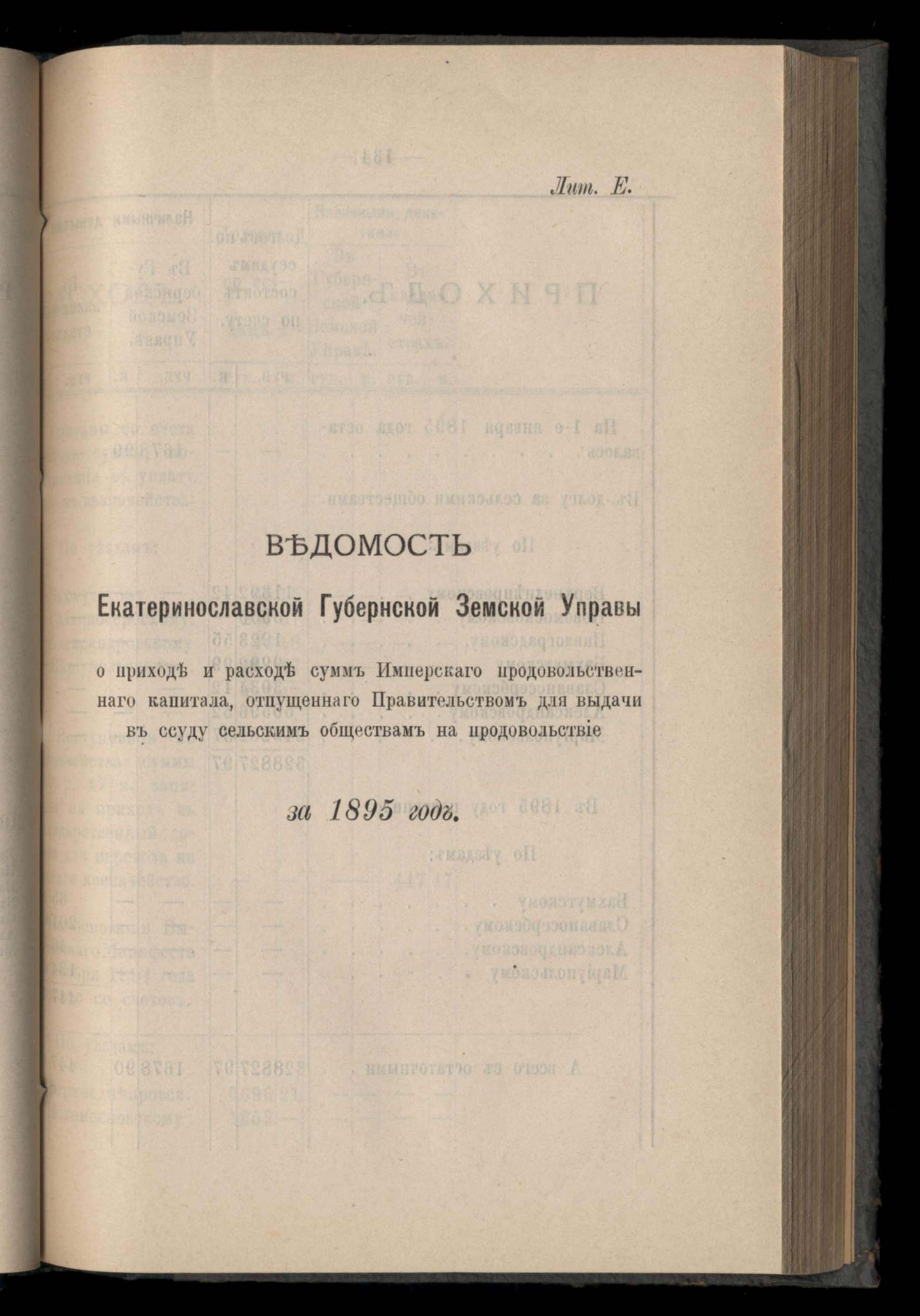 Ведомость Екатеринославской Губернской Земской Управы о приходе и расходе суммъ Имперскаго продовольственнаго капитала, отпущеннаго Правительствомъ для выдачи въ ссуду сельскимъ обществамъ на продовольствіе за 1895 годъ