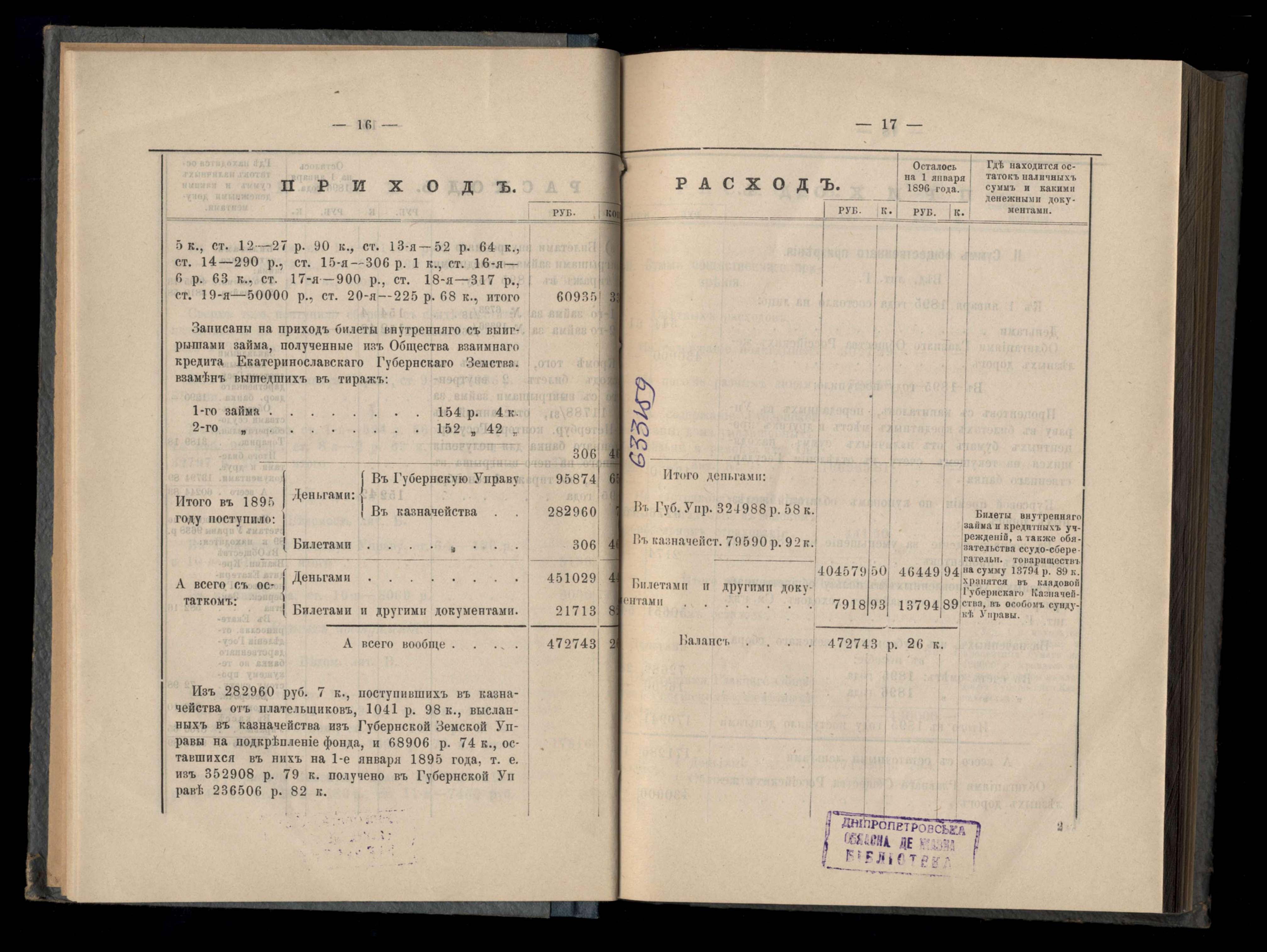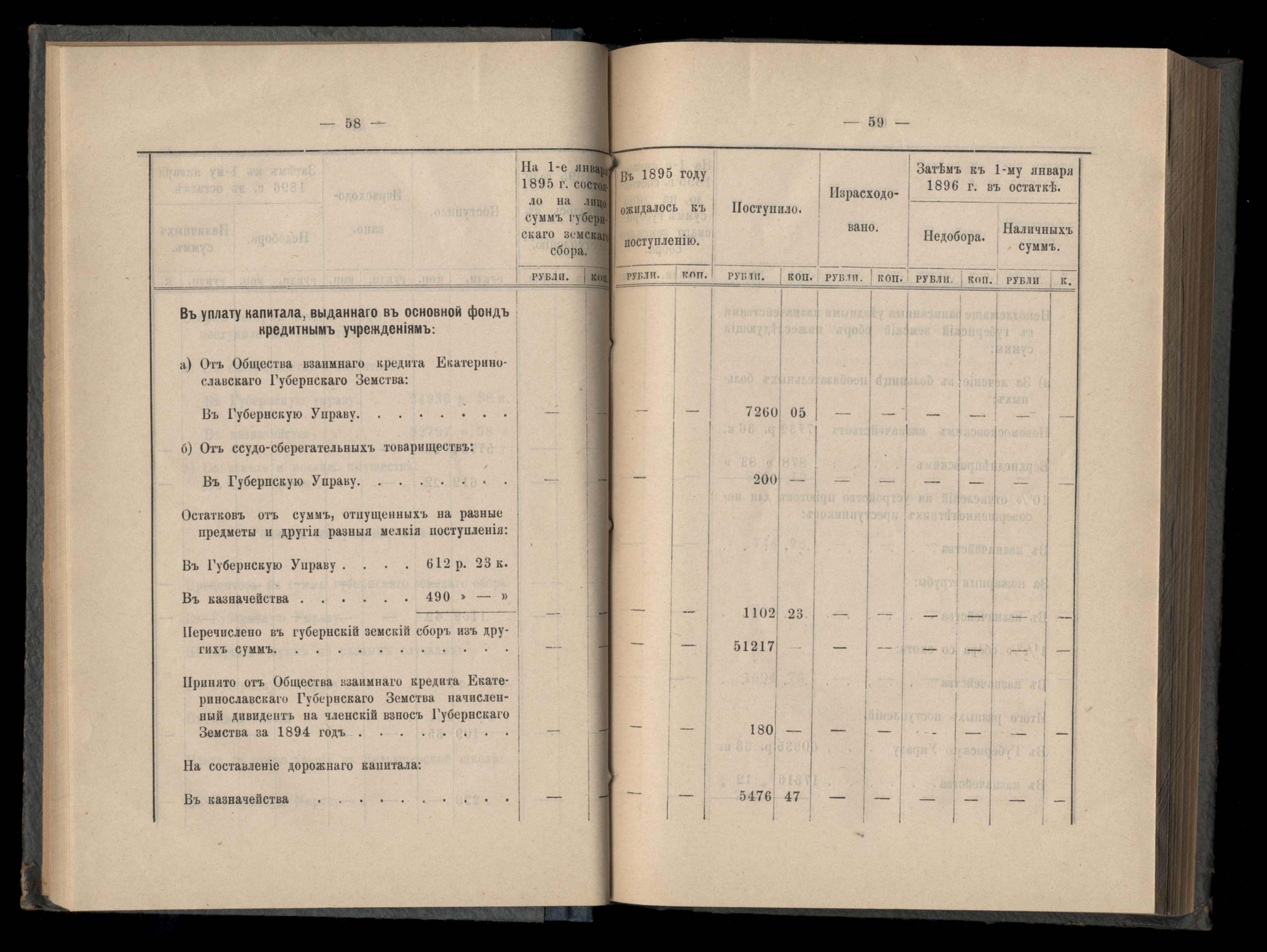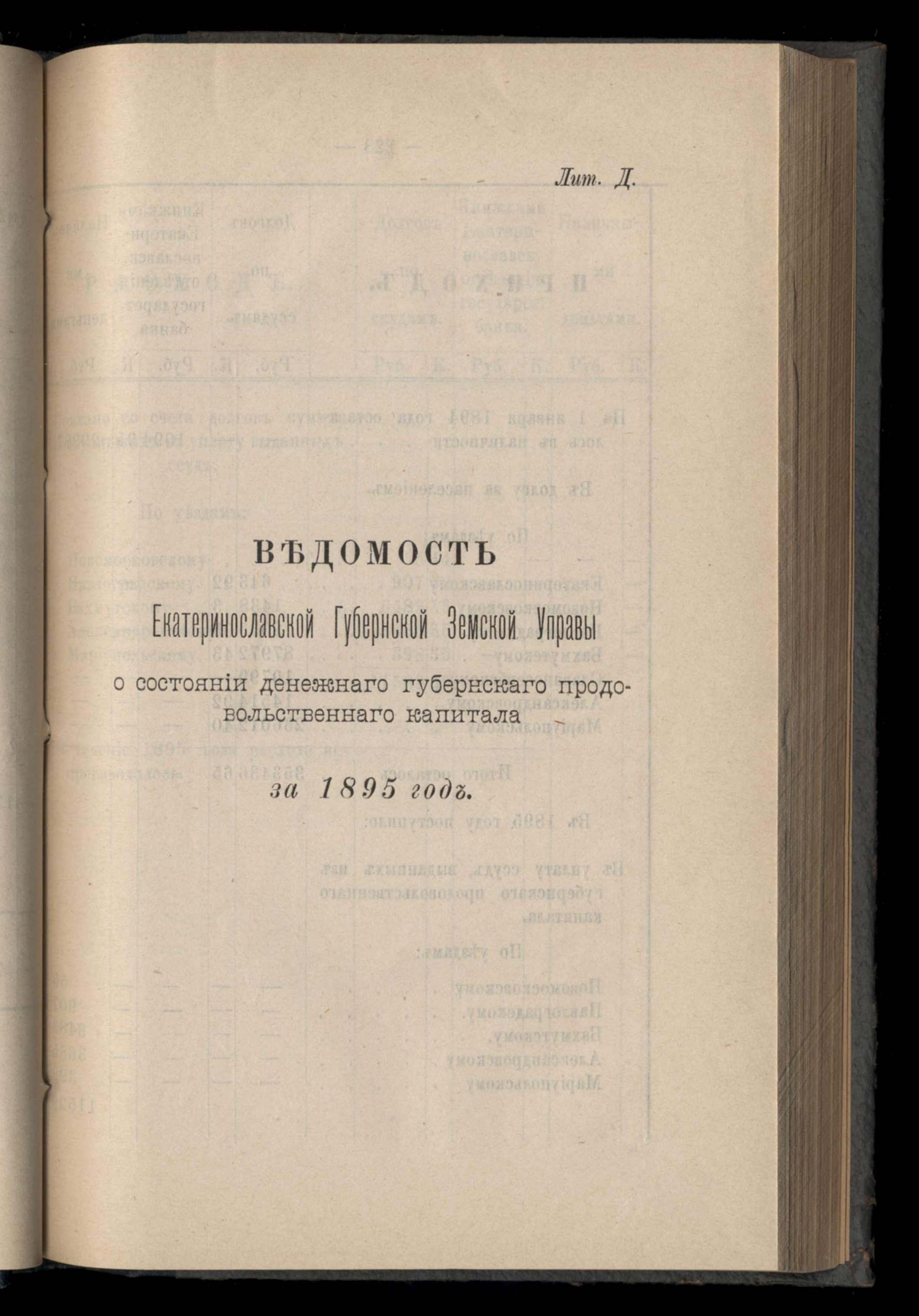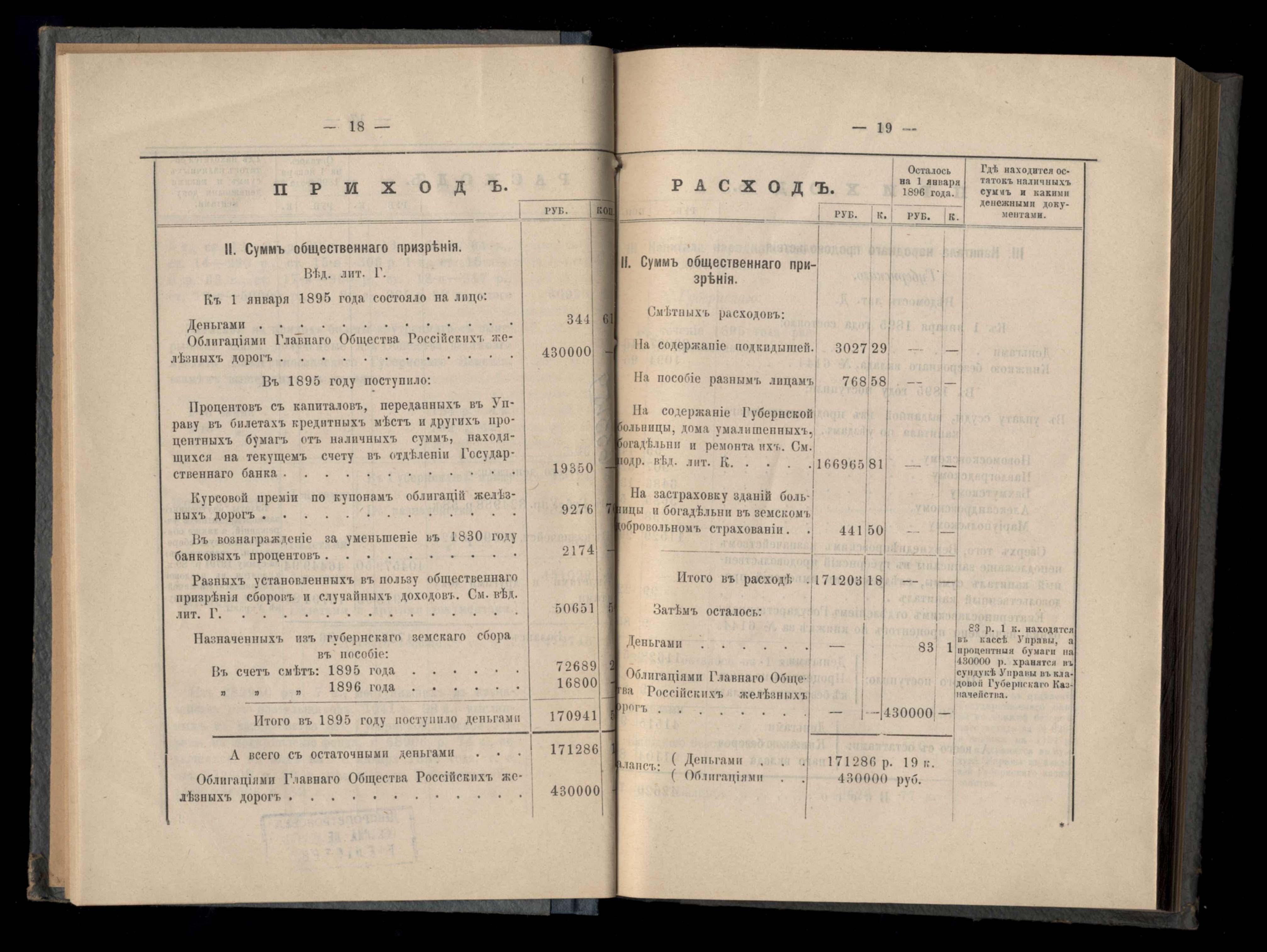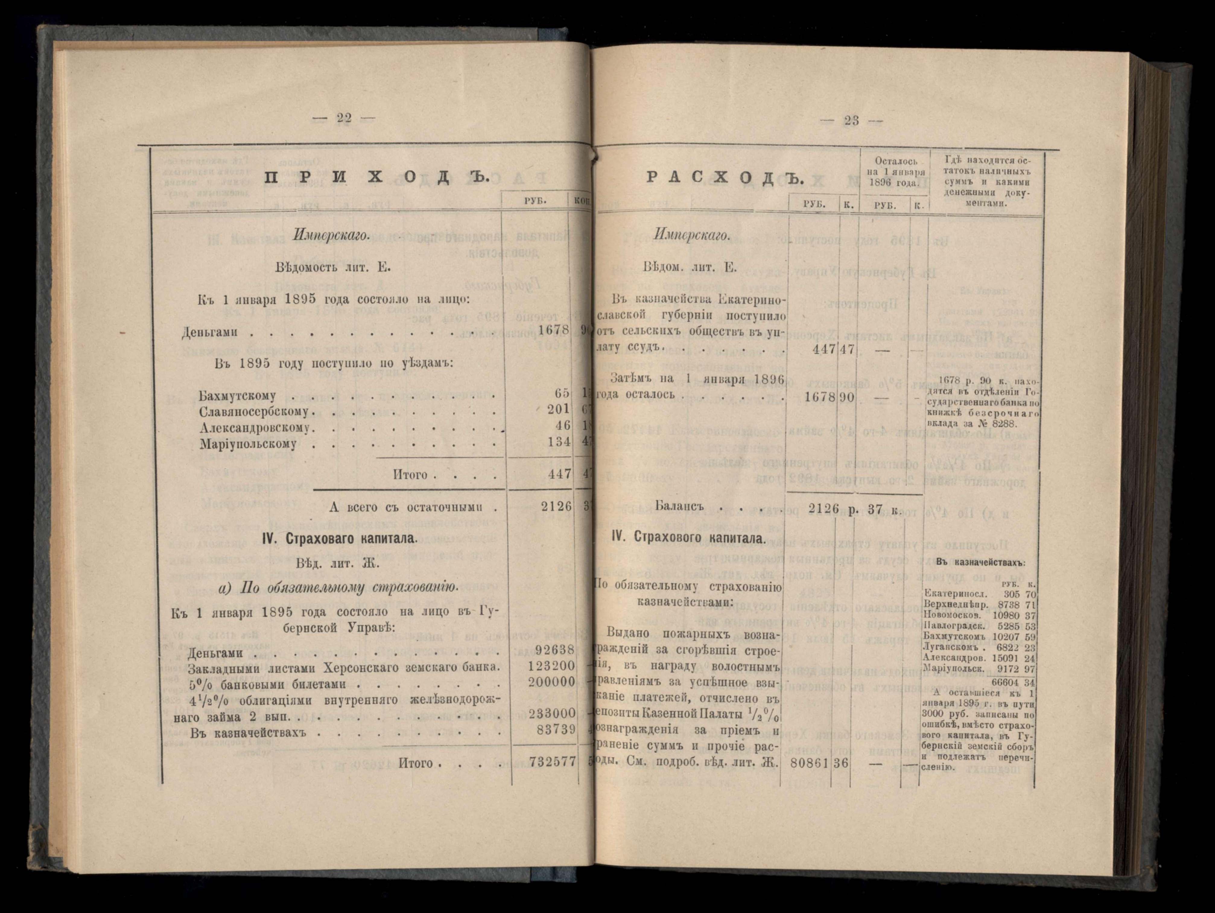 Ведомость Екатеринославской Губернской Земской Управы о приходе и расходе суммъ Имперскаго продовольственнаго капитала, отпущеннаго Правительствомъ для выдачи въ ссуду сельскимъ обществамъ на продовольствіе за 1895 годъ