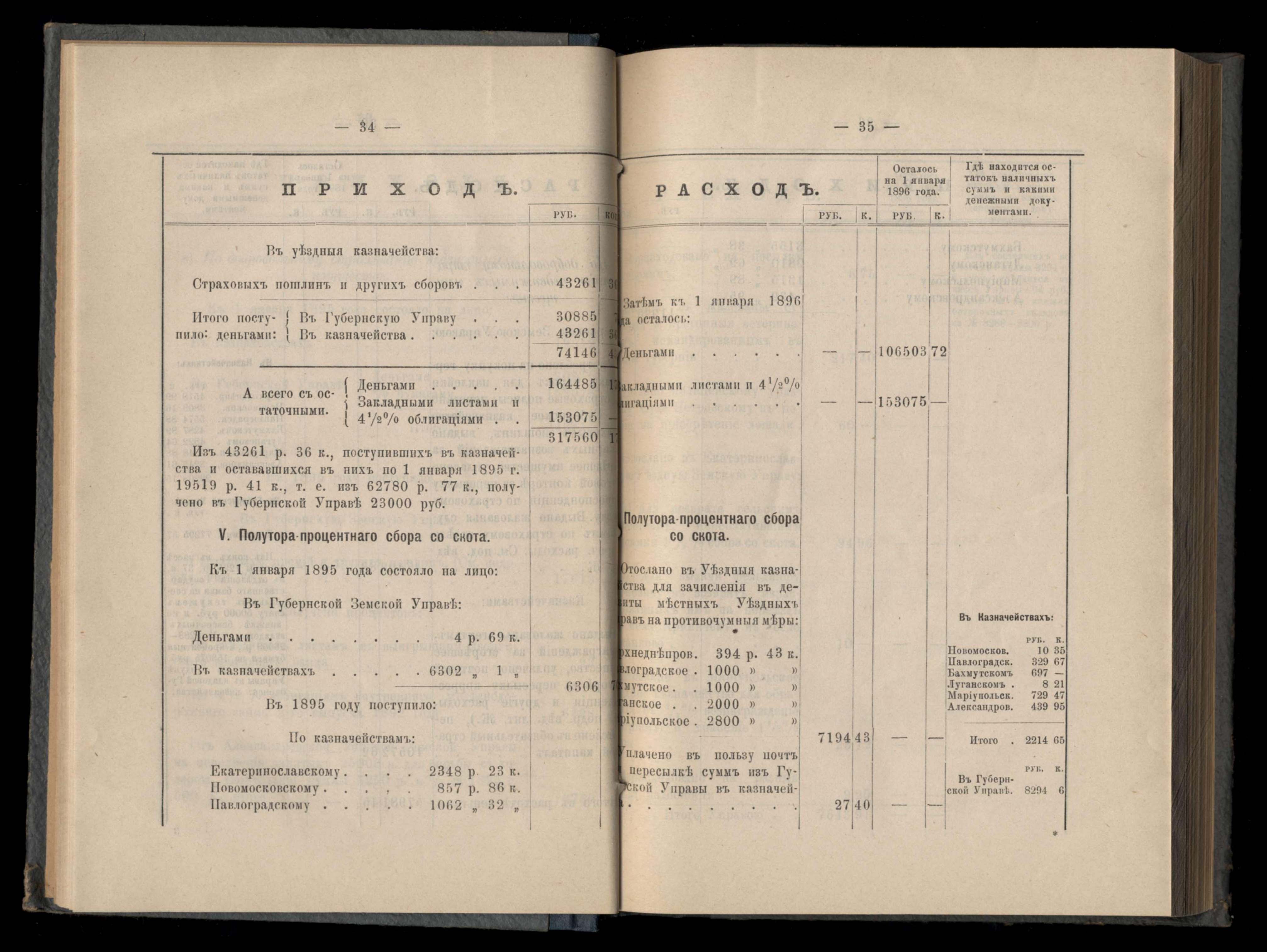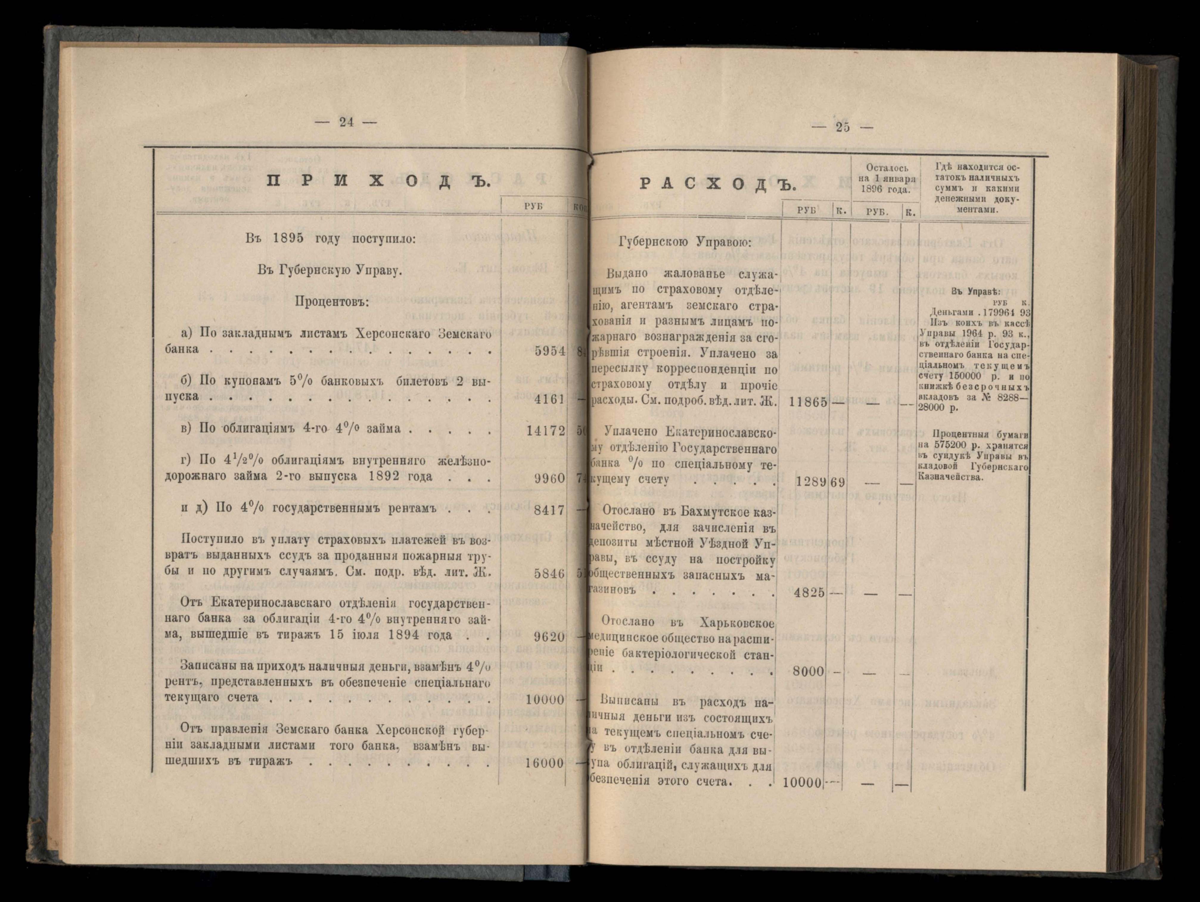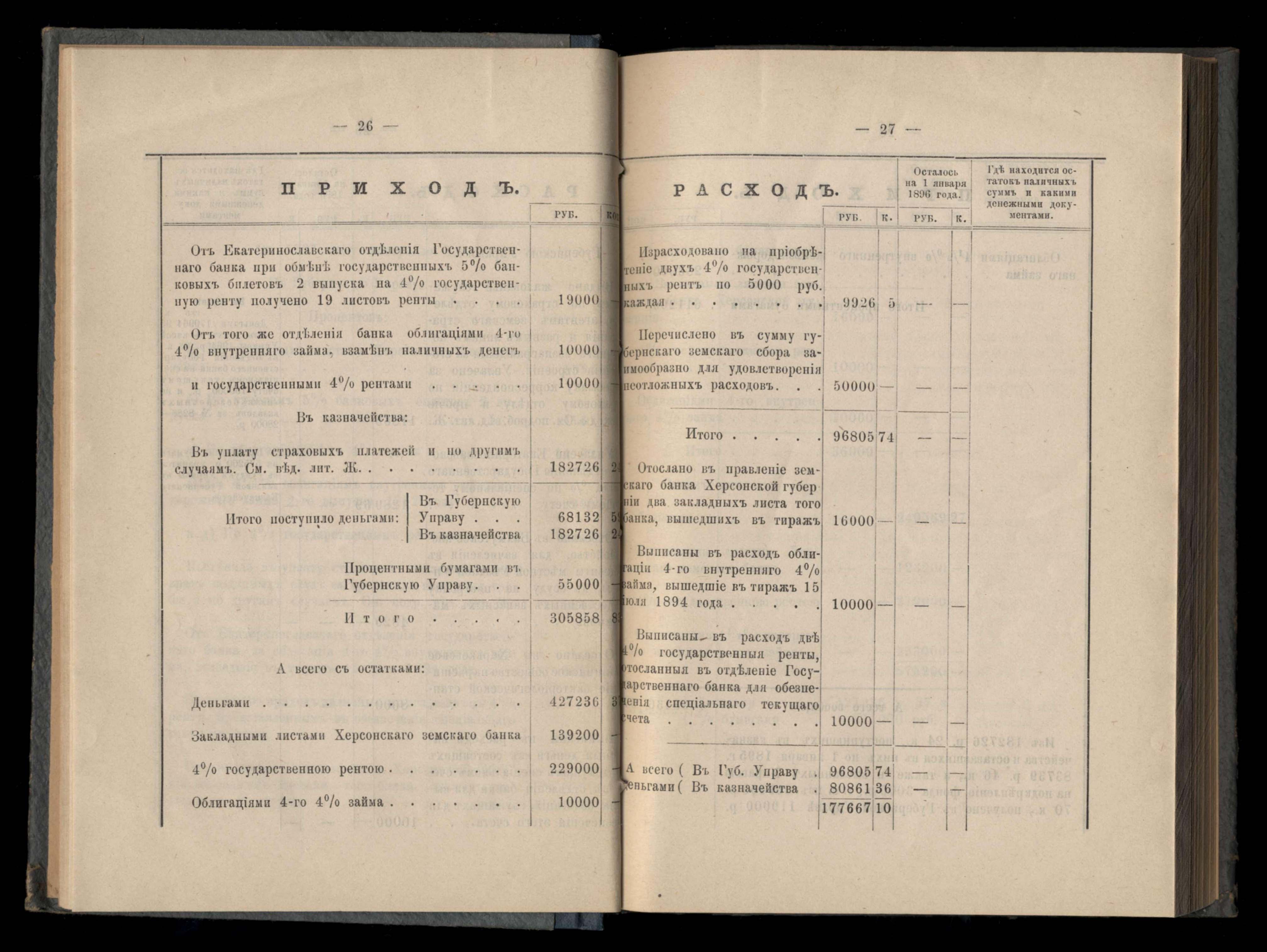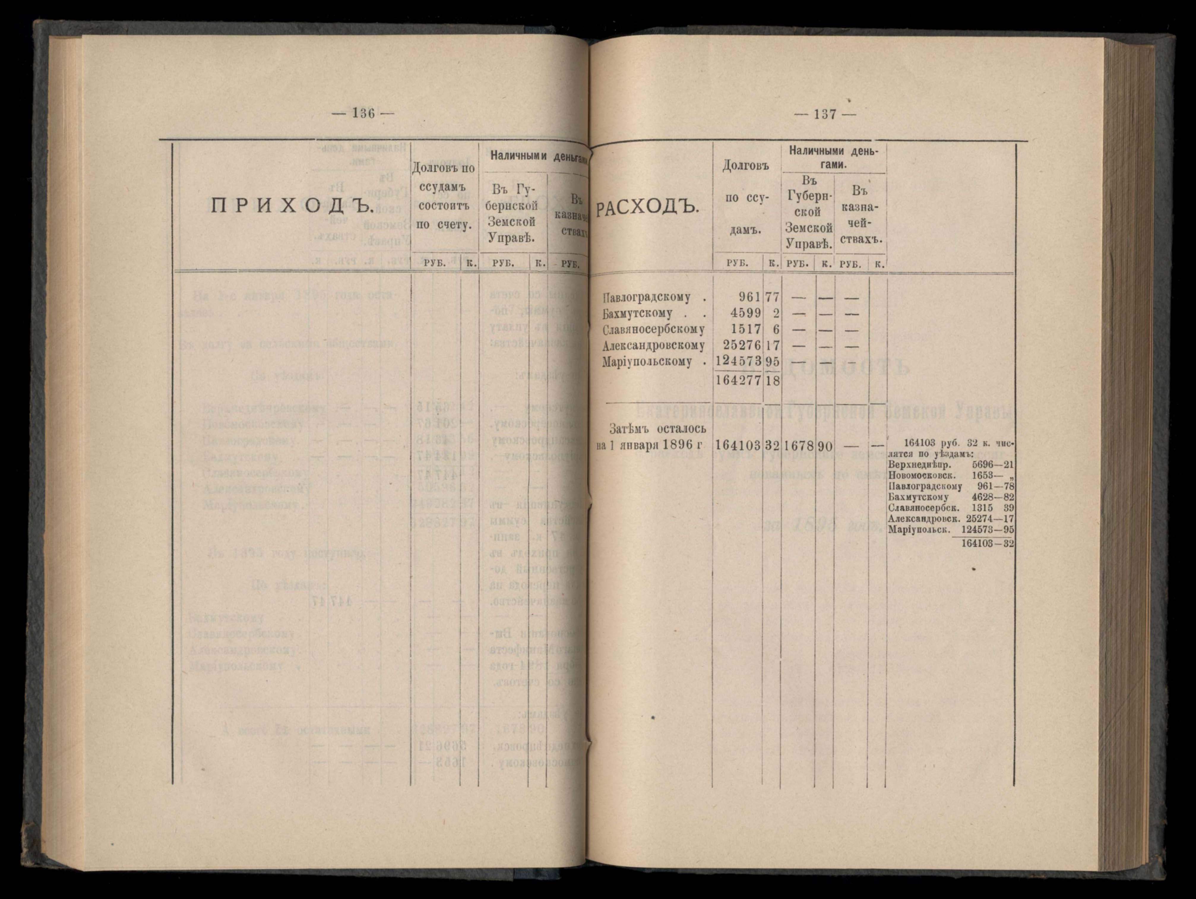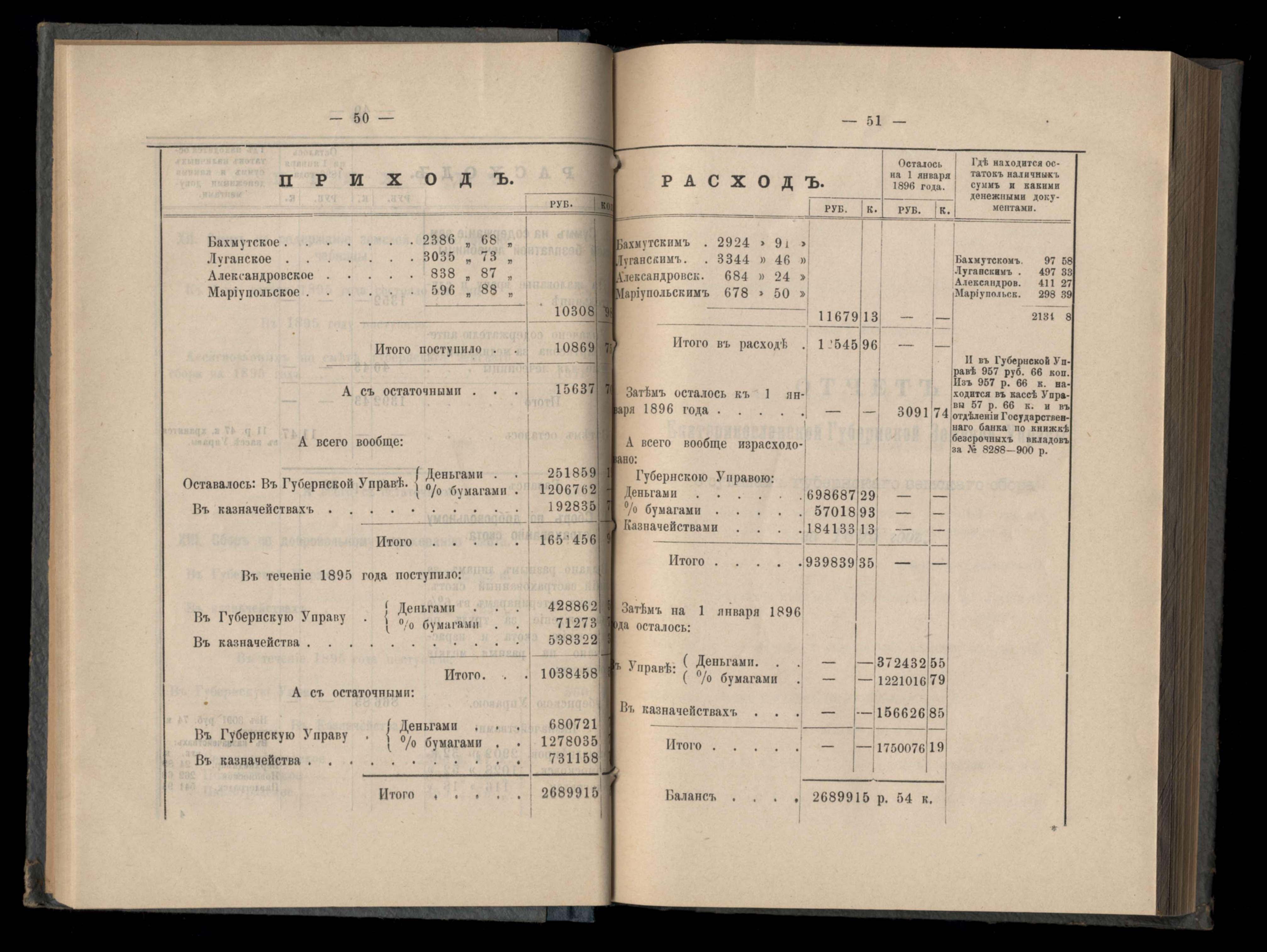 Ведомость Екатеринославской Губернской Земской Управы о приходе и расходе суммъ Имперскаго продовольственнаго капитала, отпущеннаго Правительствомъ для выдачи въ ссуду сельскимъ обществамъ на продовольствіе за 1895 годъ