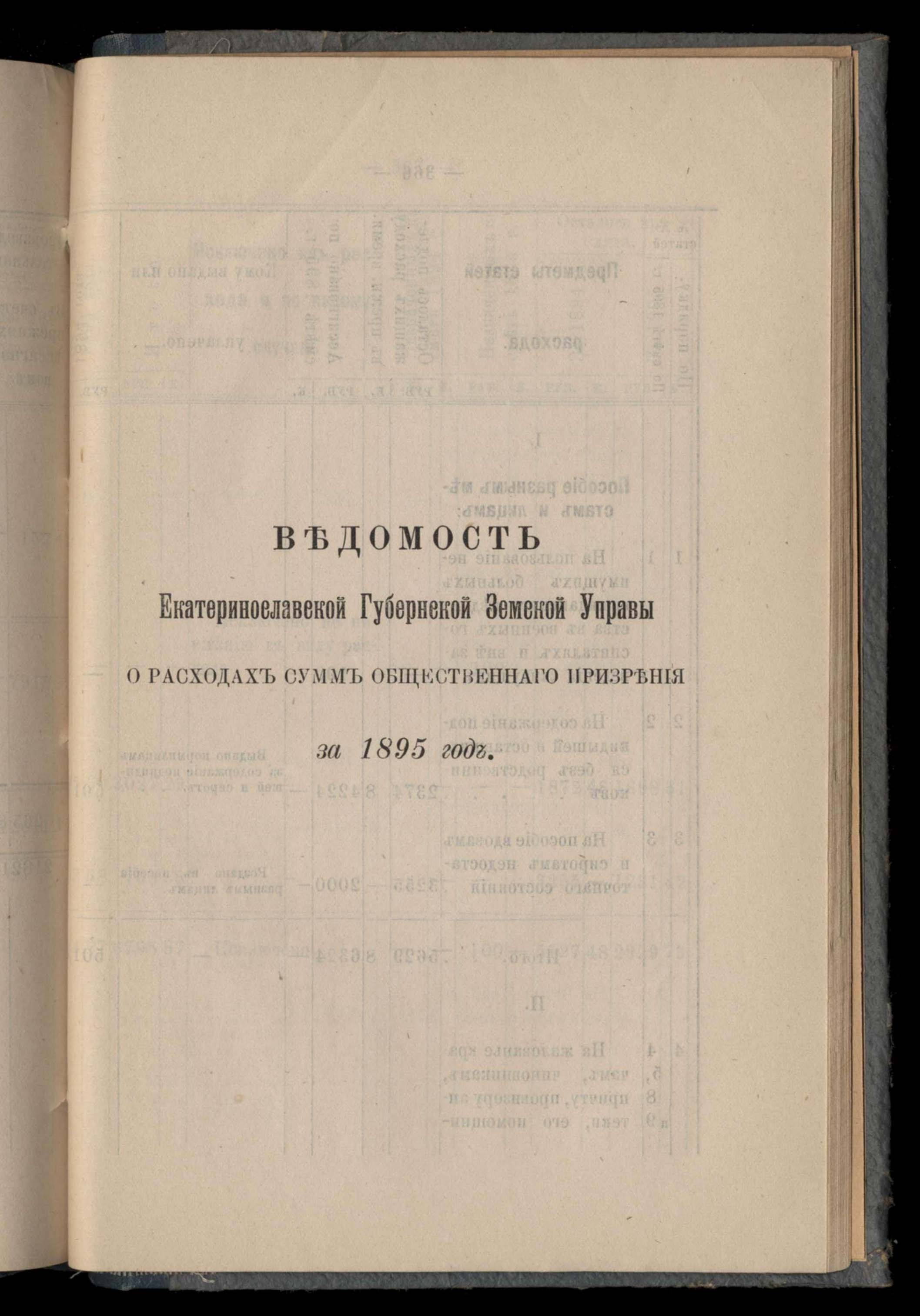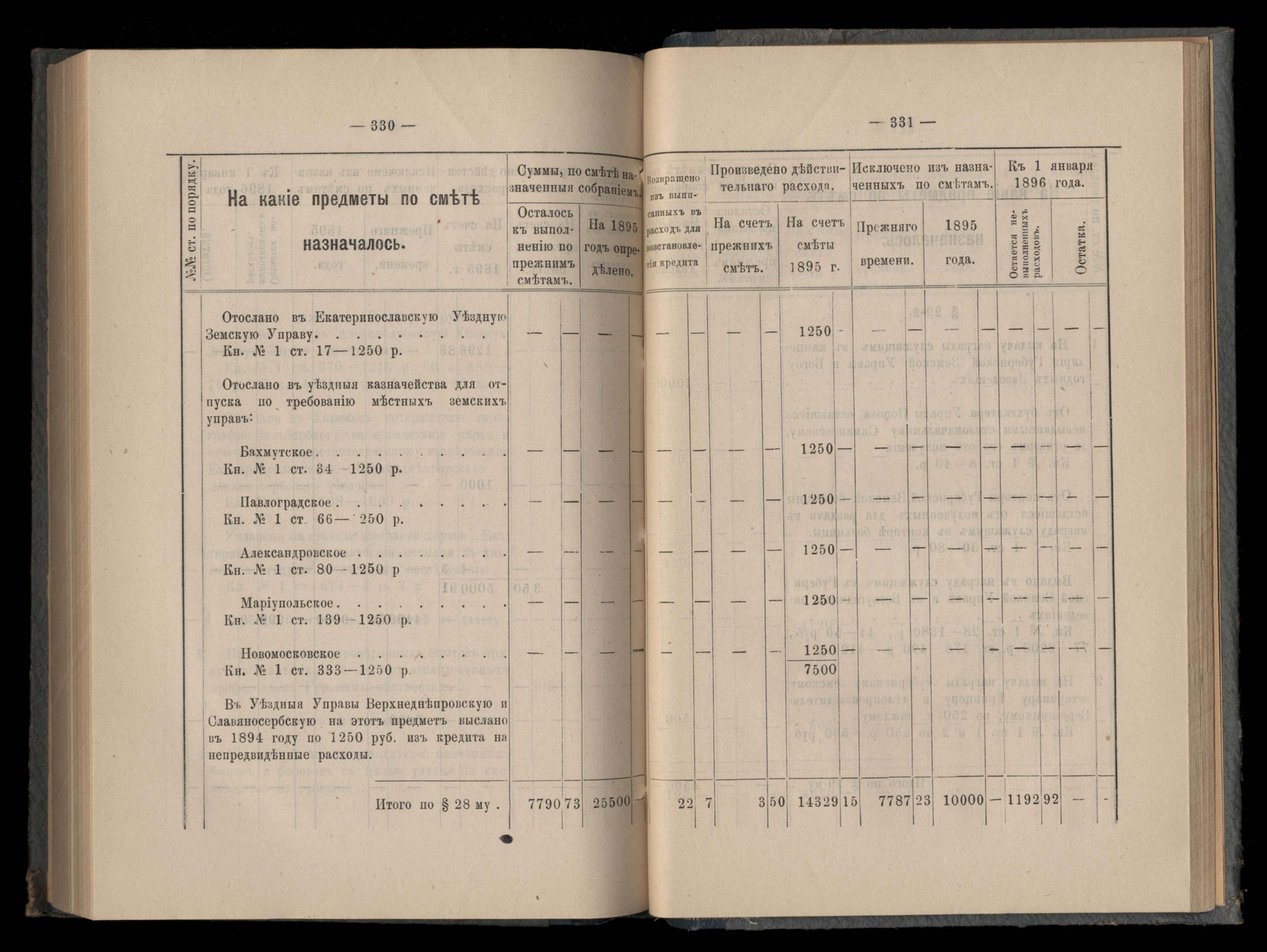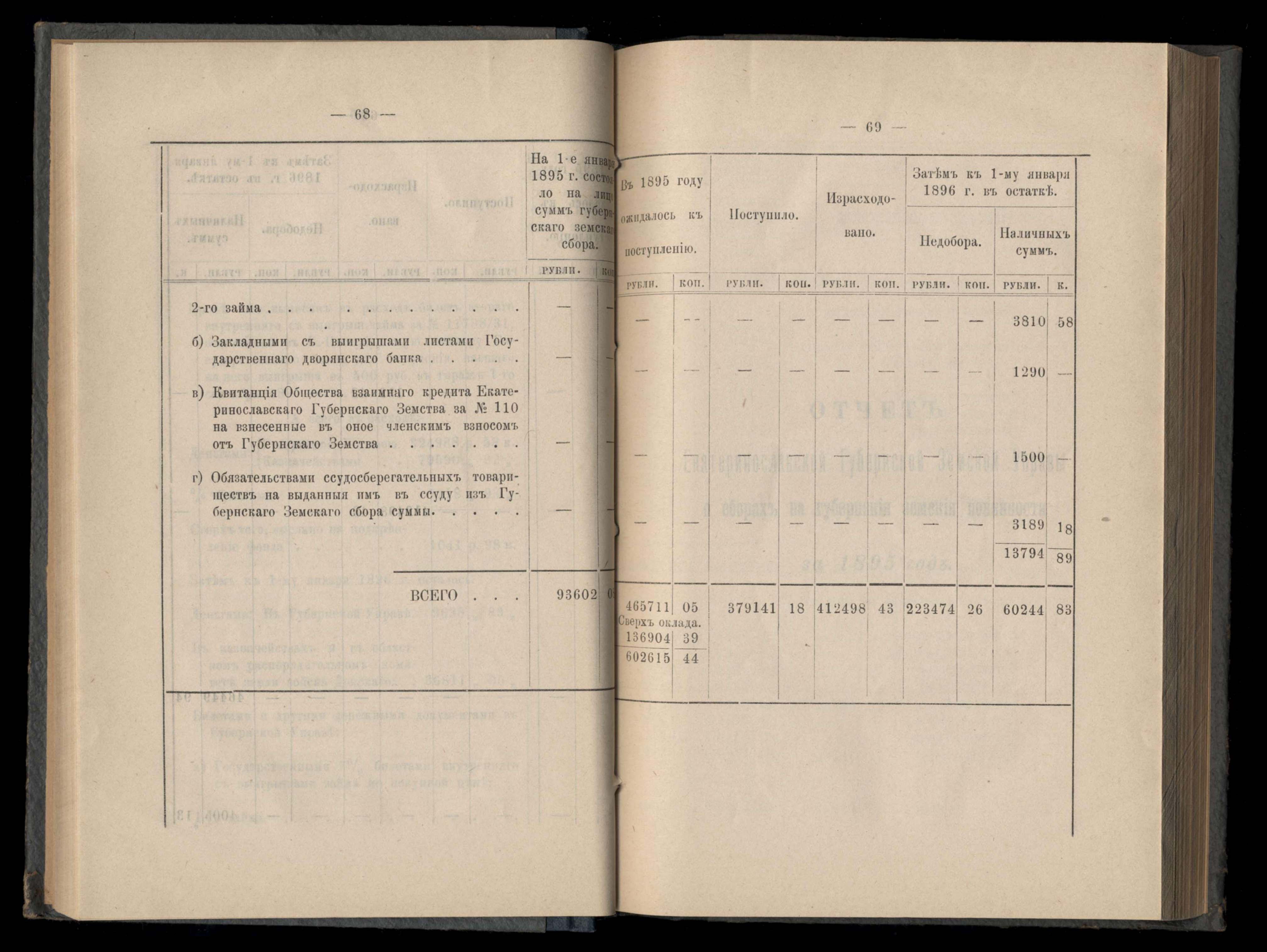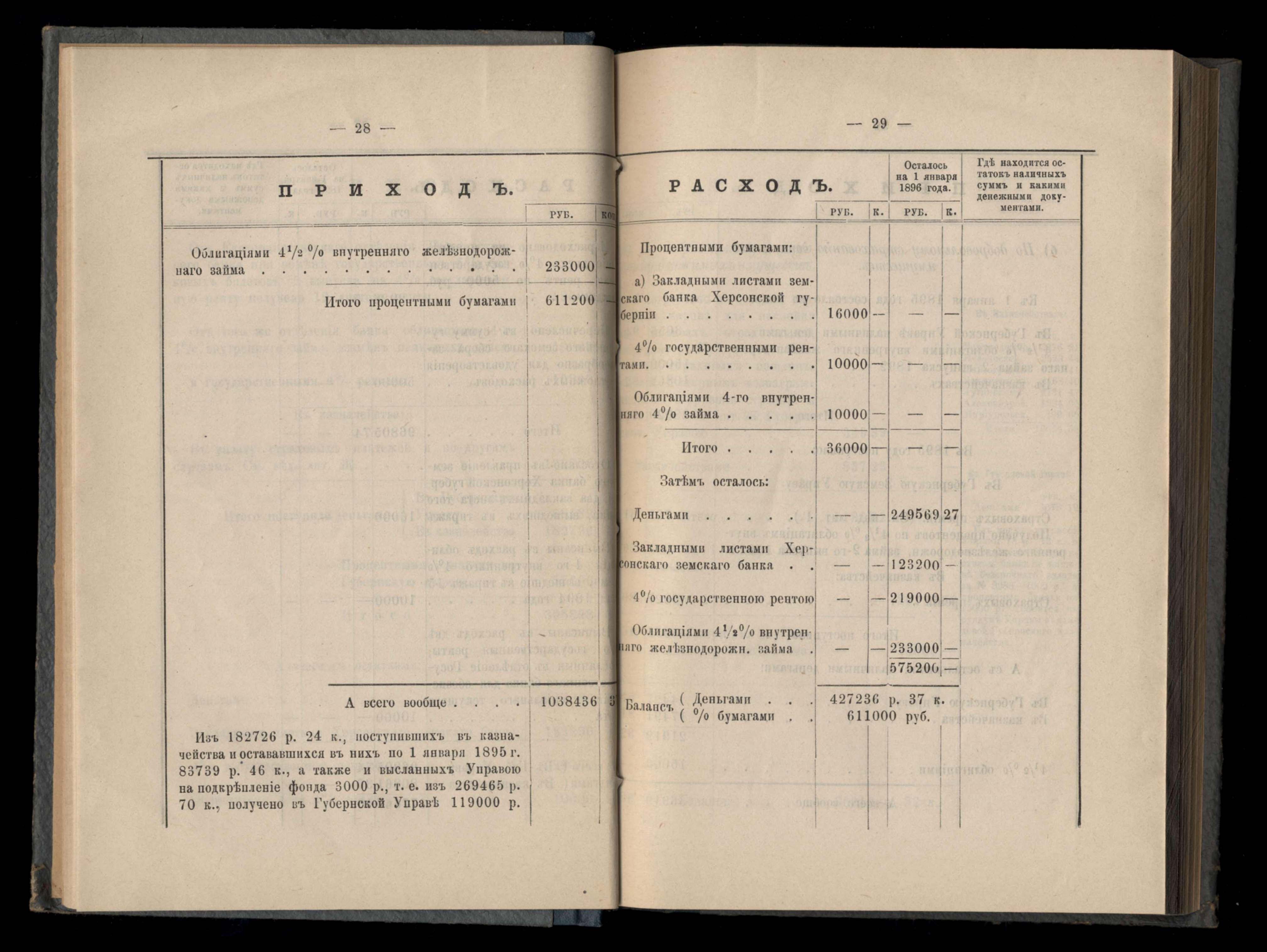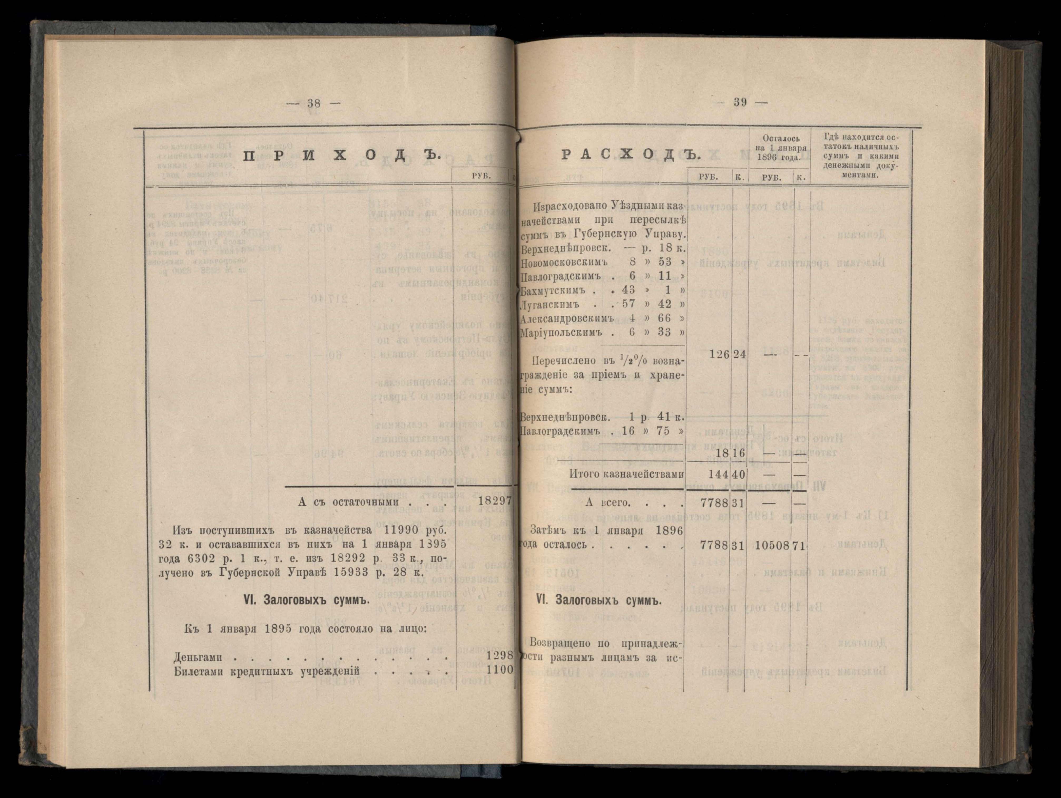 Ведомость Екатеринославской Губернской Земской Управы о приходе и расходе суммъ Имперскаго продовольственнаго капитала, отпущеннаго Правительствомъ для выдачи въ ссуду сельскимъ обществамъ на продовольствіе за 1895 годъ