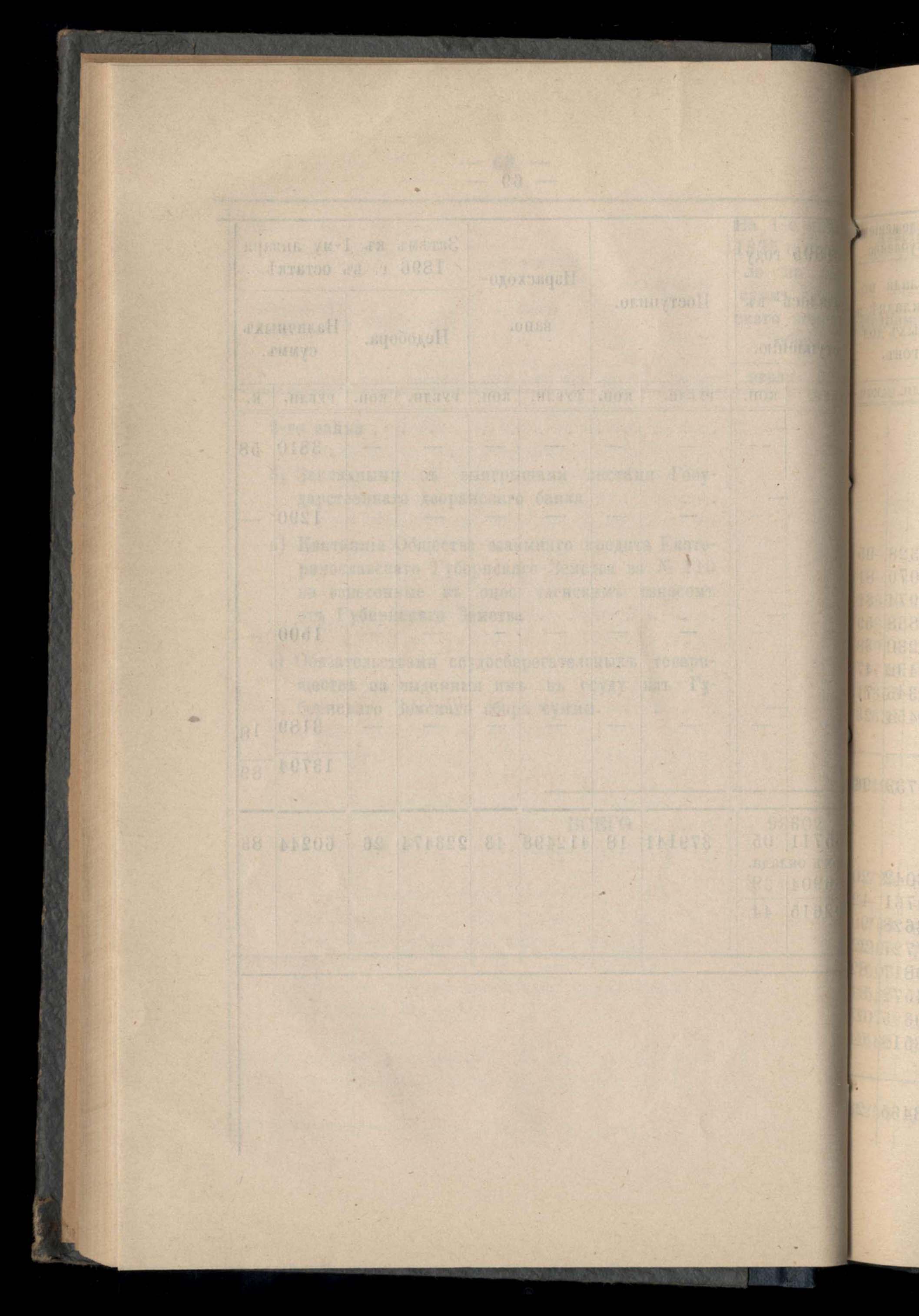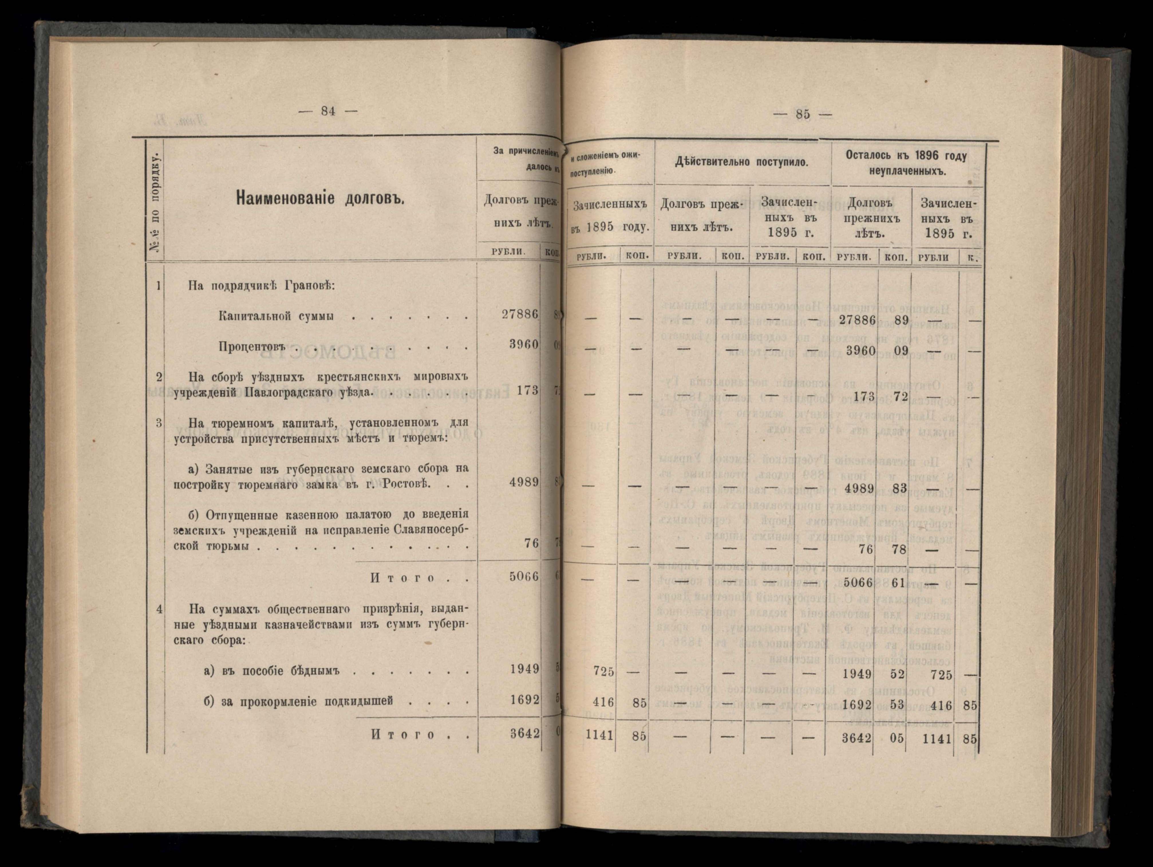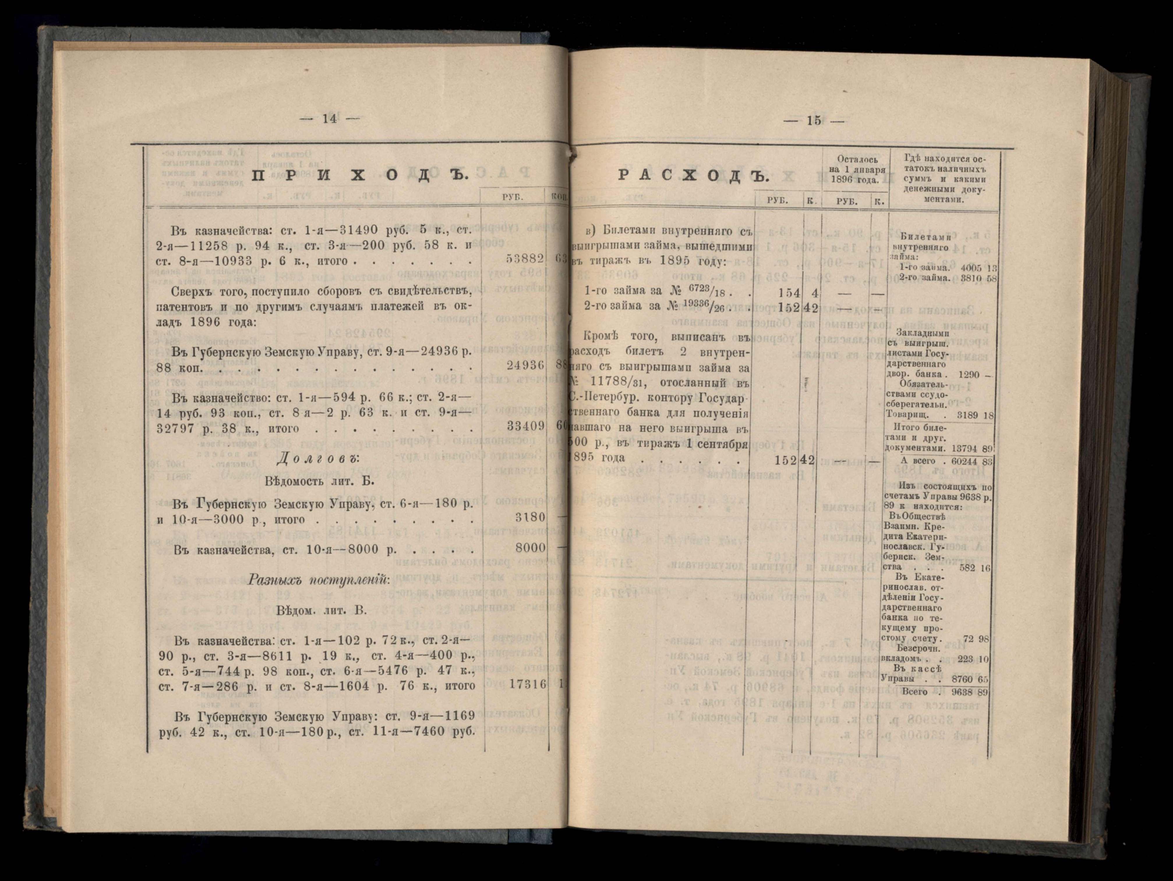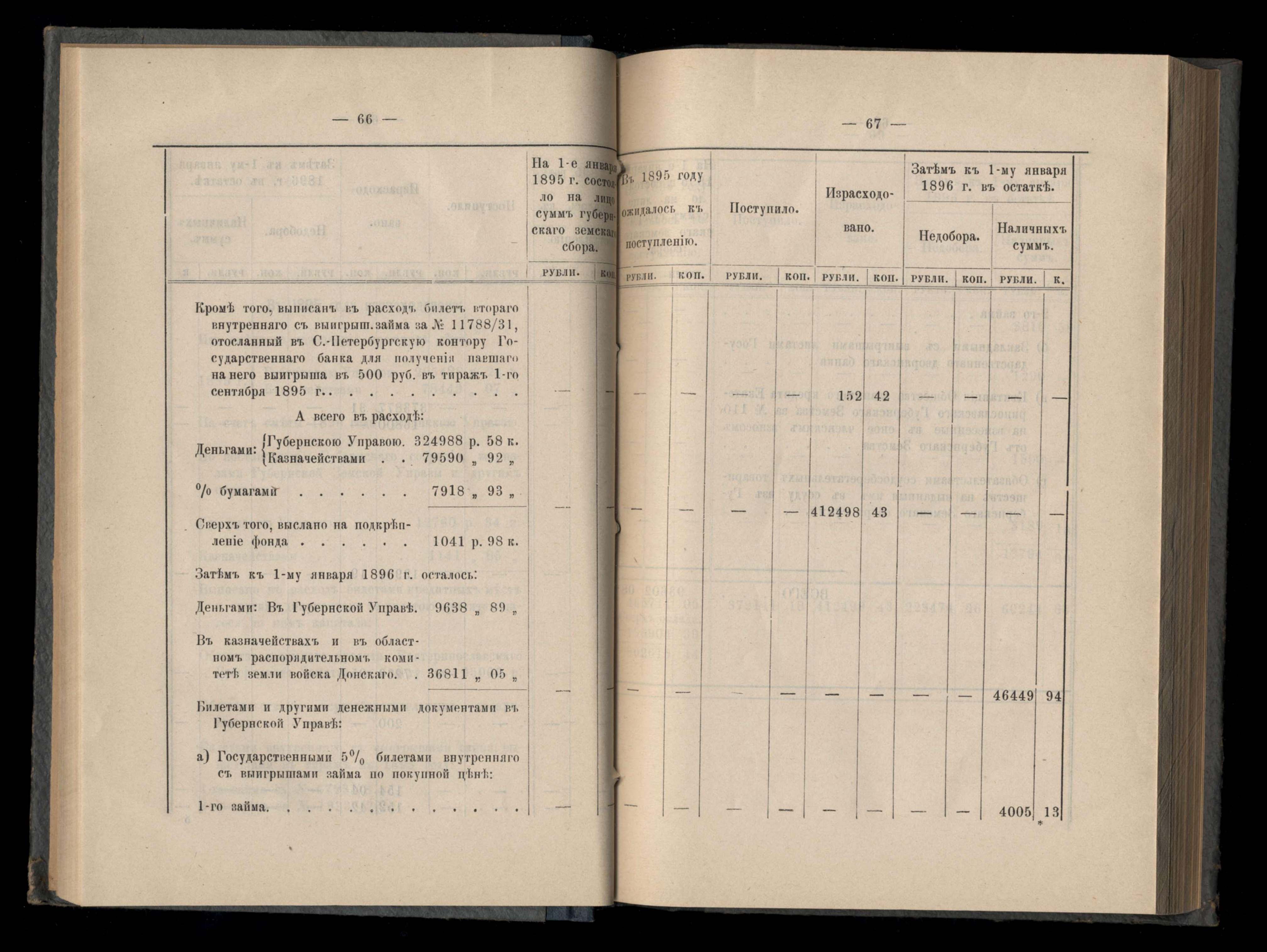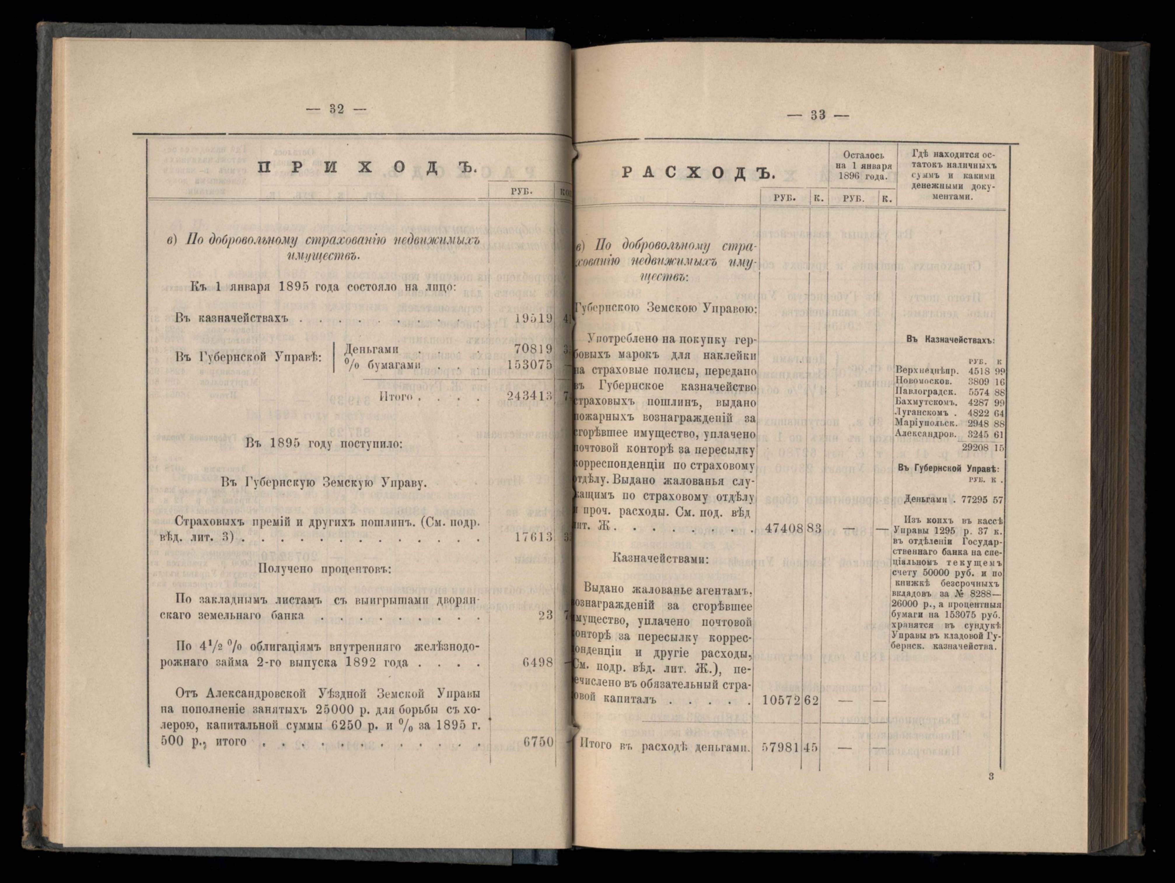 Ведомость Екатеринославской Губернской Земской Управы о приходе и расходе суммъ Имперскаго продовольственнаго капитала, отпущеннаго Правительствомъ для выдачи въ ссуду сельскимъ обществамъ на продовольствіе за 1895 годъ