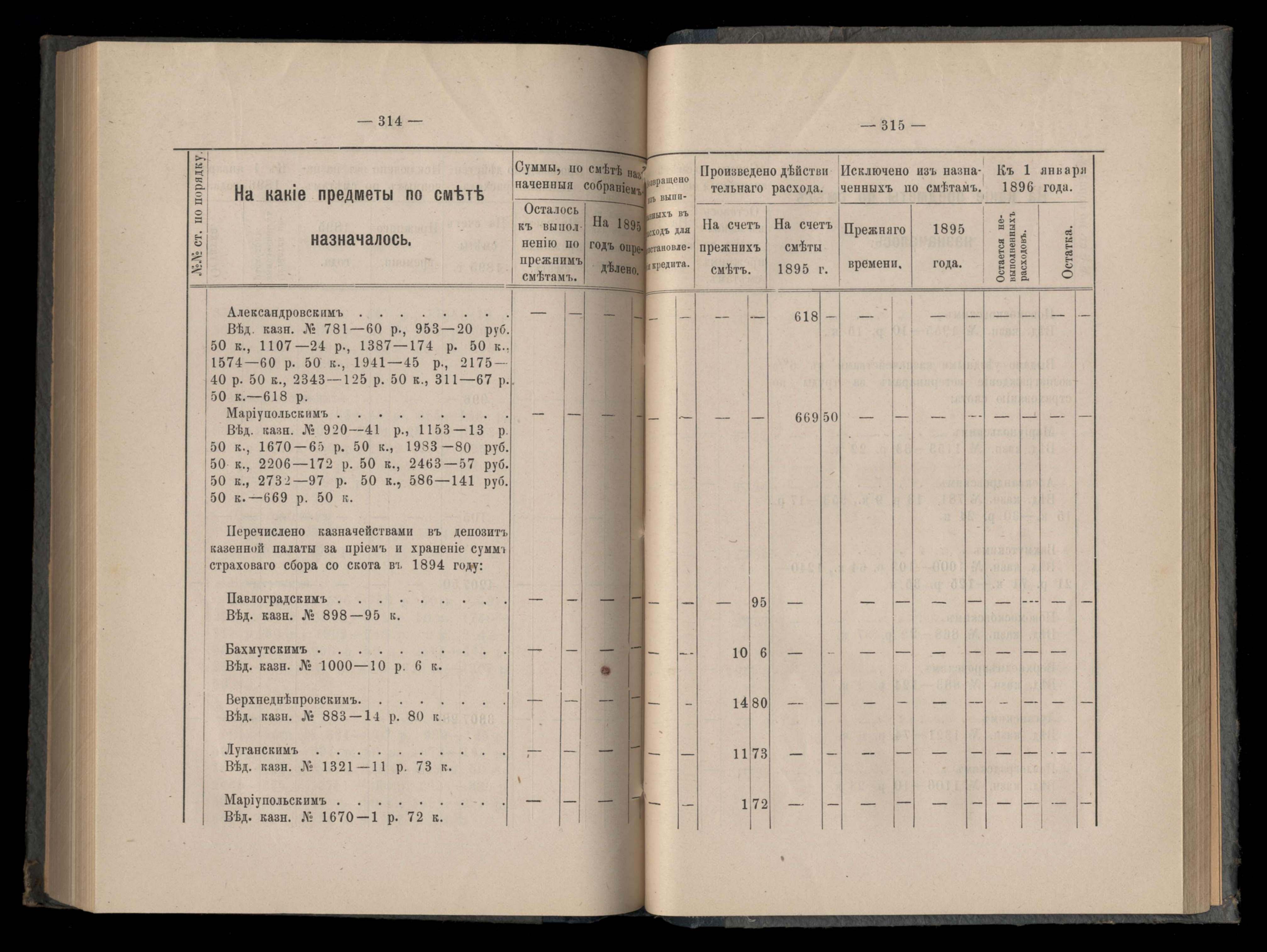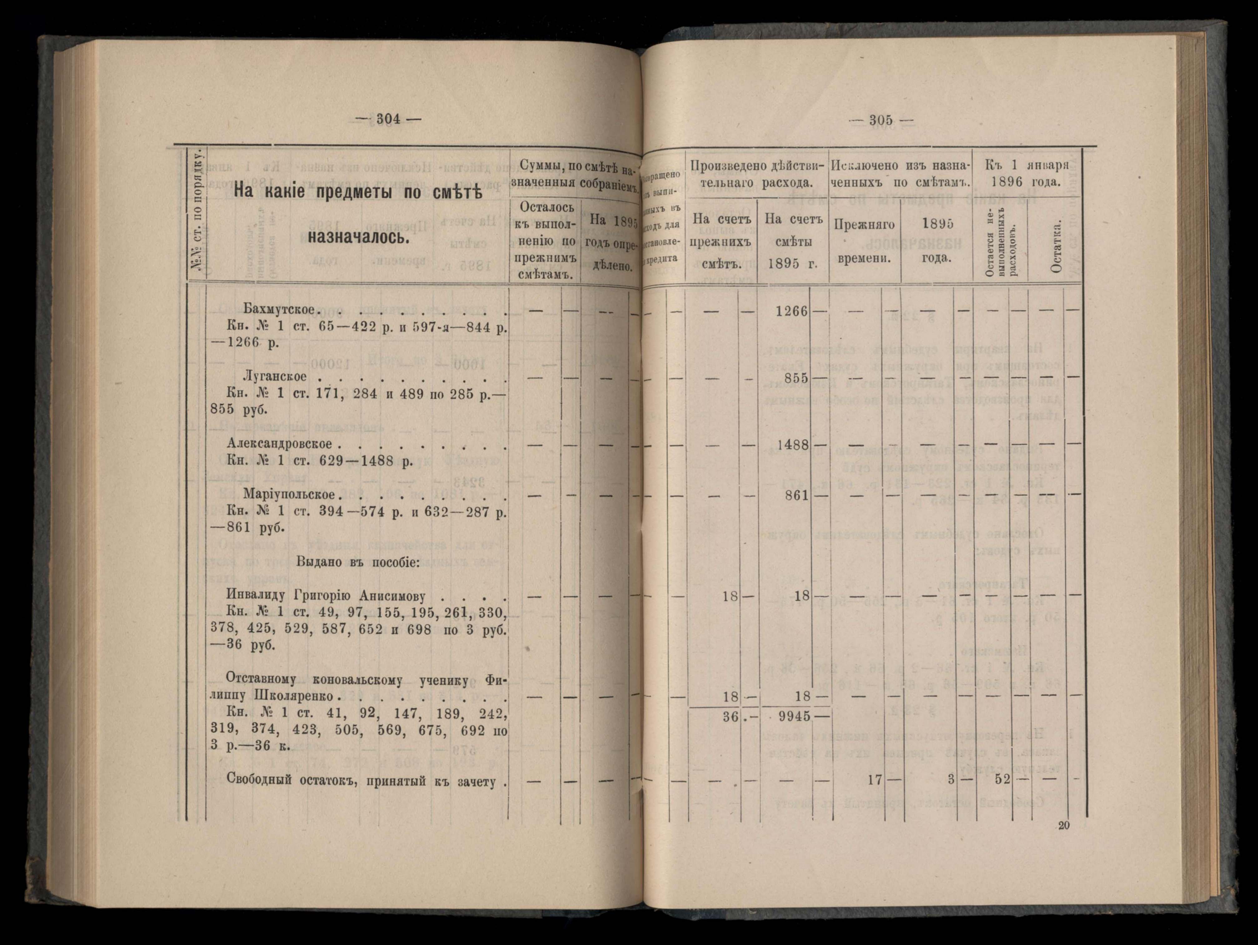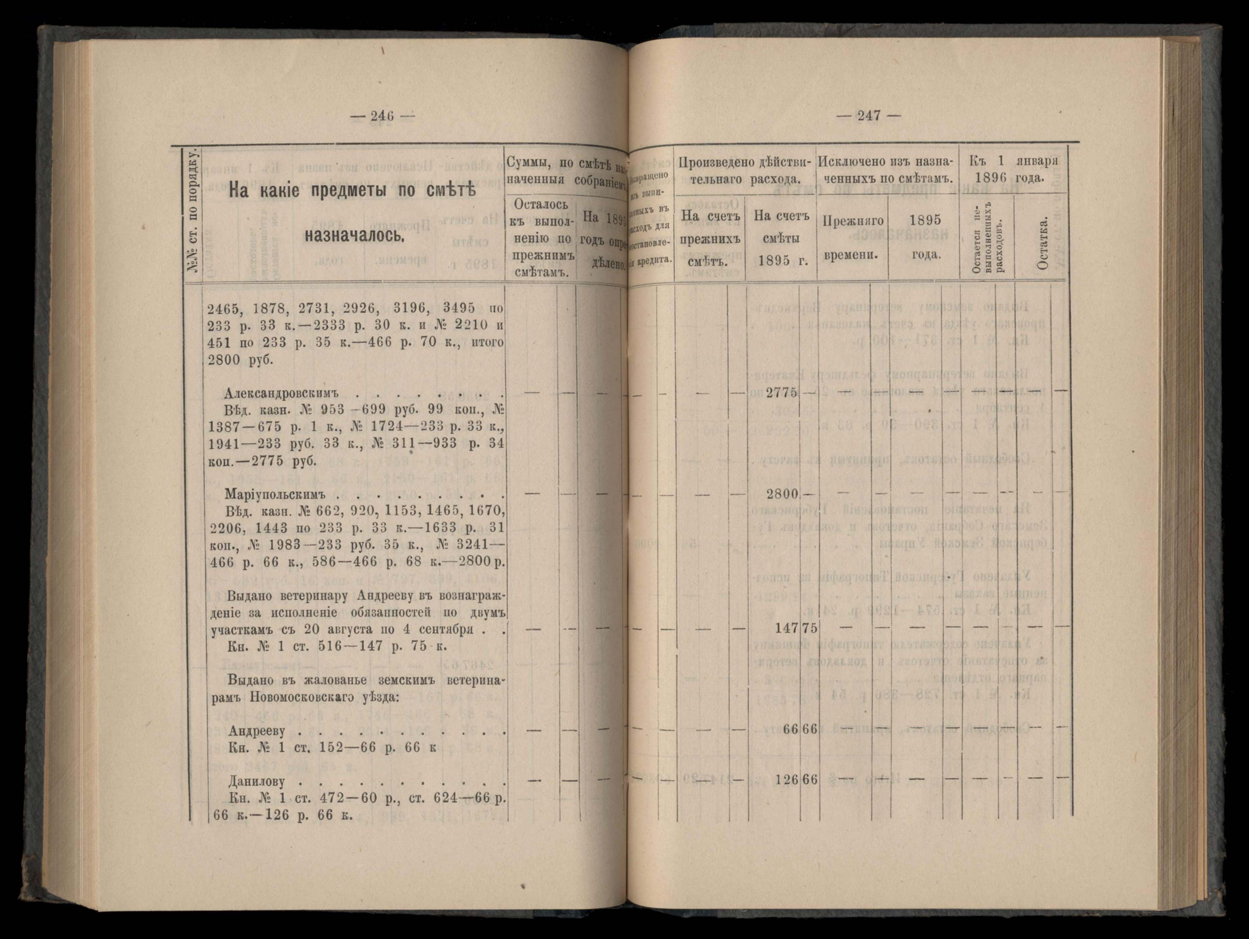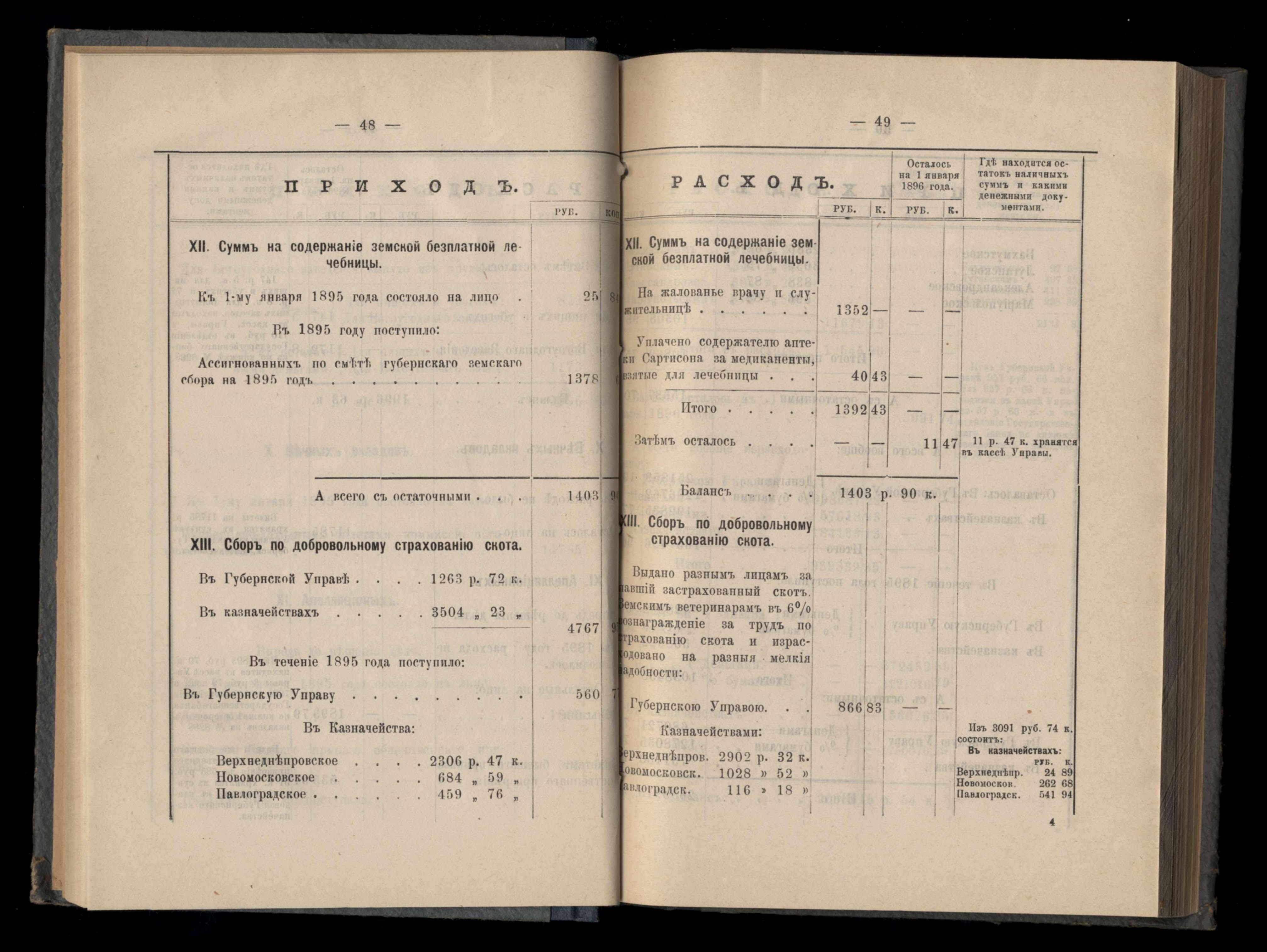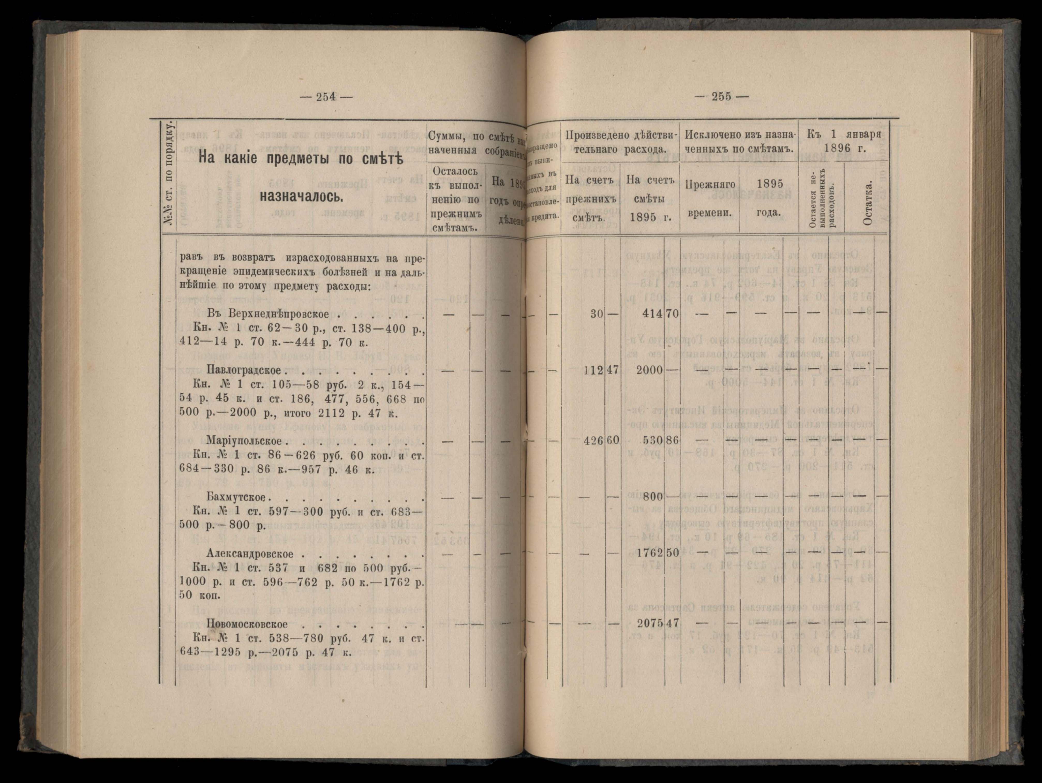 Ведомость Екатеринославской Губернской Земской Управы о приходе и расходе суммъ Имперскаго продовольственнаго капитала, отпущеннаго Правительствомъ для выдачи въ ссуду сельскимъ обществамъ на продовольствіе за 1895 годъ