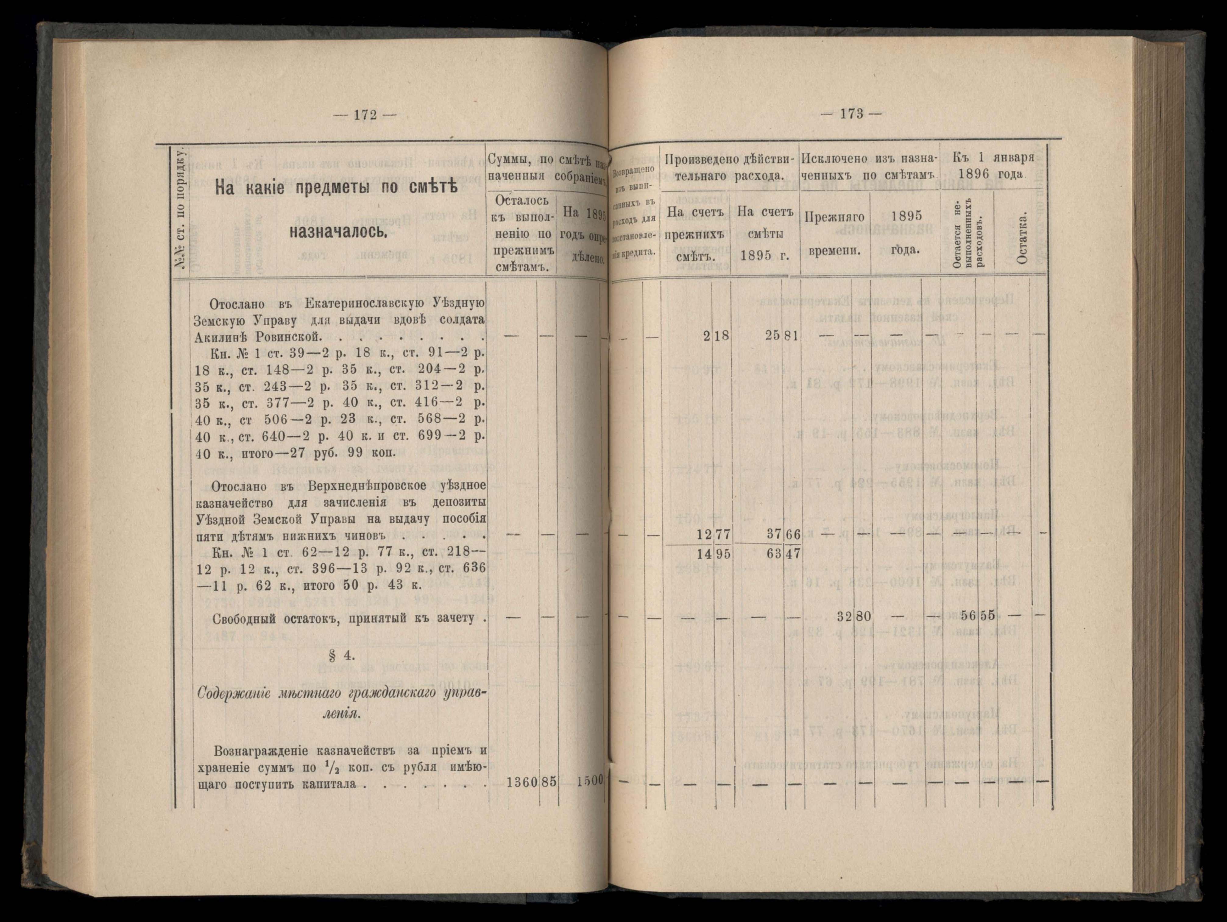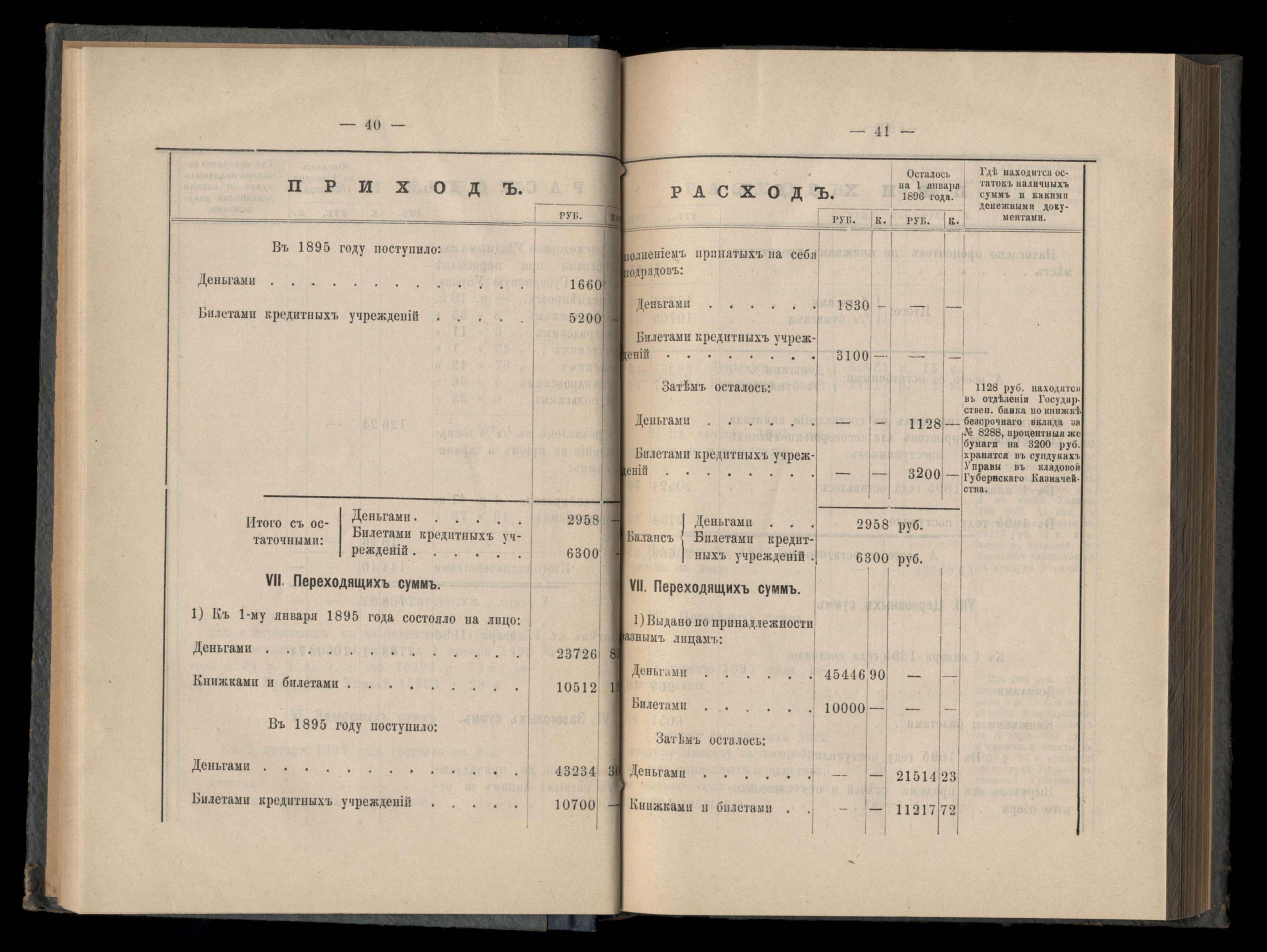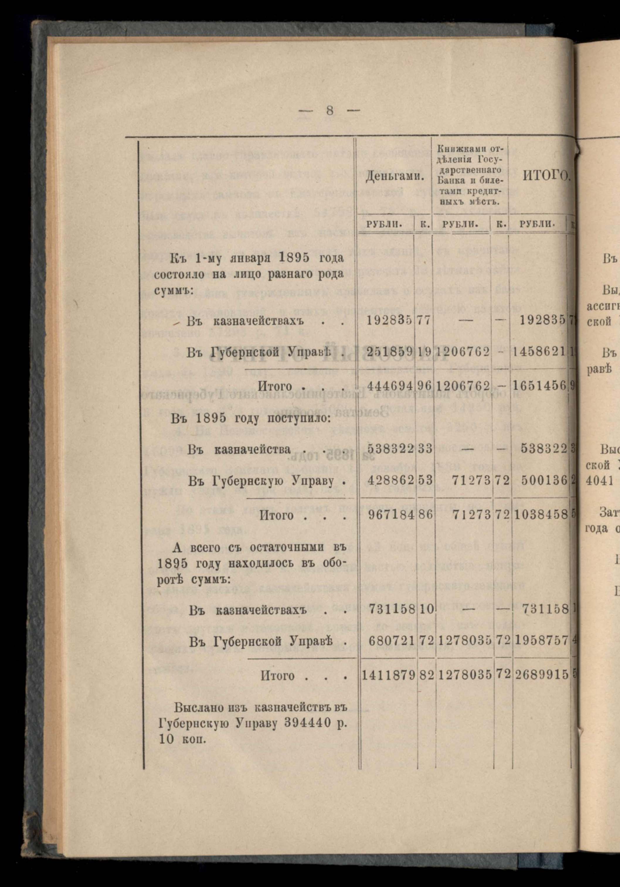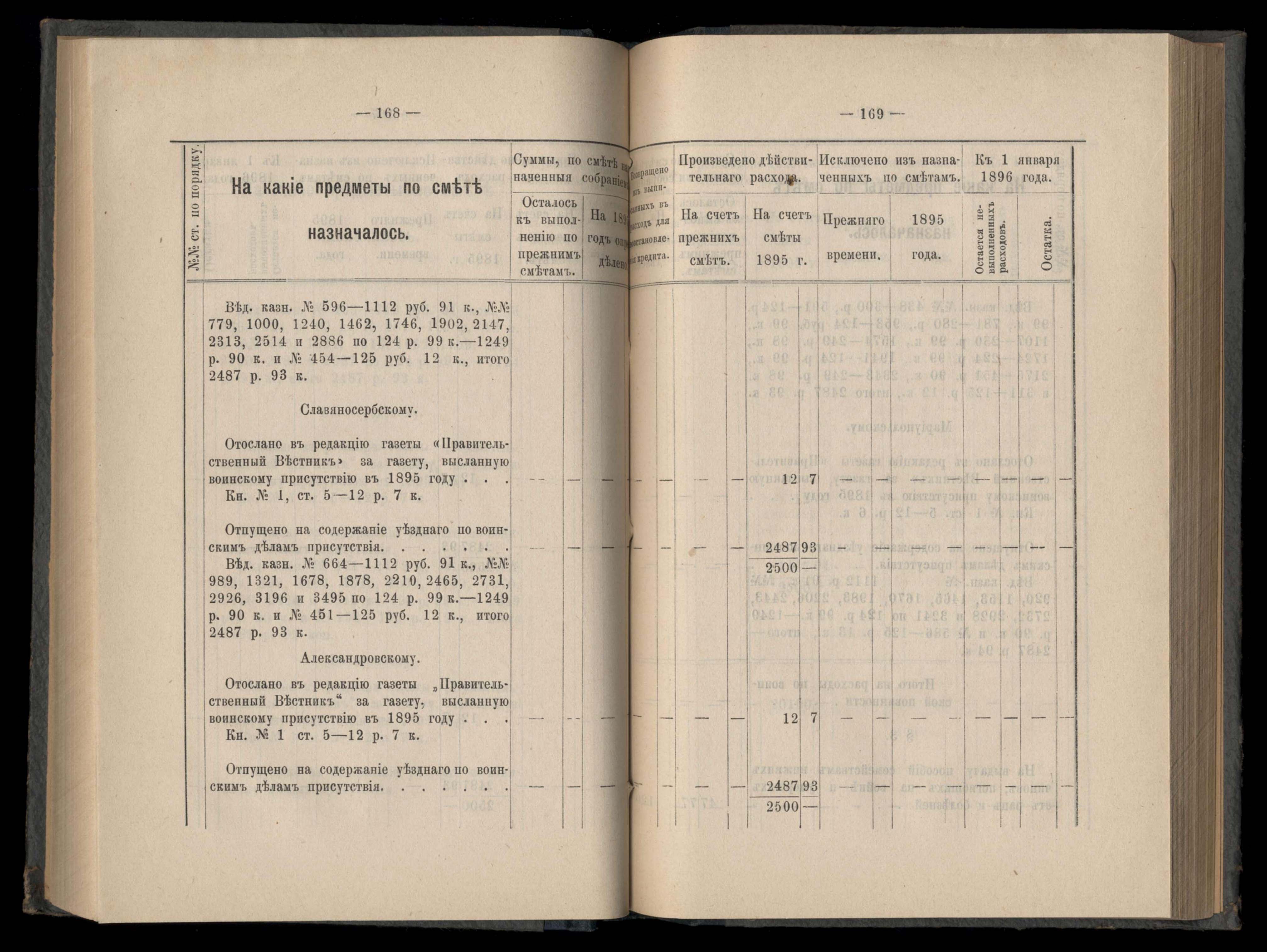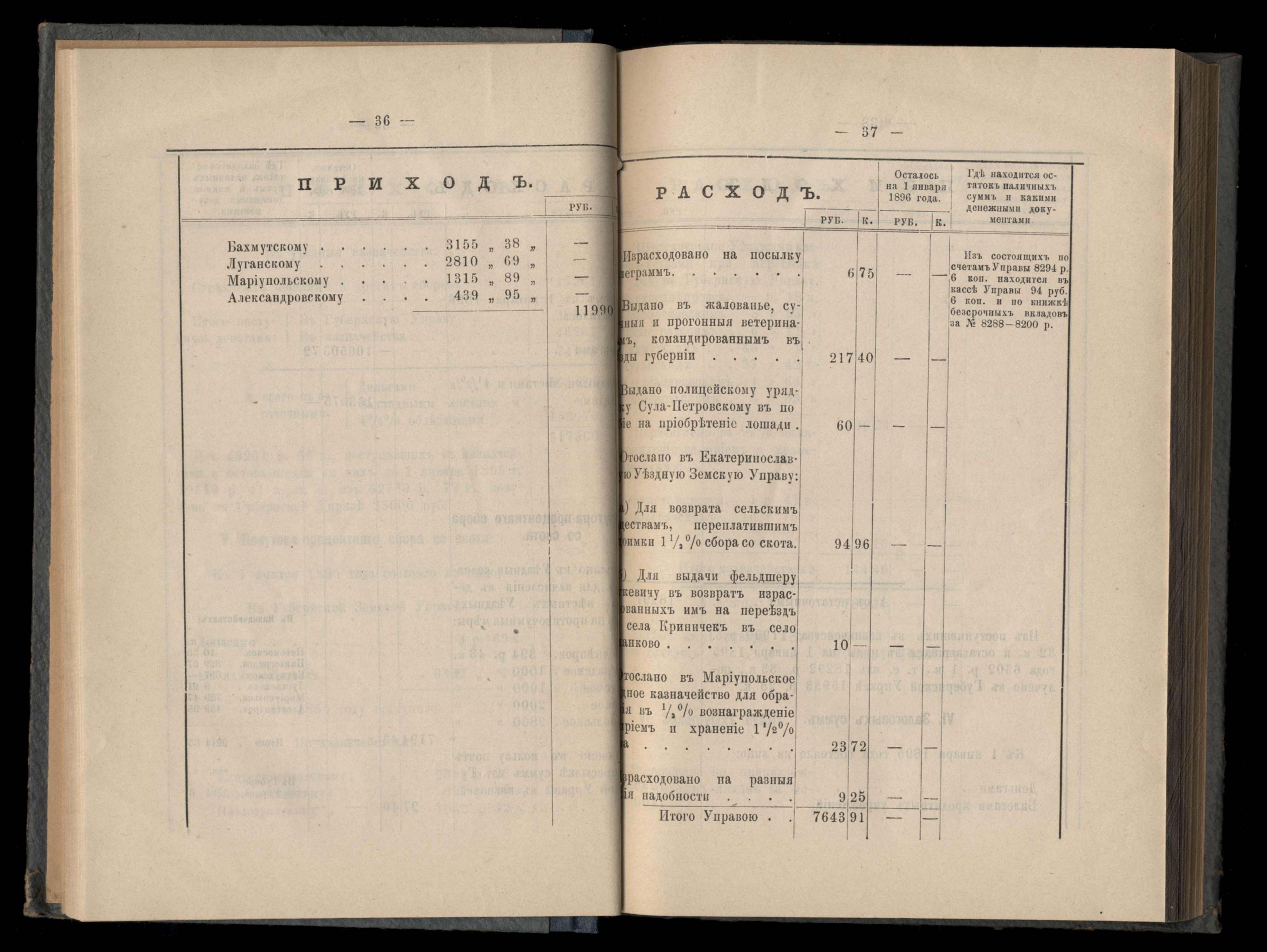 Ведомость Екатеринославской Губернской Земской Управы о приходе и расходе суммъ Имперскаго продовольственнаго капитала, отпущеннаго Правительствомъ для выдачи въ ссуду сельскимъ обществамъ на продовольствіе за 1895 годъ
