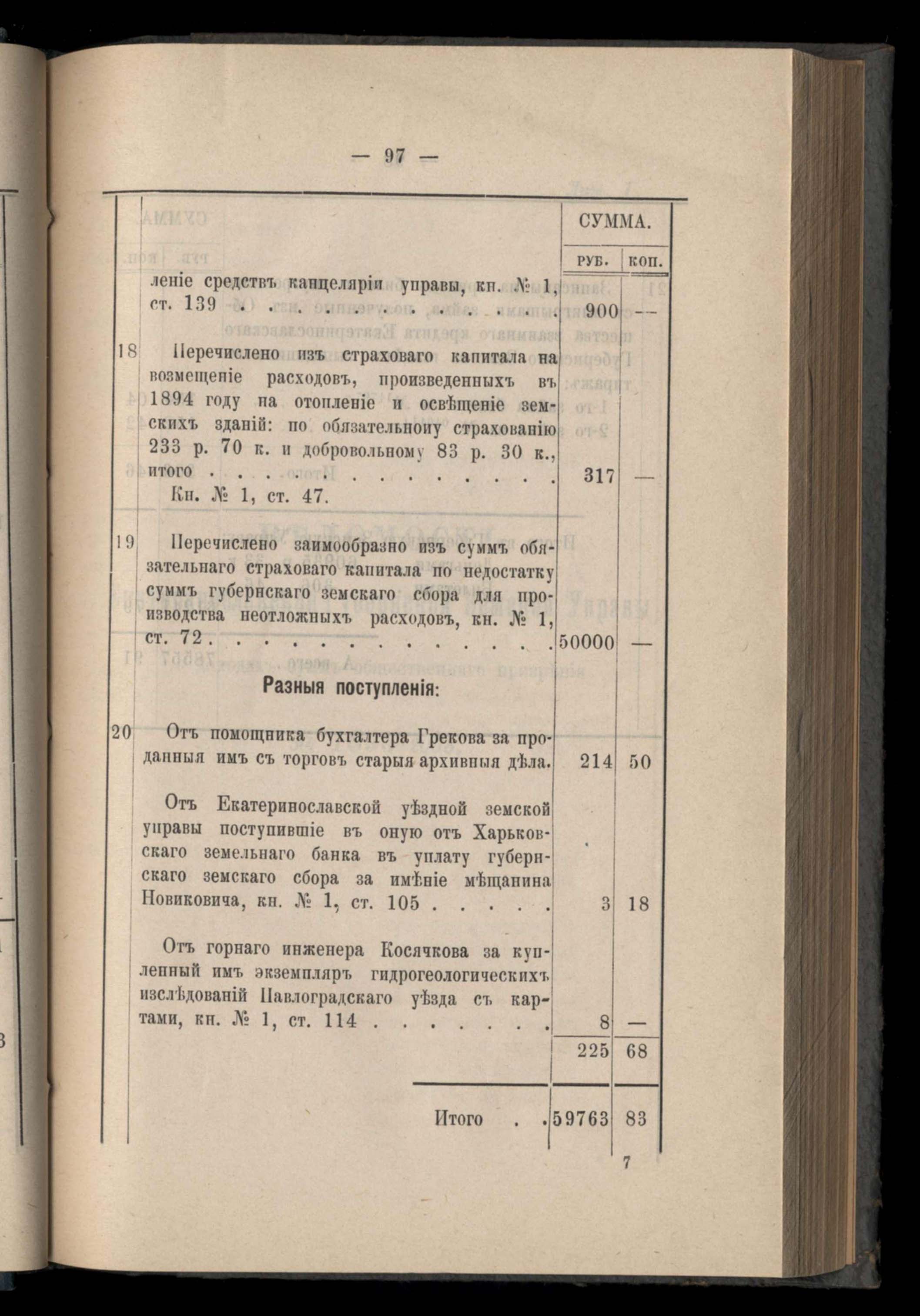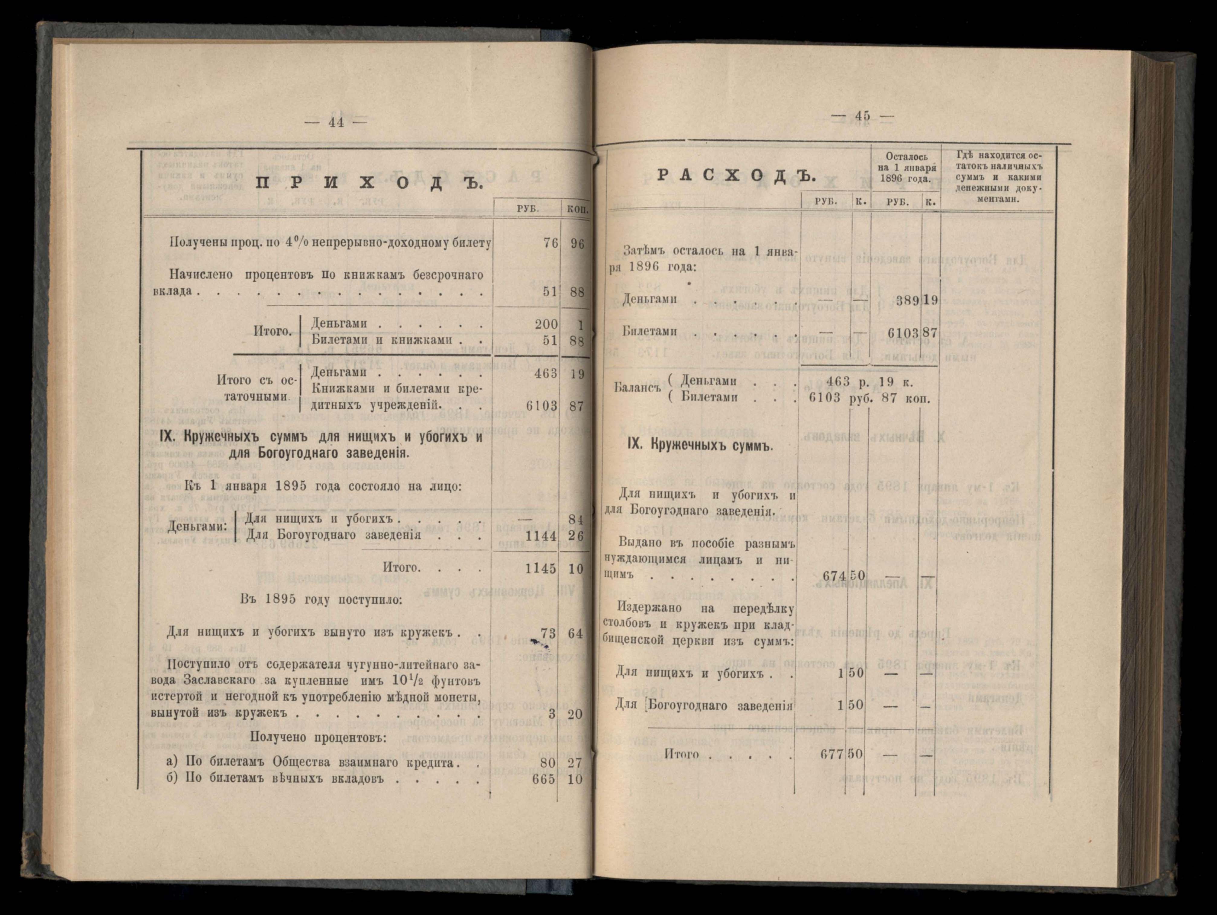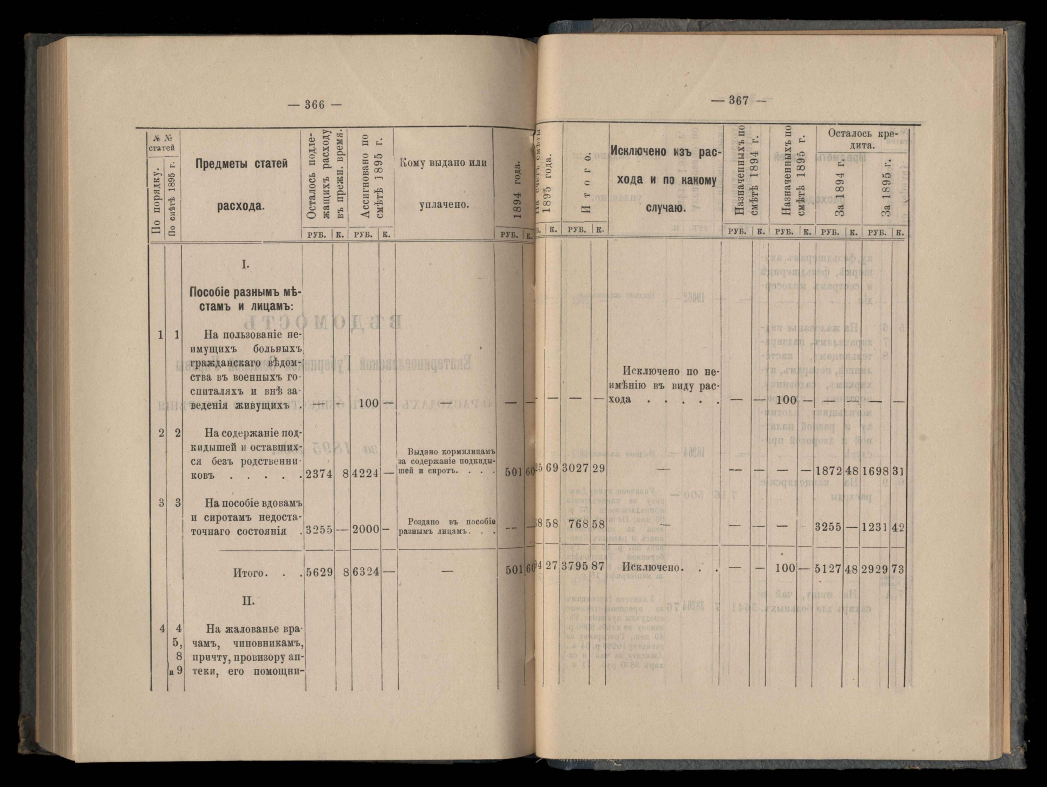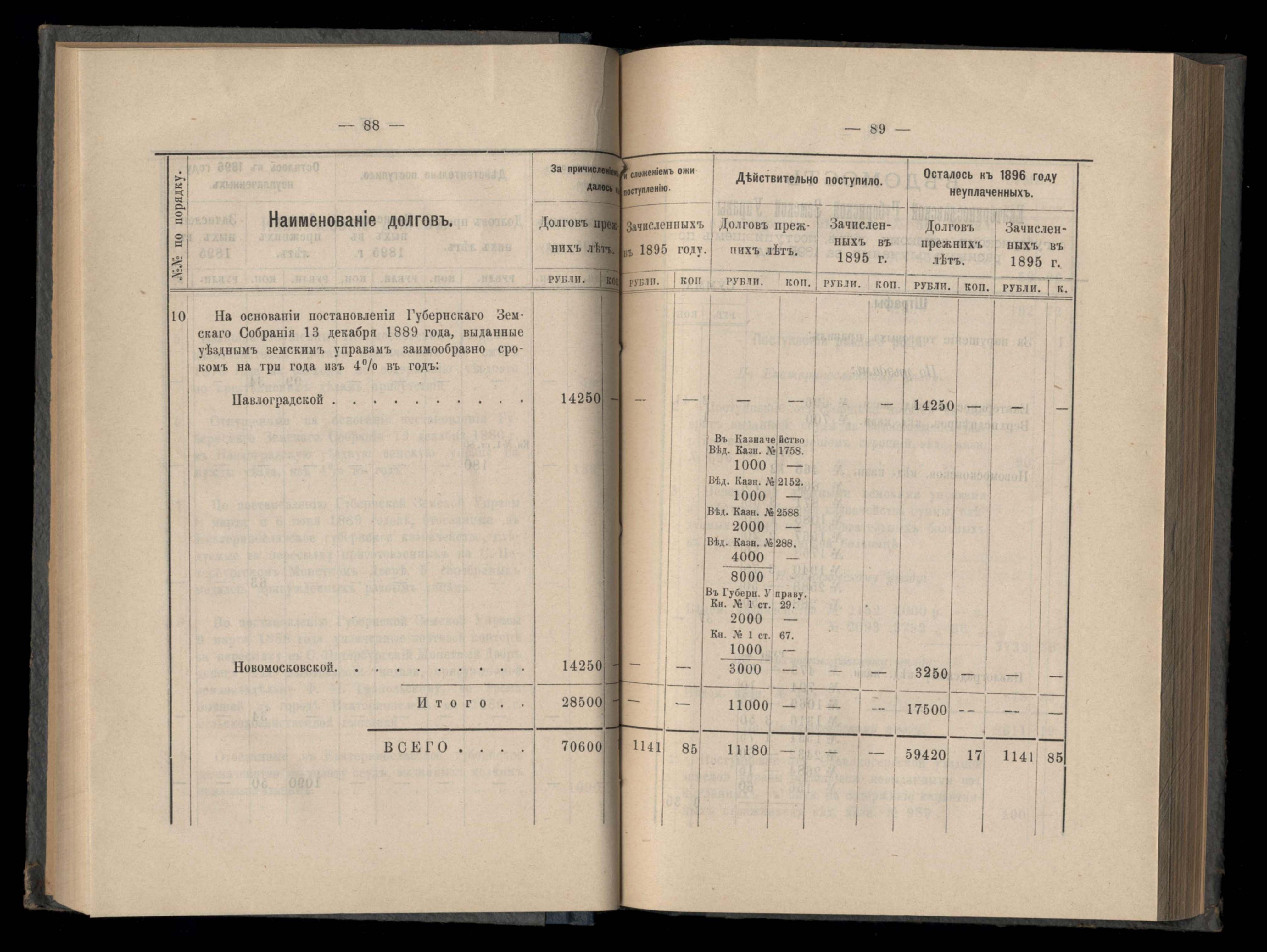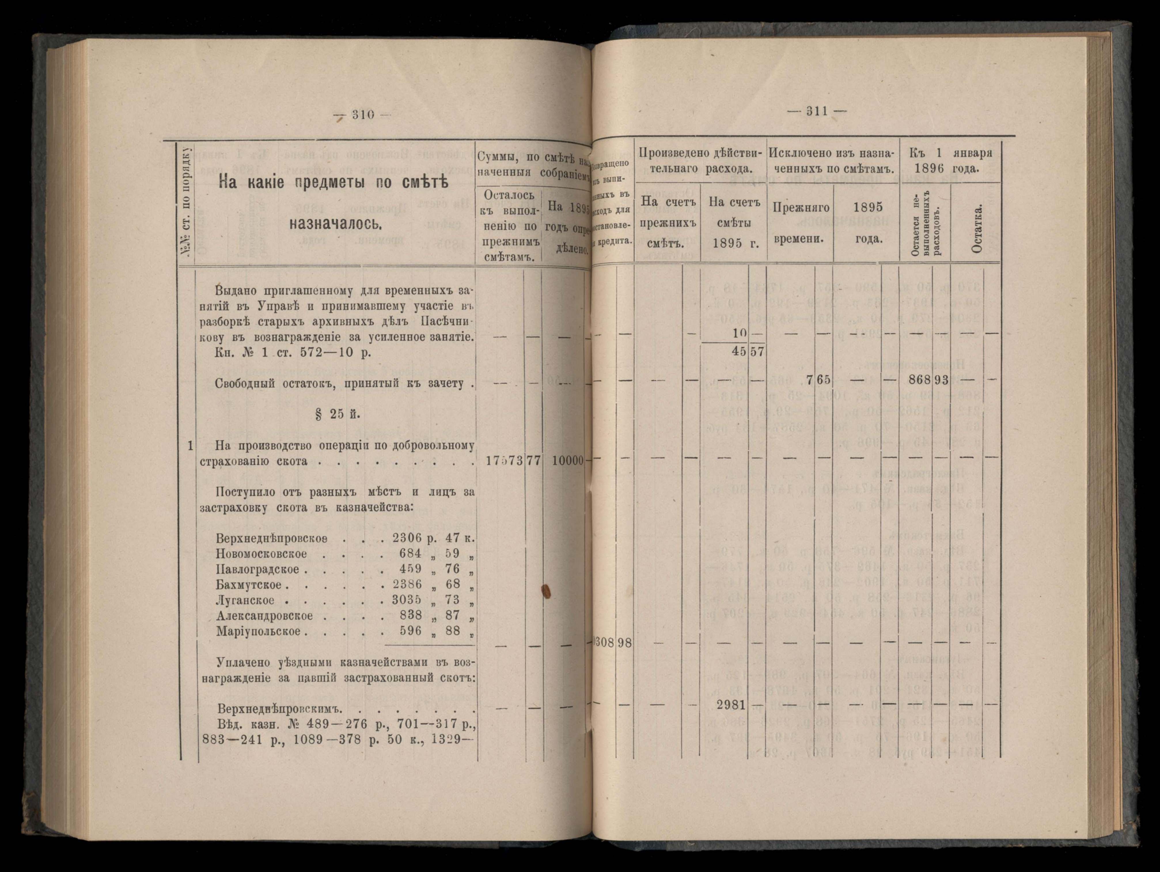Ведомость Екатеринославской Губернской Земской Управы о приходе и расходе суммъ Имперскаго продовольственнаго капитала, отпущеннаго Правительствомъ для выдачи въ ссуду сельскимъ обществамъ на продовольствіе за 1895 годъ