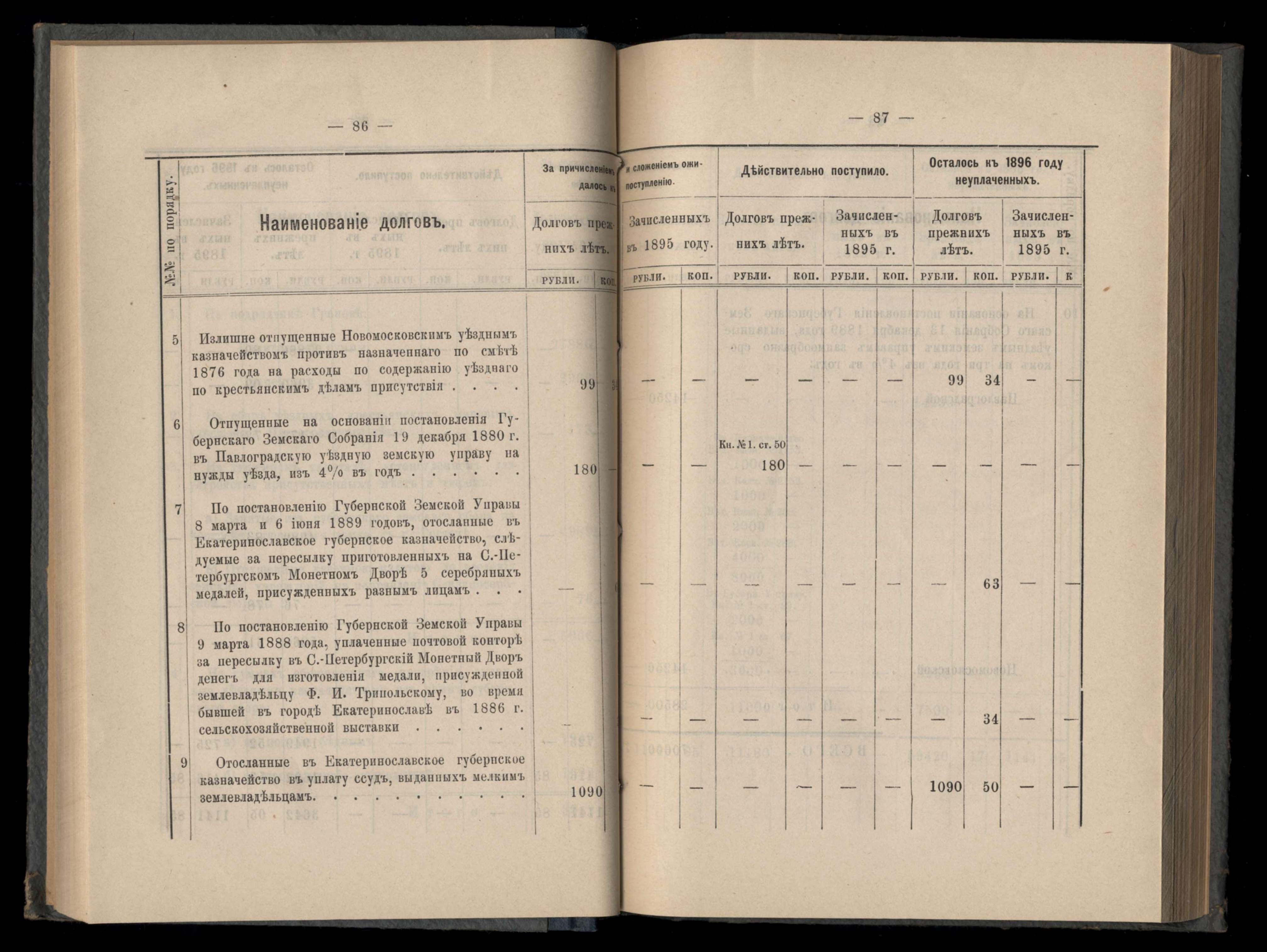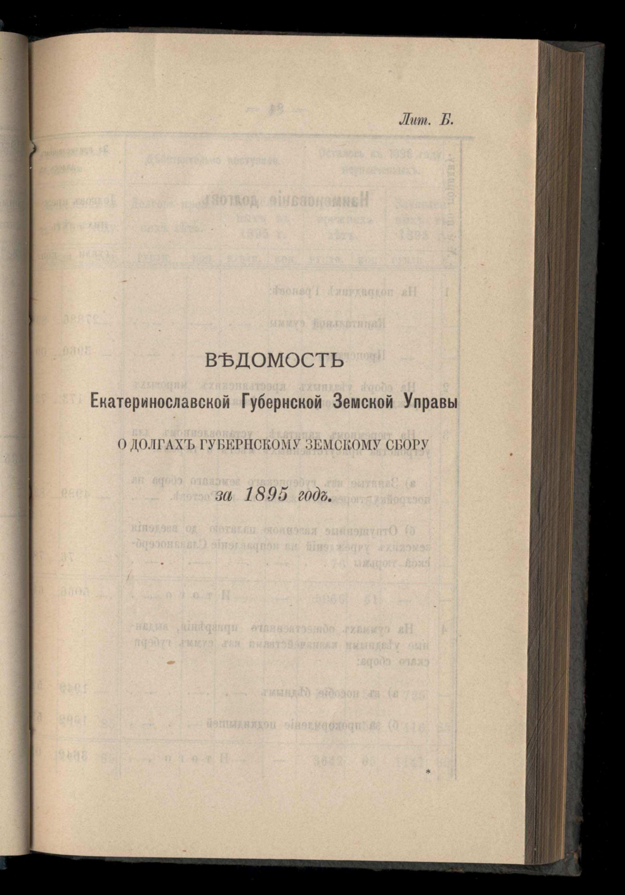 Ведомость Екатеринославской Губернской Земской Управы о долгахъ губернскому земскому сбору за 1895 годъ