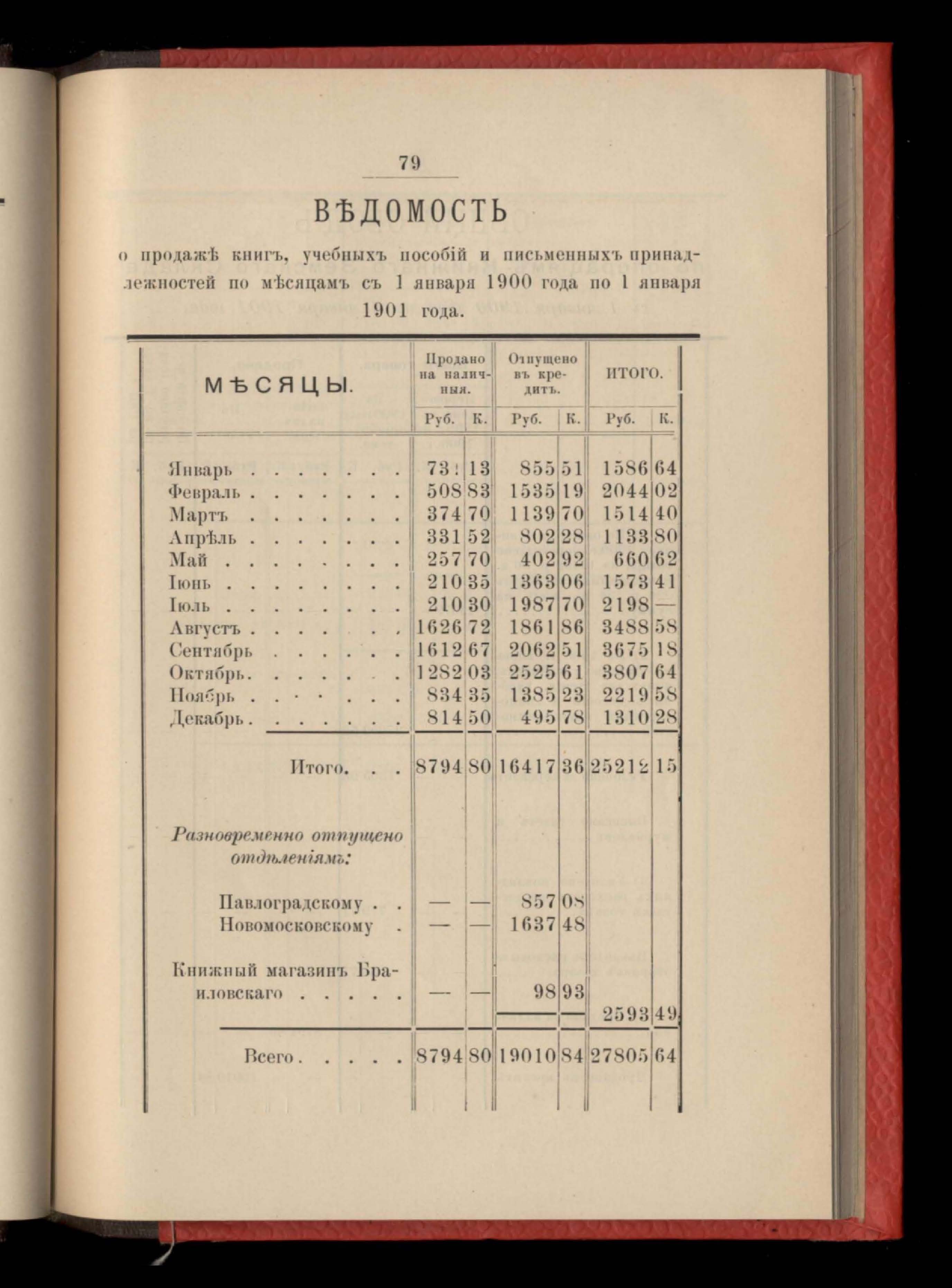 Въдомостъ о продажъ книгъ,учебныхъ пособій и письменныхъ принадлежностей по мъсяцамъ съ 1 января 1900 г. по 1 января 1901 г.