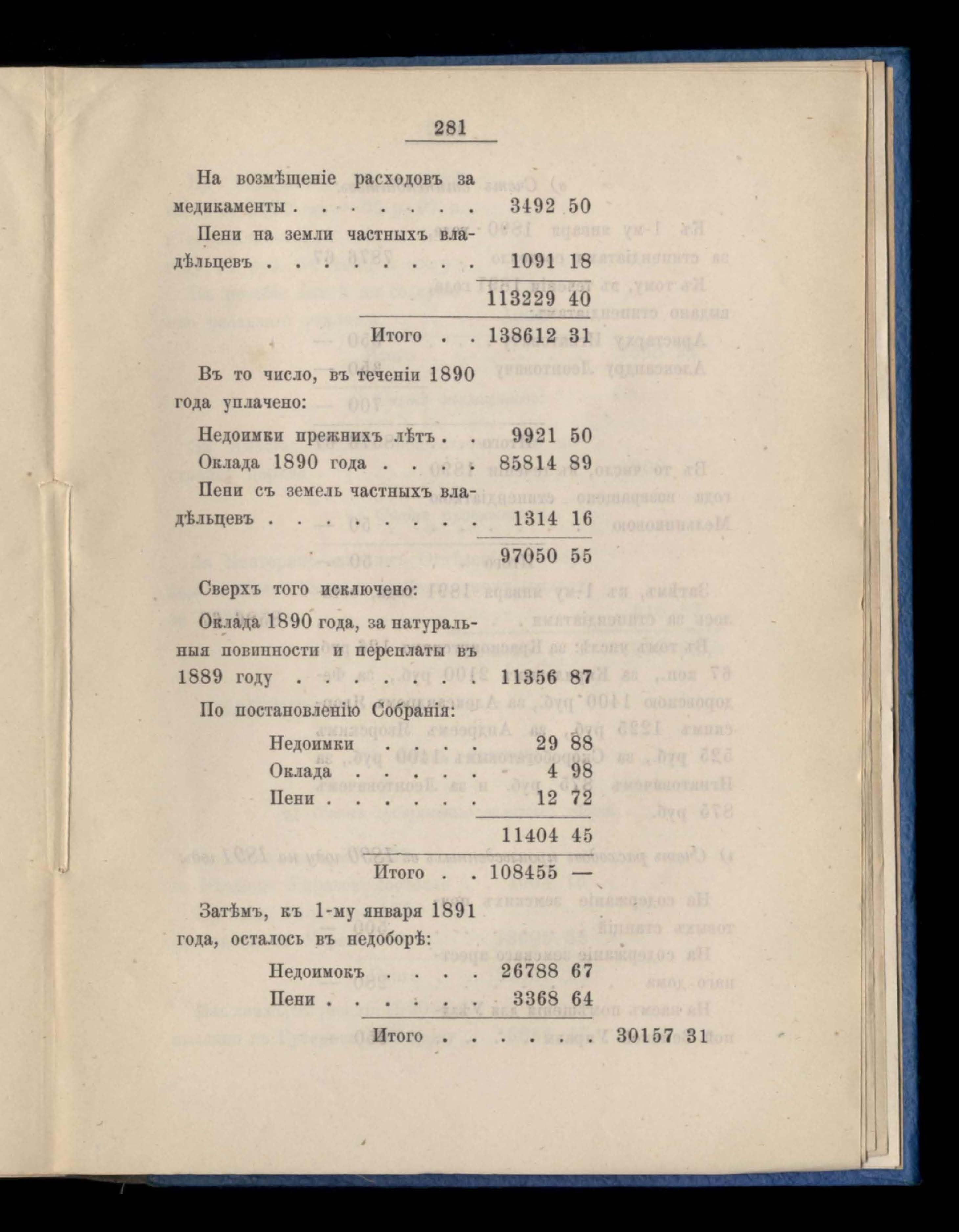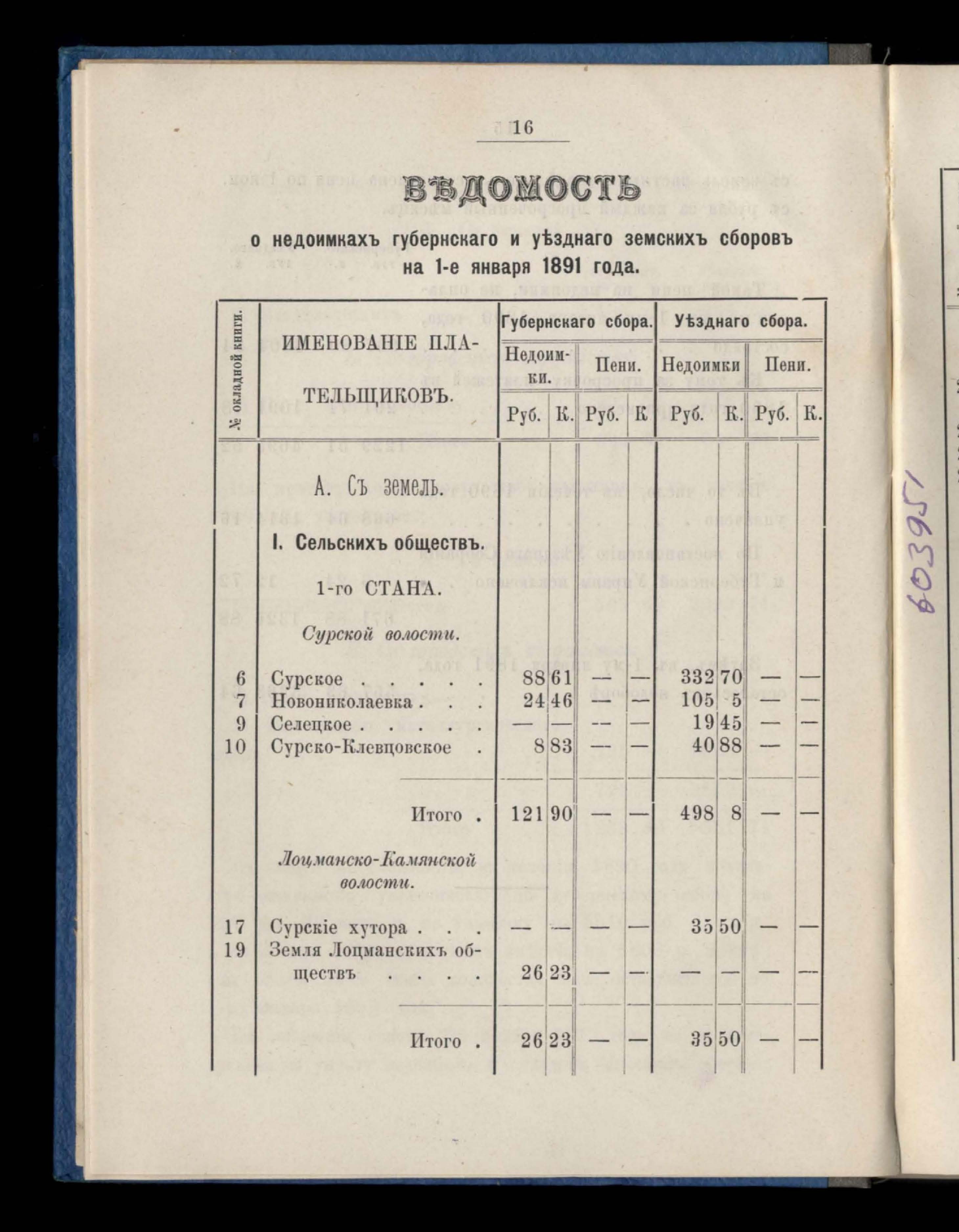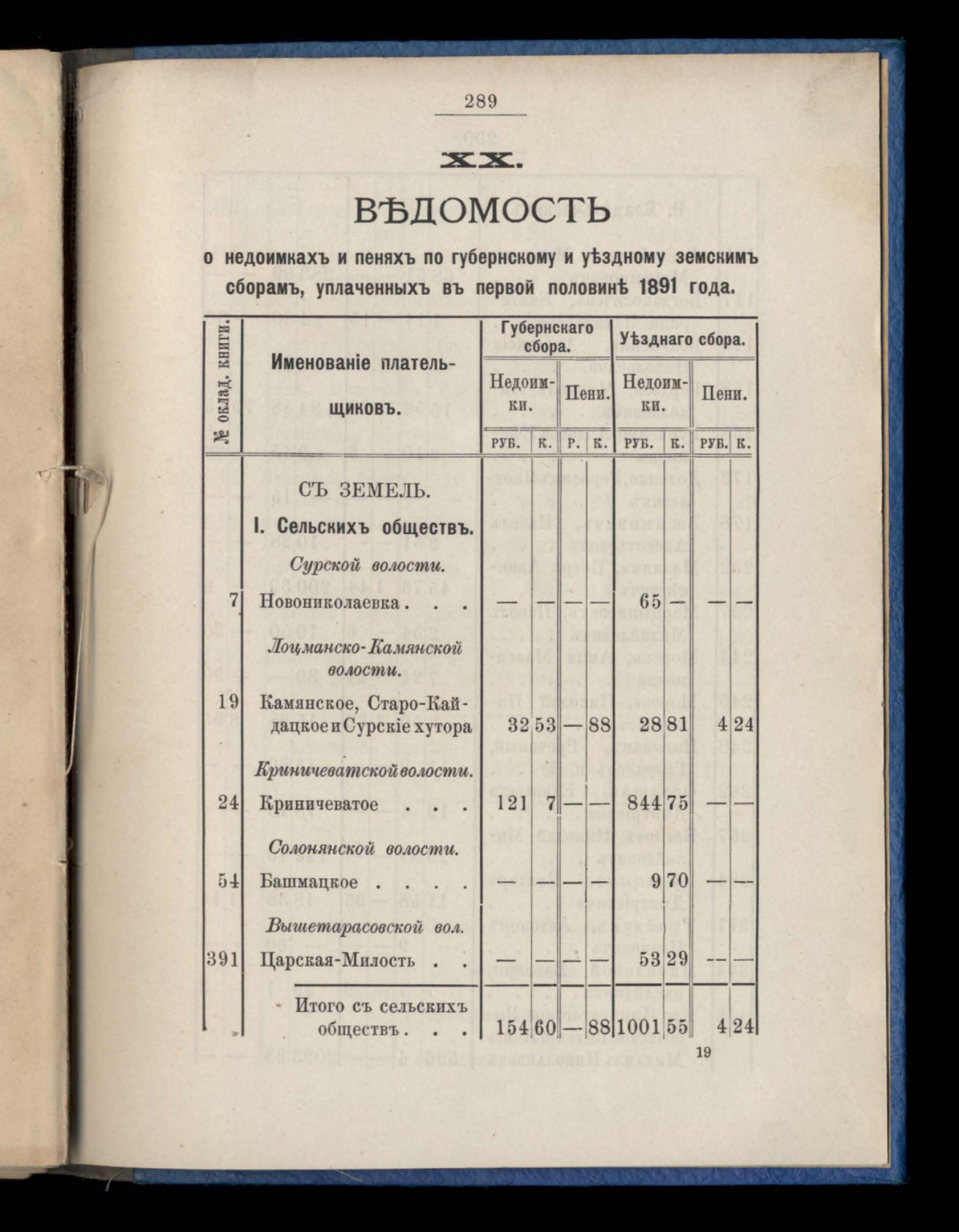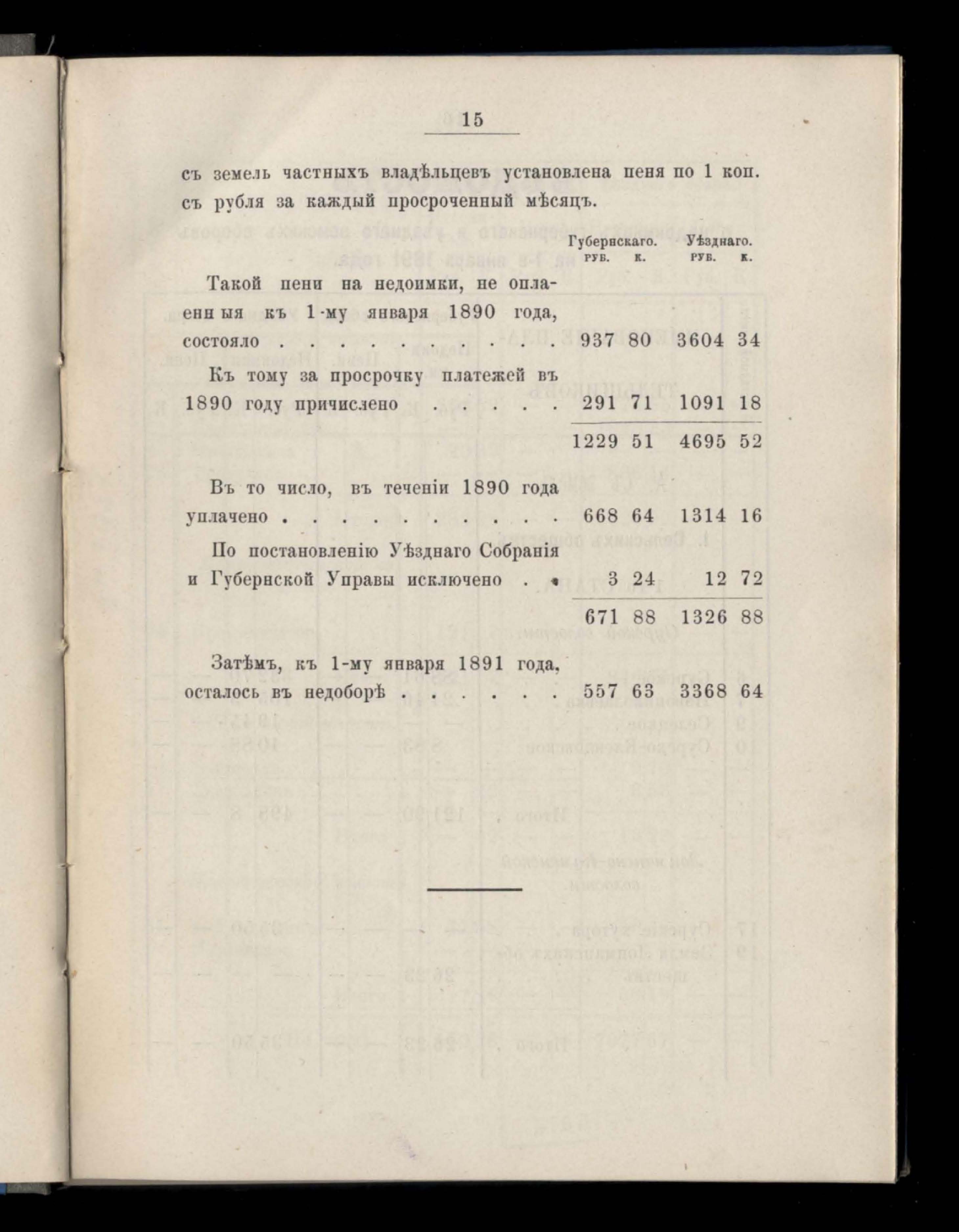 Въдомостъ о недоимкахъ и пеняхъ по губернскому и уъздному земскимъ сборамъ, уплаченныхъ въ первой половинъ 1891 года